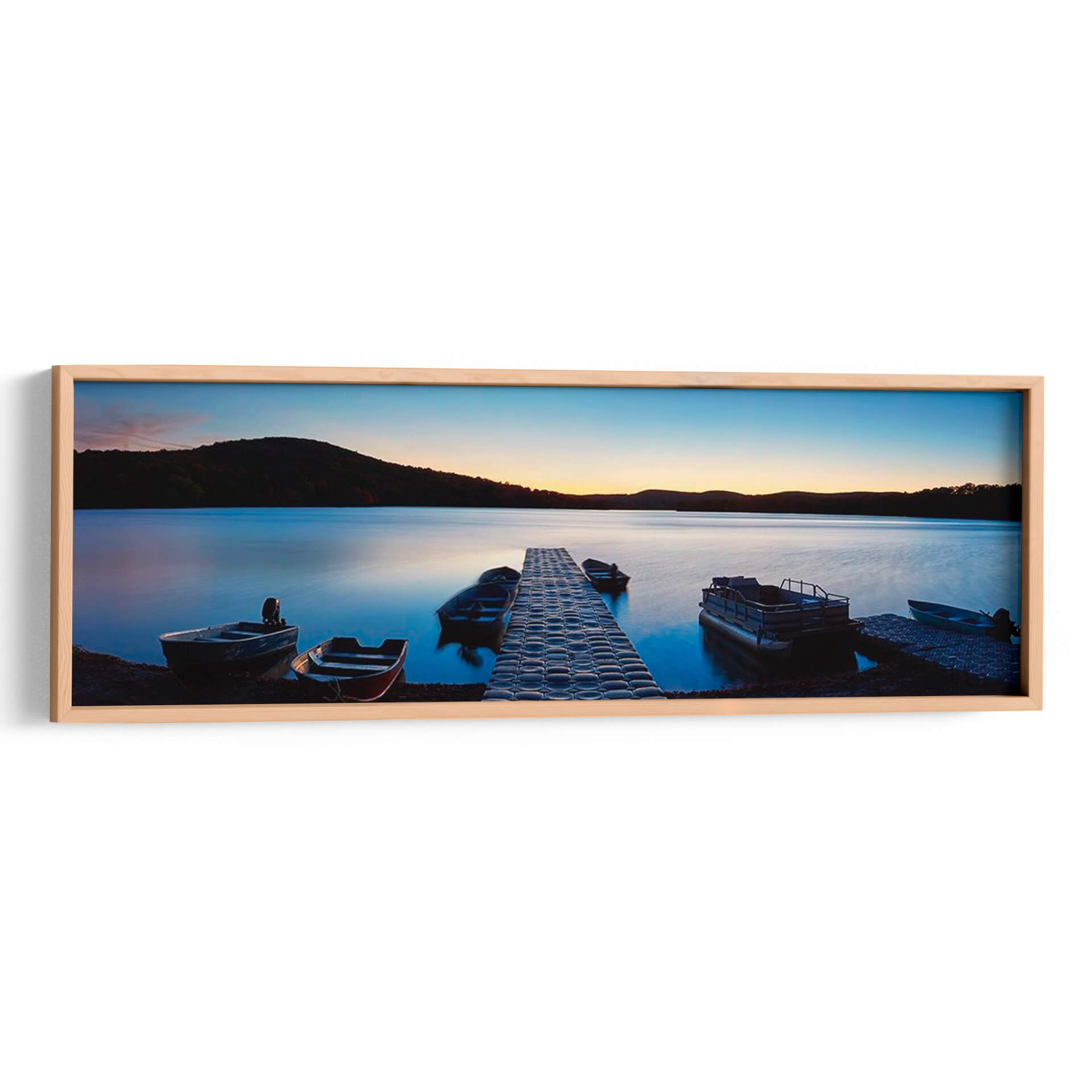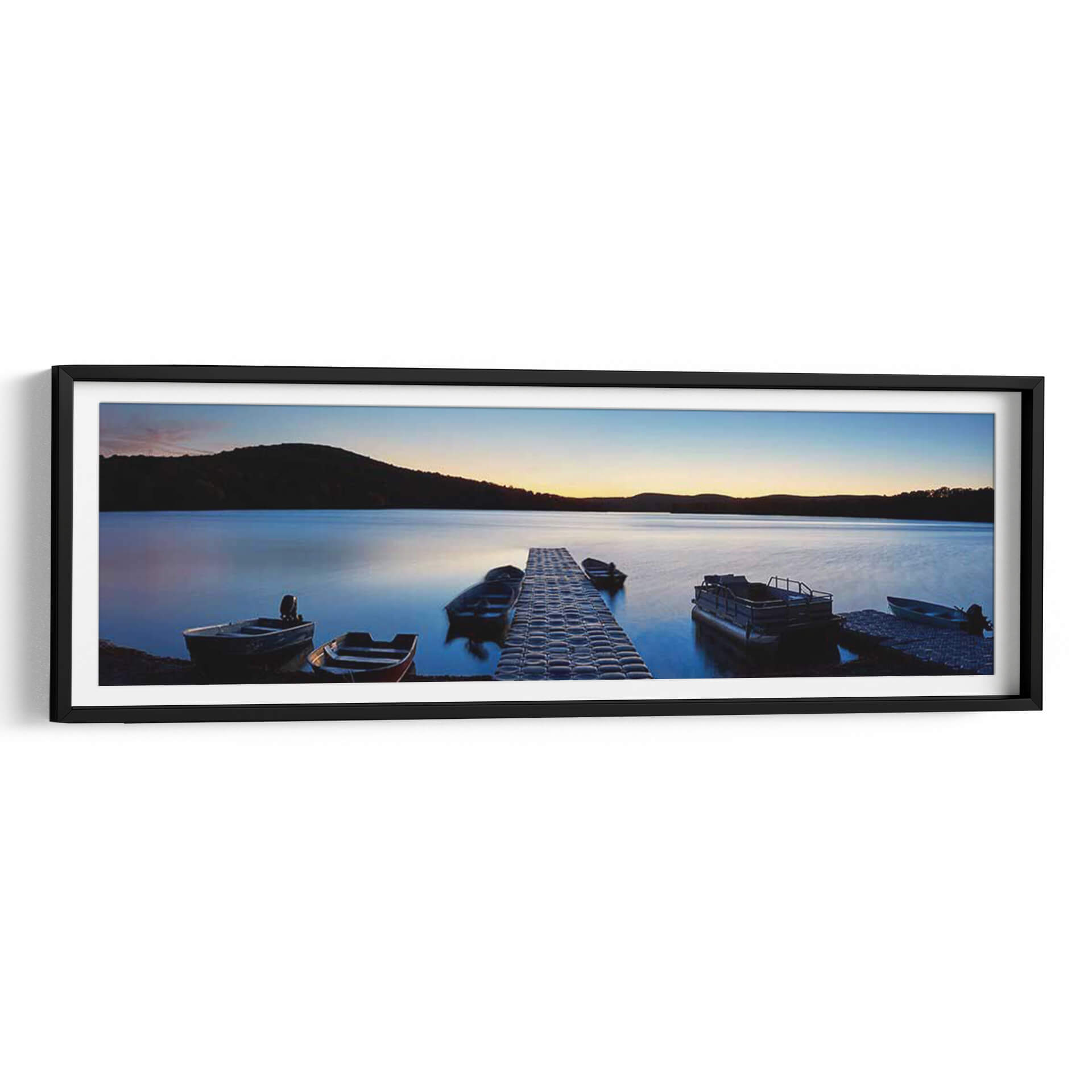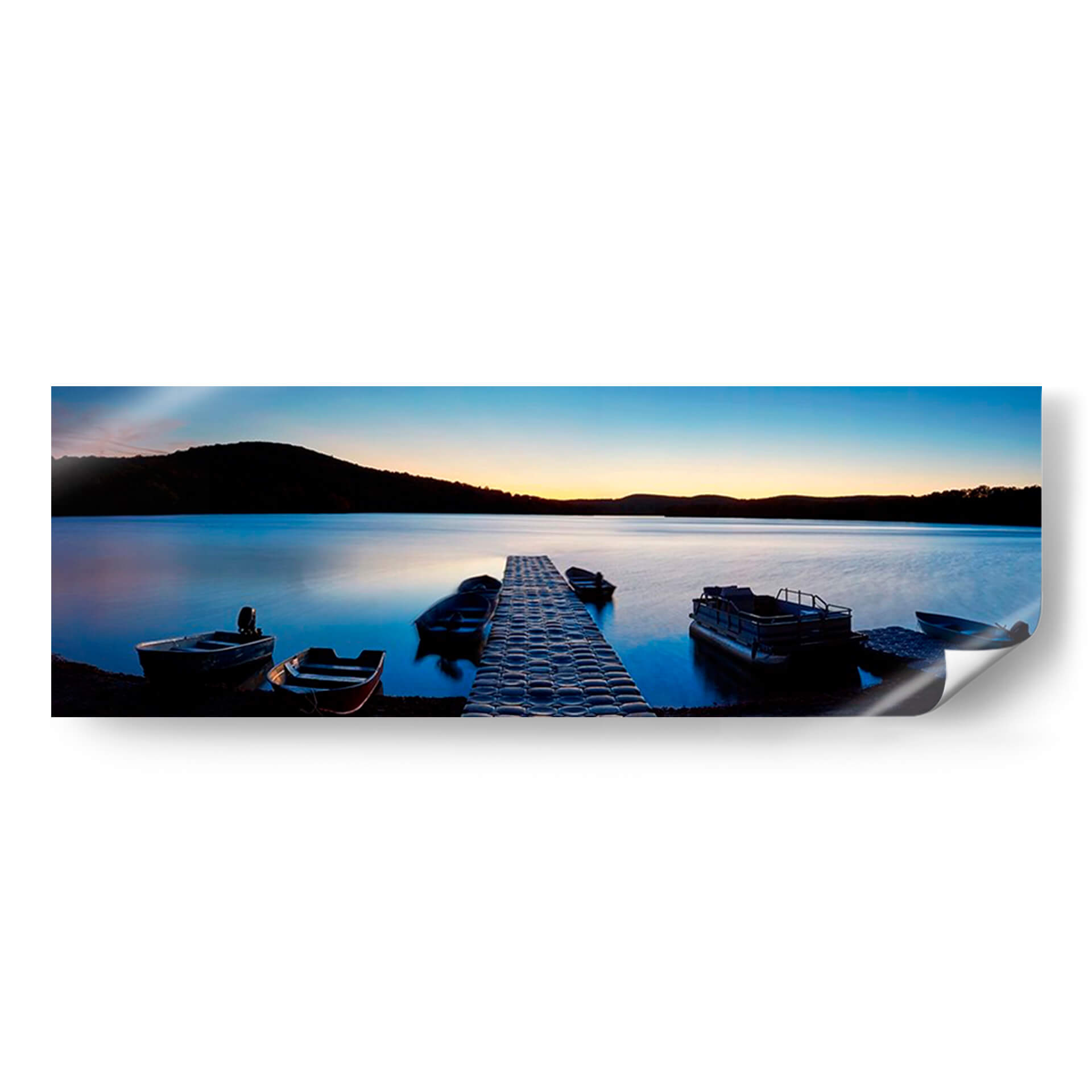 Captura la serenidad y la belleza atemporal de un atardecer en el lago con 'Lakescape Panorama I', una obra de arte que invita a la contemplación. El artista James McLoughlin ha plasmado magistralmente la calma de un paisaje lacustre al anochecer, con el cielo tiñéndose de suaves tonos anaranjados y azules que se reflejan en las aguas tranquilas. La composición panorámica ofrece una vista expansiva, donde una hilera de botes pequeños y un muelle alargado se adentran en la escena, sugiriendo una atmósfera de paz y anticipación. Las siluetas oscuras de las colinas boscosas en el horizonte contrastan delicadamente con el cielo luminoso, creando una profundidad visual cautivadora. Esta pieza es ideal para quienes buscan añadir un toque de tranquilidad y conexión con la naturaleza a su hogar u oficina. Su paleta de colores, dominada por azules profundos y cálidos matices del crepúsculo, evoca una sensación de calma y relajación. 'Lakescape Panorama I' es más que una simple imagen; es una ventana a un momento de paz, perfecta para crear un oasis de serenidad en cualquier espacio decorativo. Transforma tu ambiente con esta evocadora representación de la naturaleza al atardecer.
