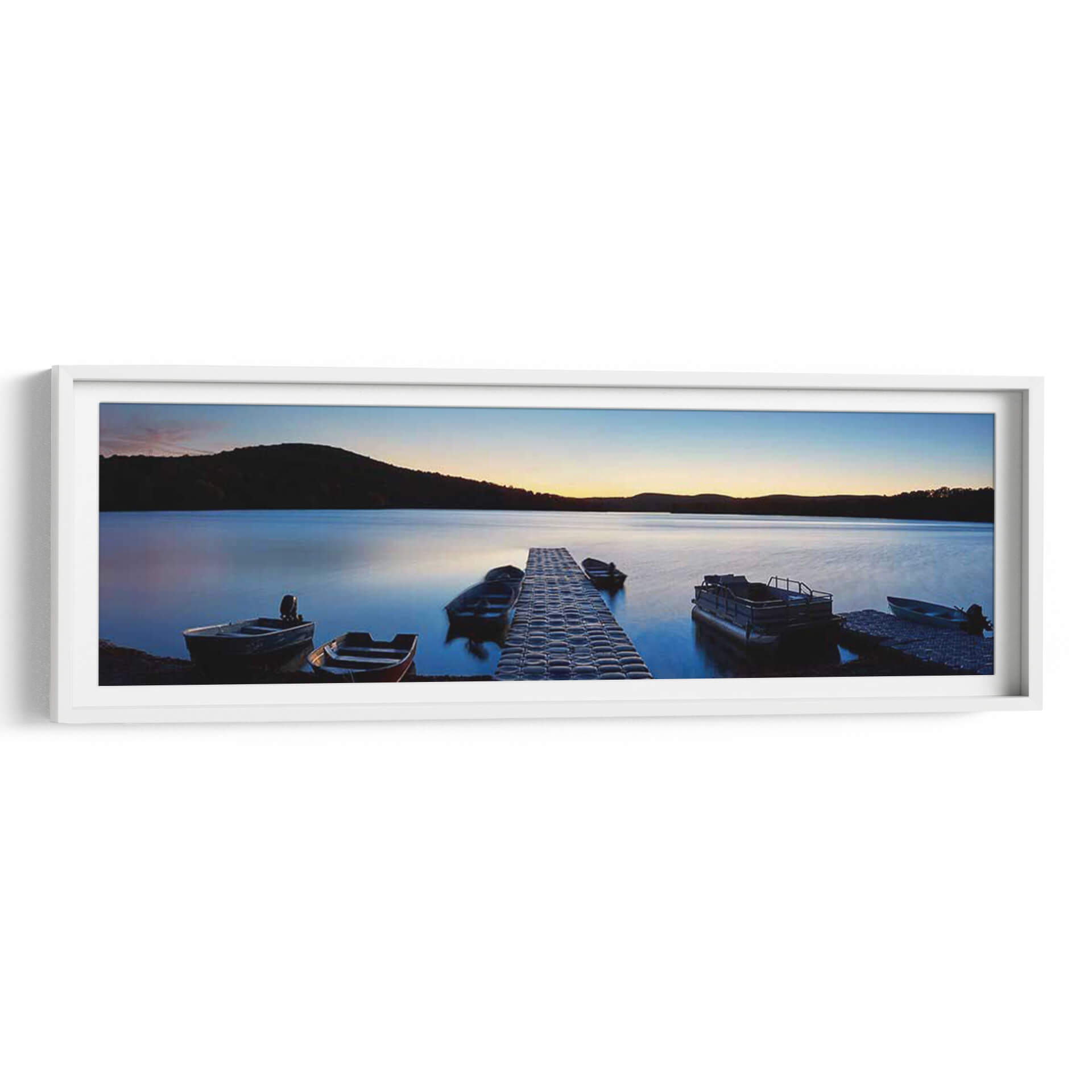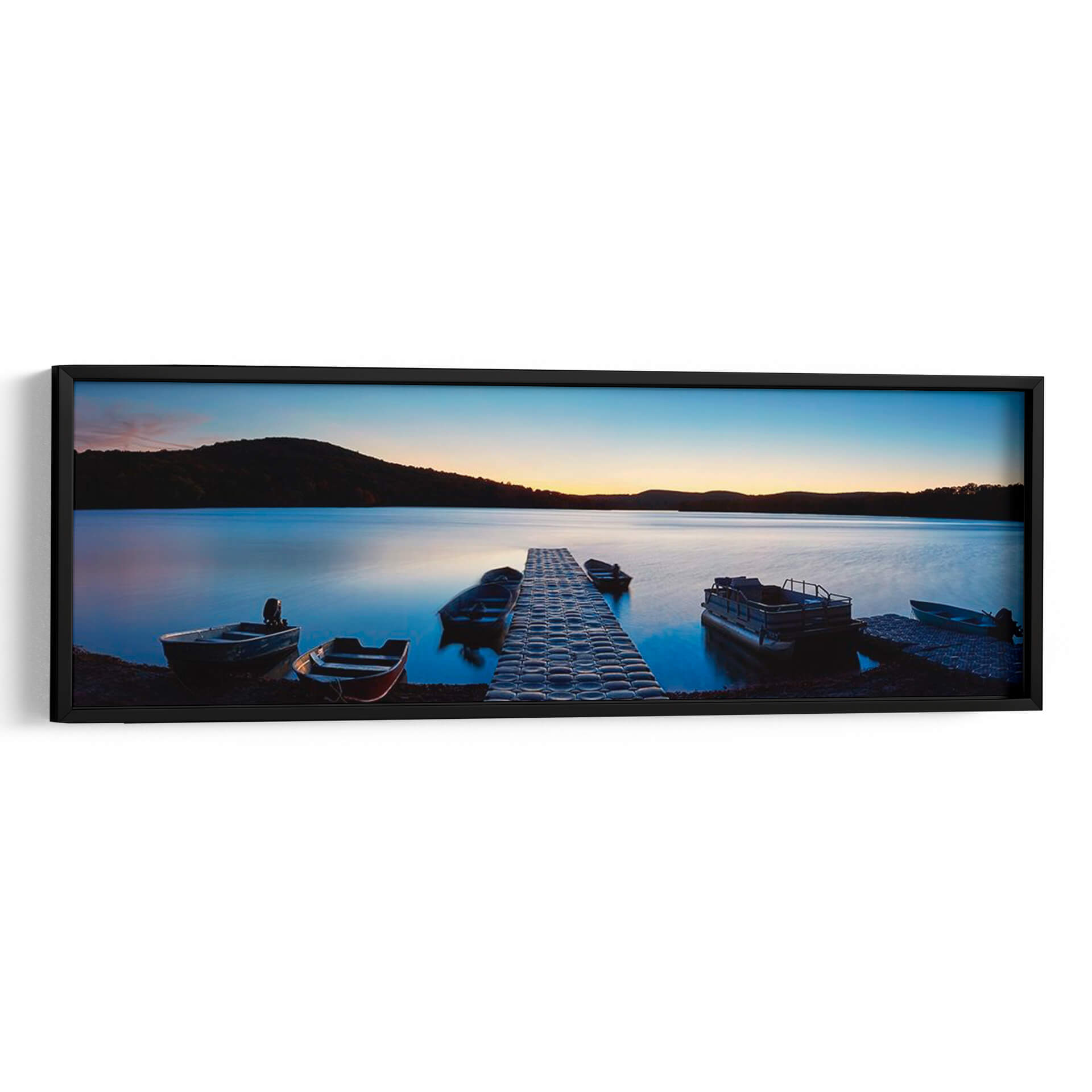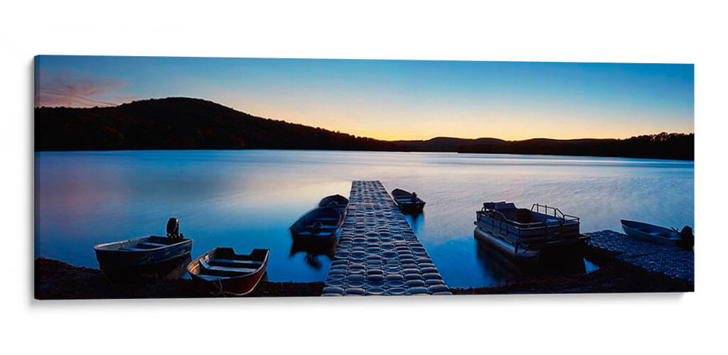 Captura la serenidad y la belleza atemporal de un atardecer en el lago con 'Lakescape Panorama I', una obra de arte que invita a la contemplación. El artista James McLoughlin ha plasmado magistralmente la calma de un paisaje lacustre al anochecer, con el cielo tiñéndose de suaves tonos anaranjados y azules que se reflejan en las aguas tranquilas. La composición panorámica ofrece una vista expansiva, donde una hilera de botes pequeños y un muelle alargado se adentran en la escena, sugiriendo una atmósfera de paz y anticipación. Las siluetas oscuras de las colinas boscosas en el horizonte contrastan delicadamente con el cielo luminoso, creando una profundidad visual cautivadora. Esta pieza es ideal para quienes buscan añadir un toque de tranquilidad y conexión con la naturaleza a su hogar u oficina. Su paleta de colores, dominada por azules profundos y cálidos matices del crepúsculo, evoca una sensación de calma y relajación. 'Lakescape Panorama I' es más que una simple imagen; es una ventana a un momento de paz, perfecta para crear un oasis de serenidad en cualquier espacio decorativo. Transforma tu ambiente con esta evocadora representación de la naturaleza al atardecer.