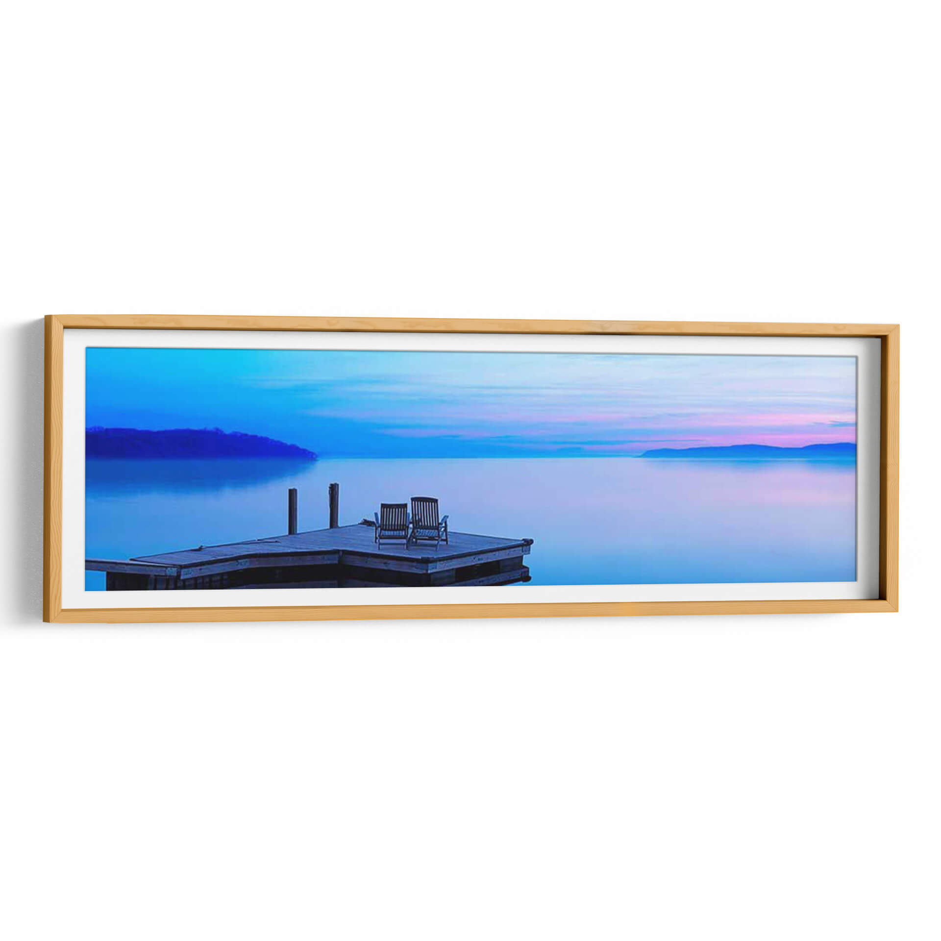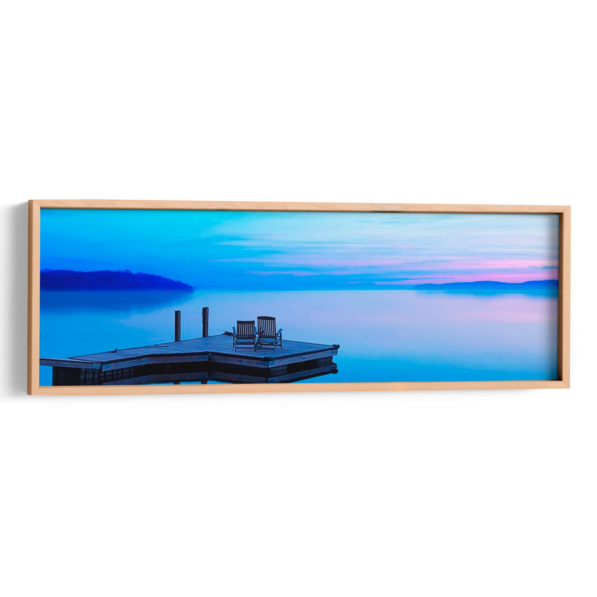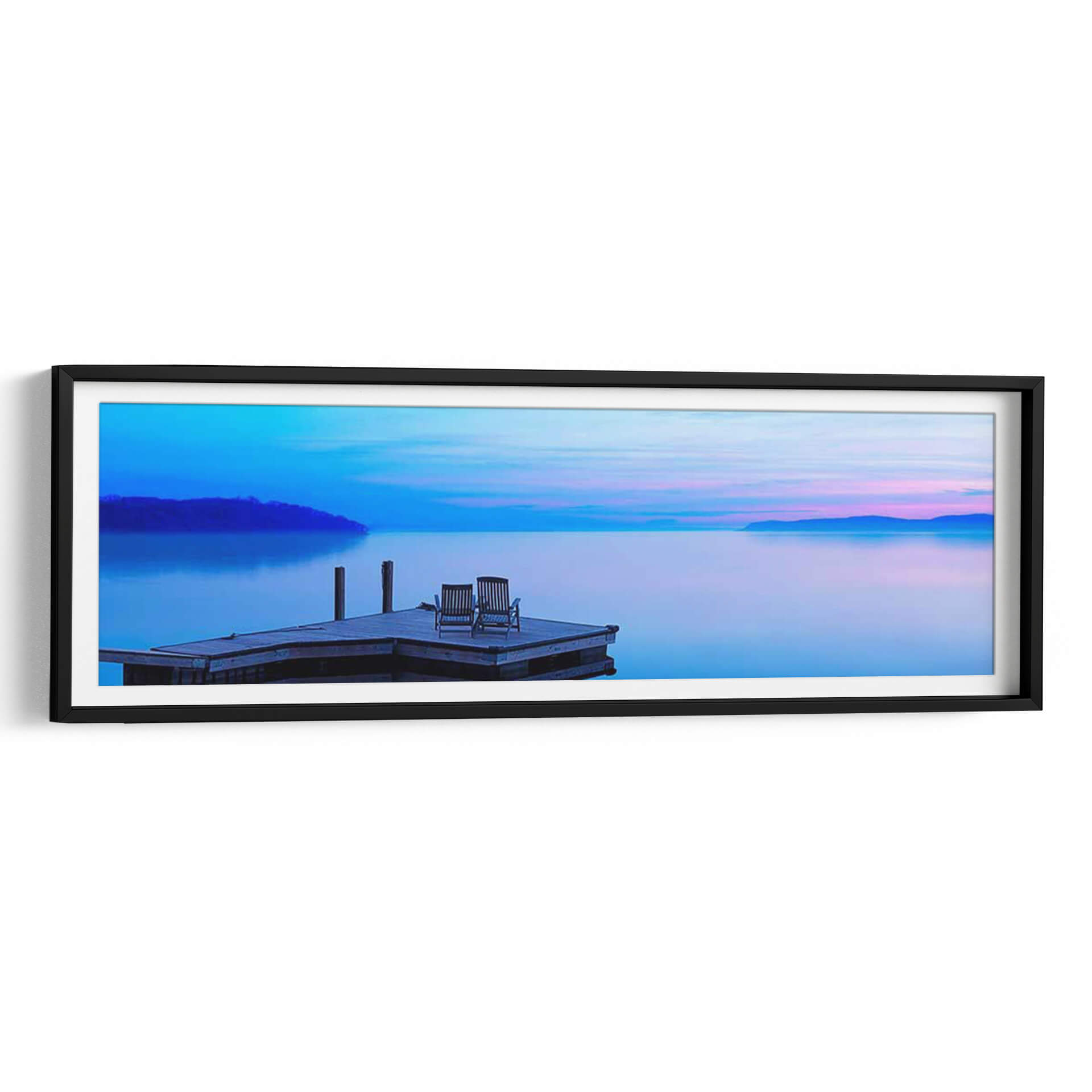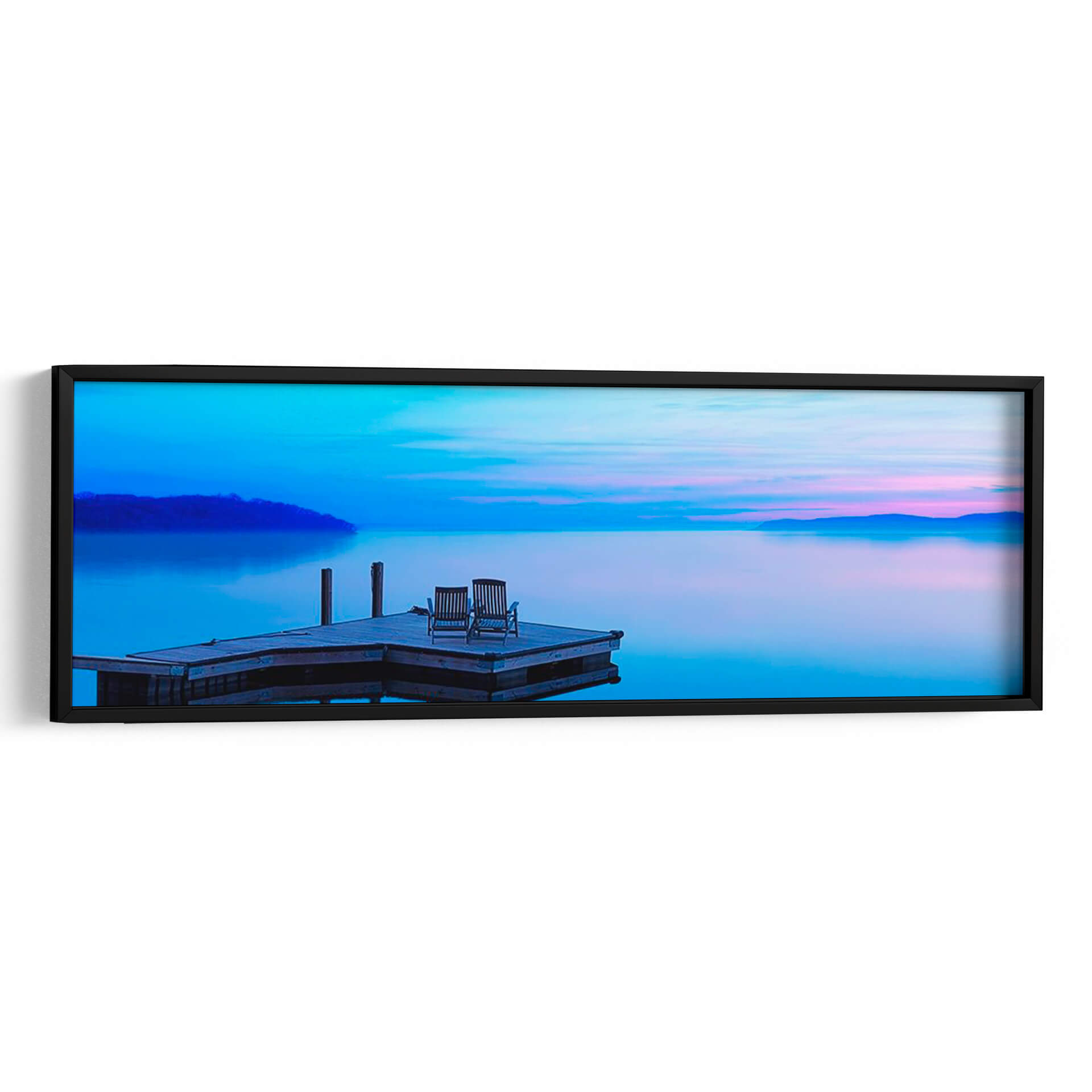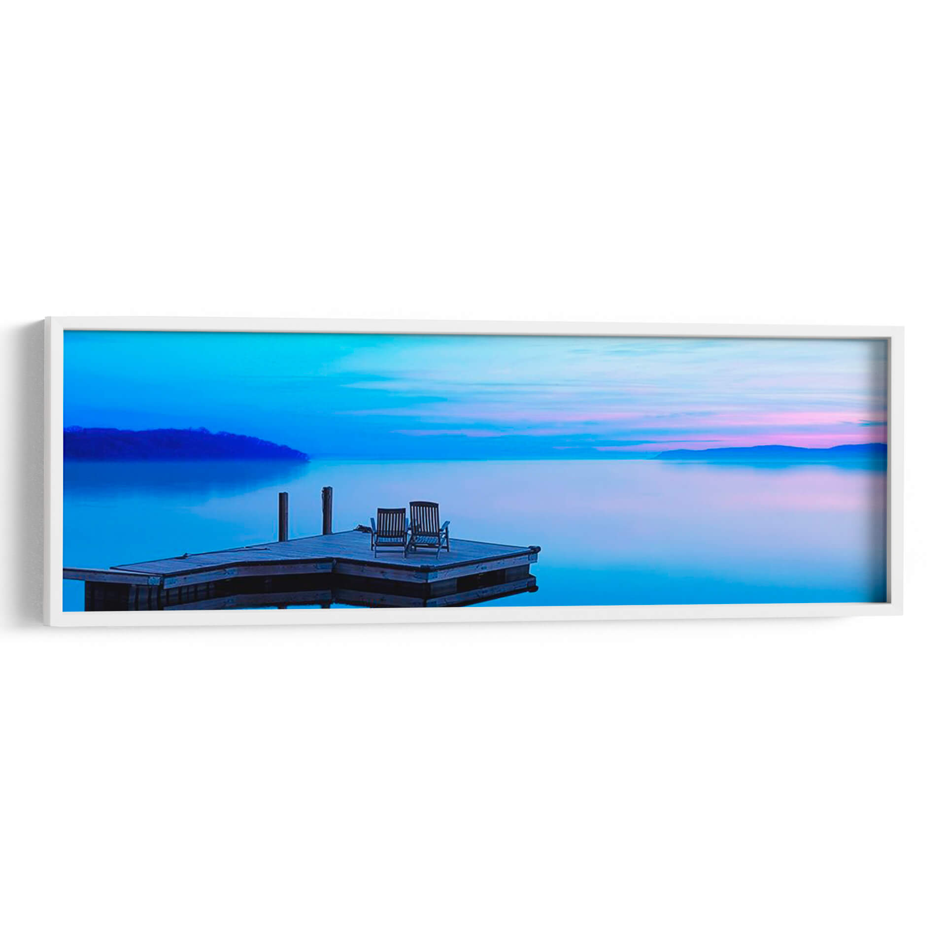 Captura la serenidad y la belleza de un amanecer o atardecer en este evocador cuadro decorativo 'Lakescape Panorama Iv'. La obra presenta una vista panorámica de un muelle de madera con dos sillas mecedoras, invitando a la contemplación, extendiéndose hacia un vasto cuerpo de agua bajo un cielo teñido de tonos azules profundos y toques sutiles de rosa y lavanda. La paleta de colores, dominada por el azul, crea una atmósfera de calma y tranquilidad, perfecta para transformar cualquier habitación en un refugio de paz. La composición minimalista, con la línea del horizonte difusa y las siluetas de las montañas en la distancia, acentúa la sensación de amplitud y quietud. Este cuadro decorativo es ideal para quienes buscan añadir un toque de naturaleza serena y un aire vacacional a su hogar u oficina. Su estilo contemporáneo y su atmósfera relajante lo convierten en una pieza versátil que complementa diversos estilos de decoración, desde el moderno hasta el rústico, aportando un punto focal de ensueño y serenidad. Descubre la magia de los paisajes acuáticos y trae la calma del lago a tu espacio con esta impresionante obra de arte.