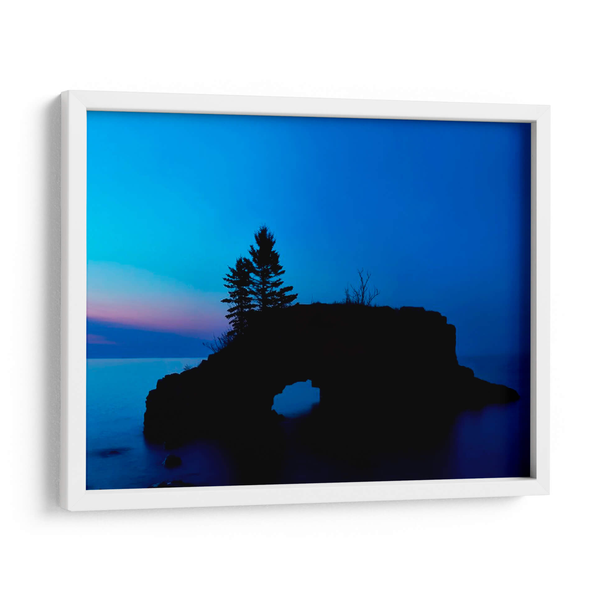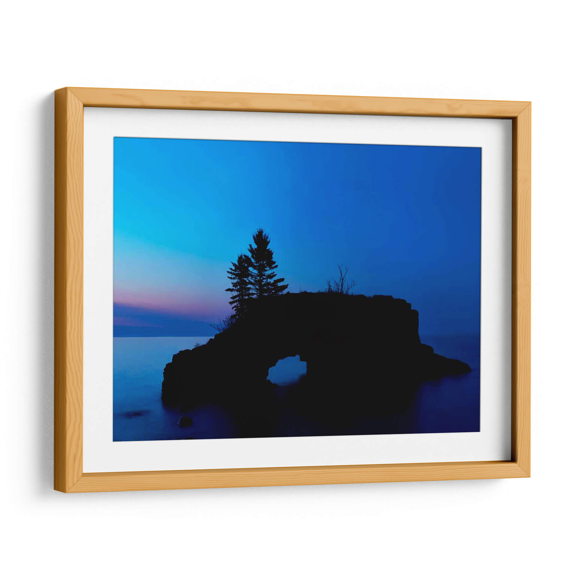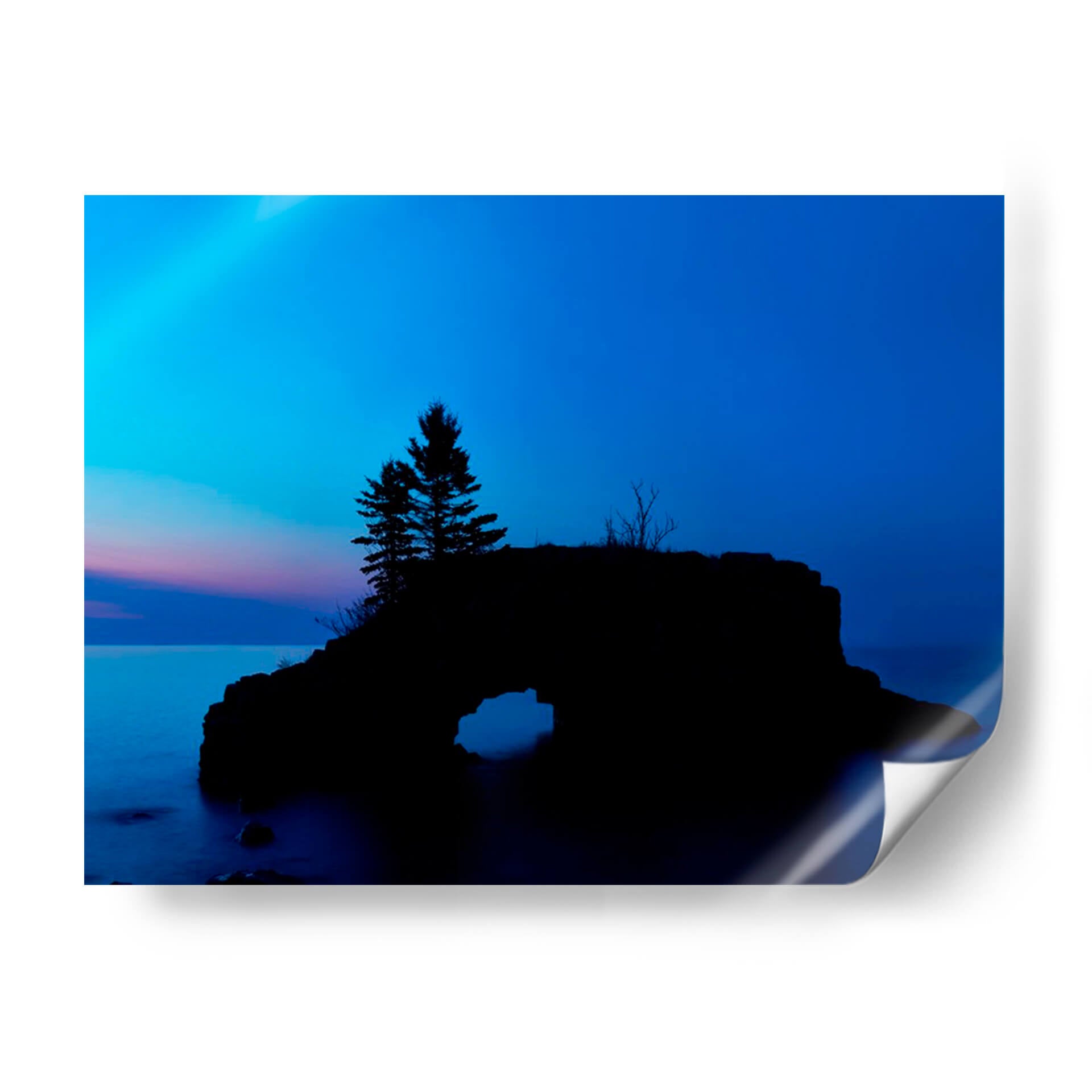 Sumérgete en la serena belleza de "Lakescape Xi" de James McLoughlin, un cuadro decorativo que captura la mágica transición del día a la noche. Esta obra de arte presenta una silueta dramática de un acantilado rocoso con un arco natural, coronado por dos árboles esbeltos y un cielo que se desvanece de un azul profundo a tonos rosados al horizonte. El agua calma, de un azul intenso, refleja la quietud del paisaje, creando una atmósfera de paz y contemplación. La composición minimalista y la paleta de colores fríos, dominada por azules y toques sutiles de magenta, hacen de este cuadro una pieza ideal para aportar serenidad y sofisticación a cualquier espacio. Perfecto para salones modernos, dormitorios que buscan un oasis de tranquilidad, o estudios que necesitan un toque de inspiración natural. "Lakescape Xi" no es solo una imagen, es una invitación a la calma, un recordatorio de la belleza efímera de los paisajes naturales y un punto focal que invita a la reflexión y al descanso visual, transformando cualquier pared en una ventana a un momento de pura paz.
