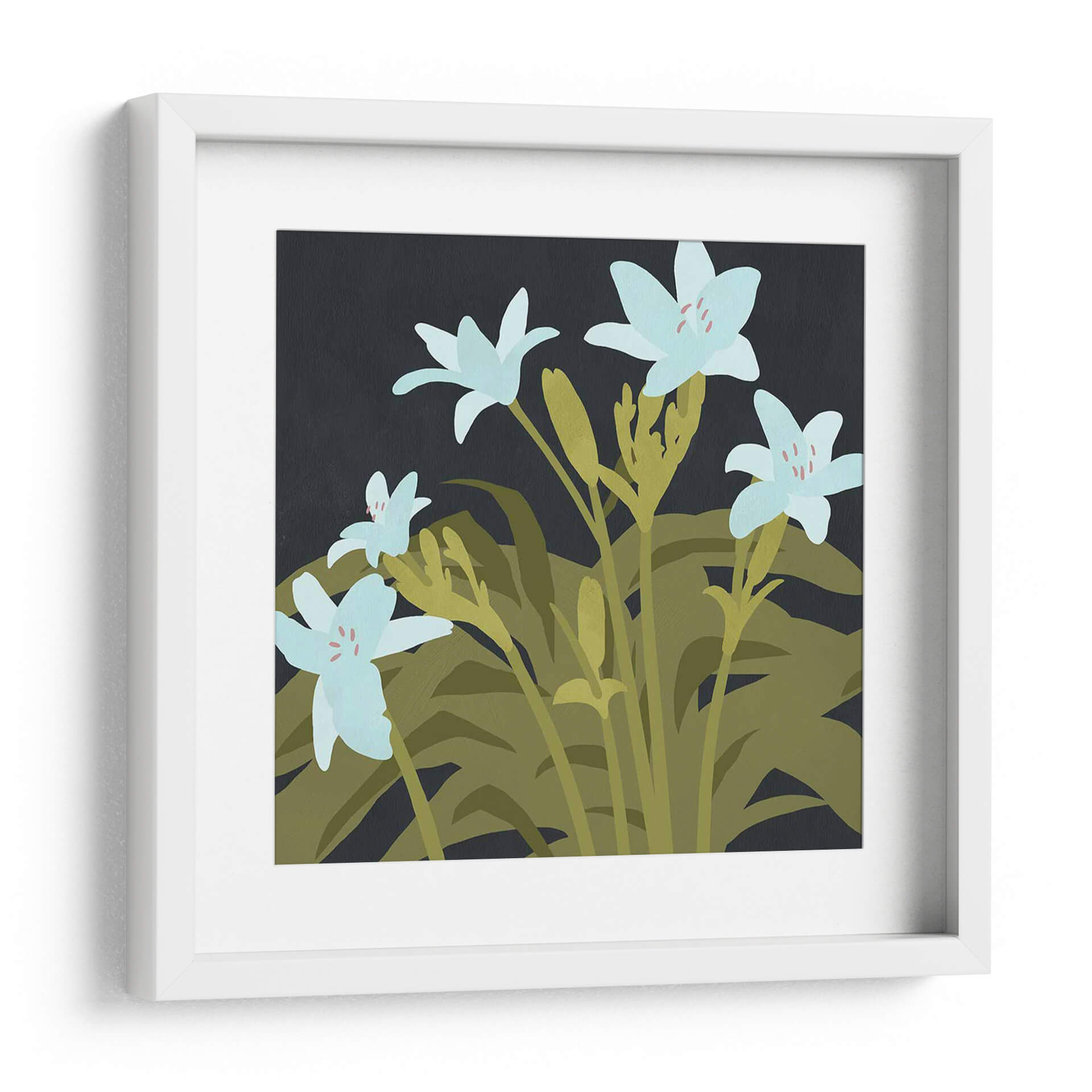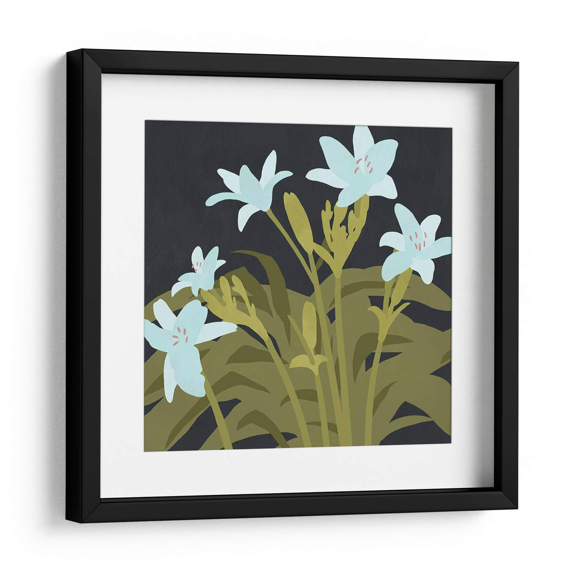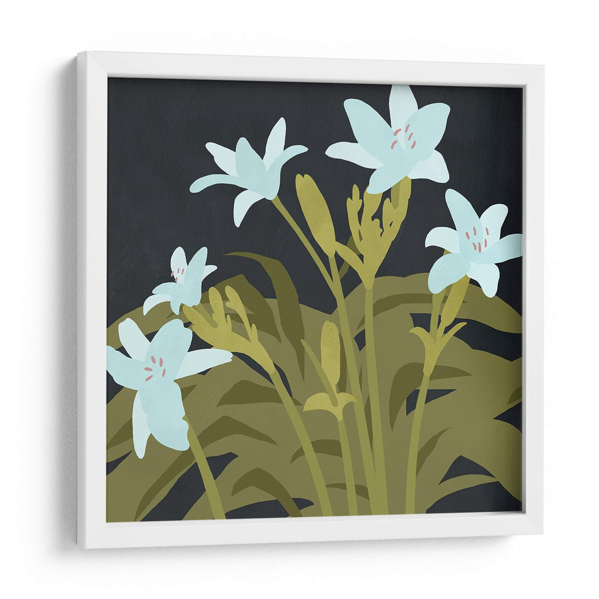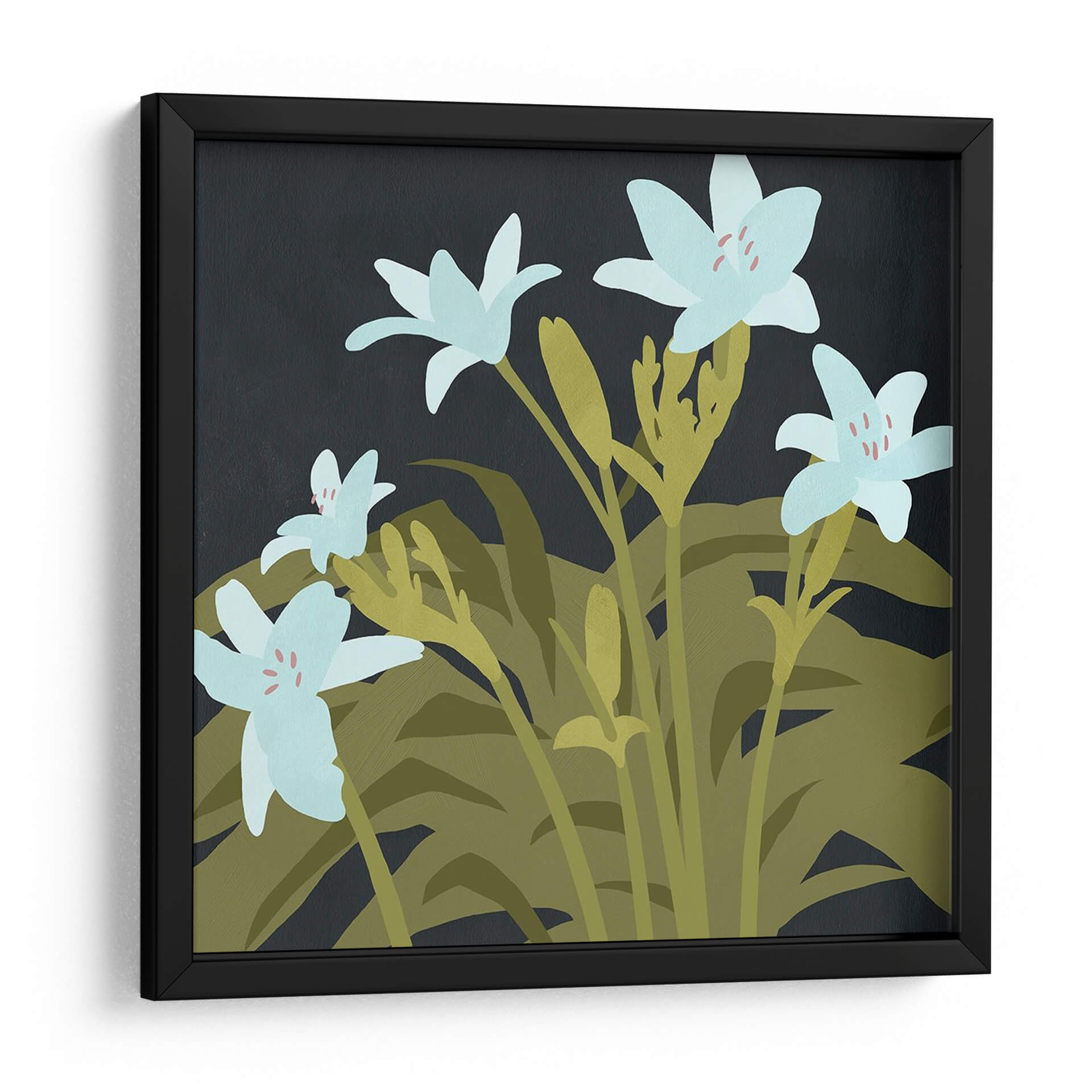 Sumérgete en la serenidad botánica con 'Lirios De Jardín I', una obra de arte digital que captura la delicadeza de la naturaleza en su máxima expresión. Este cuadro decorativo presenta una composición cautivadora de lirios de un suave tono azul pálido, cuyas sutiles pinceladas de color rosado en el centro añaden un toque de calidez. Los lirios se alzan grácilmente sobre un follaje exuberante en tonos verdes y ocres, creando un contraste visual que resalta la frescura y la vitalidad de las flores. El fondo oscuro y profundo proporciona un marco sofisticado, permitiendo que cada pétalo y hoja cobre protagonismo y emane una atmósfera de calma y contemplación. El estilo, con sus formas simplificadas y una paleta de colores cuidadosamente seleccionada, evoca una sensación de modernidad tranquila, ideal para espacios que buscan un equilibrio entre elegancia y naturaleza. Este cuadro es perfecto para añadir un punto focal orgánico y refrescante a tu sala de estar, dormitorio o incluso a un espacio de oficina, invitando a la reflexión y al disfrute de la belleza efímera de las flores en un jardín sereno, capturada para perdurar en tu hogar.