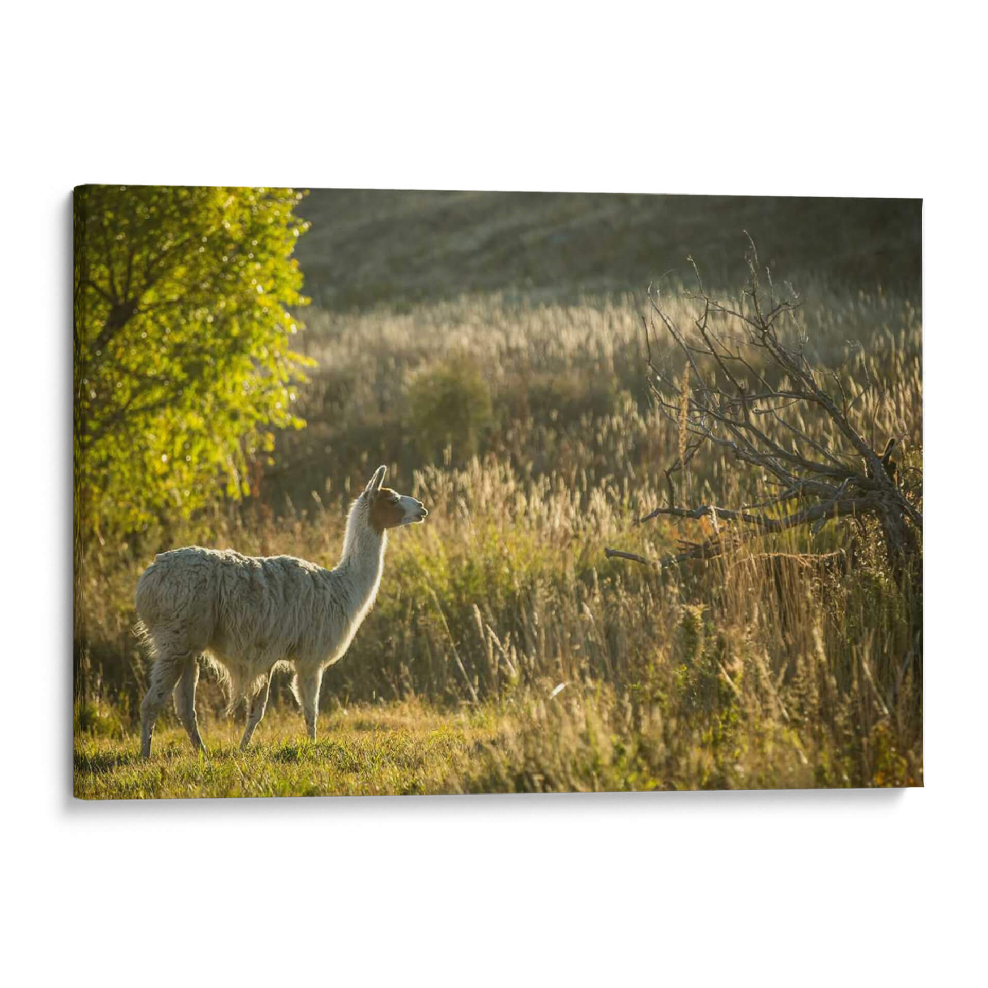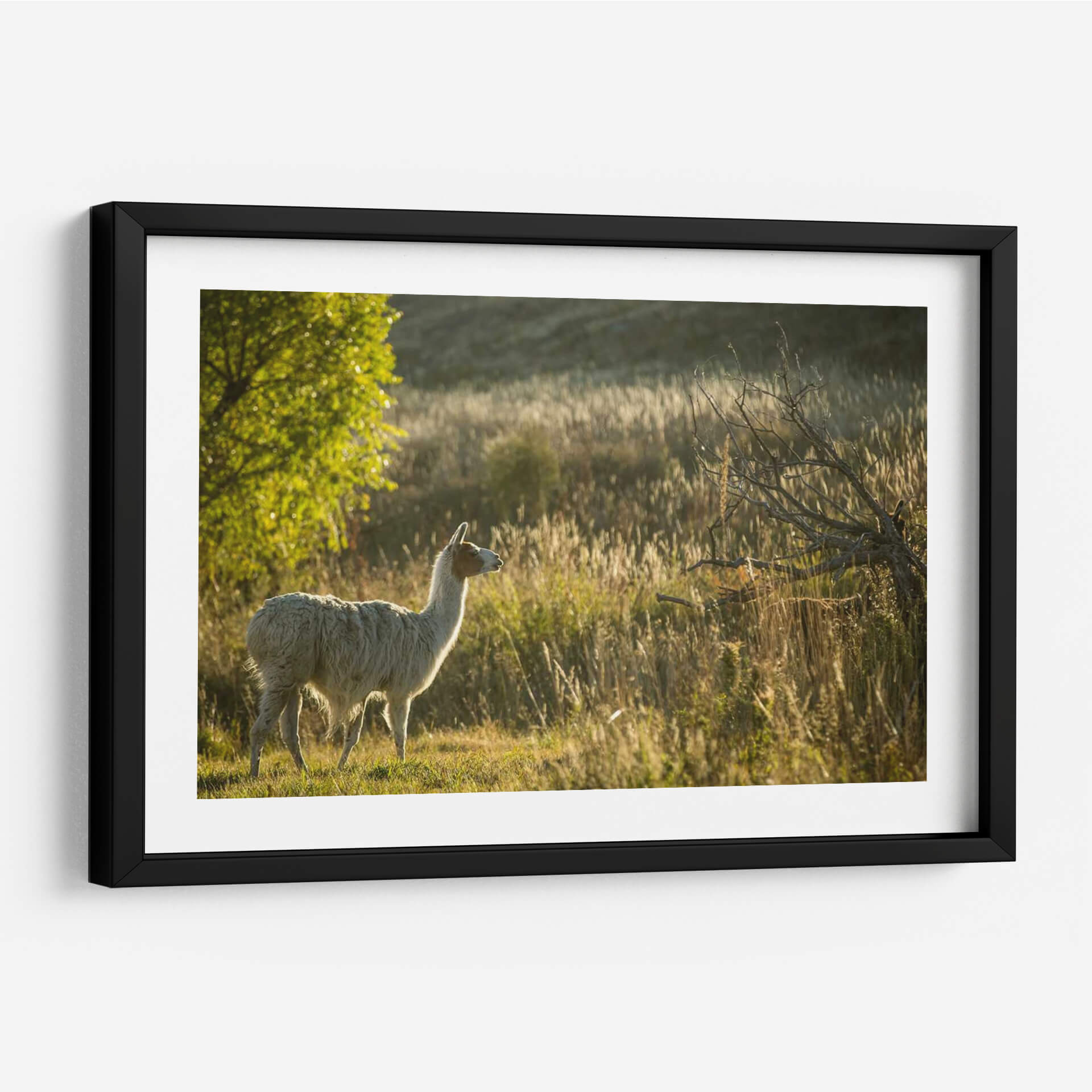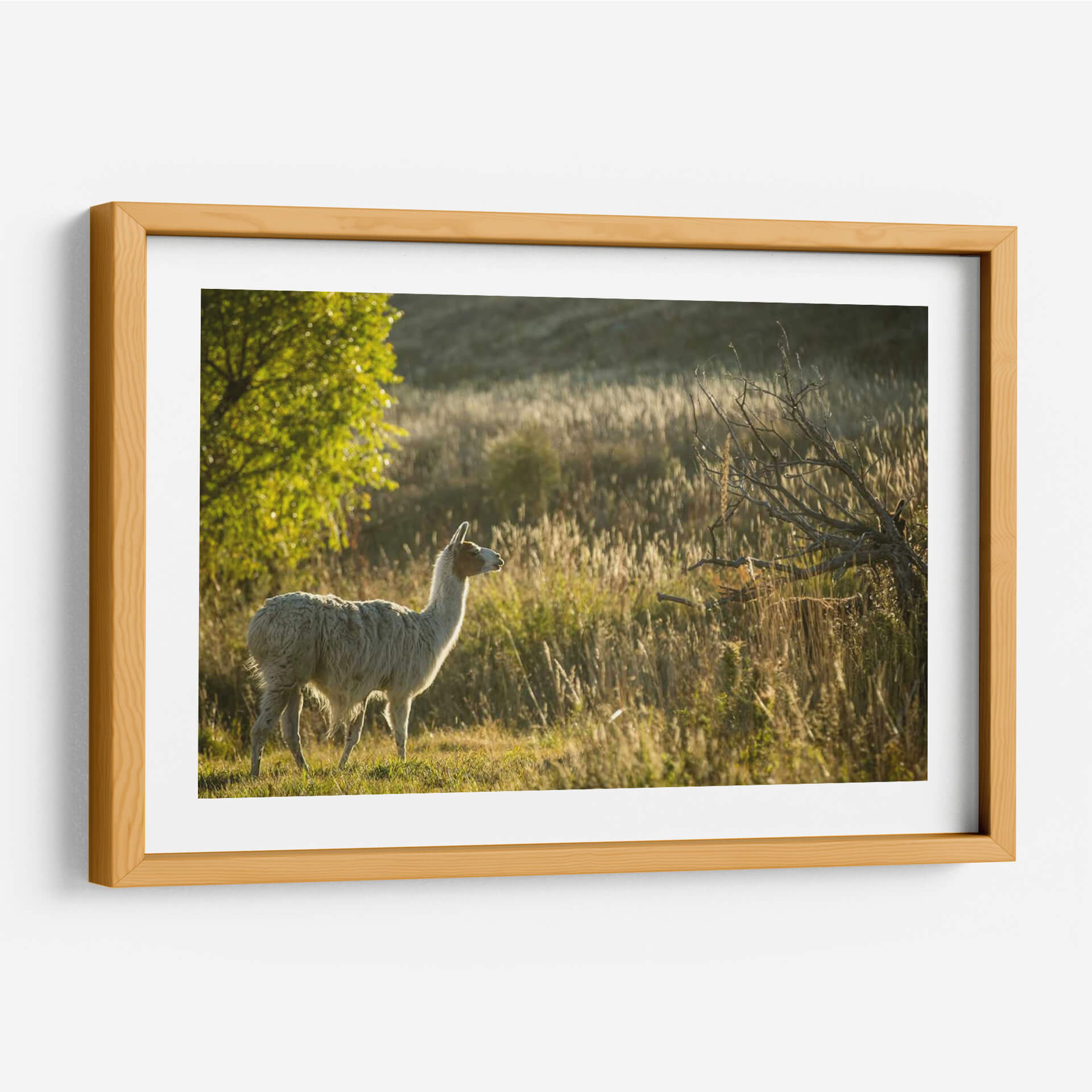 Sumérgete en la serenidad de la naturaleza con "Llama Retrato V", una obra de arte que captura la delicadeza de este majestuoso animal en su hábitat natural. La pieza presenta una llama de pelaje blanco y esponjoso, de pie con elegancia en un campo de pastos altos que se mecen suavemente. La luz dorada del atardecer baña la escena, creando un ambiente cálido y pacífico, resaltando las texturas y los tonos tierra del paisaje. A la izquierda, un árbol frondoso de un verde vibrante contrasta con la paleta más suave del fondo, añadiendo profundidad y un toque de frescura. La composición, con la llama como punto focal, invita a la contemplación y a la conexión con la fauna. Este cuadro decorativo es ideal para quienes buscan añadir un elemento de tranquilidad y belleza natural a su hogar u oficina, transformando cualquier espacio en un refugio de paz. La fotografía, con su enfoque nítido en la llama y un desenfoque artístico del fondo, evoca una sensación de intimidad y asombro ante la majestuosidad de la vida silvestre.