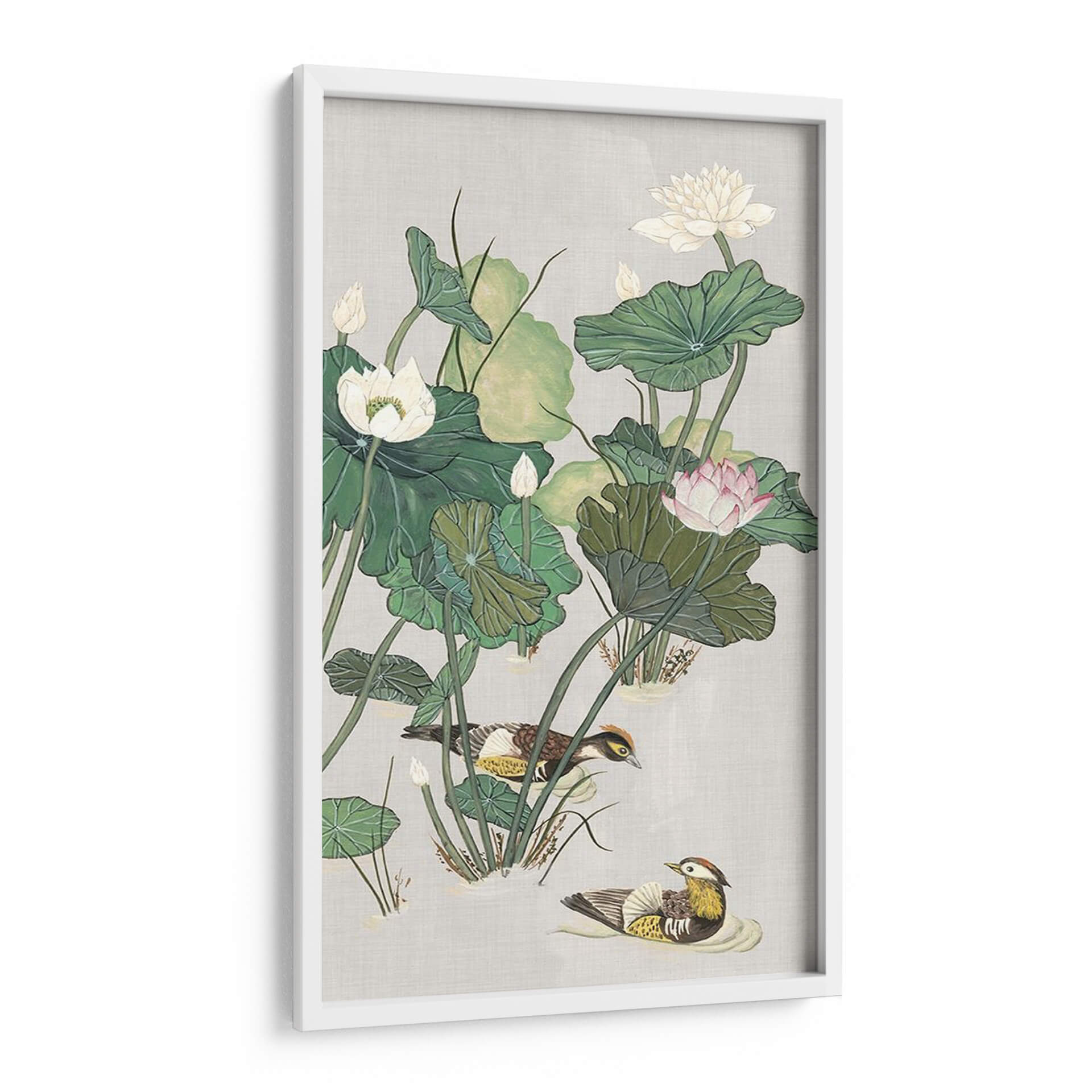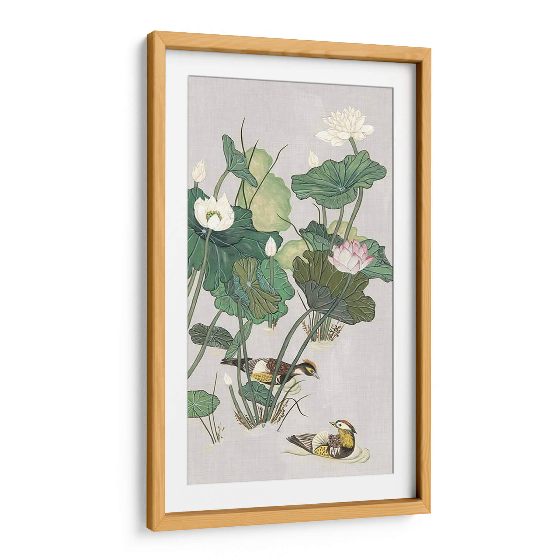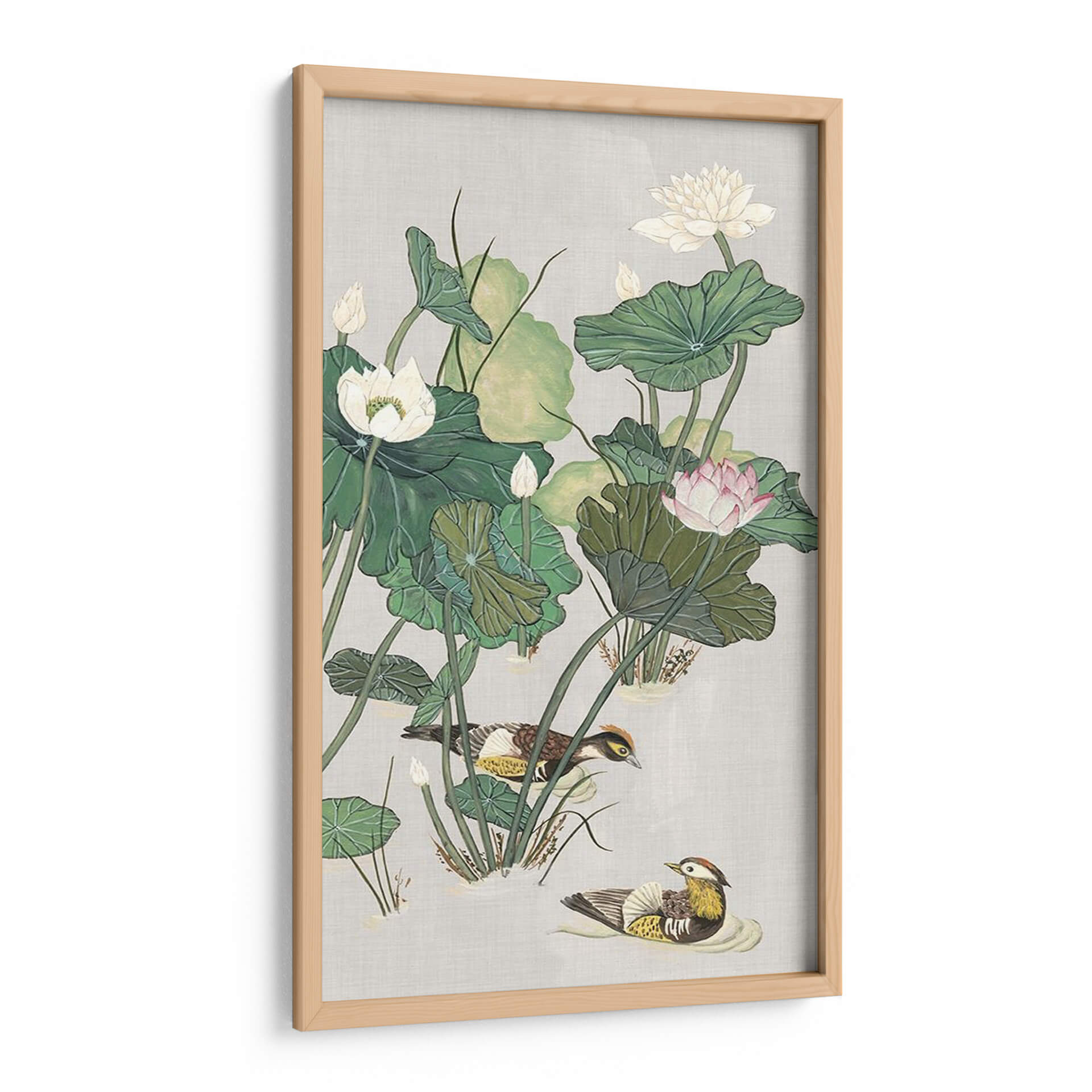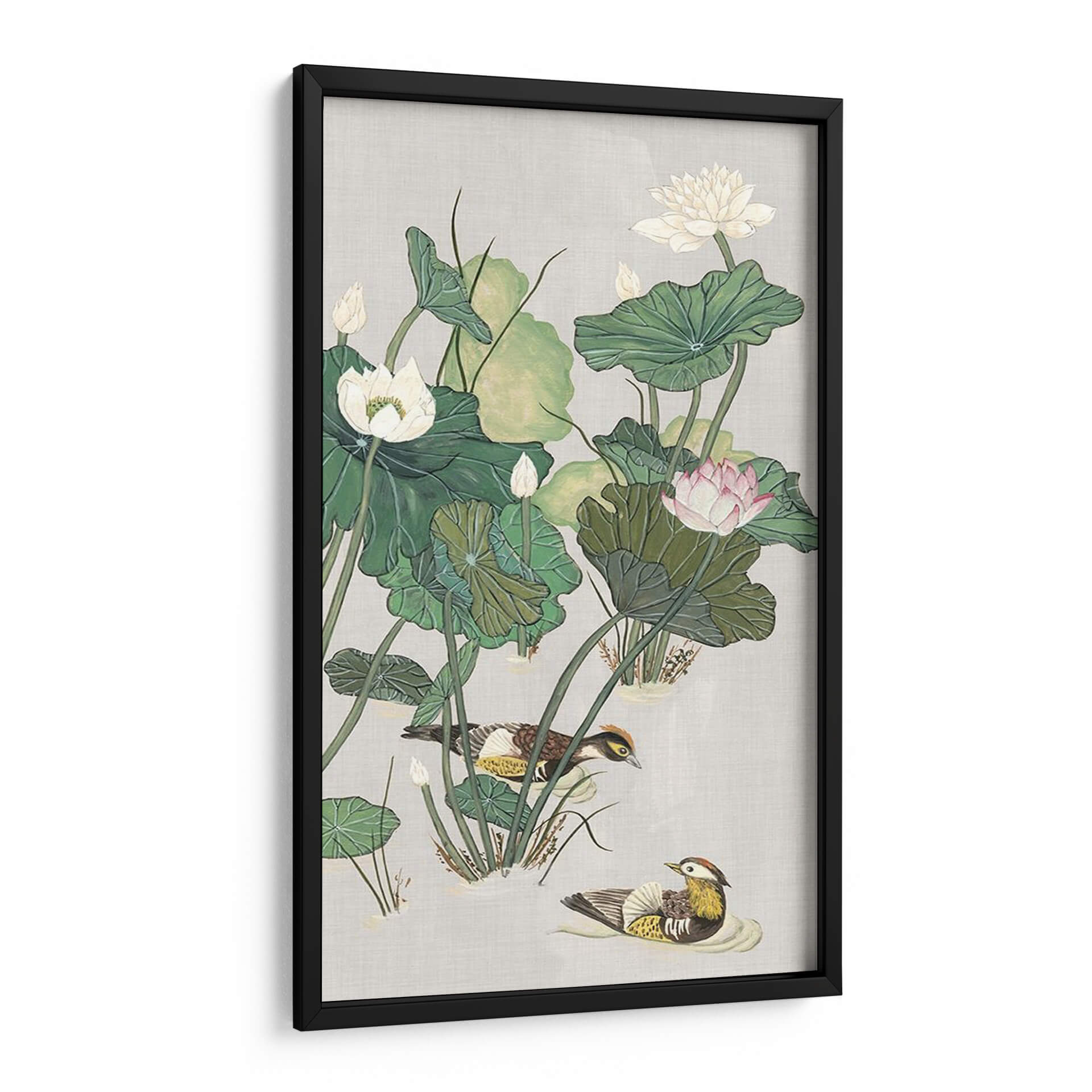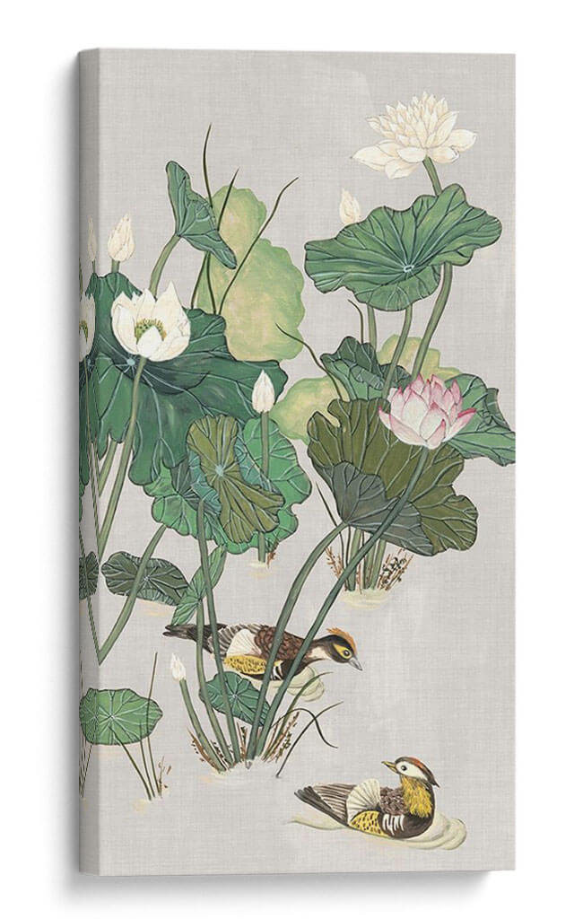 Sumérgete en la serenidad de 'Lotus Pond I', una obra de arte decorativo de Melissa Wang que captura la esencia de un estanque tranquilo al amanecer. Este cuadro decorativo presenta lirios de agua en plena floración, con delicados pétalos blancos y rosados que contrastan con el vibrante verde de sus hojas exuberantes. Dos patos ornamentales nadan apaciblemente entre la vegetación, añadiendo un toque de vida y movimiento a la composición. La paleta de colores, dominada por tonos neutros de gris perla en el fondo, verdes profundos y acentos de blanco y rosa, crea una atmósfera de calma y armonía. El estilo de la obra evoca la delicadeza de la pintura tradicional asiática, con trazos precisos y una atención meticulosa al detalle. Este cuadro es perfecto para infundir paz y elegancia en cualquier espacio, ya sea una sala de estar moderna, un dormitorio acogedor o una oficina que busca un remanso de tranquilidad. 'Lotus Pond I' no es solo una pieza decorativa, es una invitación a la contemplación y al disfrute de la belleza natural, aportando un aire de sofisticación atemporal a tu hogar.