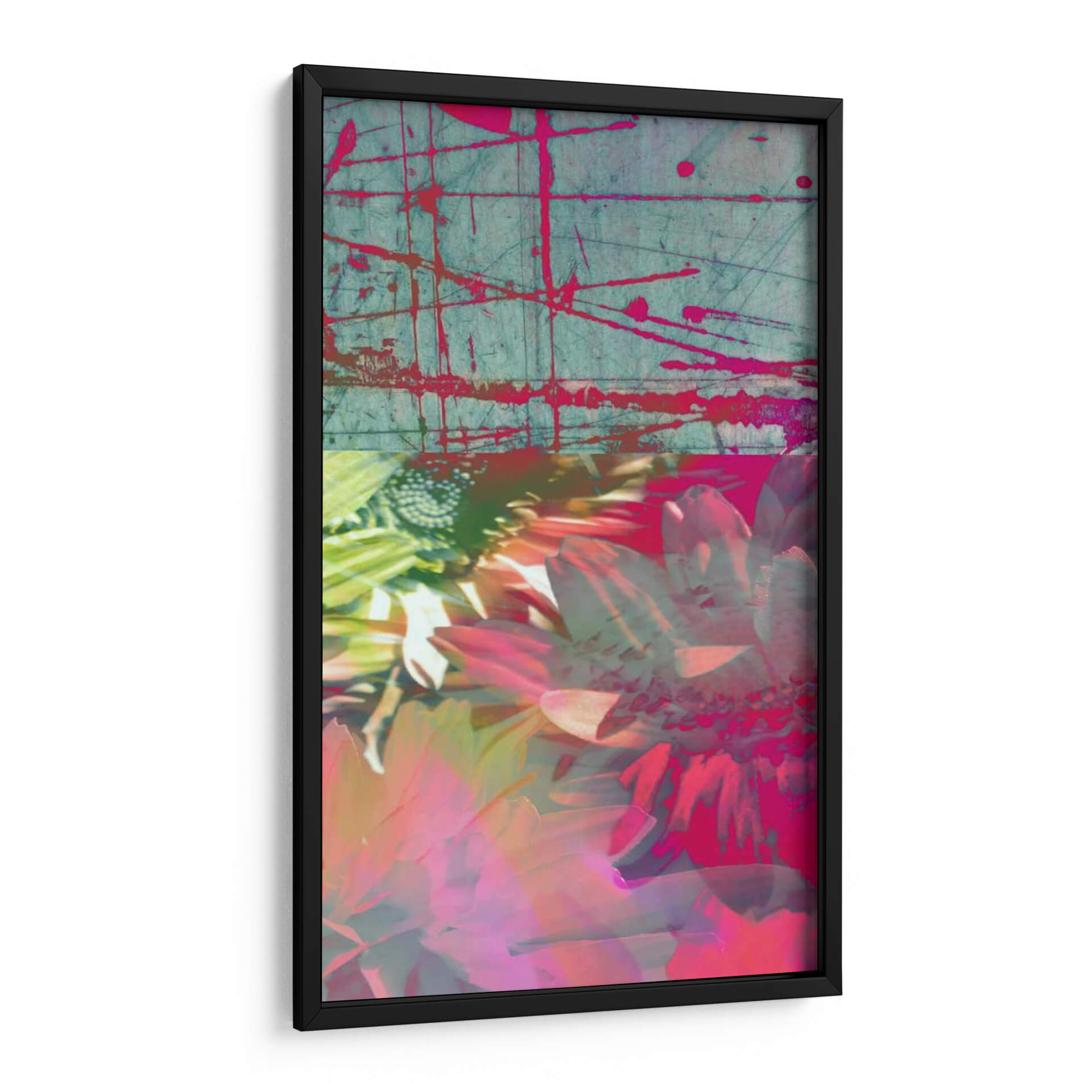 Sumérgete en la vibrante explosión de color y textura de "Maravillas Rosadas II", una obra de arte contemporáneo que redefine la belleza floral con un toque abstracto y audaz. Este cuadro decorativo presenta una composición dividida, donde la parte superior evoca una superficie rústica y desgastada, marcada por enérgicas salpicaduras y líneas de color rosa intenso sobre un fondo azul verdoso texturizado. Esta sección superior crea un contraste intrigante con la parte inferior, que se desborda en un caleidoscopio de pétalos de flores, predominantemente en tonos fucsia, rosa pálido y toques de verde lima. La imagen floral, capturada con un enfoque artístico y etéreo, parece fusionarse con la abstracción, creando una atmósfera de ensueño y dinamismo. "Maravillas Rosadas II" es ideal para añadir un punto focal vibrante y lleno de personalidad a cualquier espacio, desde una sala de estar moderna hasta un estudio creativo o un dormitorio con estilo. Su diseño único y la fusión de elementos orgánicos con la abstracción la convierten en una pieza versátil que atrae miradas y estimula la conversación, aportando vida y un toque artístico contemporáneo a tu decoración.