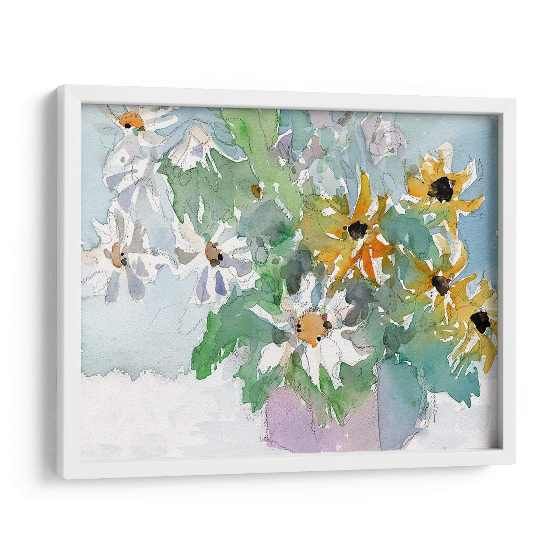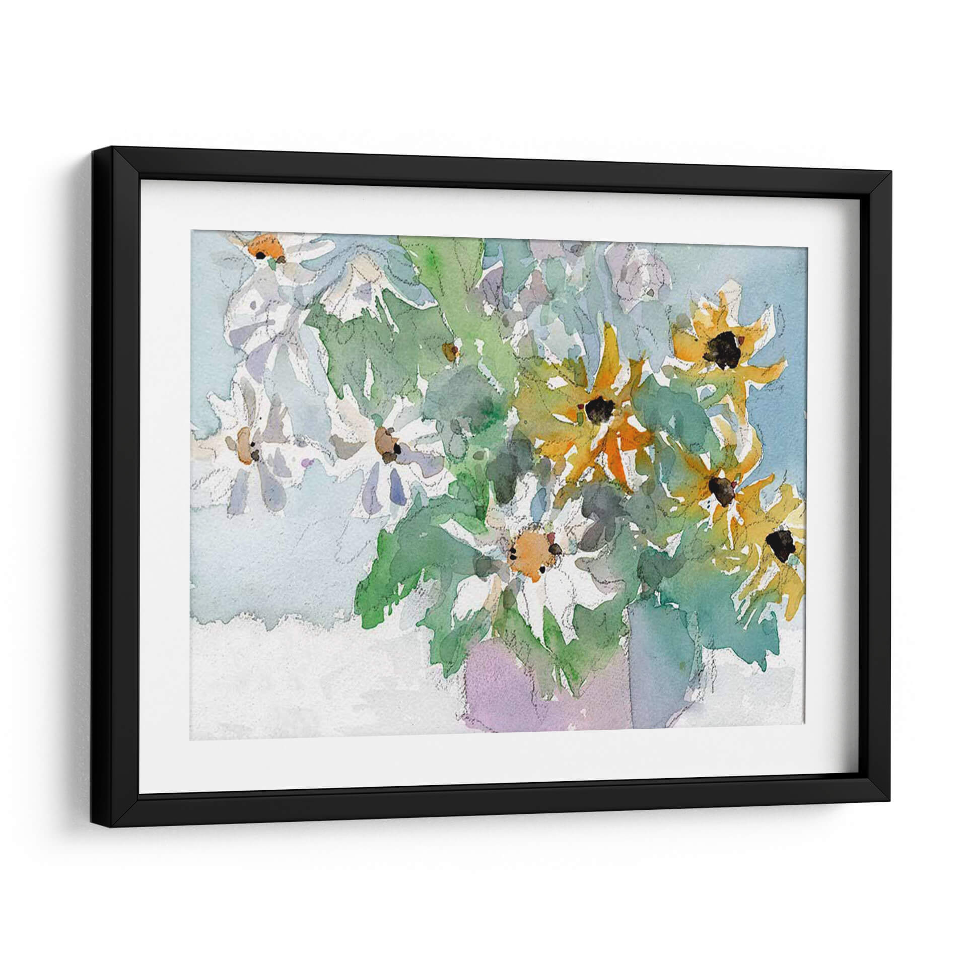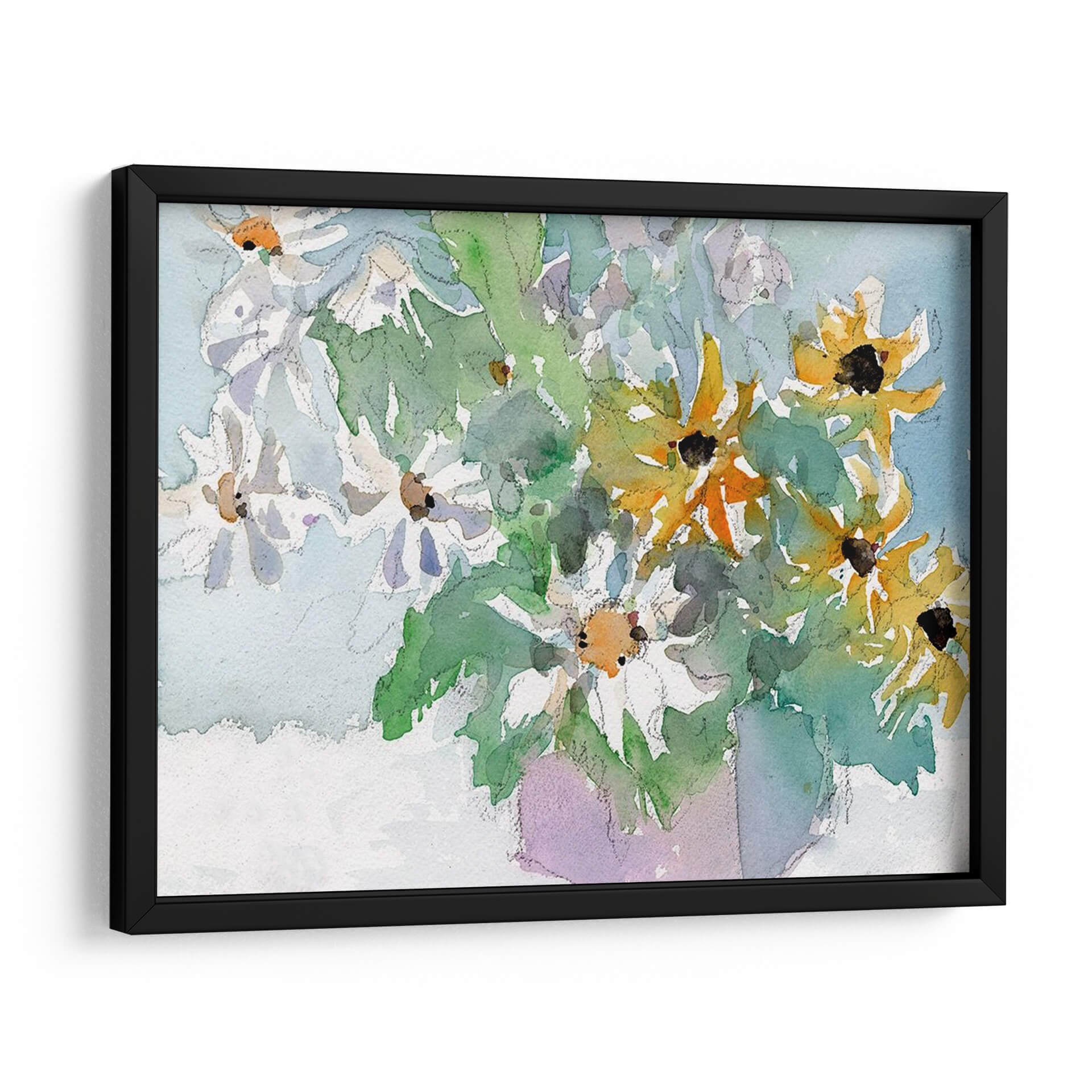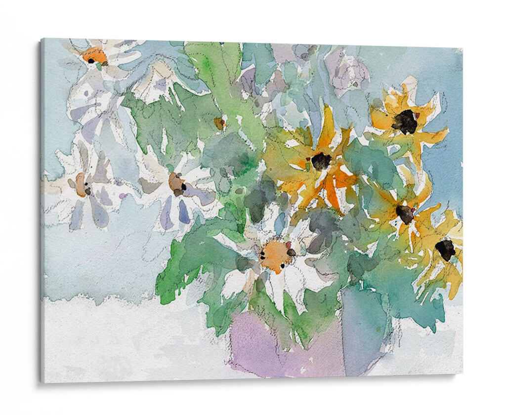 Sumérgete en la frescura y la vitalidad de "Margaritas y Susansos de Ojos Negros I", una obra de arte que captura la belleza efímera de la naturaleza con una delicadeza excepcional. Samuel Dixon nos presenta un bodegón contemporáneo donde las flores, tanto blancas como amarillas con sus característicos centros oscuros, parecen danzar en un lienzo bañado por una luz suave y etérea. La técnica de acuarela empleada aporta una cualidad translúcida y fluida, permitiendo que los colores se mezclen y superpongan de manera orgánica, creando una sensación de movimiento y vida. Los verdes vibrantes de las hojas contrastan armoniosamente con los tonos pastel del fondo azulado y el toque lavanda del jarrón implícito, generando una atmósfera serena y alegre. Este cuadro decorativo es perfecto para añadir un toque de color y optimismo a cualquier estancia, desde un salón moderno hasta un espacio de trabajo que necesite un respiro visual. Su estilo evocador y su composición equilibrada lo convierten en una pieza versátil, capaz de complementar una decoración minimalista o realzar un ambiente más rústico. "Margaritas y Susansos de Ojos Negros I" no es solo una imagen, es una invitación a la contemplación y al disfrute de la belleza simple y radiante de las flores.