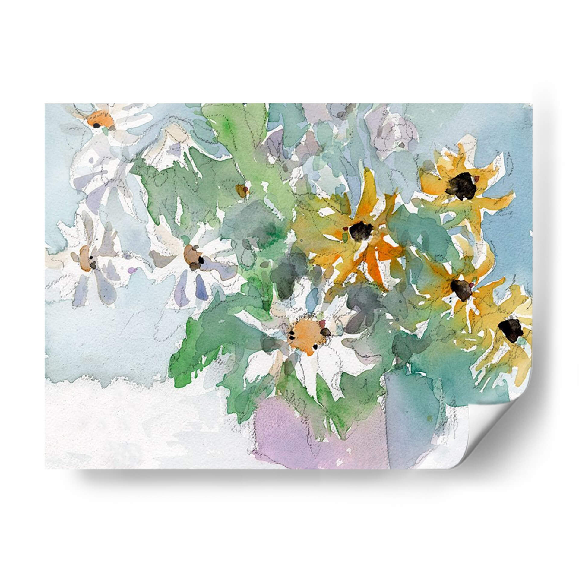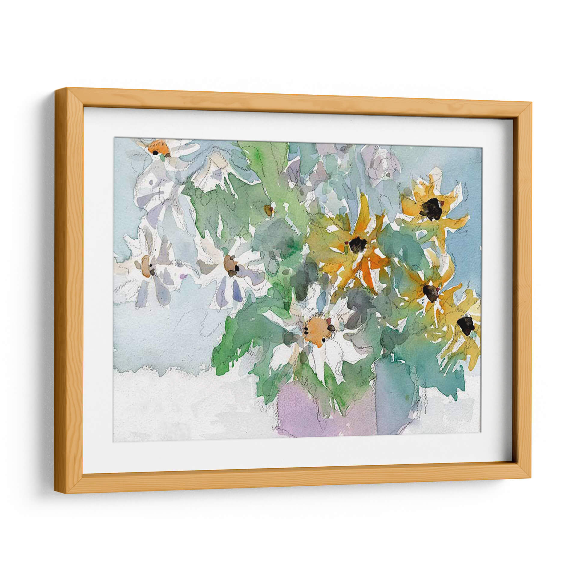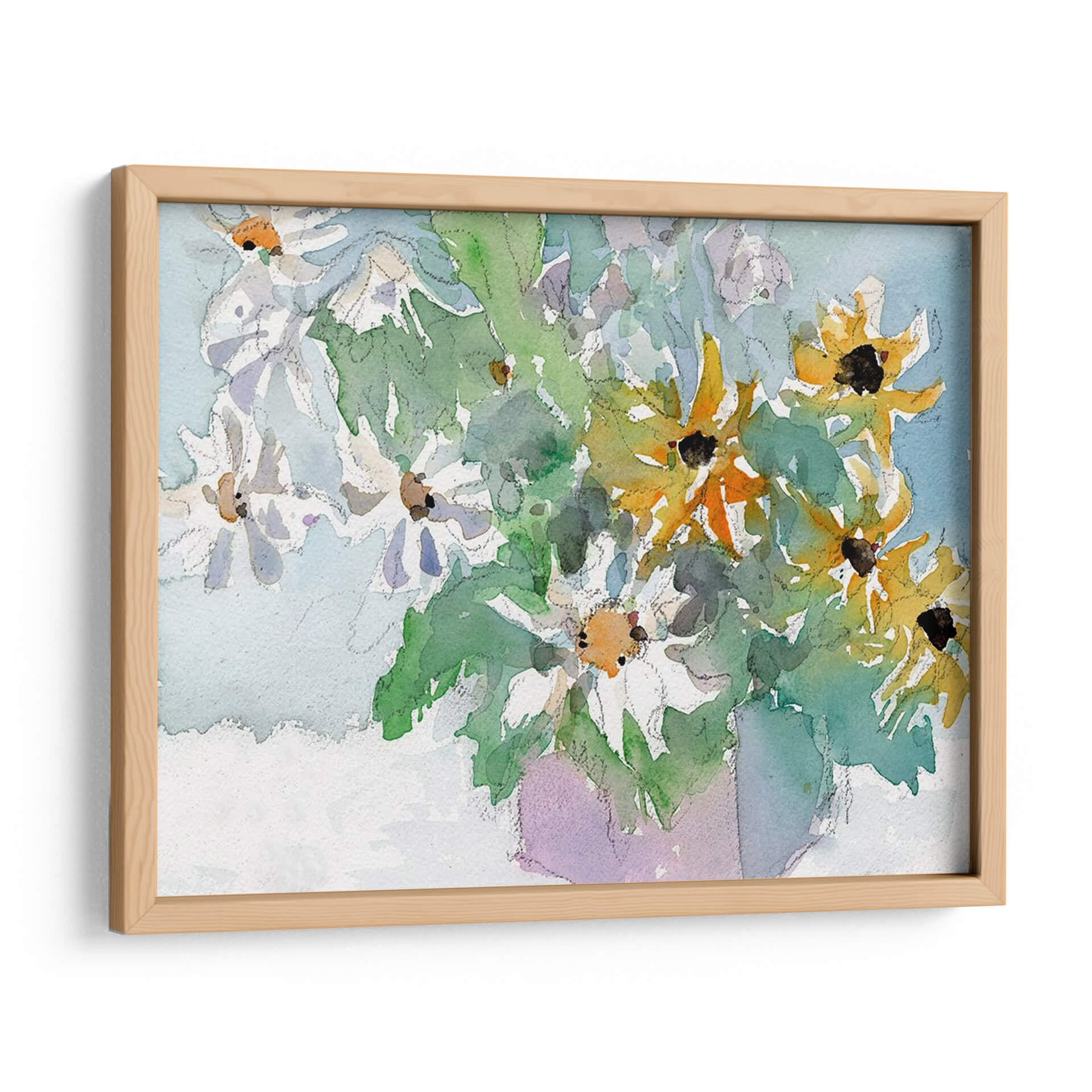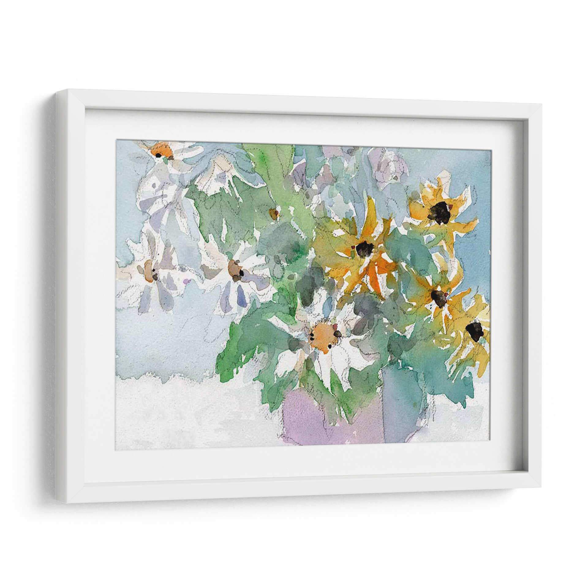 Sumérgete en la frescura y la vitalidad de "Margaritas y Susansos de Ojos Negros I", una obra de arte que captura la belleza efímera de la naturaleza con una delicadeza excepcional. Samuel Dixon nos presenta un bodegón contemporáneo donde las flores, tanto blancas como amarillas con sus característicos centros oscuros, parecen danzar en un lienzo bañado por una luz suave y etérea. La técnica de acuarela empleada aporta una cualidad translúcida y fluida, permitiendo que los colores se mezclen y superpongan de manera orgánica, creando una sensación de movimiento y vida. Los verdes vibrantes de las hojas contrastan armoniosamente con los tonos pastel del fondo azulado y el toque lavanda del jarrón implícito, generando una atmósfera serena y alegre. Este cuadro decorativo es perfecto para añadir un toque de color y optimismo a cualquier estancia, desde un salón moderno hasta un espacio de trabajo que necesite un respiro visual. Su estilo evocador y su composición equilibrada lo convierten en una pieza versátil, capaz de complementar una decoración minimalista o realzar un ambiente más rústico. "Margaritas y Susansos de Ojos Negros I" no es solo una imagen, es una invitación a la contemplación y al disfrute de la belleza simple y radiante de las flores.