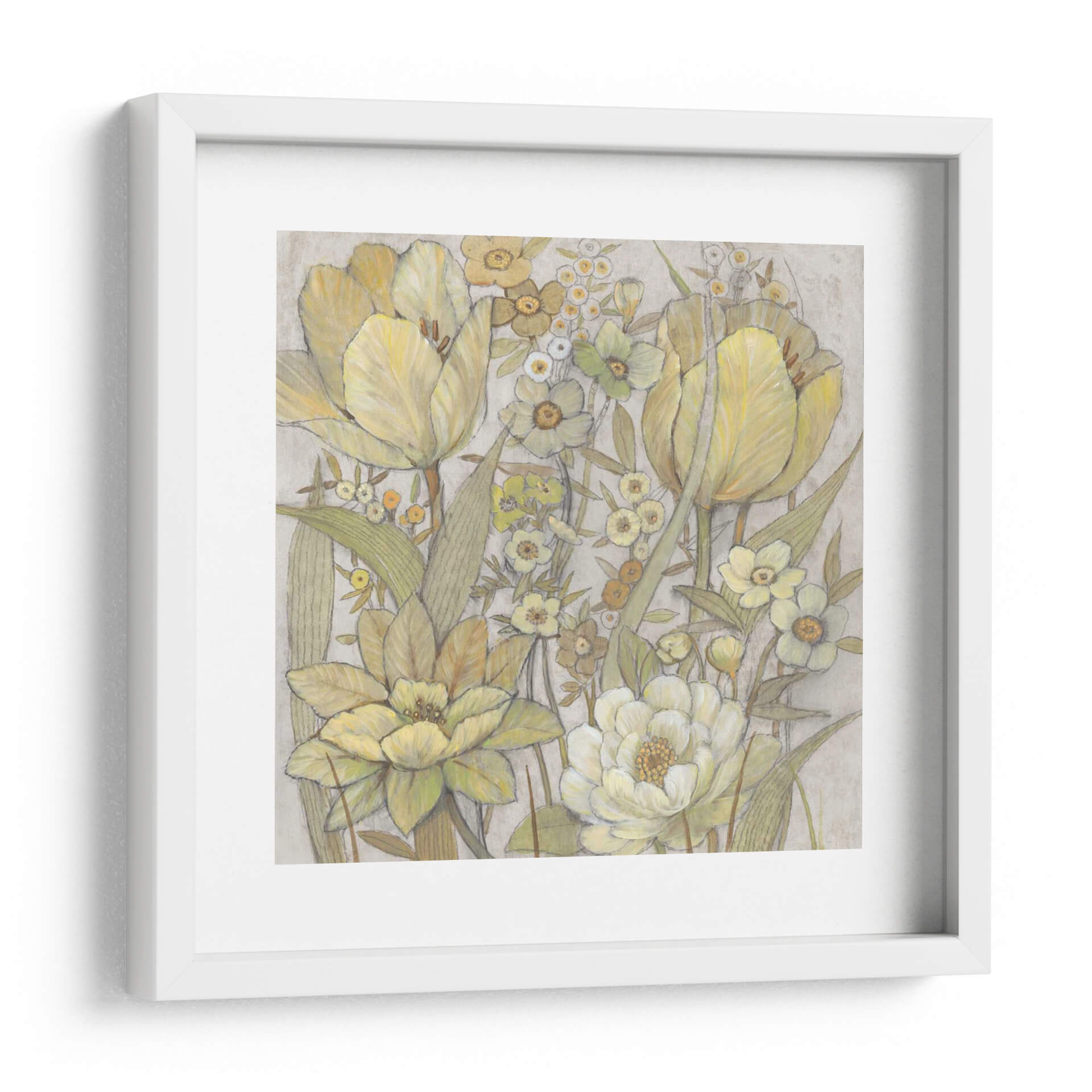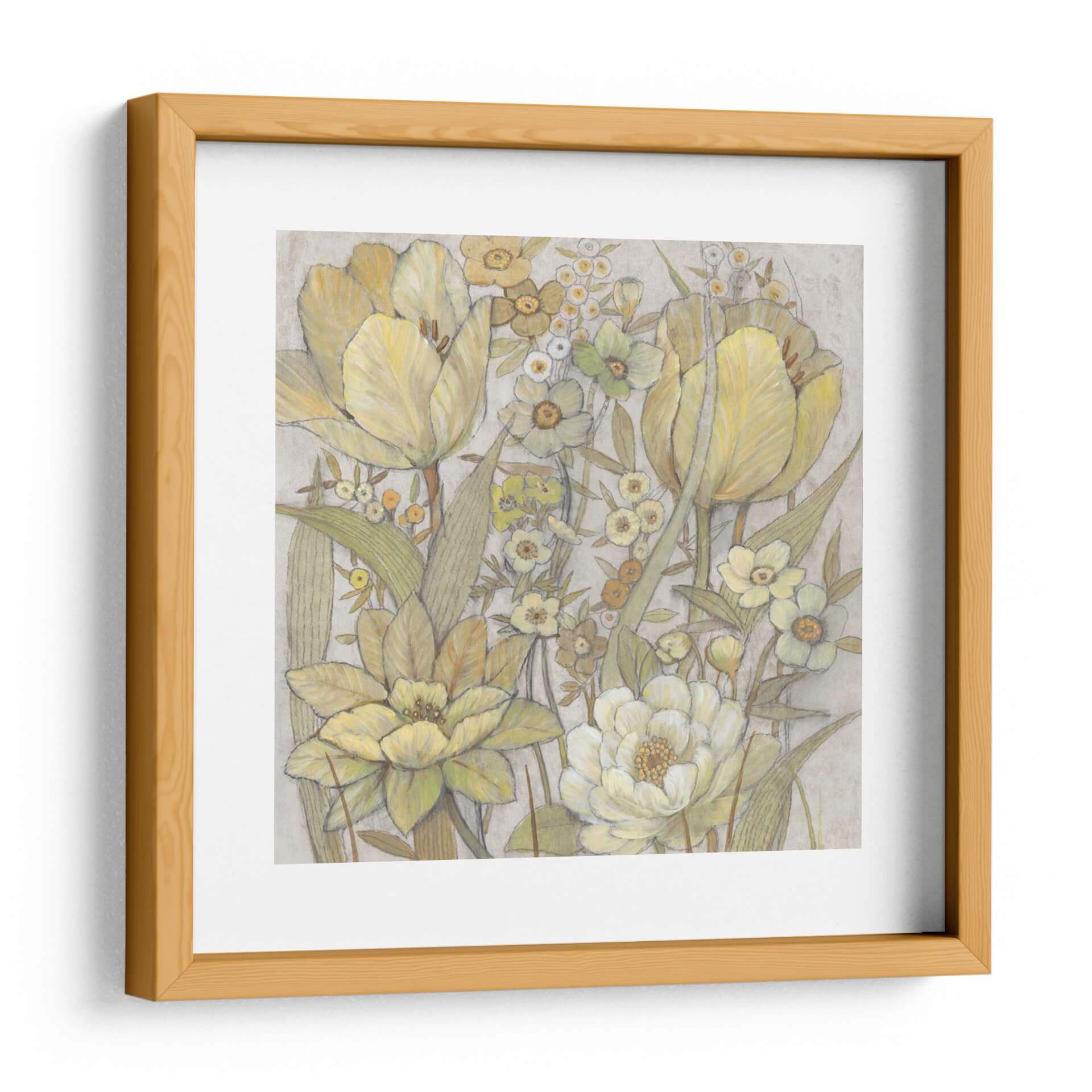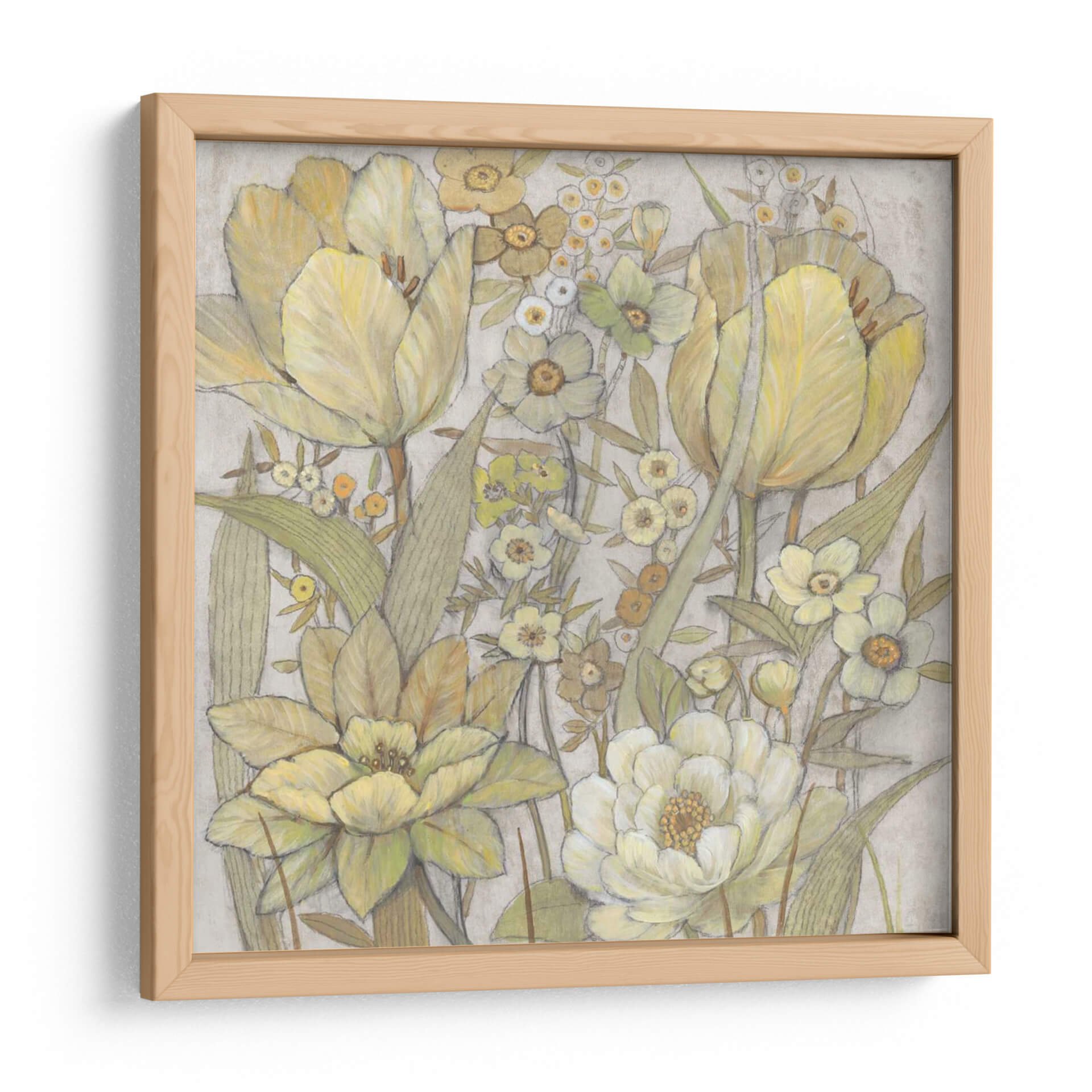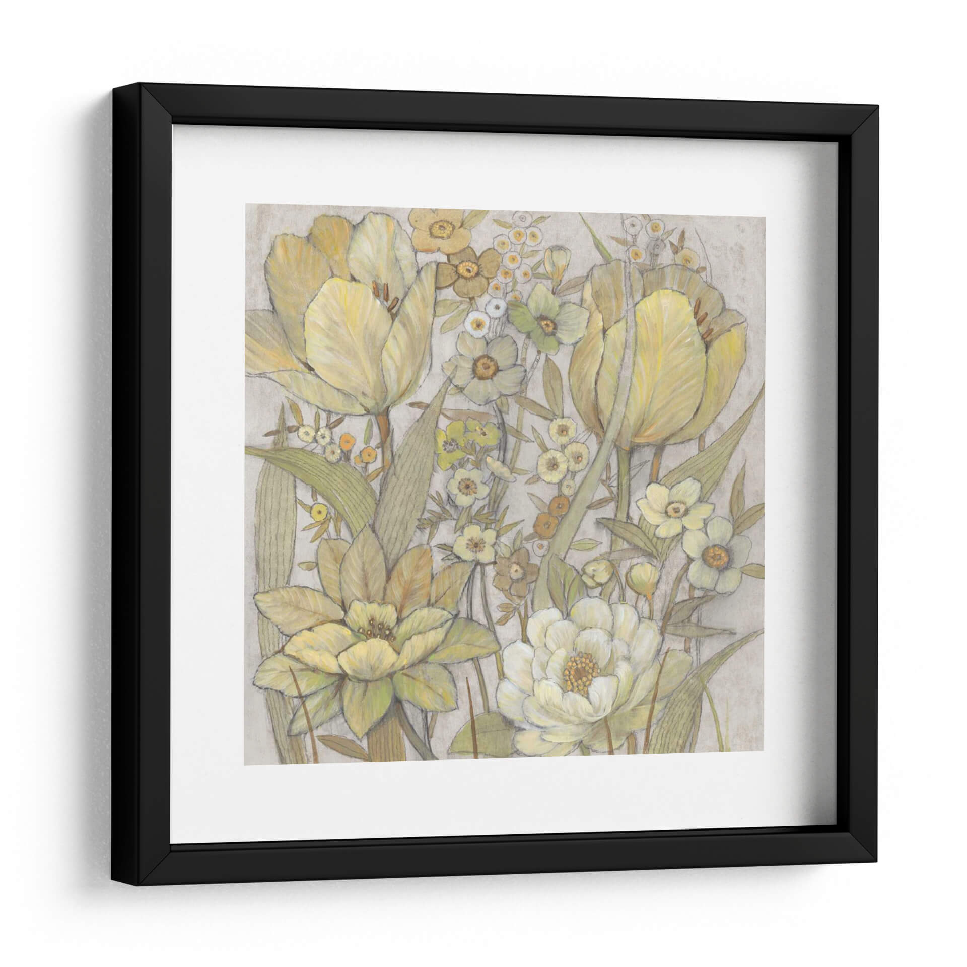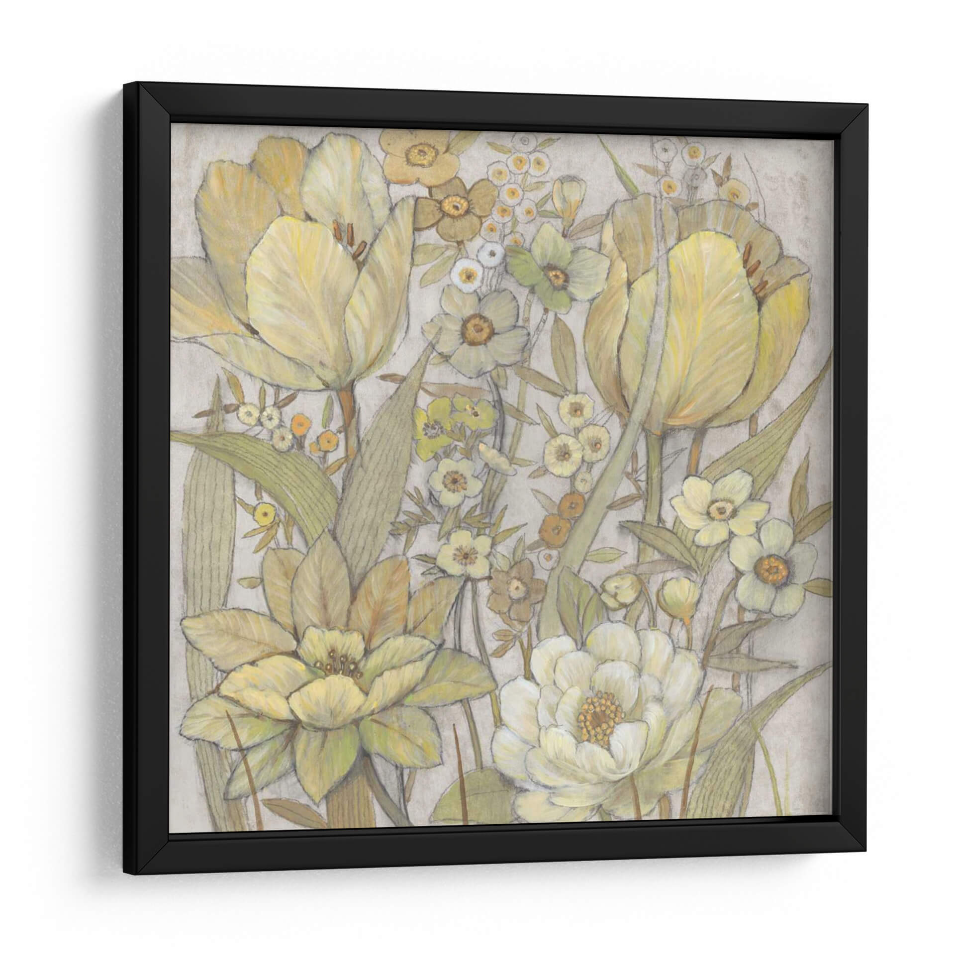Sumérgete en la delicadeza y el encanto del cuadro decorativo "Mezclar Floral I" de Tim O'Toole. Esta obra de arte floral captura la esencia de un jardín en plena floración con una paleta de colores suaves y etéreos. Los tonos crema, amarillos pálidos y verdes apagados se entrelazan para crear una atmósfera de serenidad y calma, perfecta para cualquier espacio que busque un toque de naturaleza y sofisticación. Las pinceladas, que recuerdan a técnicas de pastel o acuarela, otorgan una textura sutil y un aire de ensueño a la composición. Predominan las flores de estilo tulipa y otras variedades de pétalos delicados, dispuestas en un arreglo que parece espontáneo pero equilibrado. La obra es ideal para quienes aprecian el arte botánico con un giro contemporáneo, aportando luz y una sensación de frescura a salones, dormitorios o incluso oficinas. "Mezclar Floral I" es más que una simple decoración de pared; es una invitación a la contemplación y a la apreciación de la belleza efímera de las flores, diseñada para añadir un toque de elegancia atemporal a tu hogar u oficina.