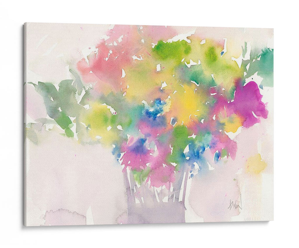Sumérgete en la delicadeza y el color de 'Momento Floral I', una cautivadora obra de arte de Samuel Dixon que captura la efímera belleza de las flores con una técnica impresionista de acuarela. Los vibrantes estallidos de rosa, amarillo, azul y verde se mezclan en un tapiz floral etéreo, evocando una sensación de alegría y frescura. La composición, centrada en un exuberante ramo, se desvanece suavemente hacia un fondo luminoso, creando una atmósfera de ligereza y serenidad. Las pinceladas fluidas y translúcidas típicas de la acuarela transmiten una sensación de movimiento y vida, como si las flores estuvieran meciéndose en una brisa suave. Este cuadro decorativo es una elección perfecta para quienes buscan añadir un toque de optimismo y color a su hogar u oficina. Ideal para salas de estar, dormitorios o cualquier espacio que necesite un respiro visual y una inyección de vitalidad primaveral. 'Momento Floral I' no es solo una imagen, es una invitación a celebrar la belleza de la naturaleza y la fugacidad de los momentos perfectos, transformando cualquier pared en un jardín de emociones.