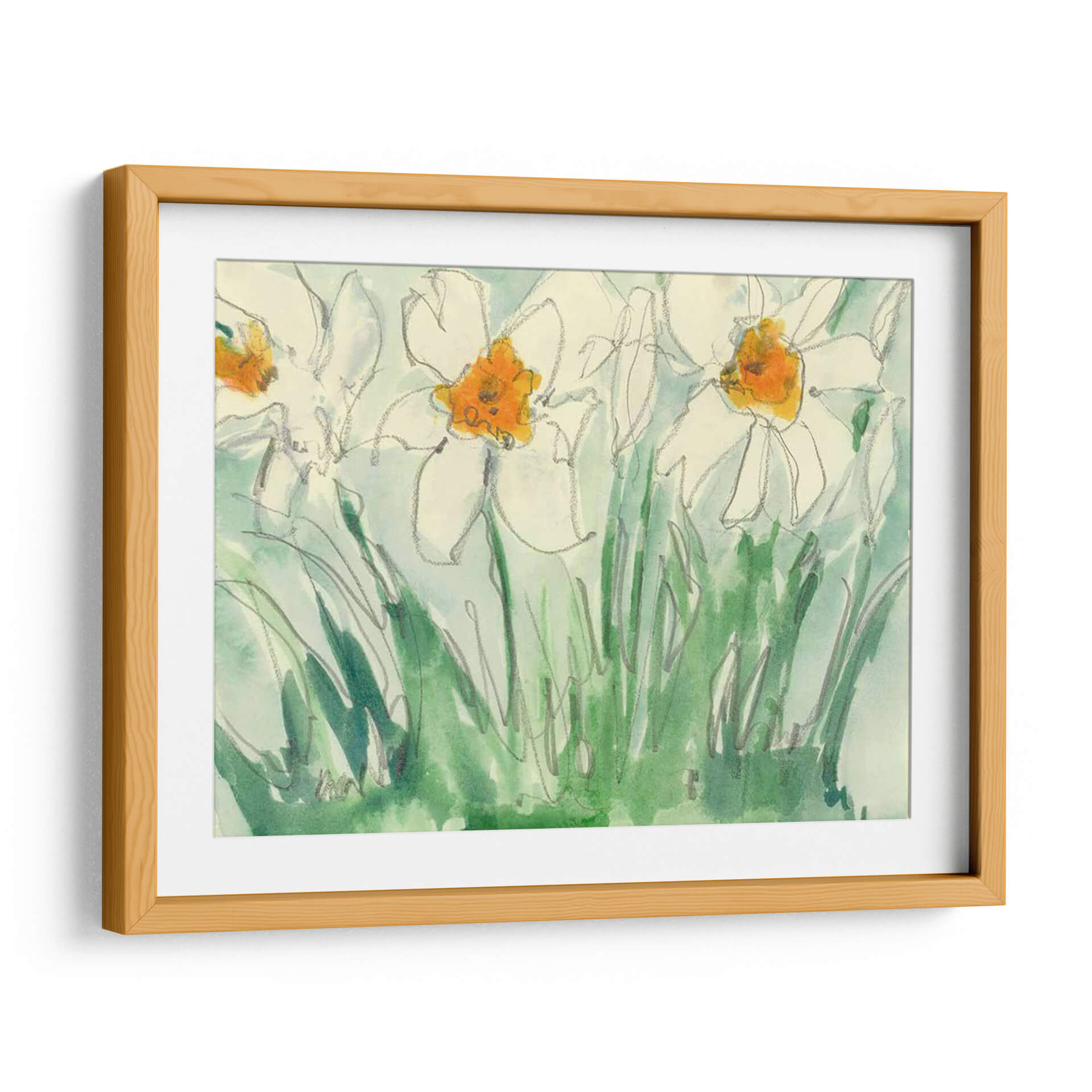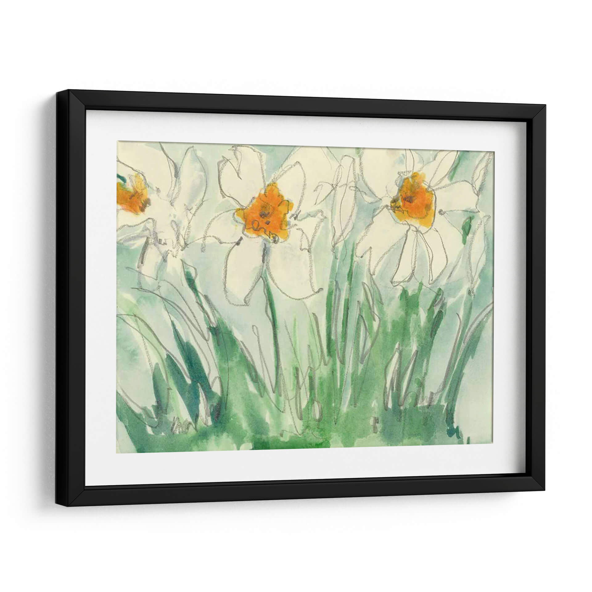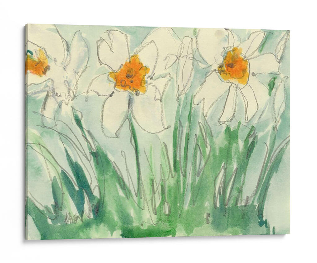Sumérgete en la delicadeza de la naturaleza con el cuadro decorativo 'Narcisos Naranja Y Blanco I' de Samuel Dixon. Esta obra captura la esencia de los narcisos en flor con trazos sueltos y etéreos que evocan una sensación de frescura y vitalidad. La paleta de colores, dominada por blancos puros, vibrantes toques de naranja en el centro de las flores y un suave fondo aguamarina, crea una atmósfera serena y luminosa. Las pinceladas expresivas y el contorno a lápiz aportan una textura visual y un carácter contemporáneo a la pieza. Este cuadro decorativo es ideal para añadir un toque de color y optimismo a cualquier espacio, desde una sala de estar moderna hasta un dormitorio tranquilo o una oficina que necesite un respiro visual. La composición centra la atención en la belleza intrínseca de las flores, invitando a la contemplación y al disfrute de los pequeños detalles de la vida. 'Narcisos Naranja Y Blanco I' no es solo una decoración, sino una ventana a la alegría de la primavera y la elegancia floral, diseñada para inspirar y embellecer tu entorno con arte contemporáneo. Su estilo se adapta perfectamente a decoraciones minimalistas, escandinavas o de inspiración natural, aportando una calidez sutil pero impactante.
