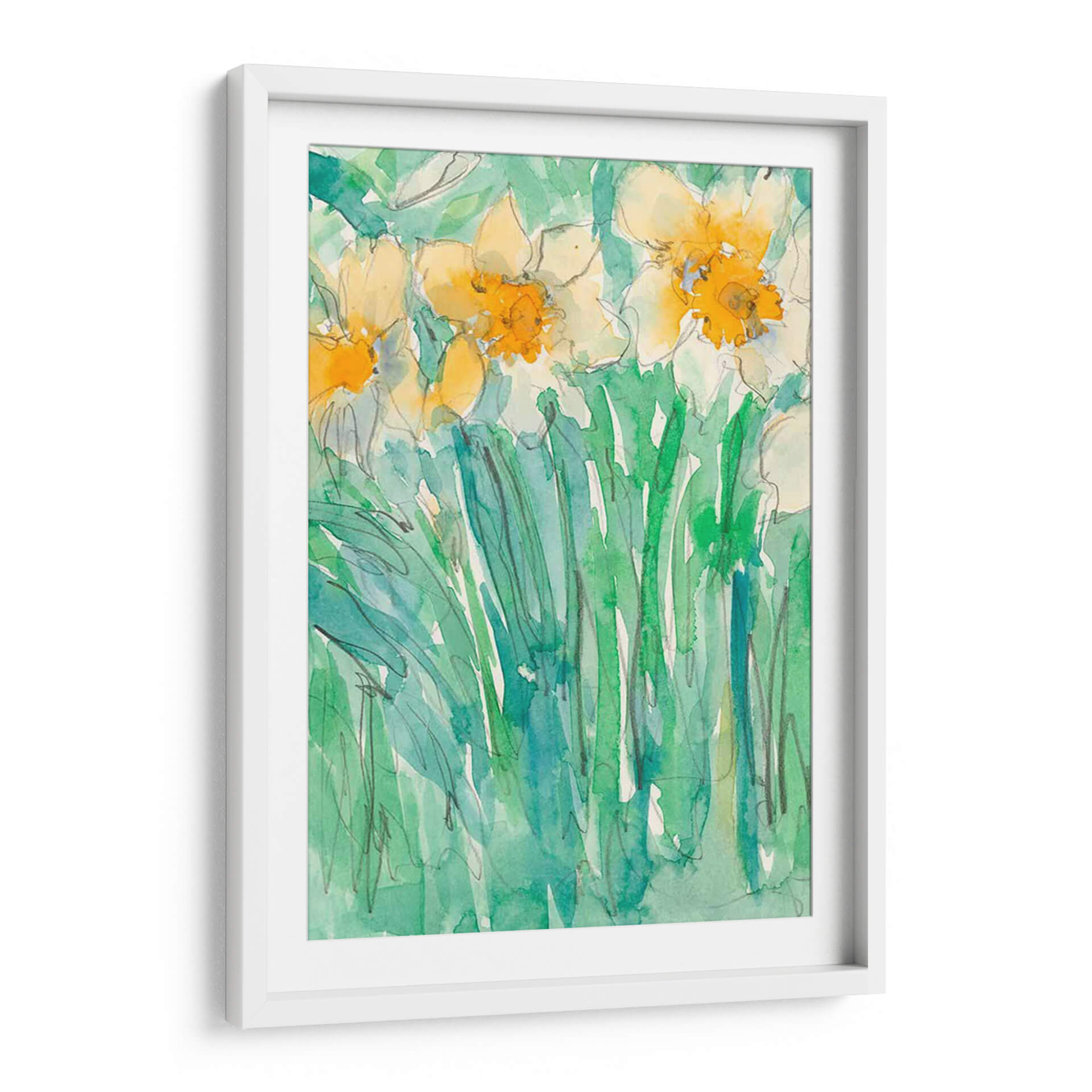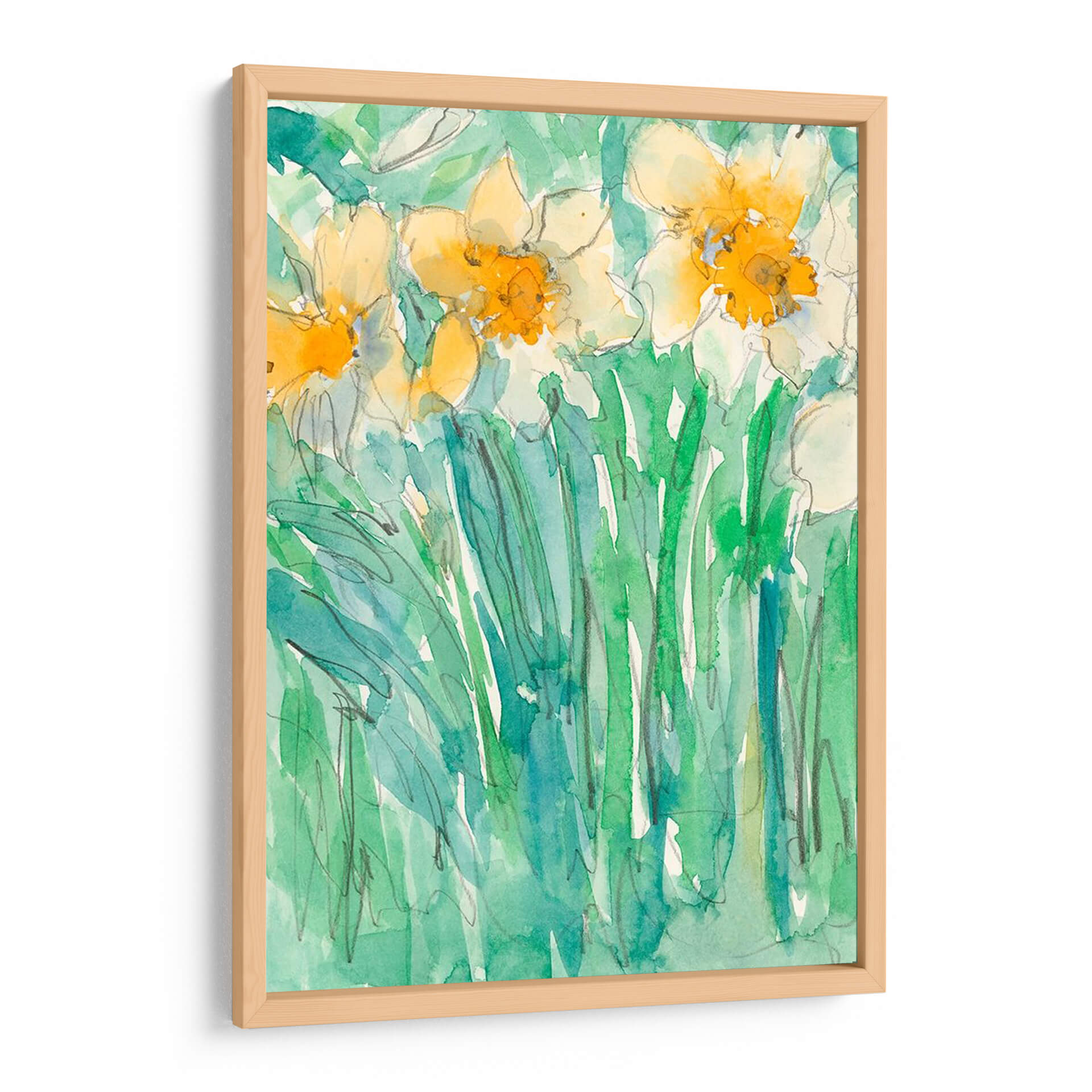 Sumérgete en la frescura de la primavera con 'Narcisos Tallos I', una obra de arte que captura la esencia vibrante de estas icónicas flores. El artista Samuel Dixon utiliza una técnica de acuarela suelta y etérea para dar vida a los narcisos, destacando sus pétalos amarillos y naranjas radiantes contra un fondo de follaje verde exuberante. Las pinceladas fluidas y los trazos de contorno audaces otorgan a la pieza una sensación de movimiento y espontaneidad, evocando la brisa suave que mece los tallos en un jardín soleado. La paleta de colores, dominada por verdes acuáticos y amarillos cálidos, irradia optimismo y serenidad, creando una atmósfera de calma y renovación. Este cuadro decorativo es perfecto para añadir un toque de naturaleza y alegría a cualquier espacio, ya sea una sala de estar luminosa, un dormitorio acogedor o una oficina que necesite un soplo de aire fresco. La composición vertical y el estilo impresionista contemporáneo hacen de 'Narcisos Tallos I' una pieza versátil, capaz de complementar una amplia gama de estilos decorativos, desde el moderno hasta el bohemio. Transforma tu hogar en un oasis de tranquilidad y belleza con esta encantadora representación floral.