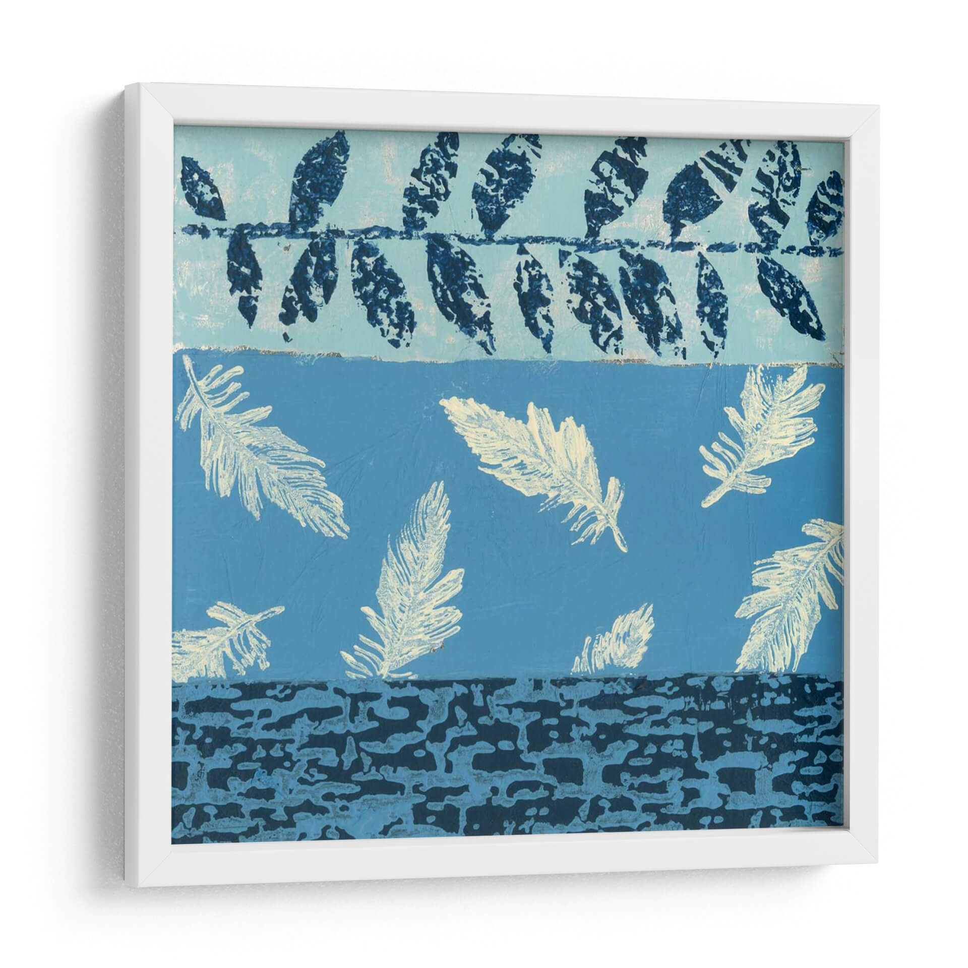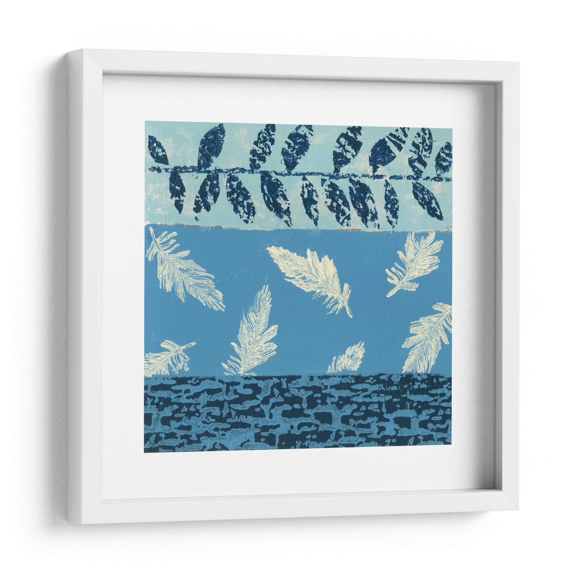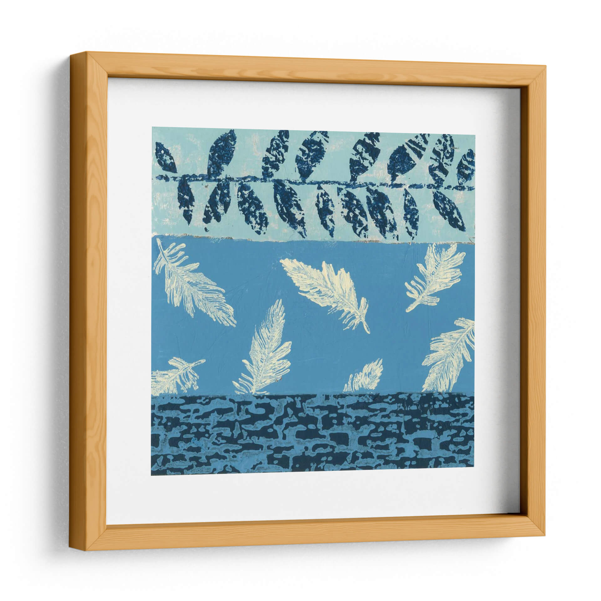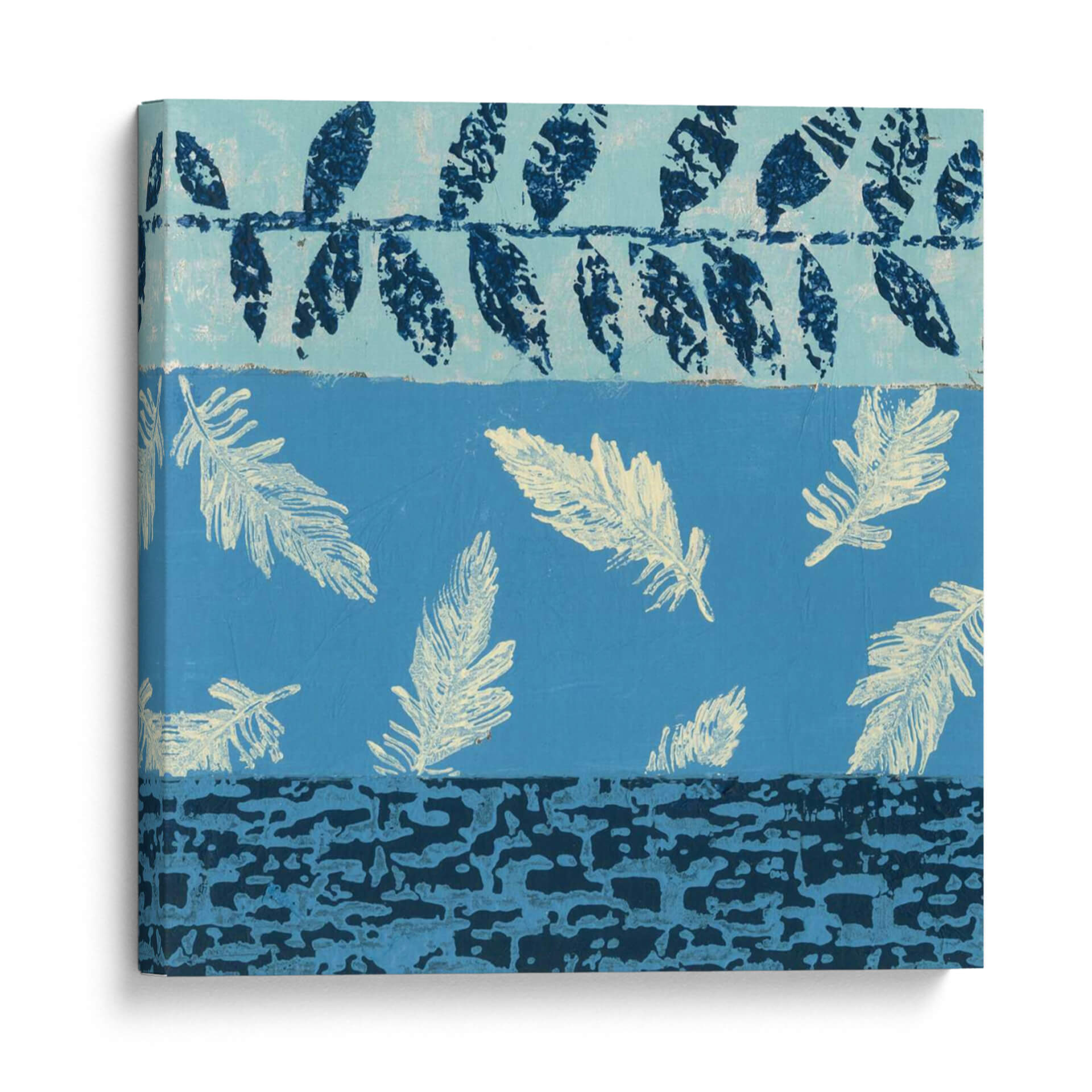Sumérgete en la serenidad de "Natures Montage Vii", una obra de arte contemporáneo que captura la delicadeza de la naturaleza en una composición abstracta y cautivadora. La pieza se despliega en una paleta de azules serenos, desde el celeste pálido hasta el índigo profundo, creando una atmósfera de calma y reflexión. Las franjas de color se entrelazan con motivos orgánicos: la fila superior presenta hojas estilizadas en un azul oscuro, evocando un patrón de estampado tradicional, mientras que la franja central se adorna con plumas delicadas en un tono marfil, que parecen flotar en un cielo azul vibrante. La base de la obra se cierra con un patrón texturizado que recuerda a la piedra o la madera, aportando profundidad y contraste. Este cuadro decorativo, con su estilo único que combina elementos naturales y abstracción, es perfecto para añadir un toque de elegancia natural a cualquier espacio. Ideal para salones, dormitorios o estudios, "Natures Montage Vii" invita a la contemplación y aporta una sensación de paz y armonía, convirtiéndose en un punto focal sofisticado y lleno de vida para tu decoración.