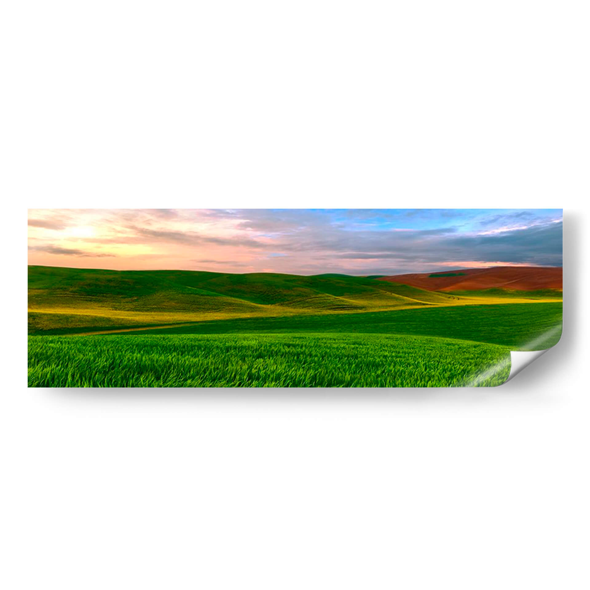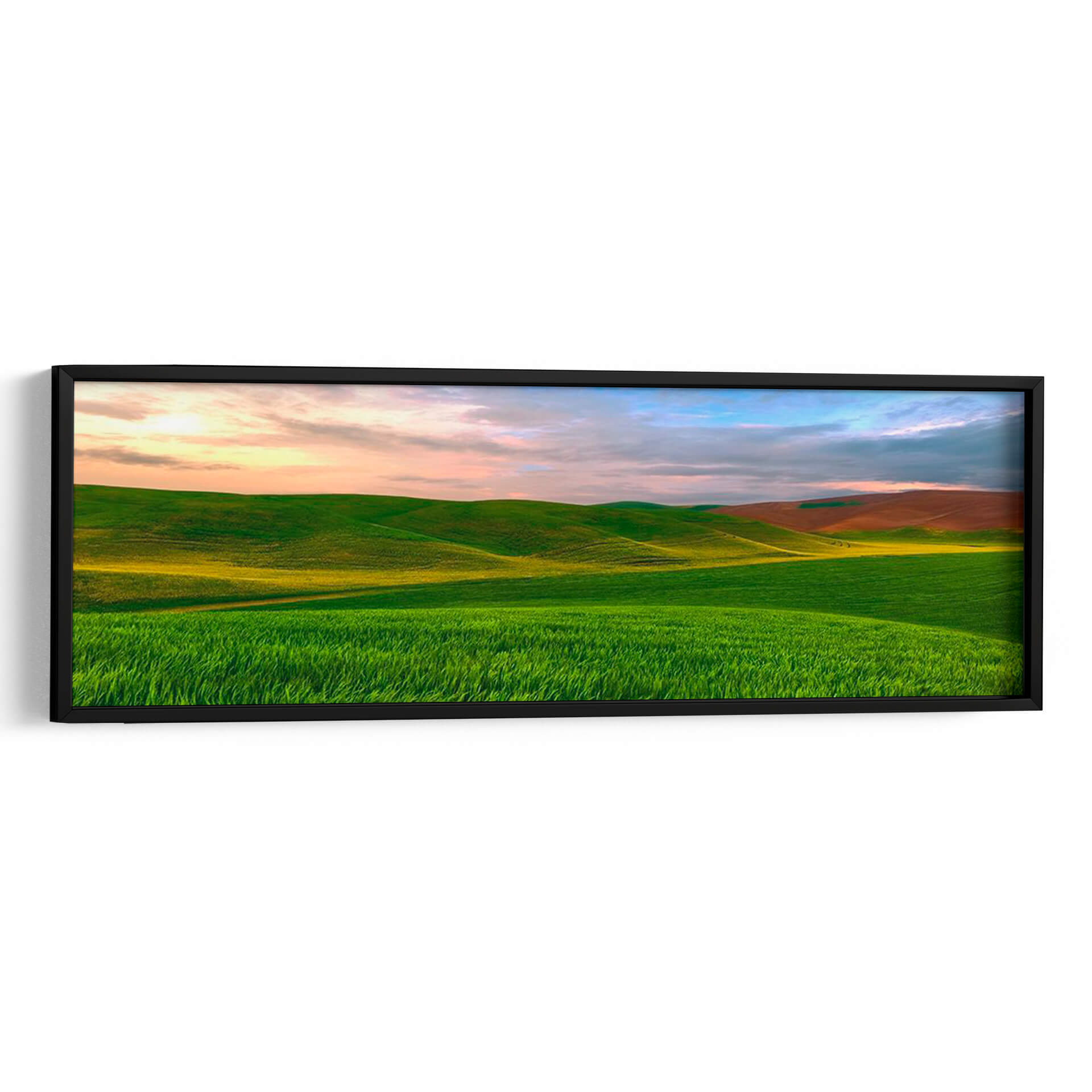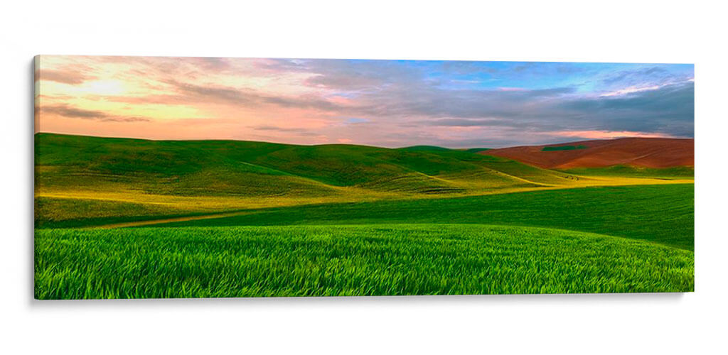 Sumérgete en la serenidad de "Panorama De Panorama Vi", una obra maestra de James McLoughlin que captura la esencia de un vasto paisaje rural al atardecer. Este cuadro decorativo te transporta a un lugar de calma y belleza natural, con ondulantes colinas cubiertas por un vibrante césped verde que se funde con tonos dorados y ocres en la distancia. El cielo, teñido de suaves naranjas y rosas al ocaso, contrasta con las sombras alargadas que dan profundidad y volumen a la escena, creando una atmósfera evocadora y pacífica. La composición panorámica de la obra invita a la contemplación, permitiendo que la mirada se pierda en la inmensidad del horizonte. Perfecta para añadir un toque de naturaleza y tranquilidad a tu salón, dormitorio u oficina, "Panorama De Panorama Vi" es una invitación a la relajación y al disfrute de la belleza escénica. Su estilo paisajístico contemporáneo, con toques de realismo y una paleta de colores cálidos y fríos armoniosamente equilibrados, lo convierte en una pieza versátil que complementará diversos estilos decorativos, desde el moderno hasta el rústico.