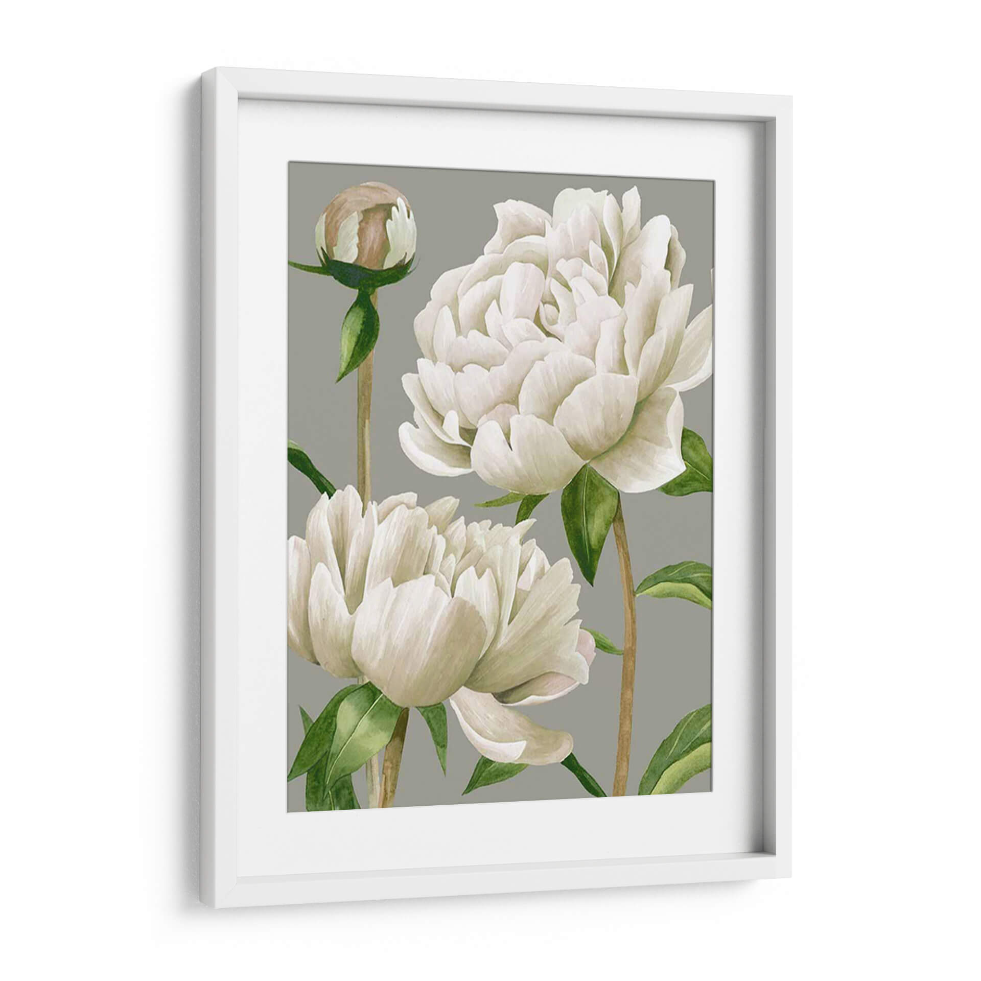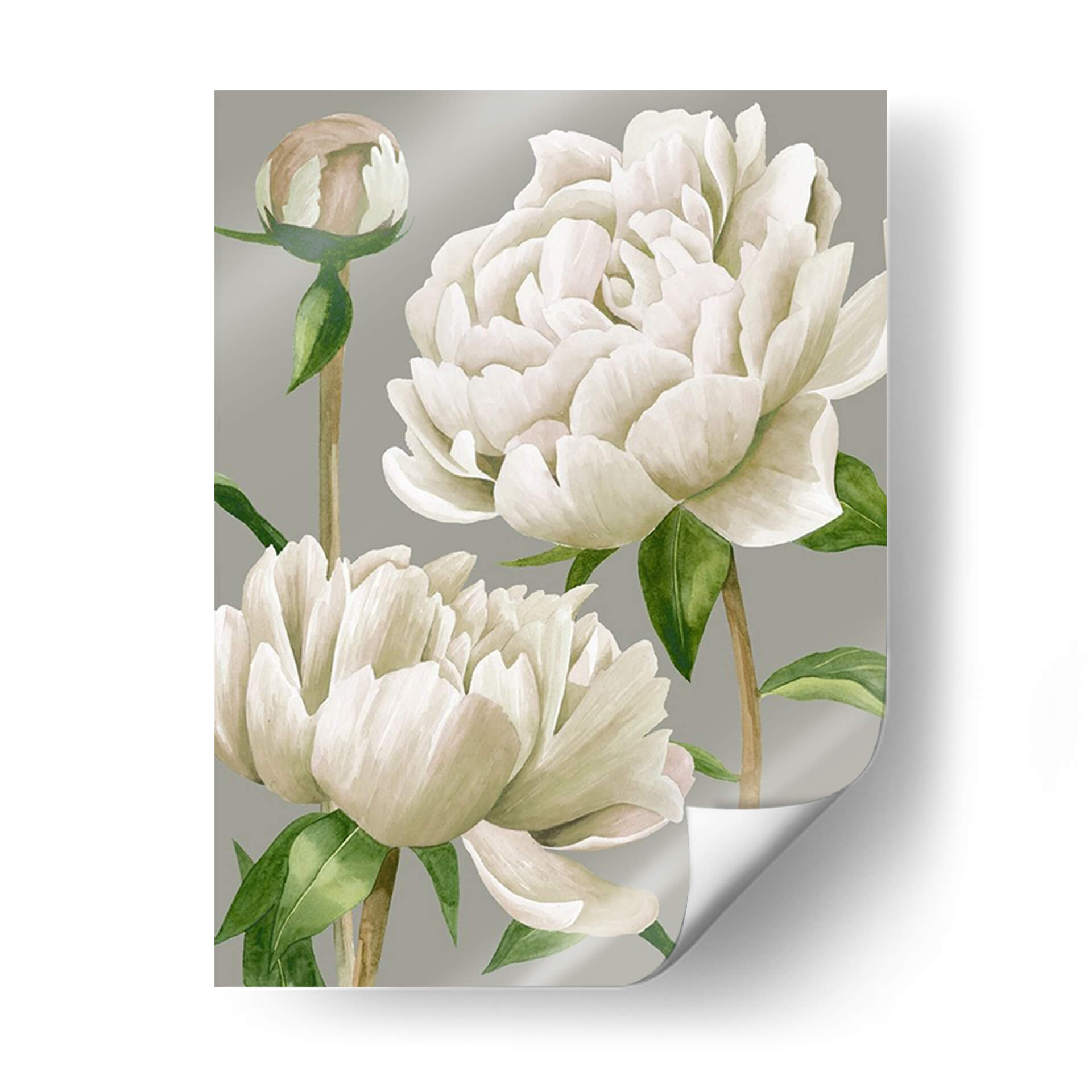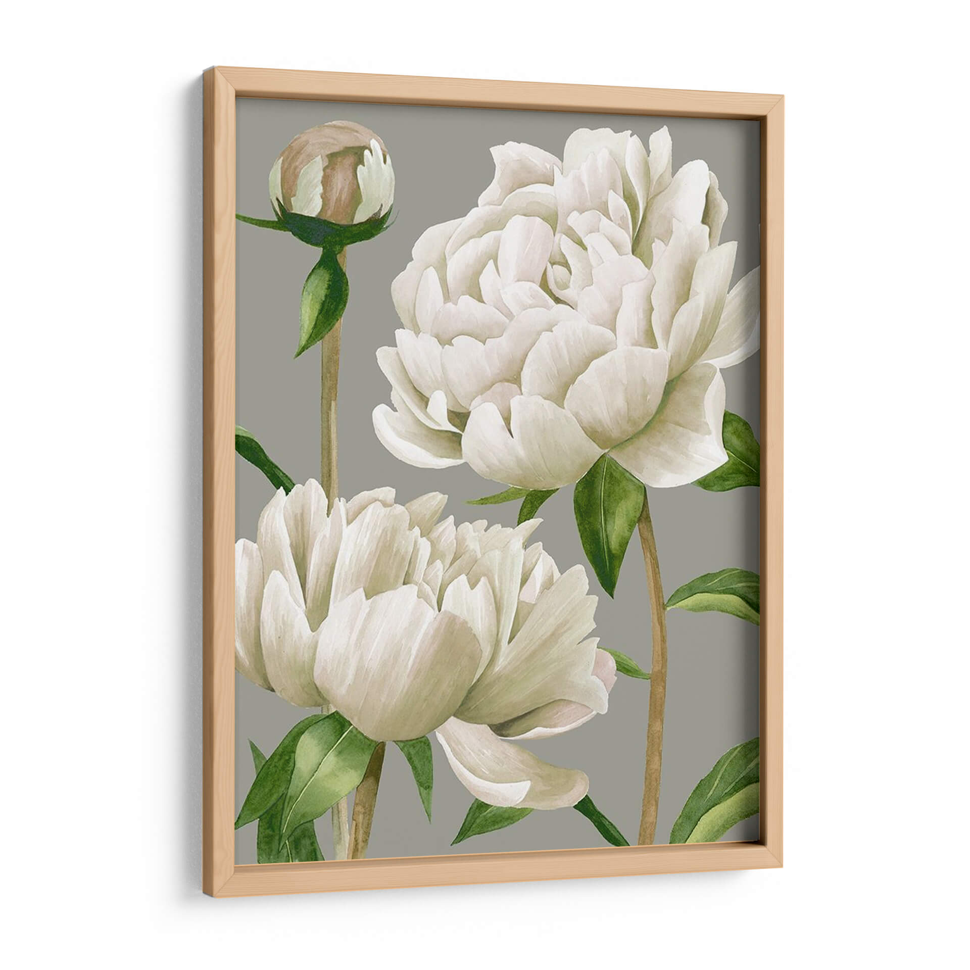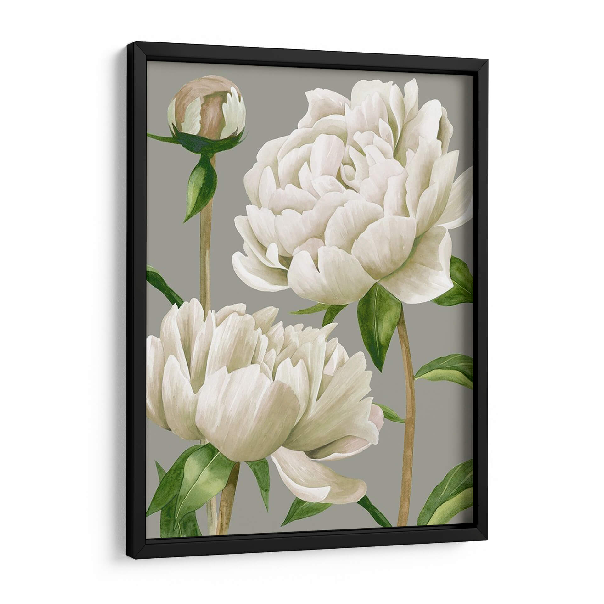 Embellece tu espacio con la serena belleza de "Peonías Blancas I", una obra de arte que captura la delicadeza de la naturaleza en su máxima expresión. Este cuadro decorativo presenta dos exuberantes peonías blancas en plena floración, acompañadas por un capullo a punto de abrirse, todo ello sobre un suave fondo gris piedra. La artista Grace Popp ha logrado una composición que irradia calma y elegancia, utilizando una paleta de colores sutiles donde predominan los blancos cremosos, los verdes vibrantes de las hojas y los tallos, y el contraste suave del gris. La técnica de acuarela o similar utilizada, imita la delicadeza y la transparencia de los pétalos, creando una sensación de ligereza y frescura. La obra es perfecta para añadir un toque de sofisticación y tranquilidad a cualquier ambiente, ya sea un dormitorio, una sala de estar, un recibidor o incluso una oficina. Su estilo botánico contemporáneo la hace versátil, integrándose armoniosamente en decoraciones modernas, clásicas o escandinavas. "Peonías Blancas I" no es solo un cuadro, es una invitación a la contemplación y a la apreciación de la belleza efímera de las flores, aportando un aire de refinamiento y serenidad a tu hogar. Descubre cómo este lienzo puede transformar tu pared en un oasis de paz y estilo.