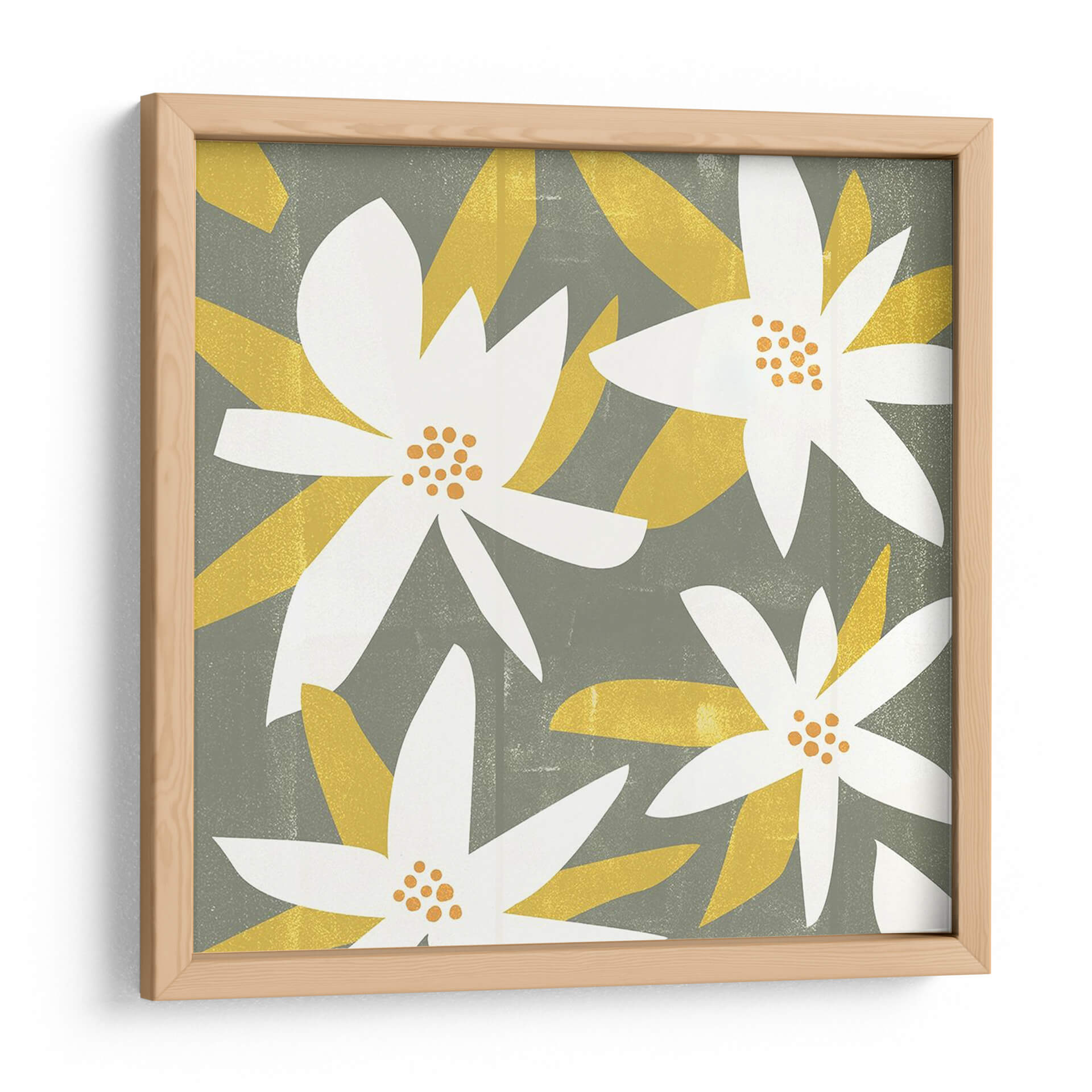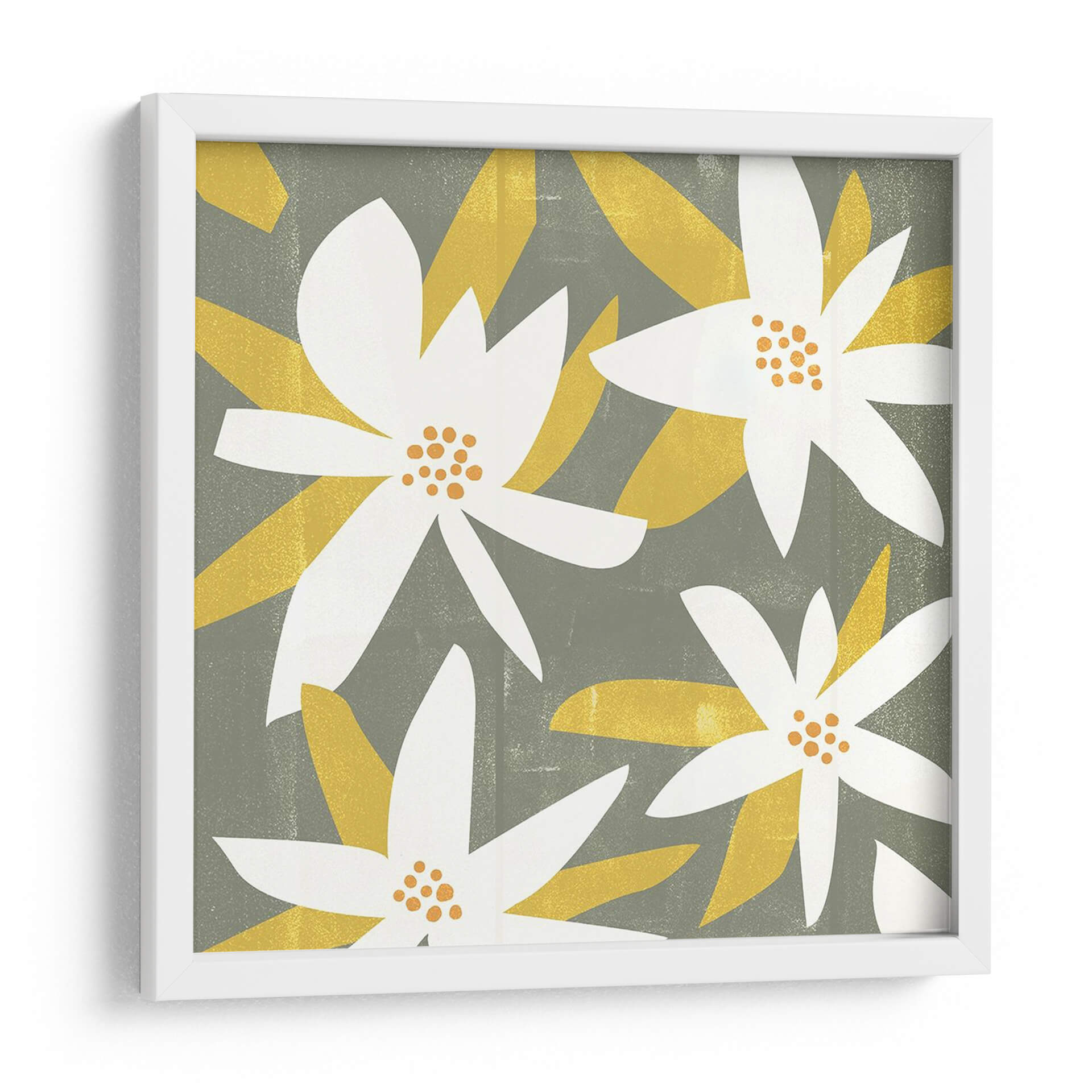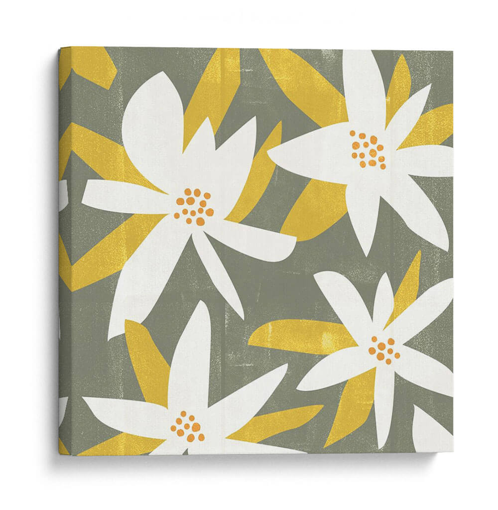 Sumérgete en la serenidad botánica con "Pétalos Blancos I", una cautivadora obra de arte de Melissa Wang. Este cuadro decorativo presenta una composición estilizada de flores blancas y ocres sobre un fondo texturizado en tono gris verdoso. Las formas orgánicas y limpias de los pétalos, junto con los vibrantes centros anaranjados, crean un contraste visual armonioso que invita a la calma y la contemplación. El estilo gráfico y contemporáneo de la obra la convierte en una pieza versátil, ideal para añadir un toque de naturaleza y sofisticación a cualquier espacio. Imagina este cuadro aportando una atmósfera de tranquilidad a tu dormitorio, un toque de frescura a tu sala de estar o un acento de color sutil en tu oficina. La paleta de colores, que combina el sereno gris verdoso con el blanco puro y toques de amarillo ocre, evoca una sensación de paz y equilibrio. "Pétalos Blancos I" es más que una simple decoración; es una ventana a un jardín de serenidad moderna, perfecta para quienes buscan embellecer su entorno con arte que inspira y eleva el espíritu.
