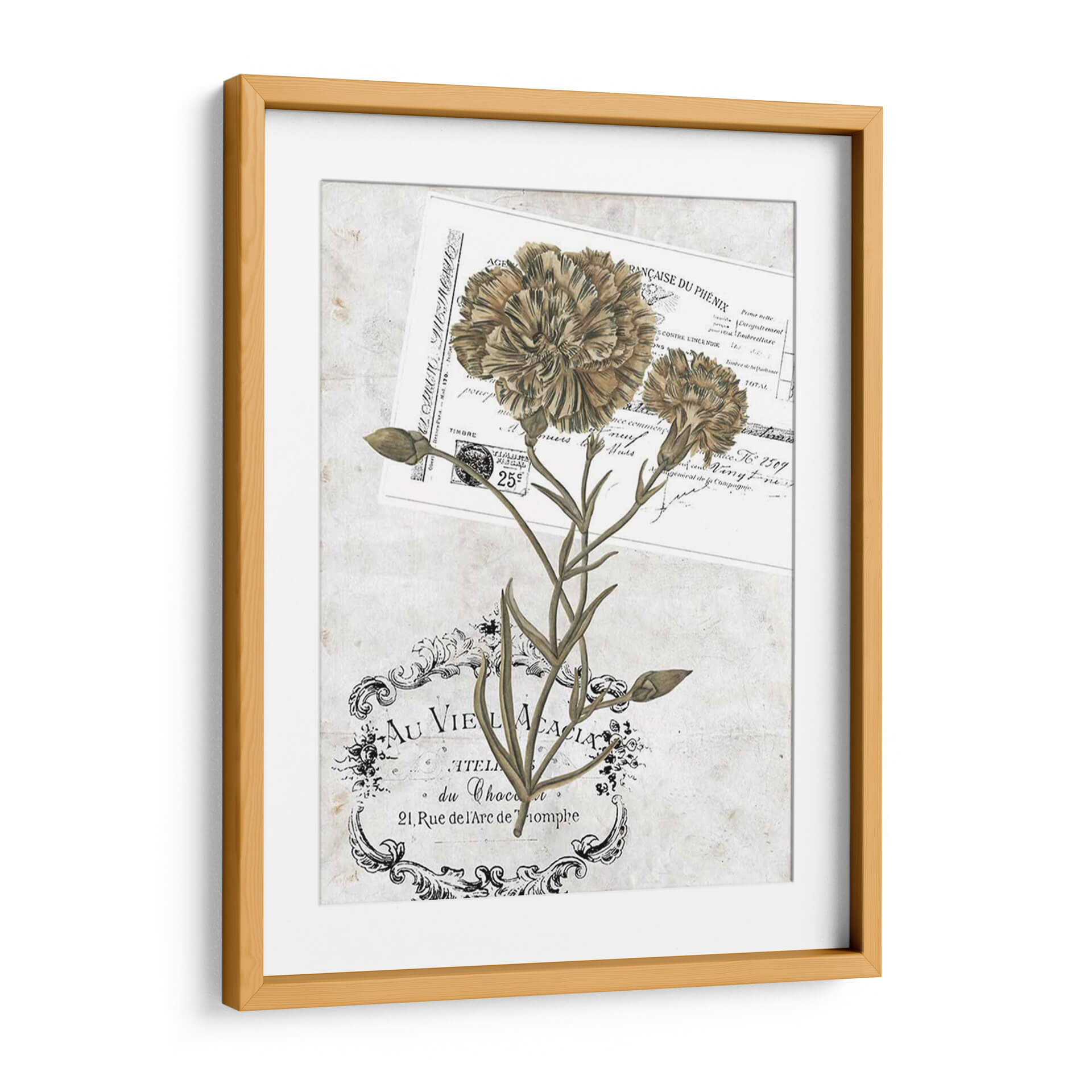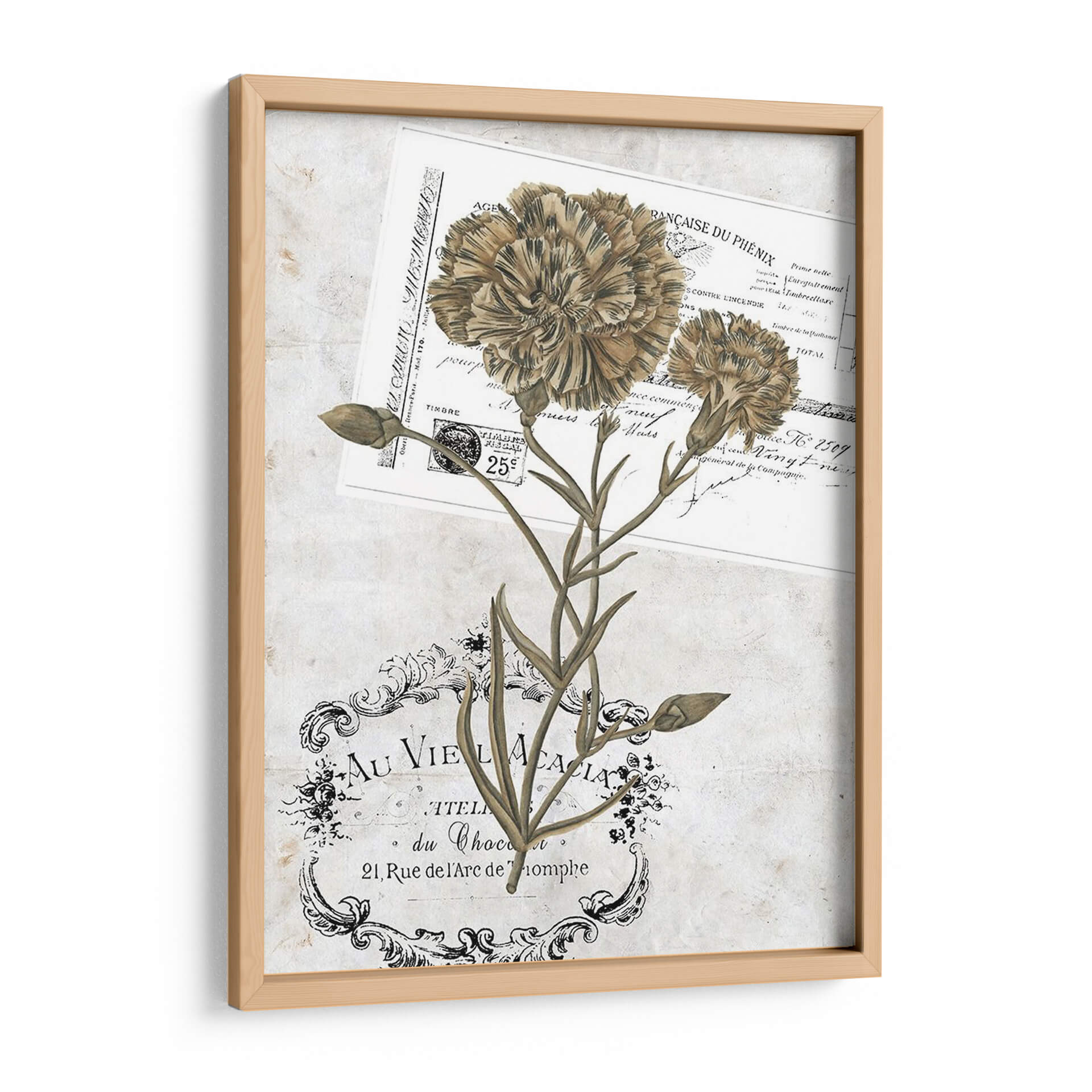 Descubre la delicadeza y el encanto nostálgico de "Petite Beaute Ii", una obra de arte que evoca la elegancia atemporal. Esta pieza captura la esencia de dos claveles en tonos sepia y tierra, presentados sobre un fondo que simula papel antiguo con inscripciones en francés y un sello postal vintage. La composición, sutilmente entrelazada con un ornamento floral en la parte inferior, crea una sensación de profundidad y un estilo que fusiona lo botánico con lo gráfico. Los colores suaves y terrosos aportan una atmósfera de calma y sofisticación, ideal para espacios que buscan un toque de serenidad y distinción. Es una elección perfecta para añadir un aire de romanticismo clásico y refinamiento a tu sala de estar, dormitorio o estudio. "Petite Beaute Ii" no es solo una decoración, sino una ventana a un mundo de belleza sutil y un homenaje a la naturaleza y la historia, transformando cualquier ambiente en una galería personal llena de carácter y estilo.