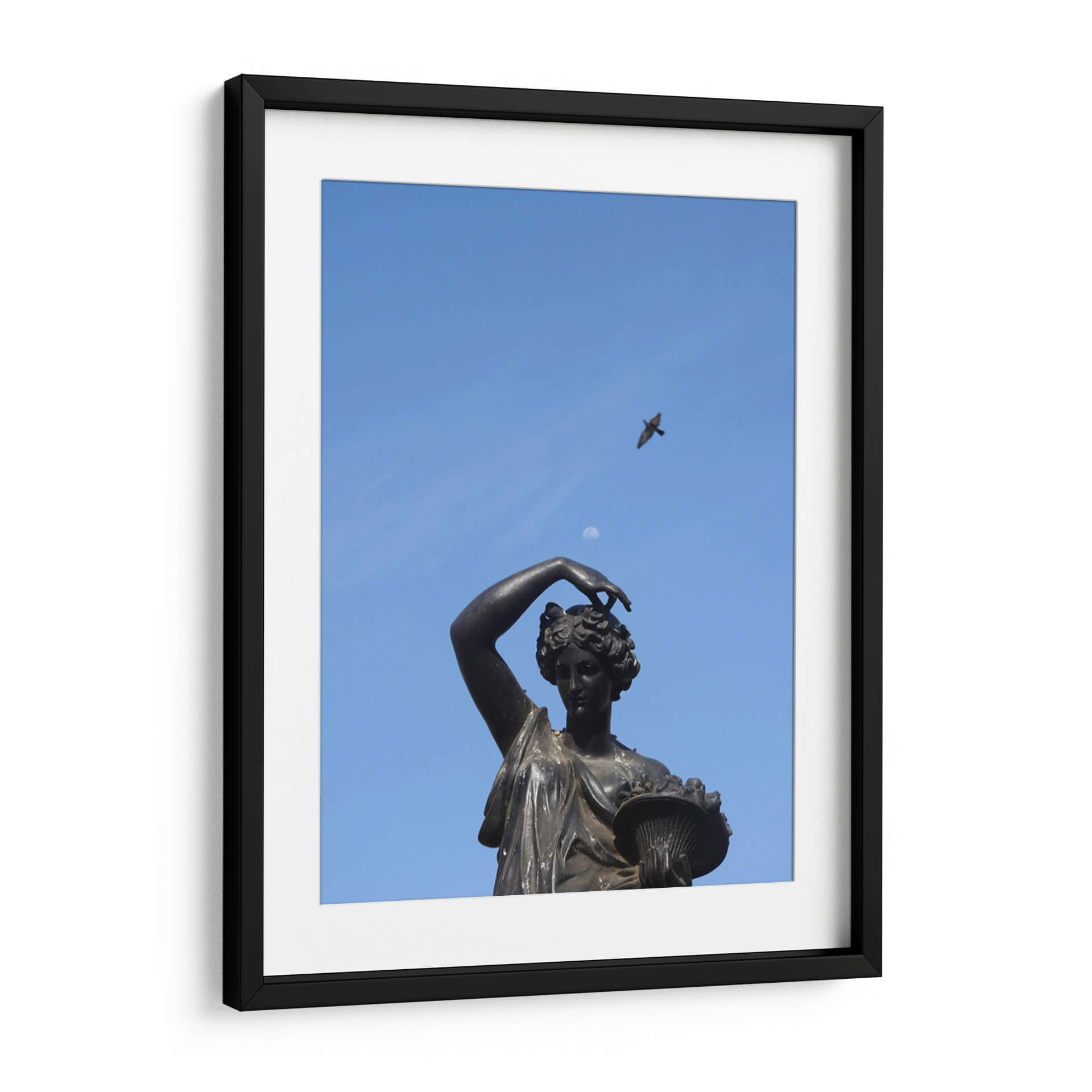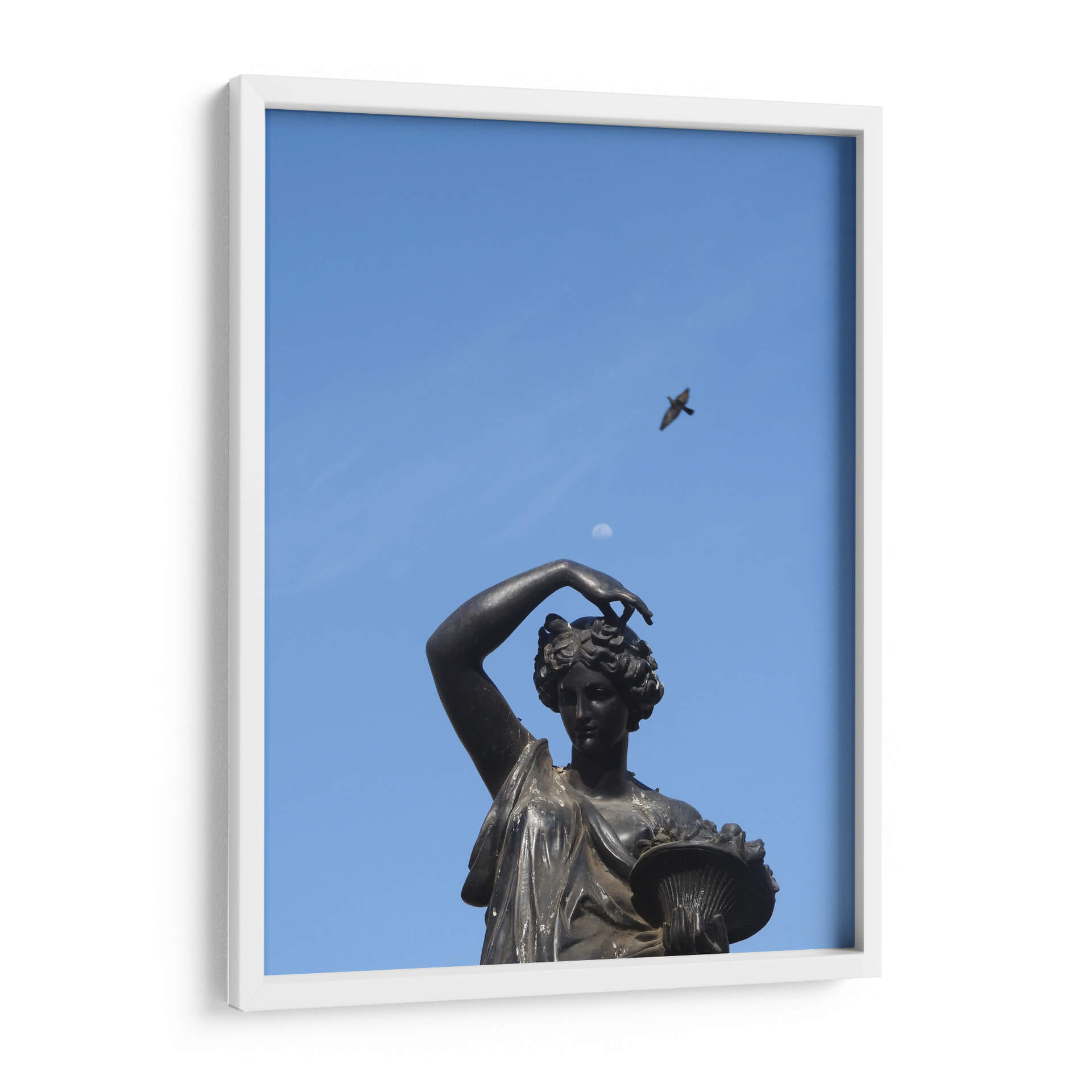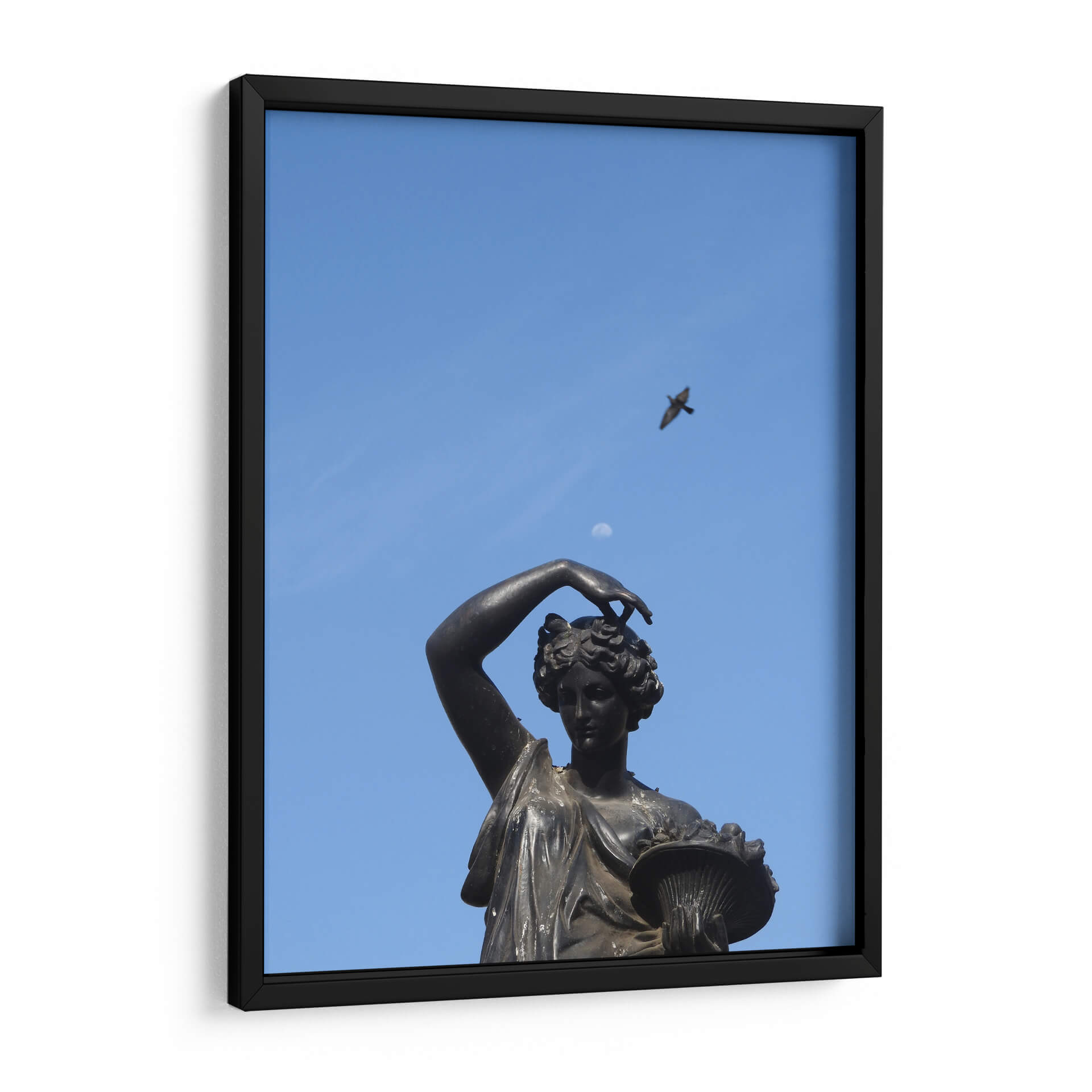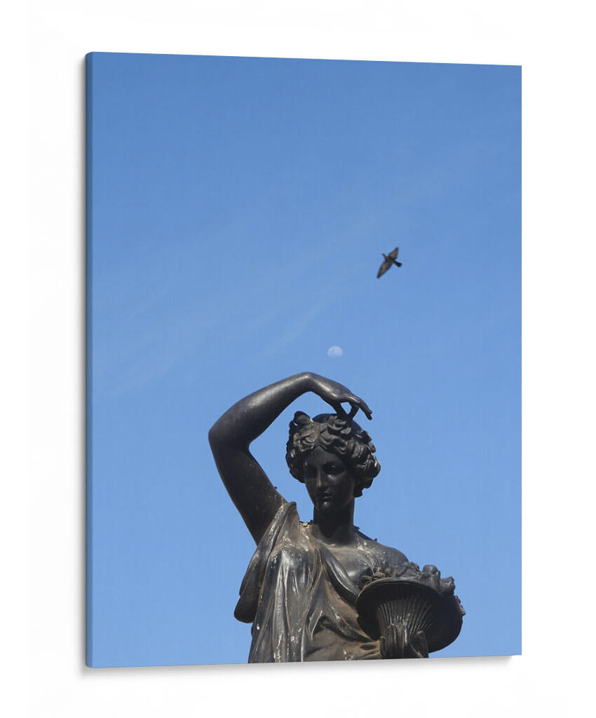 Captura la esencia de la contemplación con "Piensa", una obra de Hugo Segura que evoca serenidad y reflexión. Este cuadro decorativo presenta una imponente escultura de bronce, con una mujer de pose serena bajo un cielo azul despejado. La delicadeza de sus gestos, la forma en que su mano acaricia su cabello y sostiene una cesta, transmite una profunda introspección. La paleta de colores se centra en el contraste entre la figura oscura y el vibrante azul del cielo, acentuado por la presencia sutil de la luna y un pájaro en vuelo, elementos que añaden un toque de ensueño y libertad. El estilo realista de la escultura, con sus detalles clásicos, contrasta con la composición moderna y minimalista de la imagen, creando una pieza visualmente cautivadora. "Piensa" es ideal para espacios que buscan un punto focal de calma y elegancia, como una sala de estar, un estudio o un dormitorio, aportando un aire de sofisticación atemporal. Transforma tu hogar en un santuario de paz y arte con esta pieza única que invita a la pausa y a la reflexión en medio del ajetreo diario.