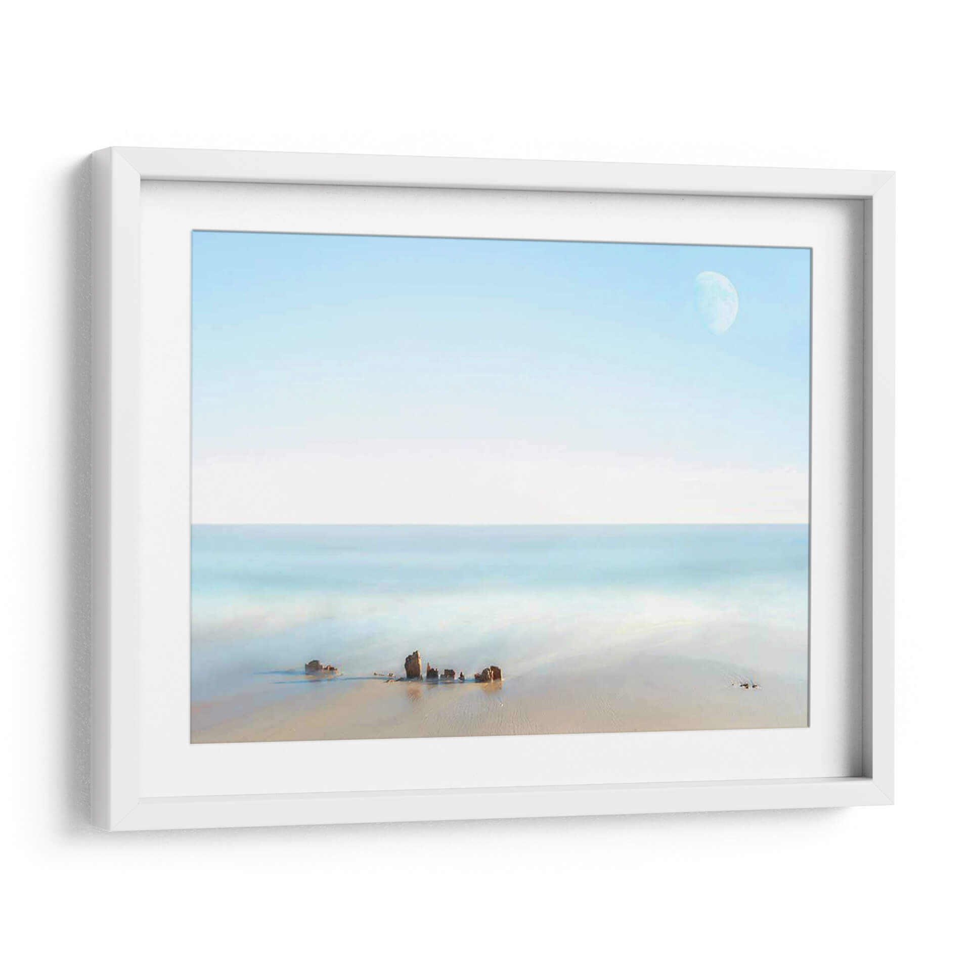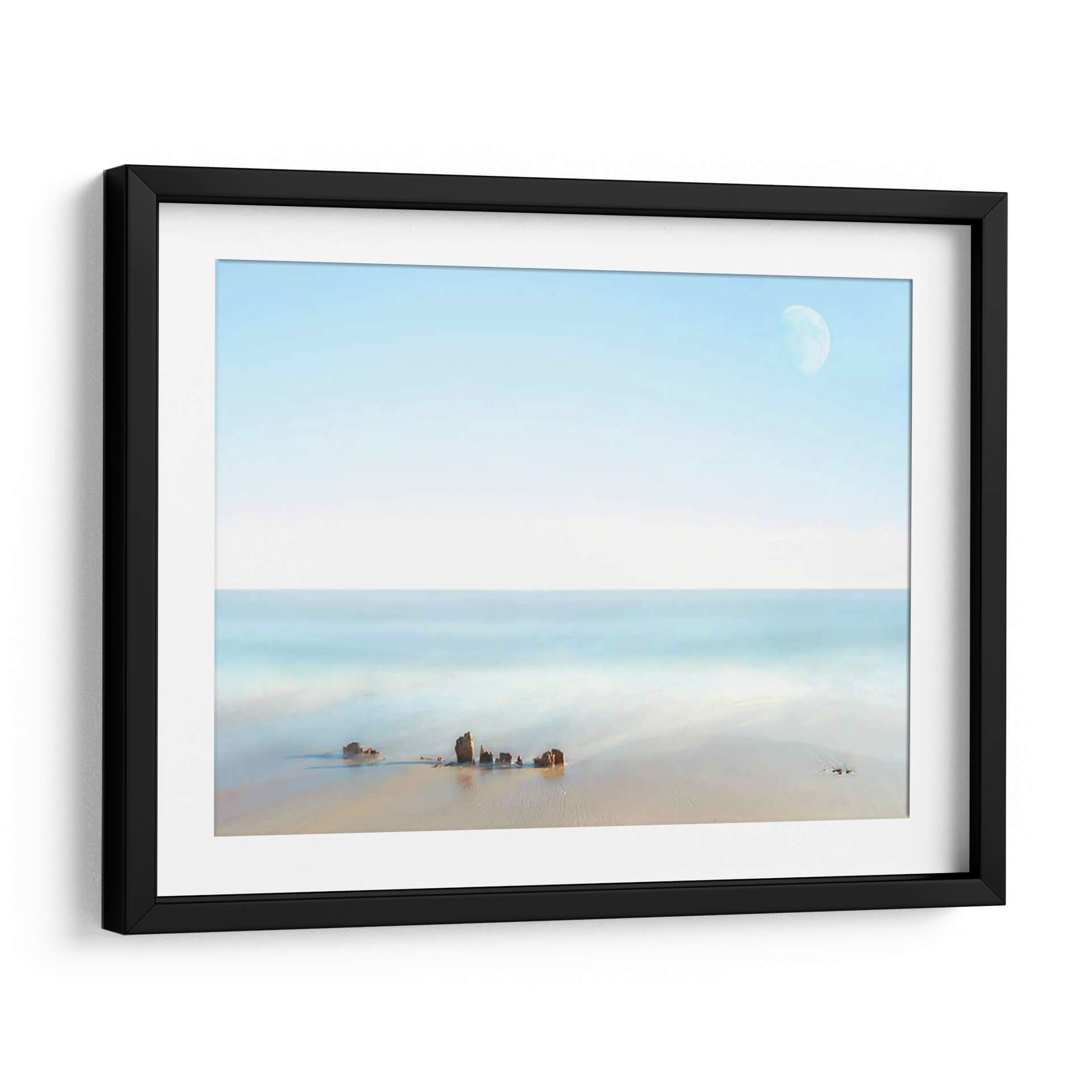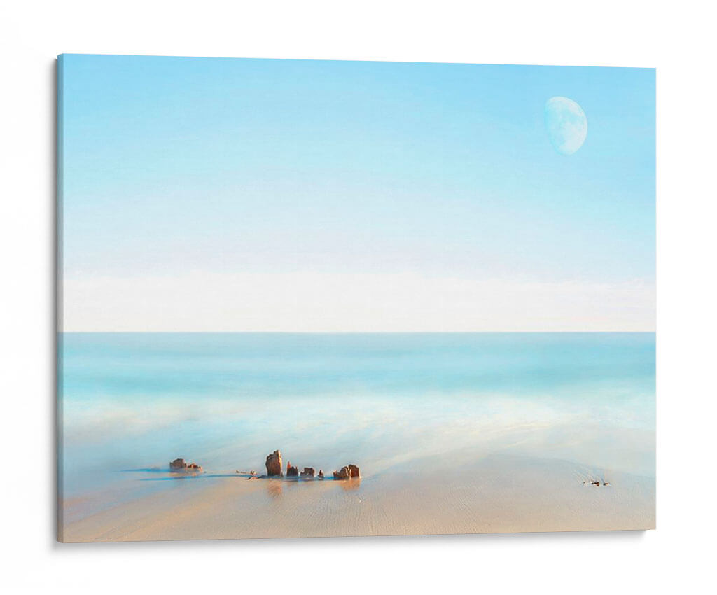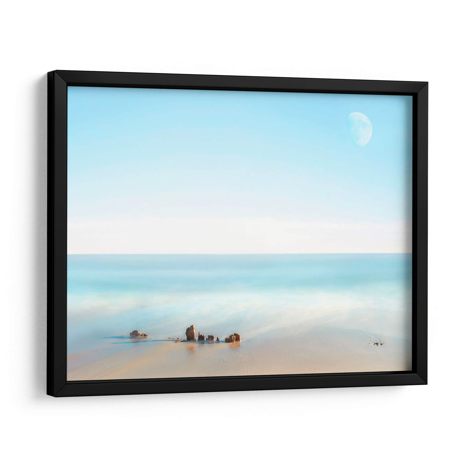Sumérgete en la serenidad de 'Playscape Photo V', una obra de arte cautivadora que evoca la tranquilidad de un paisaje marino al amanecer. La pieza presenta una playa serena con aguas tranquilas que se fusionan suavemente con el horizonte. En la distancia, una luna etérea flota en un cielo de tonos celestes y pálidos, proyectando una atmósfera de calma y contemplación. La paleta de colores, dominada por suaves azules, aguamarinas y tonos tierra, crea un ambiente pacífico y relajante, perfecto para cualquier espacio que busque un refugio de paz. Pequeños grupos de rocas emergen de la arena húmeda, añadiendo un sutil interés visual sin romper la armonía general. El estilo, que combina elementos fotográficos con una cualidad pictórica difuminada, invita a la meditación y al escape. Este cuadro decorativo es ideal para añadir un toque de serenidad a dormitorios, salas de estar o espacios de meditación, transformando tu hogar en un santuario personal. Su simplicidad y belleza evocadora lo convierten en una elección atemporal para quienes aprecian el arte que nutre el alma y decora con elegancia.