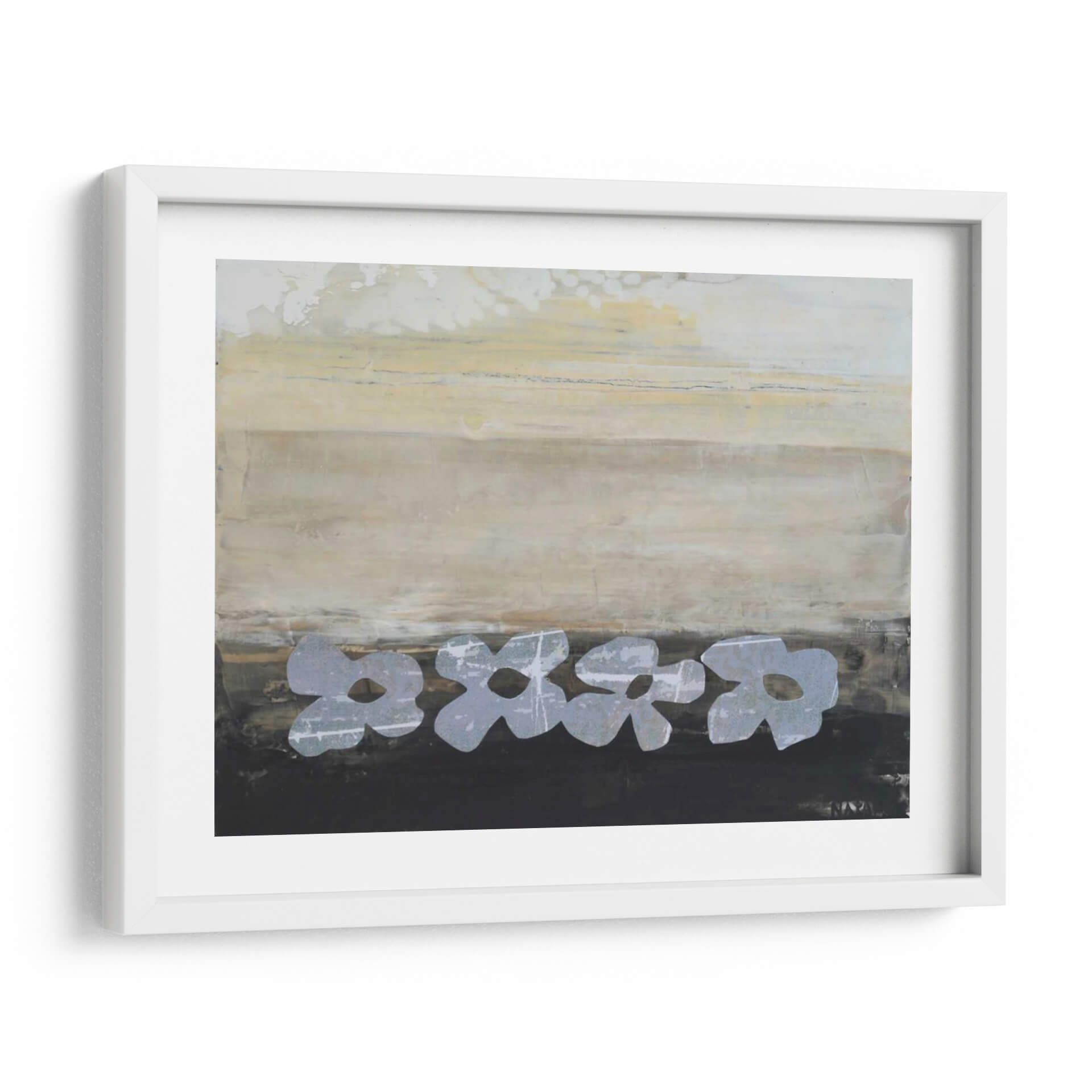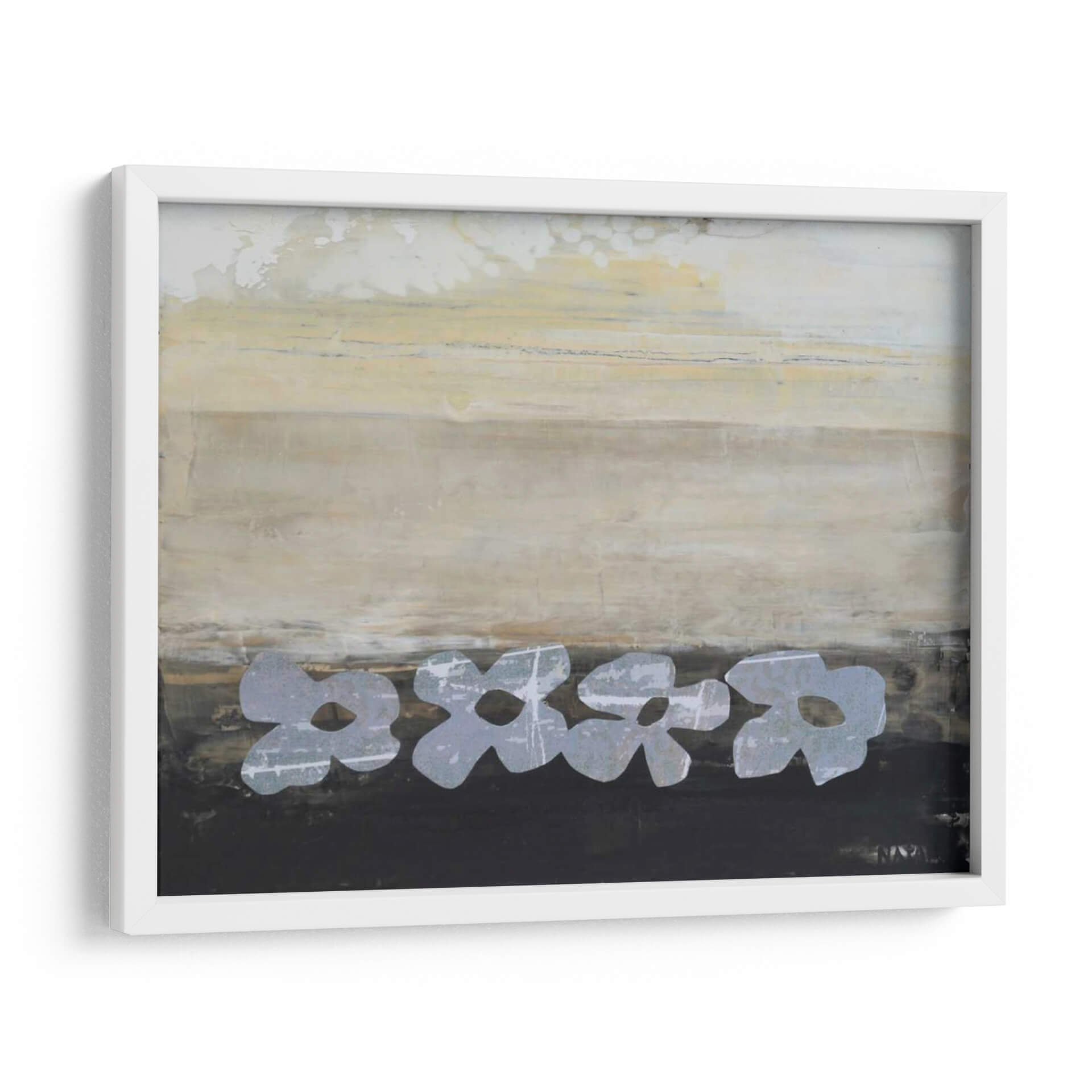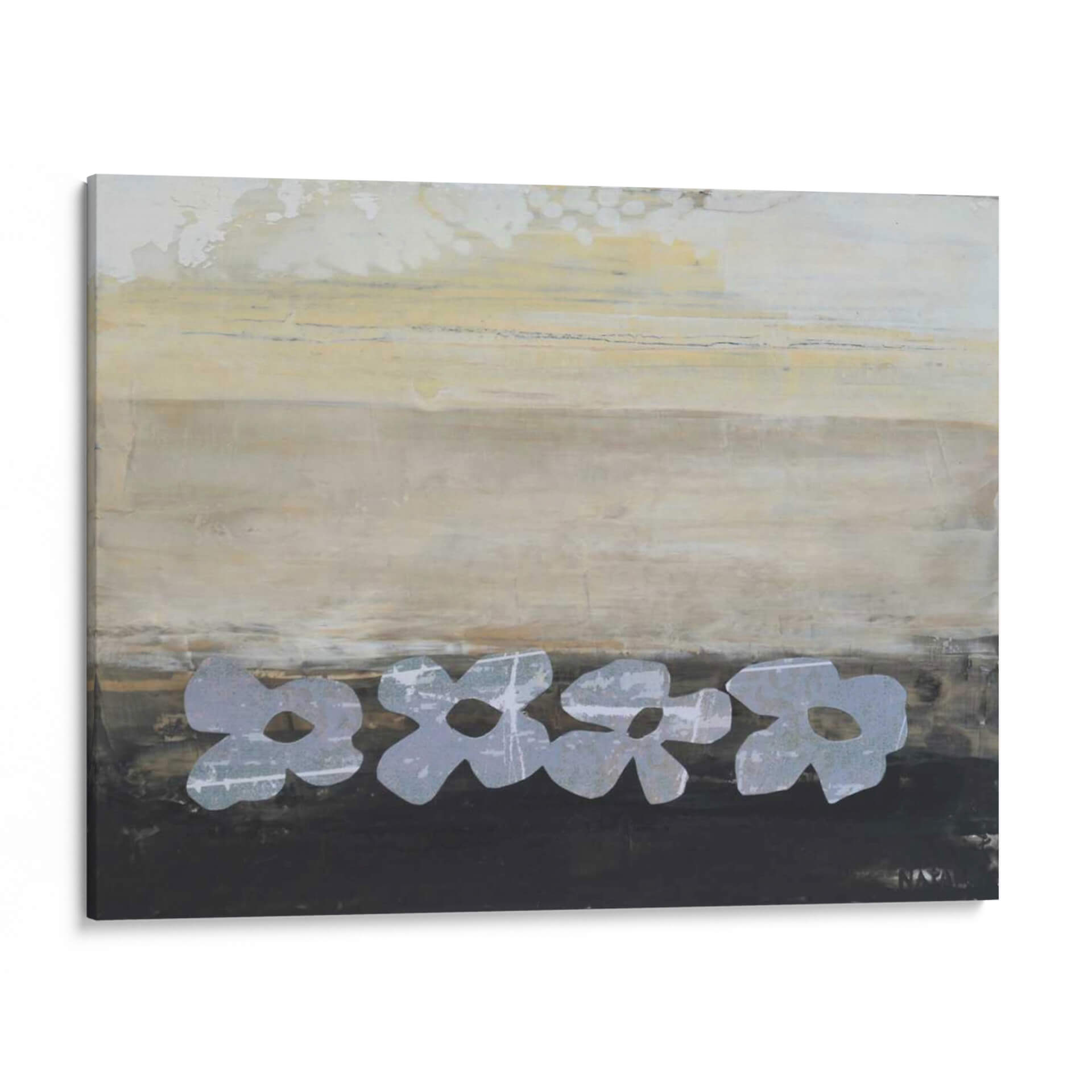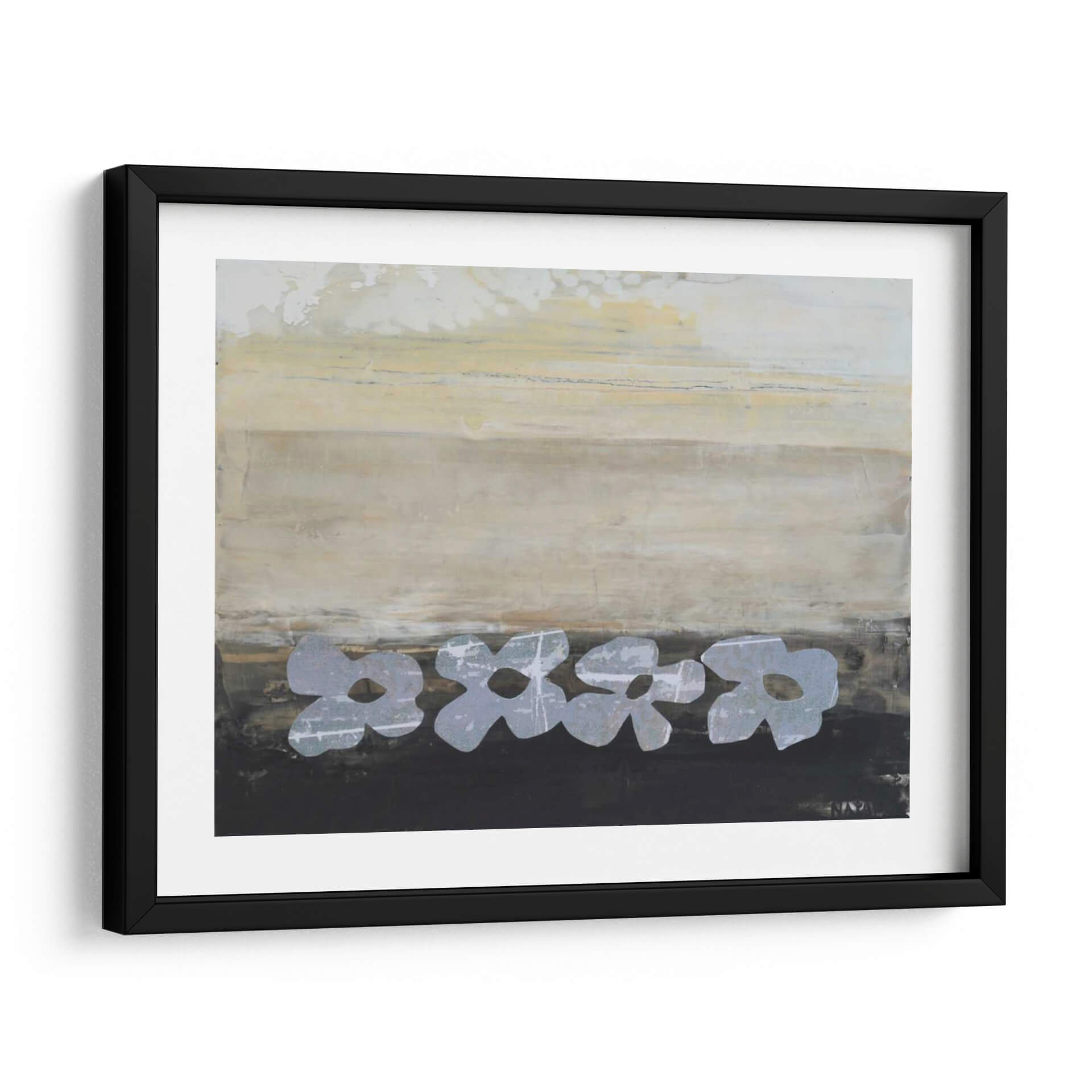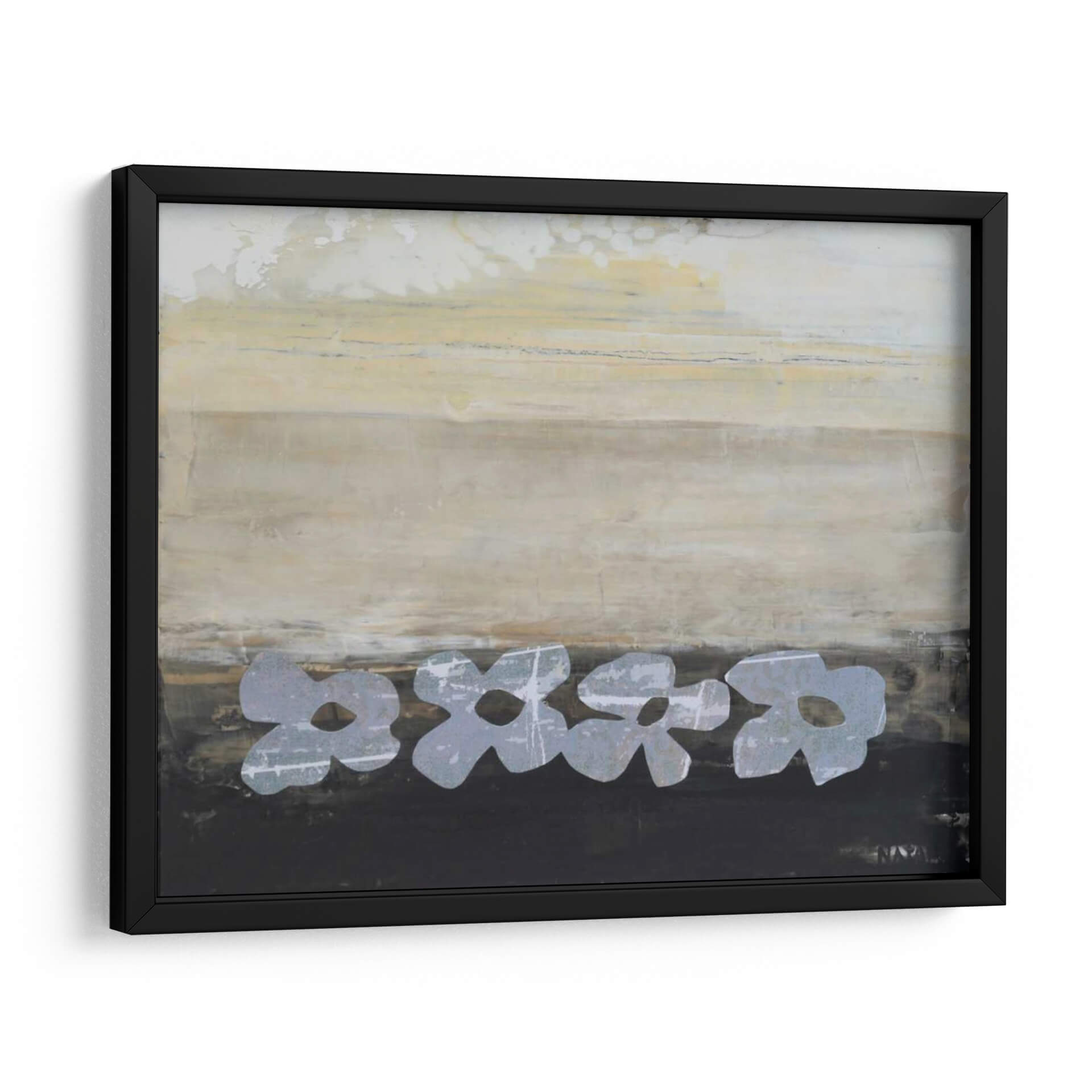 Sumérgete en la serena belleza de "Posías Estampadas V", una obra de arte contemporáneo de Natalie Avondet que evoca calma y reflexión. Este cautivador cuadro decorativo presenta una paleta de colores suaves y terrosos, dominada por tonos arena, blanco roto y grises cálidos, con sutiles toques de negro en la base que anclan la composición. En la parte inferior, una fila de formas orgánicas en un delicado tono azulado-grisáceo recuerda a pétalos o estambres estilizados, añadiendo un elemento de interés visual sin abrumar la atmósfera general. La textura de la obra, con sus capas aparentes y sutiles desperfectos, le confiere una profundidad y un carácter único, sugiriendo un paisaje abstracto o una interpretación poética de la naturaleza. Ideal para espacios que buscan un toque de sofisticación discreta y un aire de tranquilidad, este cuadro es perfecto para salas de estar, dormitorios o estudios donde se desee fomentar la paz y la contemplación. "Posías Estampadas V" es más que una decoración; es una invitación a la pausa y a la apreciación de la belleza sutil.