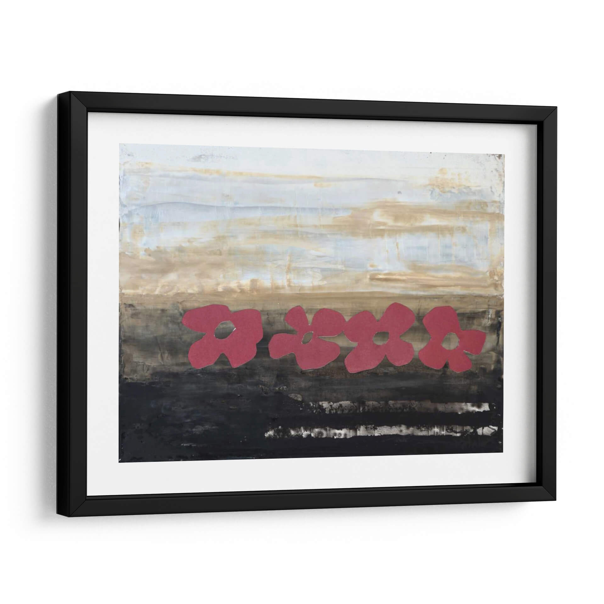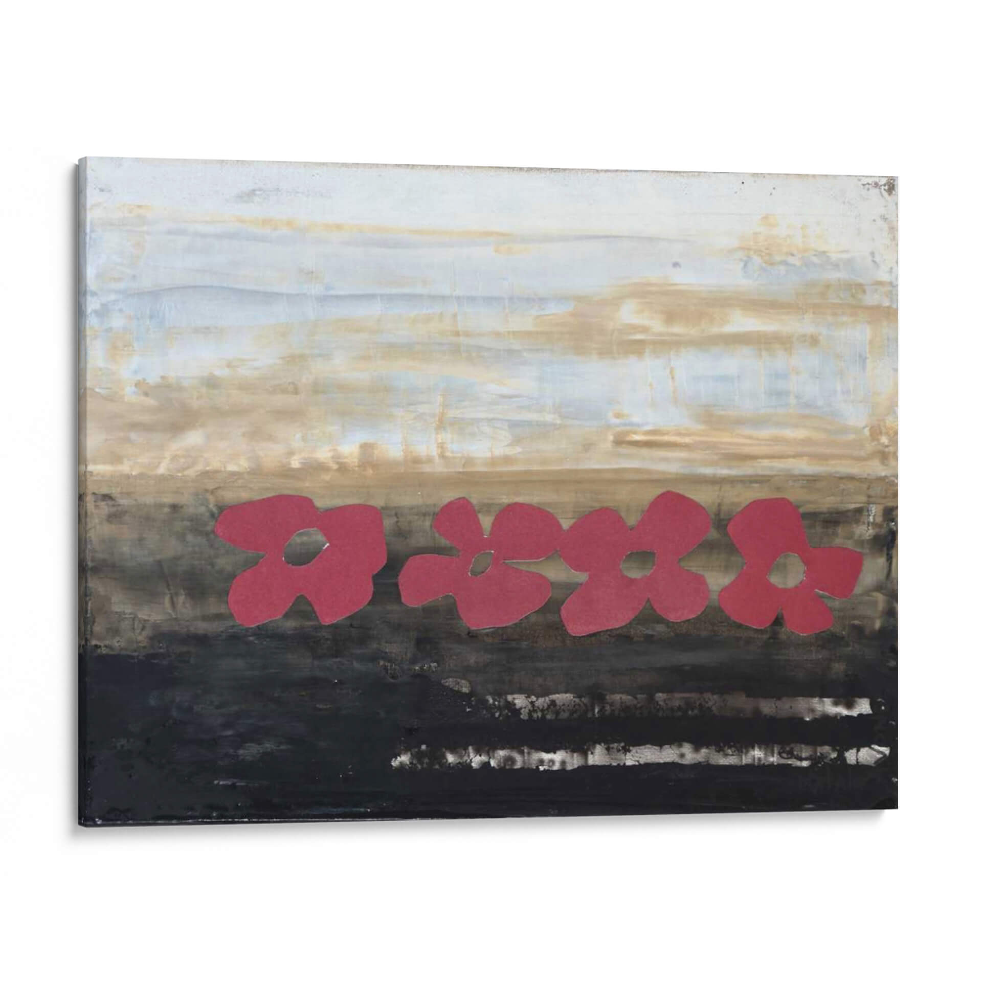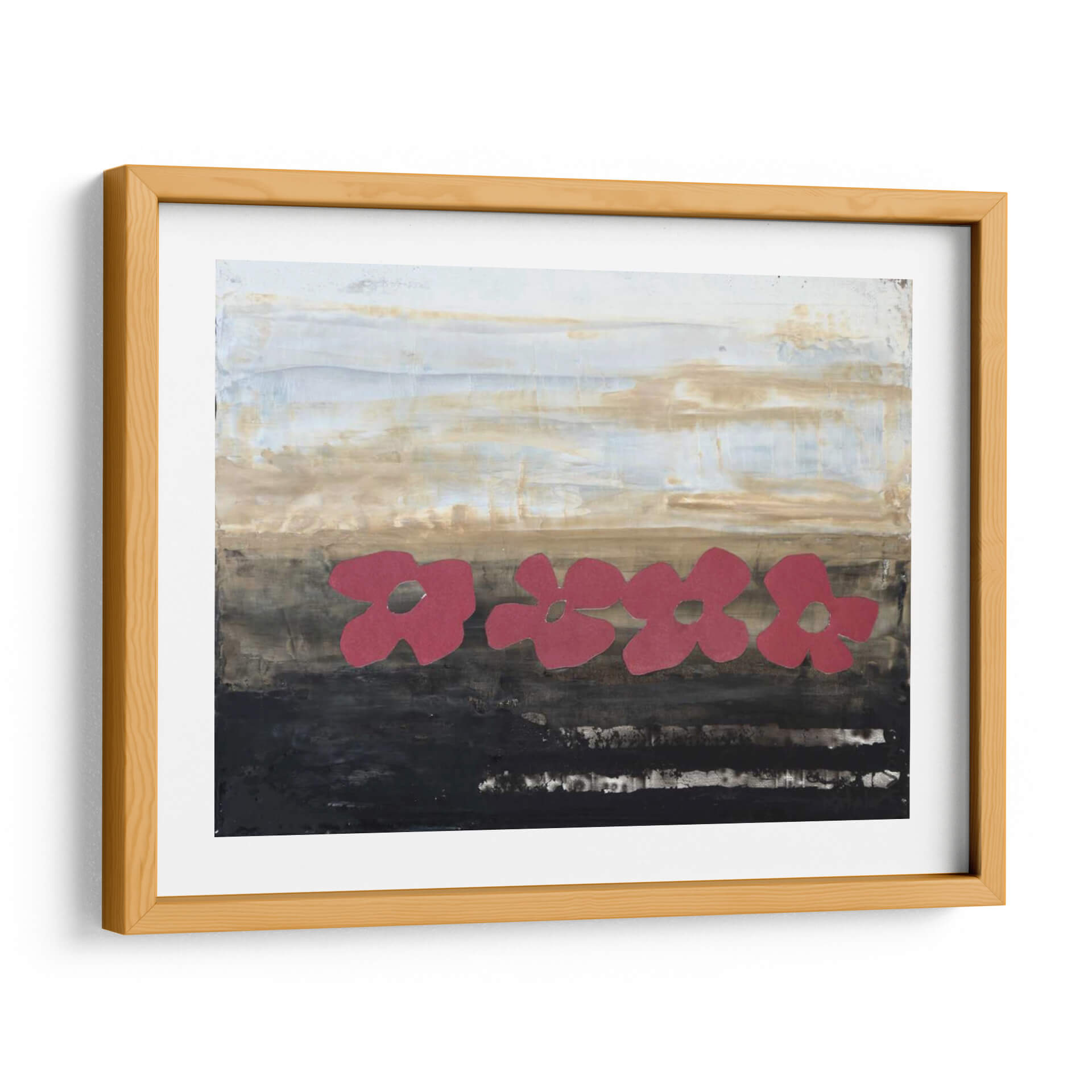 Sumérgete en la cautivadora obra 'Posies Estampadas Iv' de Natalie Avondet, una pieza que fusiona la abstracción lírica con un toque de realismo floral. La composición se desarrolla sobre un fondo texturizado que evoca un paisaje etéreo, con capas de grises pálidos, blancos luminosos y toques cálidos de ocre que sugieren un cielo o una distancia nebulosa. En contraste, la parte inferior se sumerge en tonos oscuros y profundos, creando una base terrenal o misteriosa. Sobre este lienzo de atmósfera, emergen cuatro estilizadas flores en un vibrante color fucsia. Estas formas recortadas, casi como pétalos de papel, aportan un elemento gráfico y moderno a la pieza, rompiendo la fluidez del fondo con su presencia audaz. El contraste entre la delicadeza de las flores y la robustez de la paleta de colores crea una tensión visual fascinante. Este cuadro decorativo es ideal para espacios que buscan un equilibrio entre lo orgánico y lo contemporáneo, aportando un punto focal de color y sofisticación a salas de estar, dormitorios o estudios. 'Posies Estampadas Iv' es más que una simple decoración; es una invitación a la contemplación, una expresión de la belleza sutil pero impactante que la artista Natalie Avondet plasma en cada trazo. Añade un toque de arte moderno a tu hogar con esta obra única.