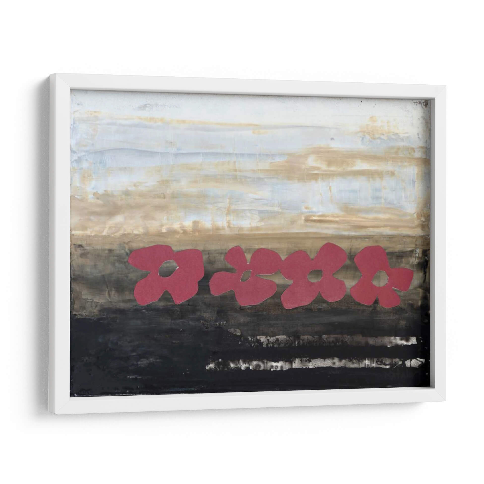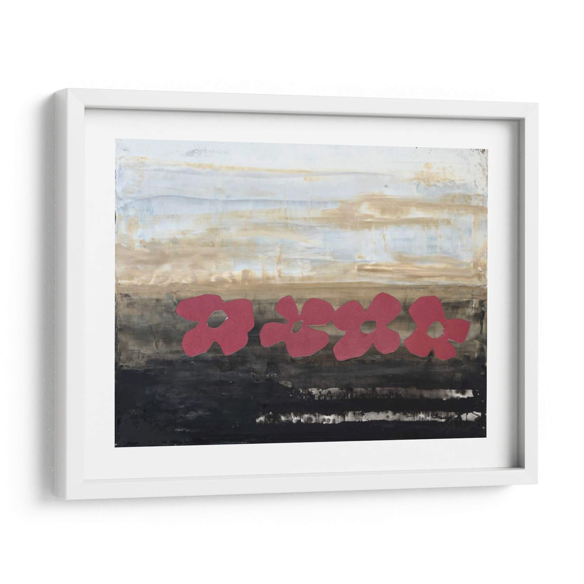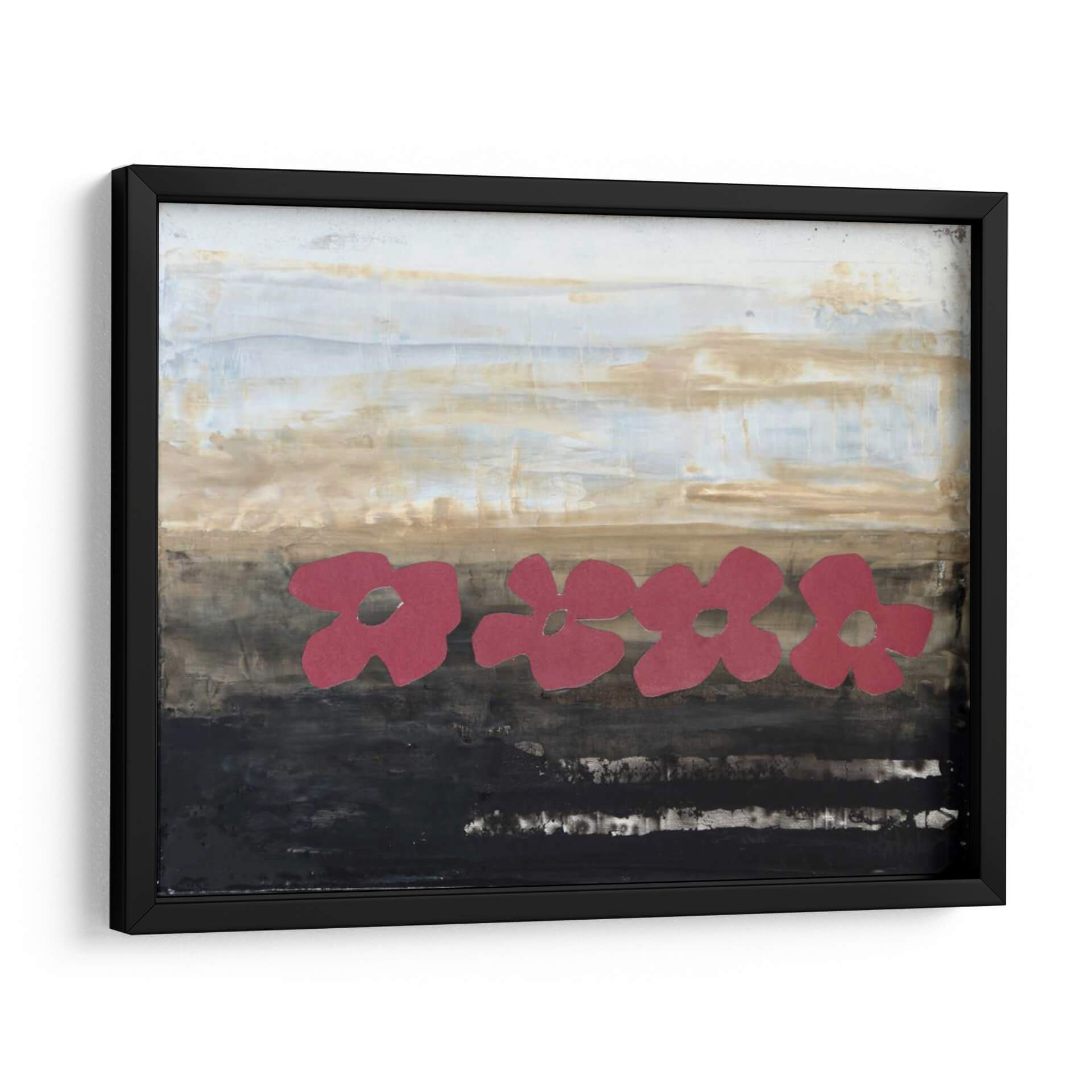 Sumérgete en la cautivadora obra 'Posies Estampadas Iv' de Natalie Avondet, una pieza que fusiona la abstracción lírica con un toque de realismo floral. La composición se desarrolla sobre un fondo texturizado que evoca un paisaje etéreo, con capas de grises pálidos, blancos luminosos y toques cálidos de ocre que sugieren un cielo o una distancia nebulosa. En contraste, la parte inferior se sumerge en tonos oscuros y profundos, creando una base terrenal o misteriosa. Sobre este lienzo de atmósfera, emergen cuatro estilizadas flores en un vibrante color fucsia. Estas formas recortadas, casi como pétalos de papel, aportan un elemento gráfico y moderno a la pieza, rompiendo la fluidez del fondo con su presencia audaz. El contraste entre la delicadeza de las flores y la robustez de la paleta de colores crea una tensión visual fascinante. Este cuadro decorativo es ideal para espacios que buscan un equilibrio entre lo orgánico y lo contemporáneo, aportando un punto focal de color y sofisticación a salas de estar, dormitorios o estudios. 'Posies Estampadas Iv' es más que una simple decoración; es una invitación a la contemplación, una expresión de la belleza sutil pero impactante que la artista Natalie Avondet plasma en cada trazo. Añade un toque de arte moderno a tu hogar con esta obra única.