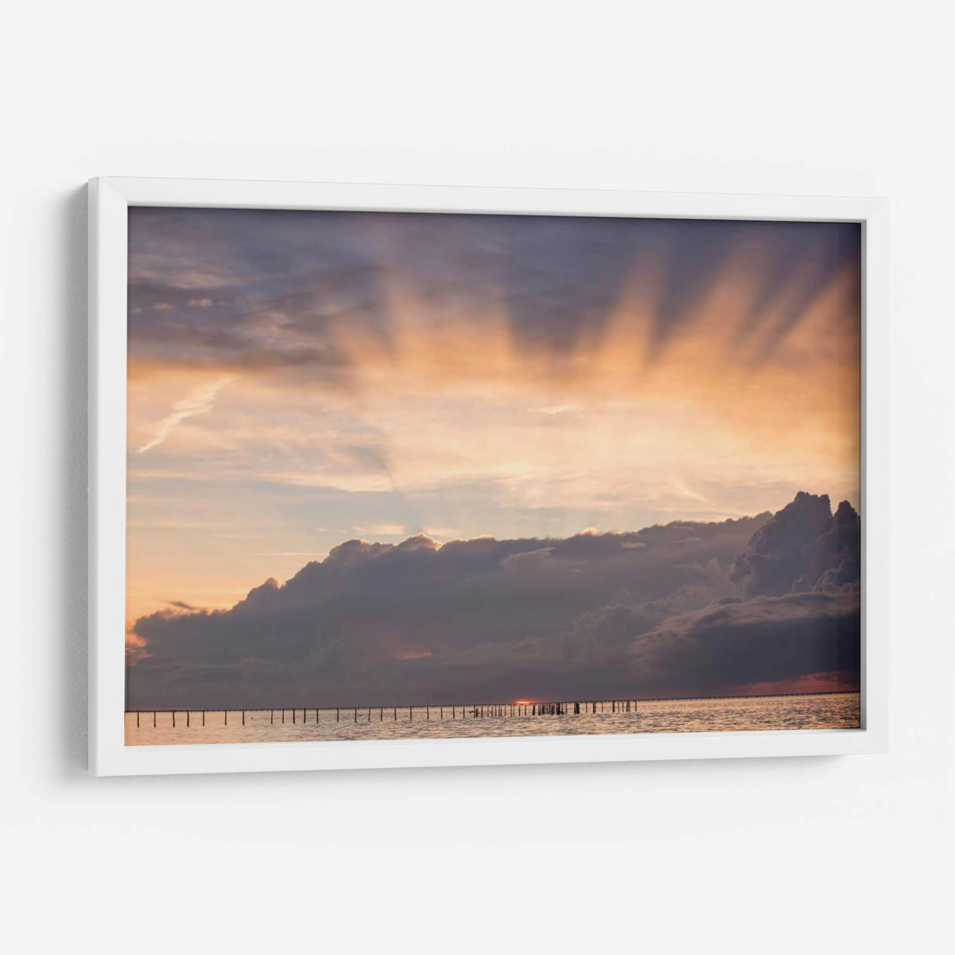 Sumérgete en la serena belleza de "Primer Landing-Sea III", una cautivadora obra de arte del artista Adam Mead. Este cuadro decorativo captura la mágica transición del día a la noche, con rayos de luz que se filtran a través de un cielo dramático y cargado de nubes. La paleta de colores, que abarca tonos cálidos de naranja y melocotón fundiéndose con profundos azules y grises, evoca una sensación de paz y asombro. La composición, dominada por la inmensidad del mar y el cielo, se ve acentuada por una línea de pilares que se adentra en el horizonte, invitando a la contemplación y la introspección. La atmósfera es de calma expectante, perfecta para añadir un toque de tranquilidad y sofisticación a cualquier espacio. Ideal para salones modernos, dormitorios o incluso oficinas, este cuadro decorativo transformará tu entorno en un santuario de paz visual. Es una pieza que invita a la reflexión sobre la belleza efímera de los momentos cotidianos y la grandeza de la naturaleza. El arte de Adam Mead destaca por su habilidad para capturar la esencia de paisajes evocadores, creando piezas que resuenan emocionalmente con el espectador, haciendo de "Primer Landing-Sea III" una adición impresionante a cualquier colección de arte de pared.