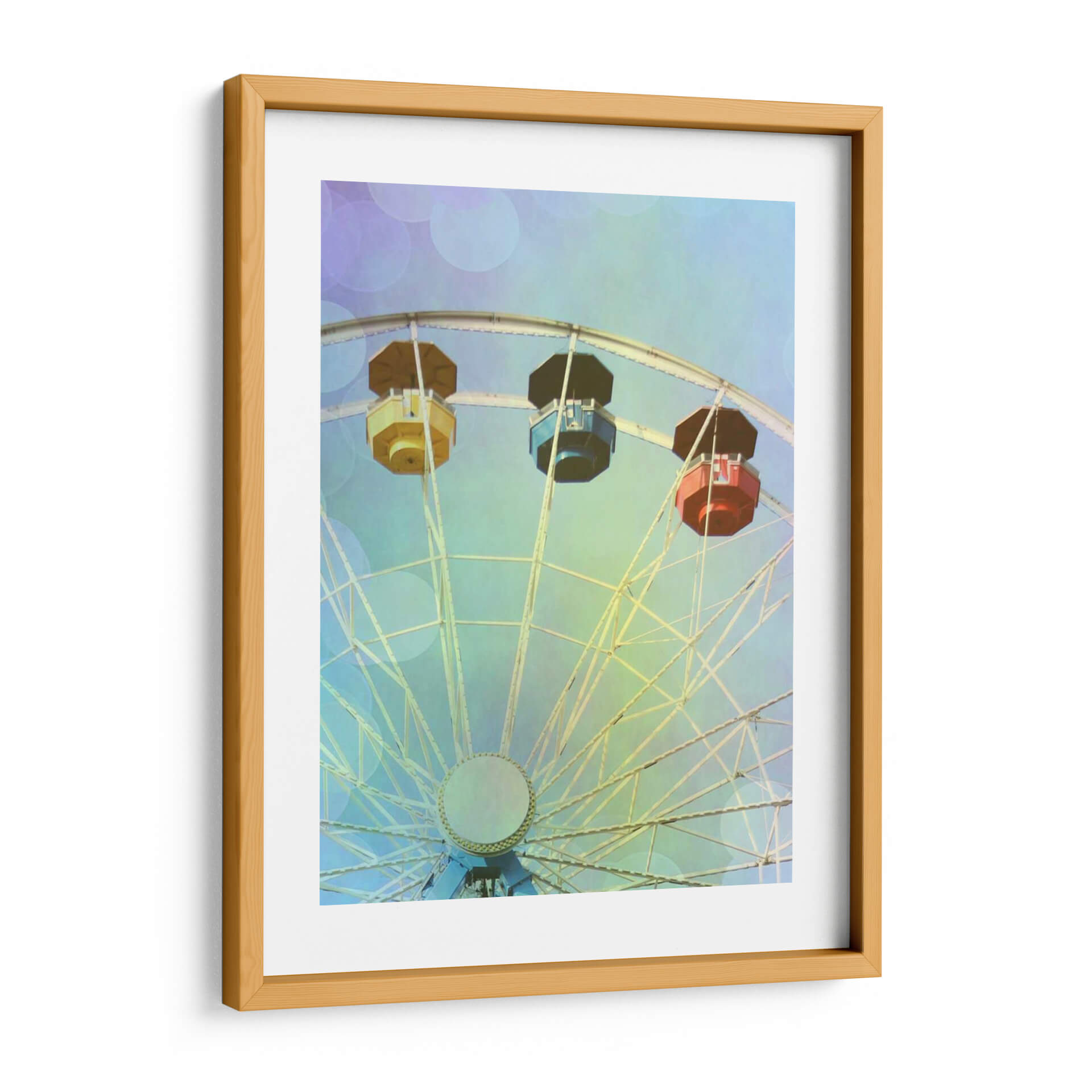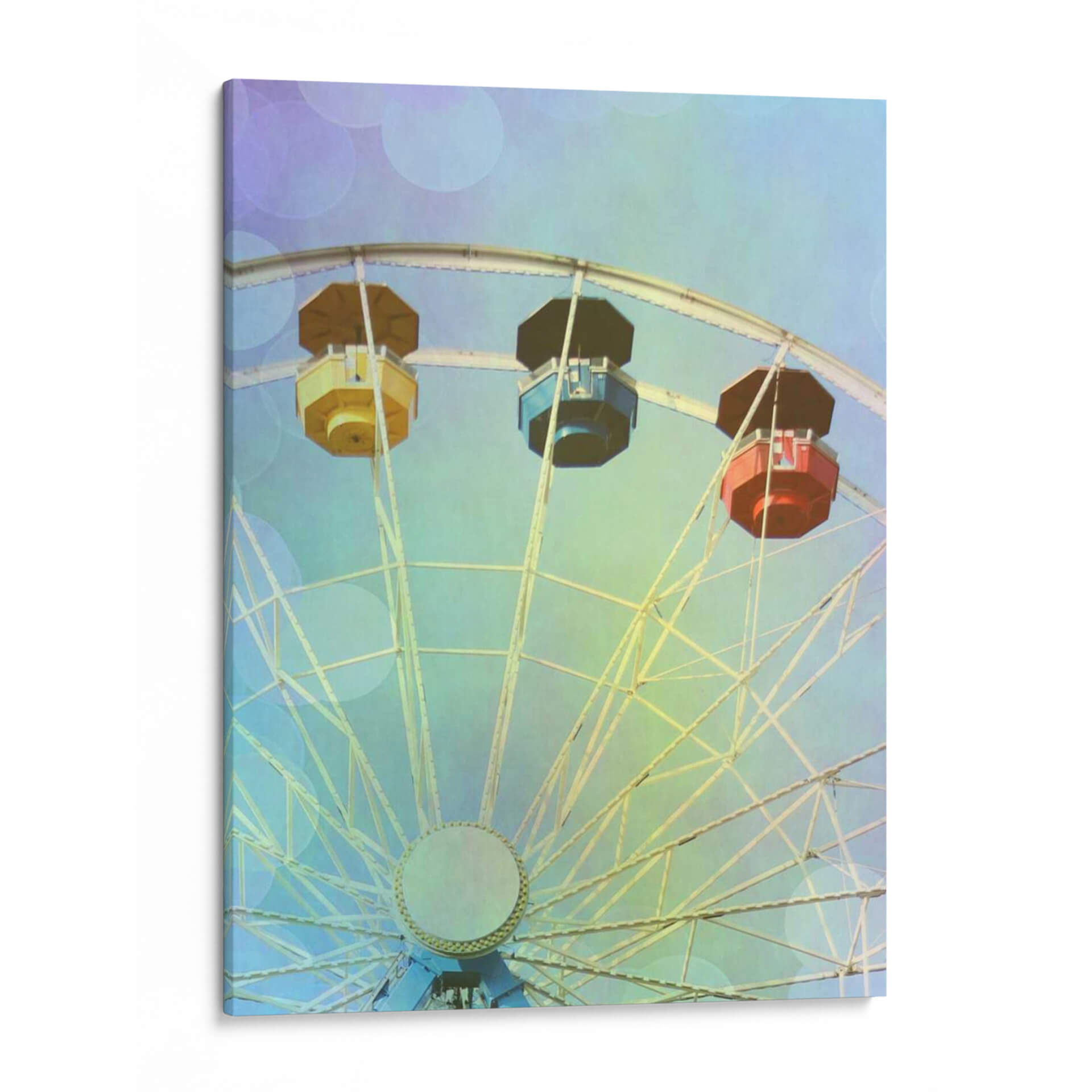 Captura la magia y la nostalgia de un día en la feria con "Rainbow Ferris Wheel IV" de Sylvia Coomes, una obra de arte digital que evoca alegría y asombro. Este cuadro decorativo presenta una perspectiva ascendente de una noria, destacando sus icónicas cabinas en vibrantes tonos de amarillo, azul y rojo contra un cielo etéreo. La paleta de colores se suaviza con delicados toques de lavanda y verde menta, creando una atmósfera soñadora y ligeramente vintage, acentuada por un efecto de bokeh sutil que añade profundidad y encanto. La intrincada estructura de la noria se despliega en un patrón geométrico, atrayendo la mirada hacia el centro de la composición. Ideal para espacios que buscan un toque de optimismo y diversión, este lienzo es perfecto para añadir un punto focal colorido a una sala de estar, una habitación infantil o incluso una oficina con un ambiente creativo. "Rainbow Ferris Wheel IV" no es solo una pieza decorativa, es una invitación a revivir momentos de felicidad y a soñar despierto, aportando una sensación de ligereza y entretenimiento a cualquier entorno.