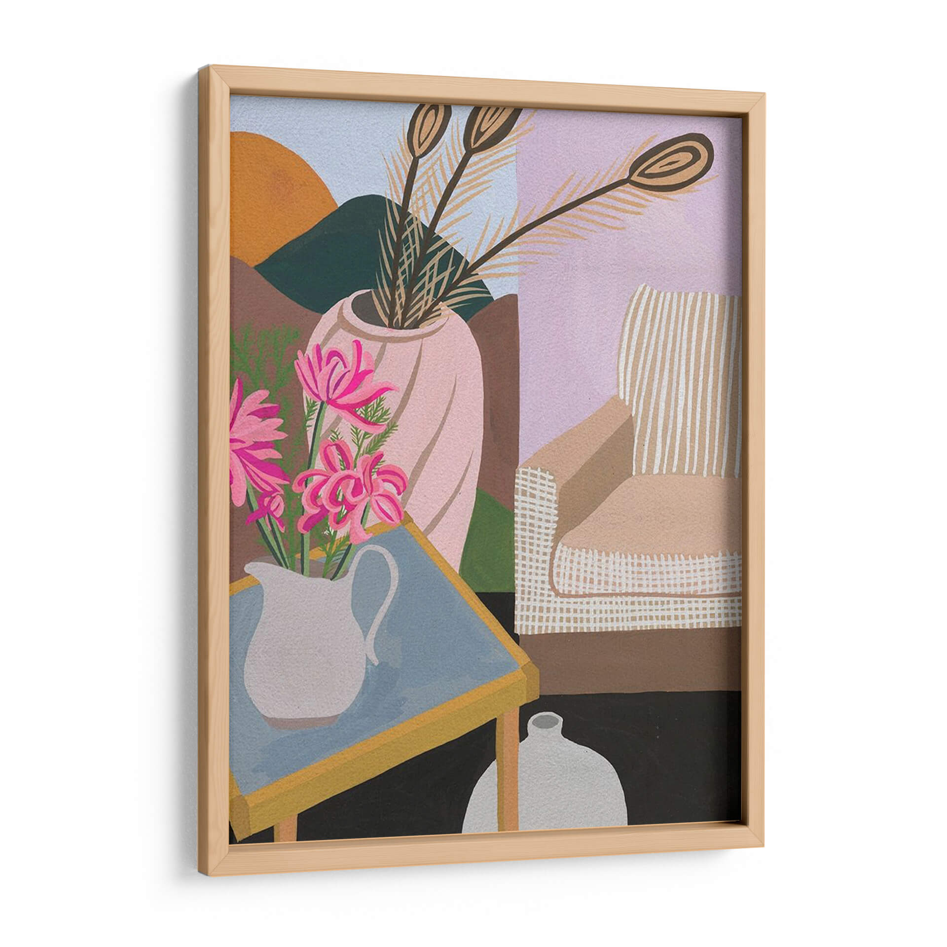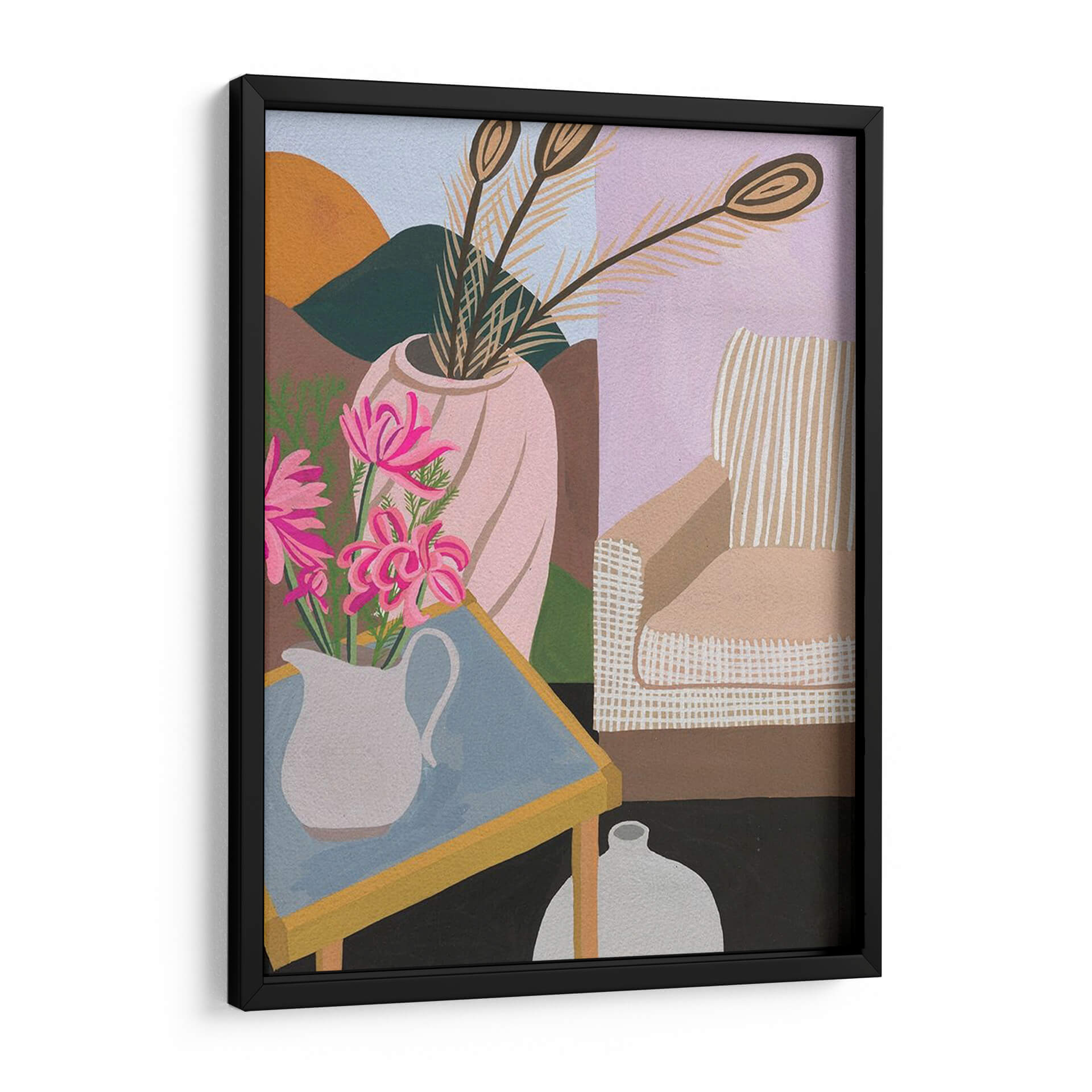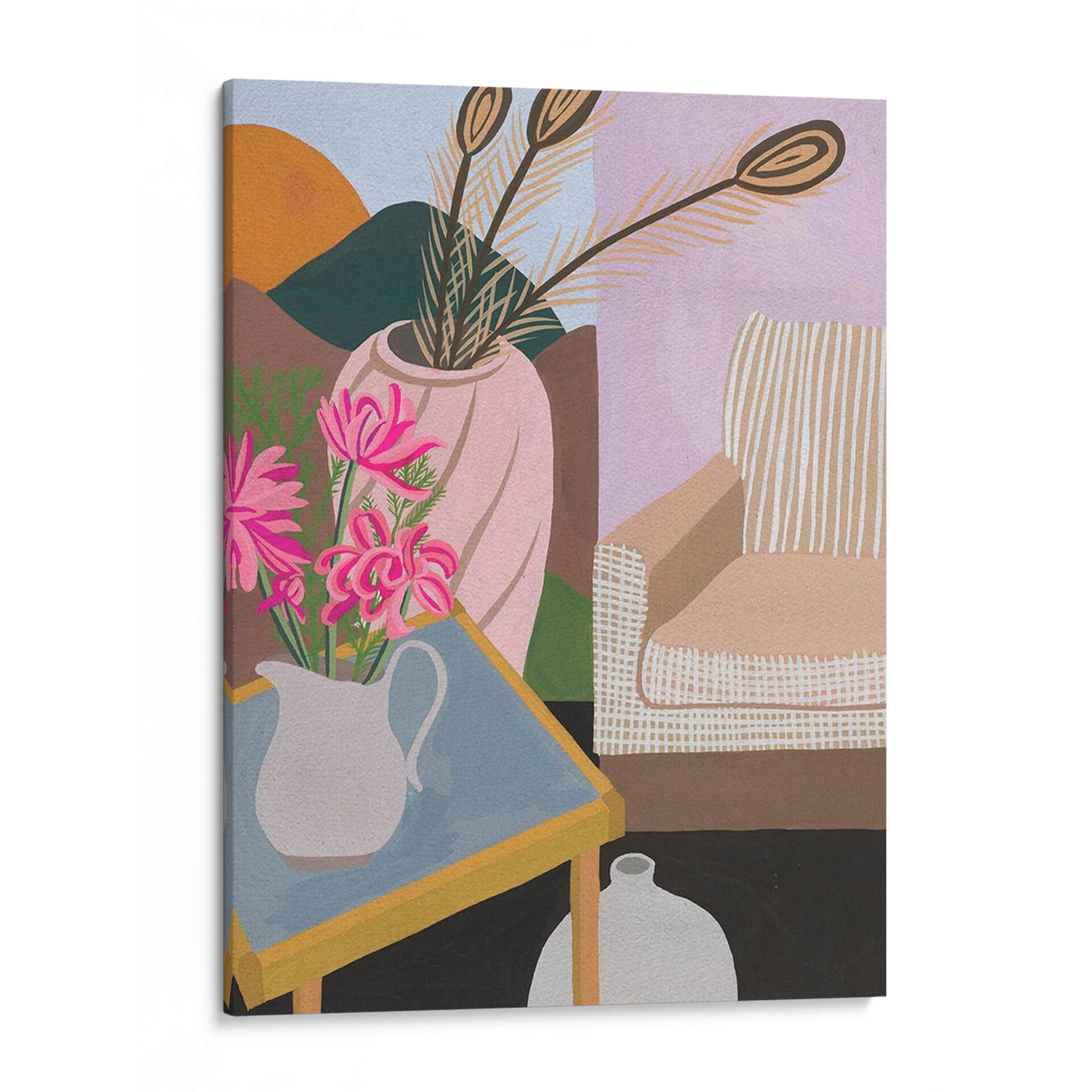 Sumérgete en la serenidad de 'Retrato De Casa Viii', una obra de arte contemporáneo de Melissa Wang que evoca calidez y tranquilidad. Esta pieza visualmente cautivadora presenta una escena interior con elementos botánicos y un paisaje estilizado al fondo, creando una atmósfera acogedora y soñadora. La paleta de colores, dominada por tonos tierra, rosados suaves, azules apagados y toques de verde y naranja, aporta una sensación de calma y equilibrio, perfecta para cualquier espacio que busque paz y armonía. La composición, que combina formas geométricas y orgánicas con un estilo pictórico distintivo, invita a la contemplación. Los detalles como el jarrón con flores vibrantes sobre una mesa y el sillón texturizado sugieren un refugio personal y un rincón de inspiración. 'Retrato De Casa Viii' es ideal para añadir un toque de sofisticación y serenidad a salones, dormitorios o estudios, transformando cualquier pared en una ventana a un mundo de belleza sutil y diseño moderno. Descubre la esencia del hogar y la naturaleza entrelazadas en este cuadro decorativo único.