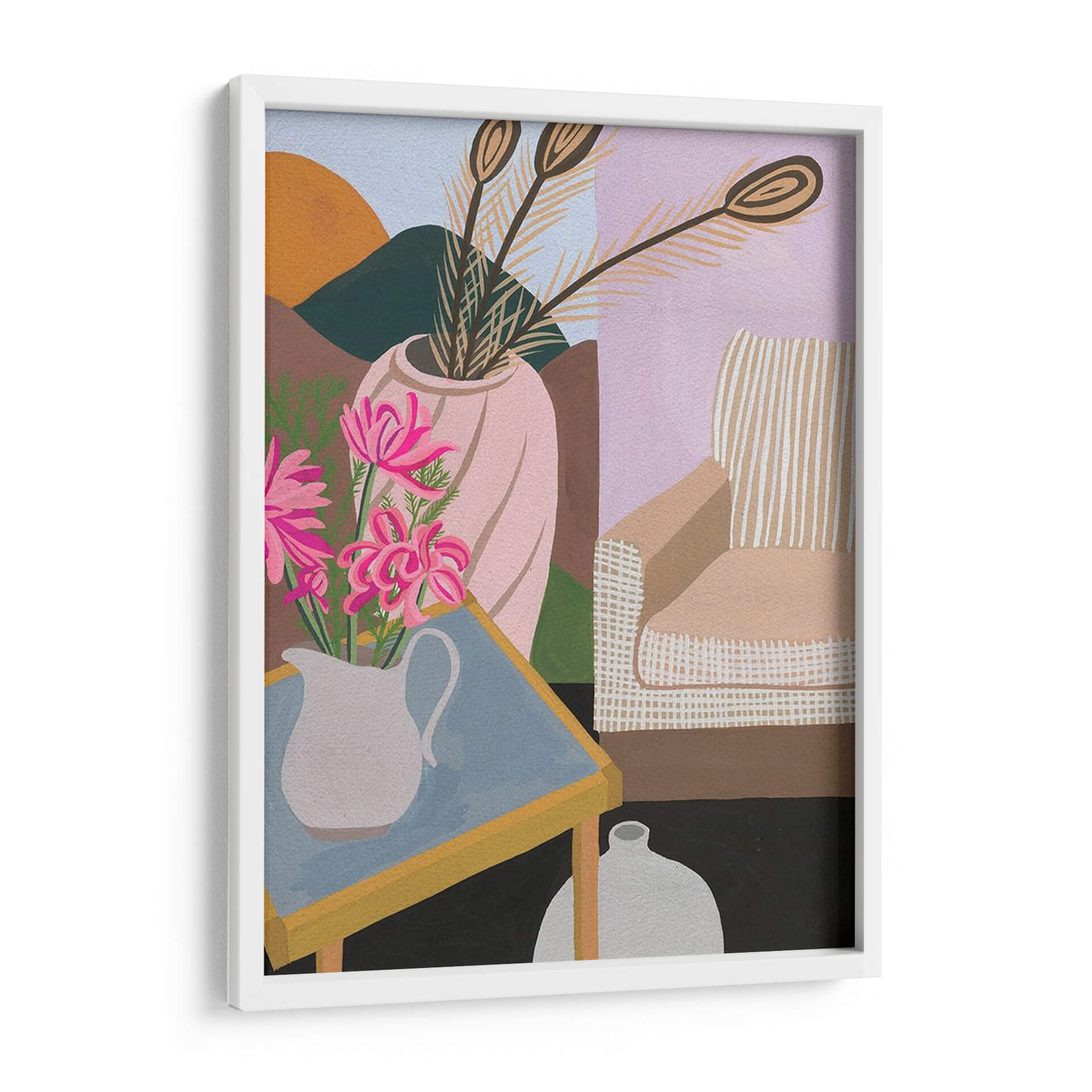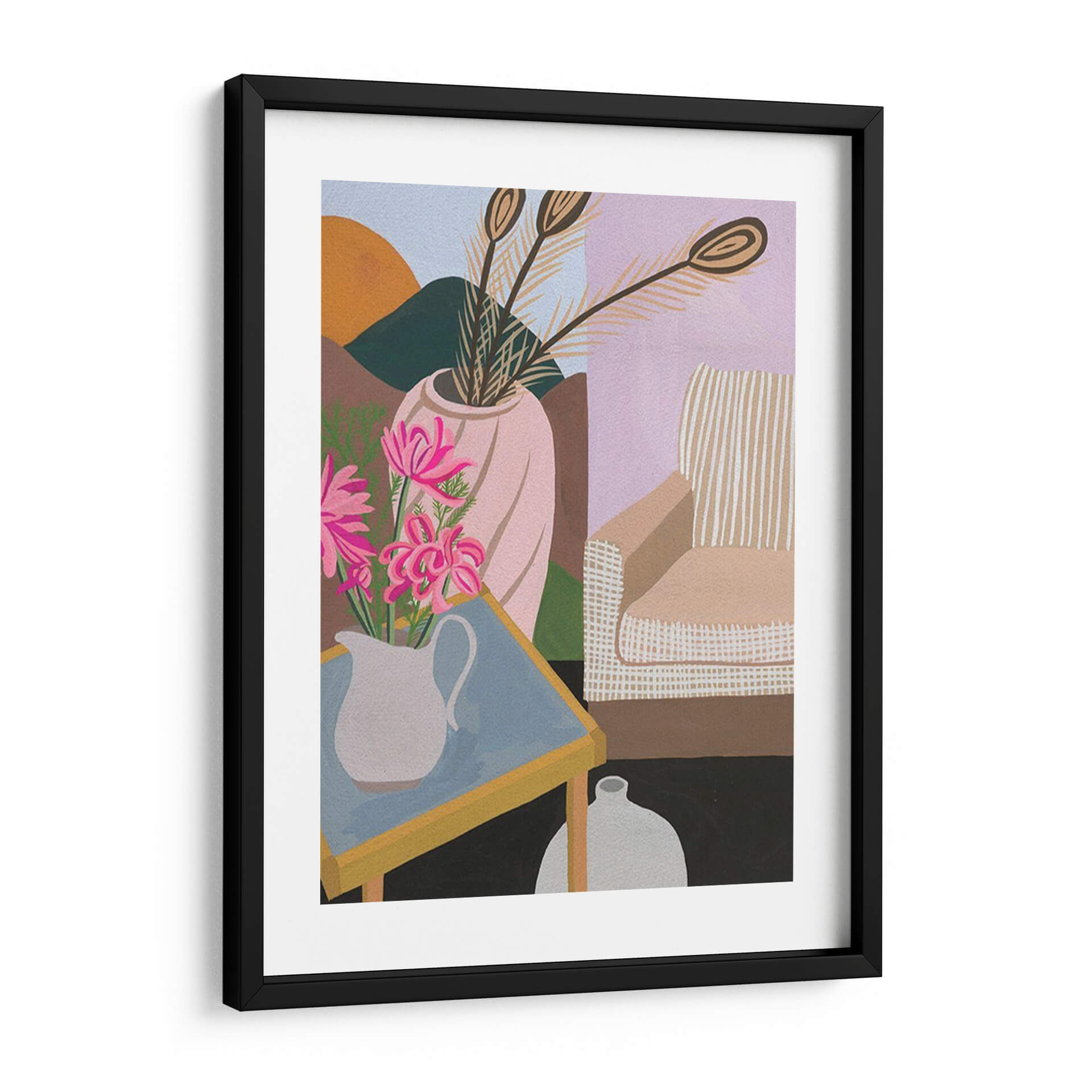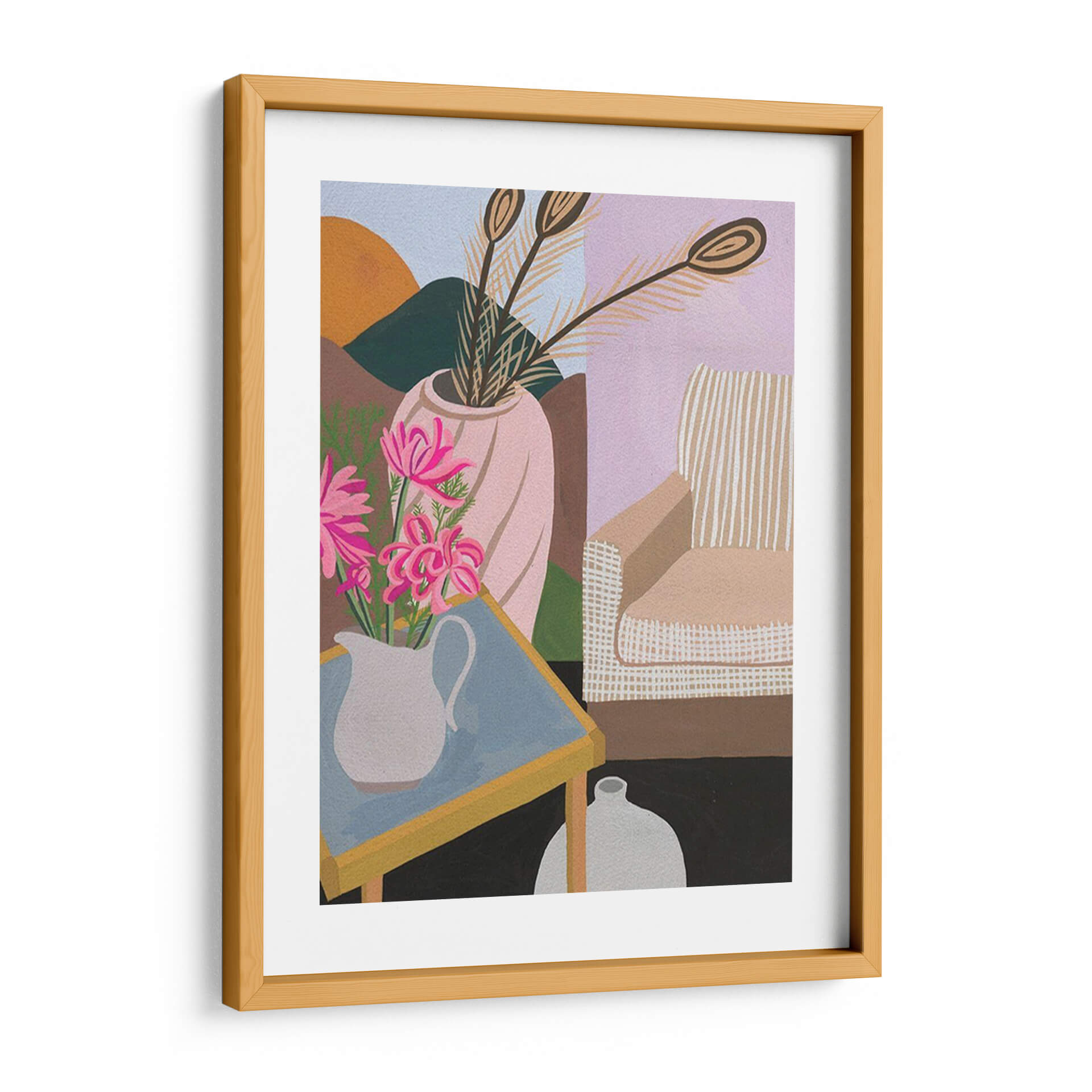 Sumérgete en la serenidad de 'Retrato De Casa Viii', una obra de arte contemporáneo de Melissa Wang que evoca calidez y tranquilidad. Esta pieza visualmente cautivadora presenta una escena interior con elementos botánicos y un paisaje estilizado al fondo, creando una atmósfera acogedora y soñadora. La paleta de colores, dominada por tonos tierra, rosados suaves, azules apagados y toques de verde y naranja, aporta una sensación de calma y equilibrio, perfecta para cualquier espacio que busque paz y armonía. La composición, que combina formas geométricas y orgánicas con un estilo pictórico distintivo, invita a la contemplación. Los detalles como el jarrón con flores vibrantes sobre una mesa y el sillón texturizado sugieren un refugio personal y un rincón de inspiración. 'Retrato De Casa Viii' es ideal para añadir un toque de sofisticación y serenidad a salones, dormitorios o estudios, transformando cualquier pared en una ventana a un mundo de belleza sutil y diseño moderno. Descubre la esencia del hogar y la naturaleza entrelazadas en este cuadro decorativo único.