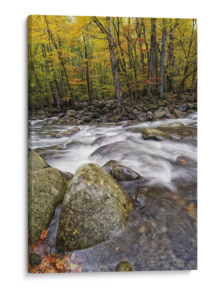 Sumérgete en la serena majestuosidad de "Roaring Waters I", una obra de arte que captura la vitalidad y el movimiento del agua fluyendo sobre rocas en un entorno otoñal vibrante. Los tonos ocres, verdes y ocres de los árboles en pleno follaje otoñal contrastan armónicamente con el blanco espumoso del agua y los grises y verdes musgosos de las grandes rocas que salpican el lecho del río. La técnica fotográfica utilizada, con una larga exposición, suaviza el movimiento del agua, creando un efecto etéreo y casi pictórico que invita a la contemplación. Esta pieza evoca una sensación de tranquilidad profunda y la energía incesante de la naturaleza, ideal para añadir un toque de paz y belleza natural a tu hogar u oficina. "Roaring Waters I" es más que una simple imagen; es una ventana a un momento de calma en medio de la fuerza del agua, perfecta para salones, dormitorios o estudios que buscan un escape visual a un paisaje de ensueño, aportando frescura y color a cualquier decoración.