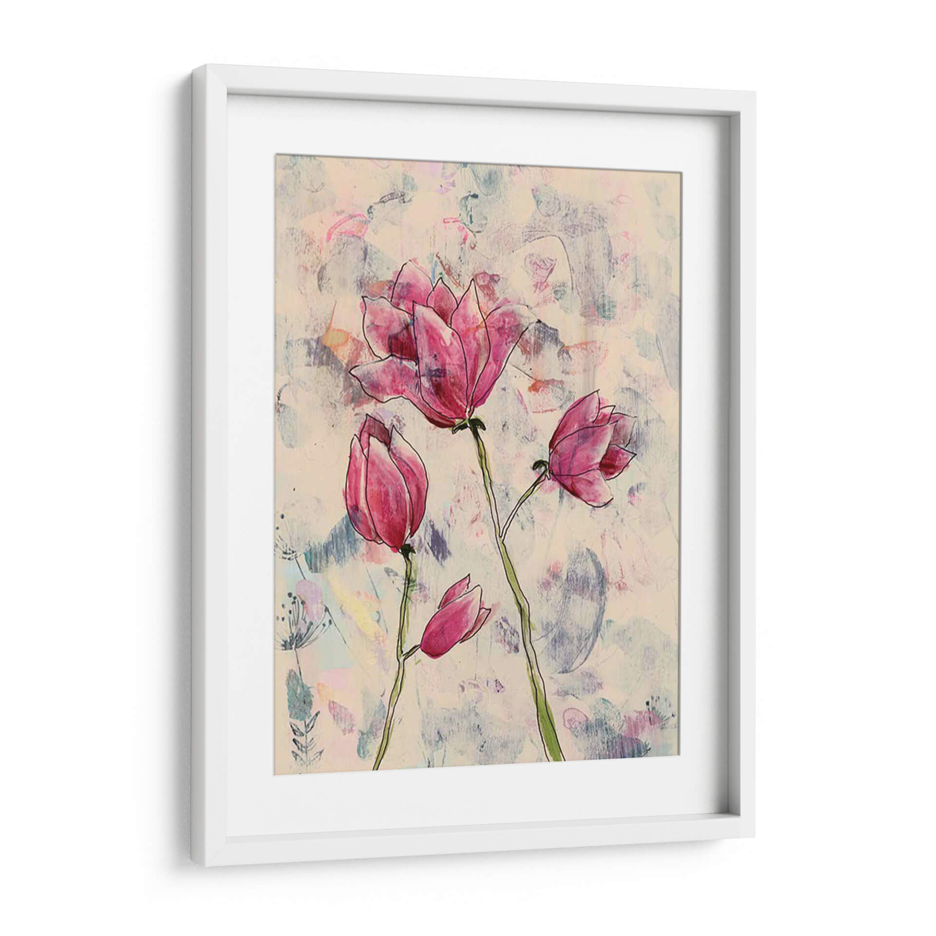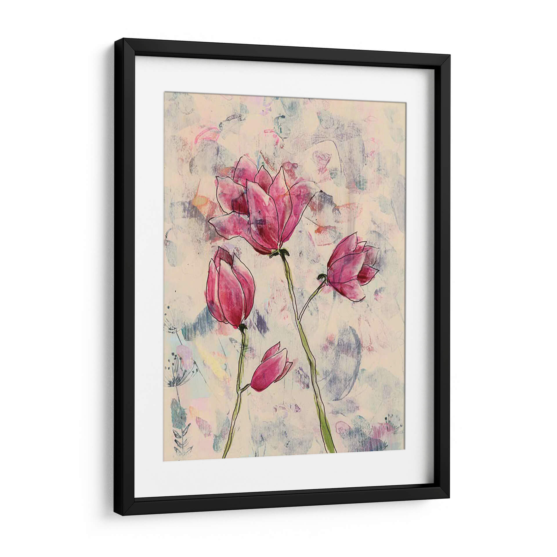 Embellece tu espacio con la delicadeza y el encanto de "Rosa Blume I", una obra de arte floral contemporáneo de Regina Moore. Este cuadro decorativo presenta un trío de flores de magnolia en vibrantes tonos rosados, con trazos de contorno negro que añaden un toque artístico y definido a sus pétalos. El fondo texturizado, una amalgama de tonos pastel, grises suaves y toques de color lavanda y coral, crea una atmósfera etérea y soñadora, evocando la dulzura de la primavera y la serenidad de la naturaleza. La composición, con las flores ascendiendo elegantemente, aporta una sensación de crecimiento y vitalidad. Ideal para infundir calma y belleza en un dormitorio, un rincón de lectura acogedor o como un punto de atención suave en una sala de estar. "Rosa Blume I" es más que una simple decoración; es una invitación a la contemplación y a la apreciación de la belleza efímera de las flores. Su estilo abstracto y delicado la convierte en una pieza versátil, capaz de complementar una amplia gama de estilos decorativos, desde el moderno hasta el bohemio o escandinavo, añadiendo un toque de color y sofisticación sutil. Transforma tu hogar u oficina en un santuario de paz y estilo con esta exquisita representación floral.