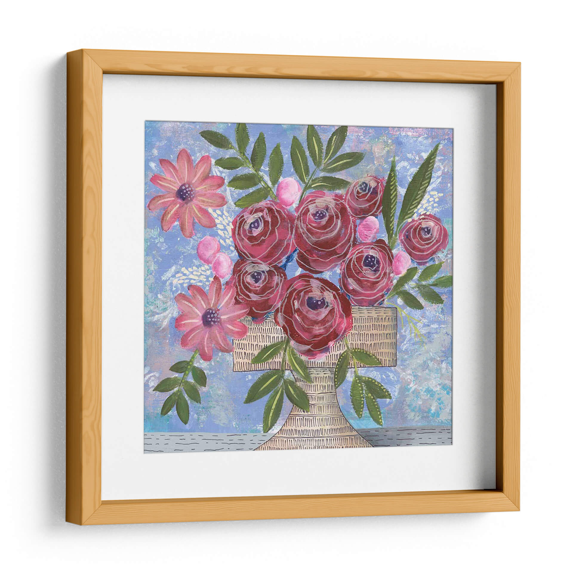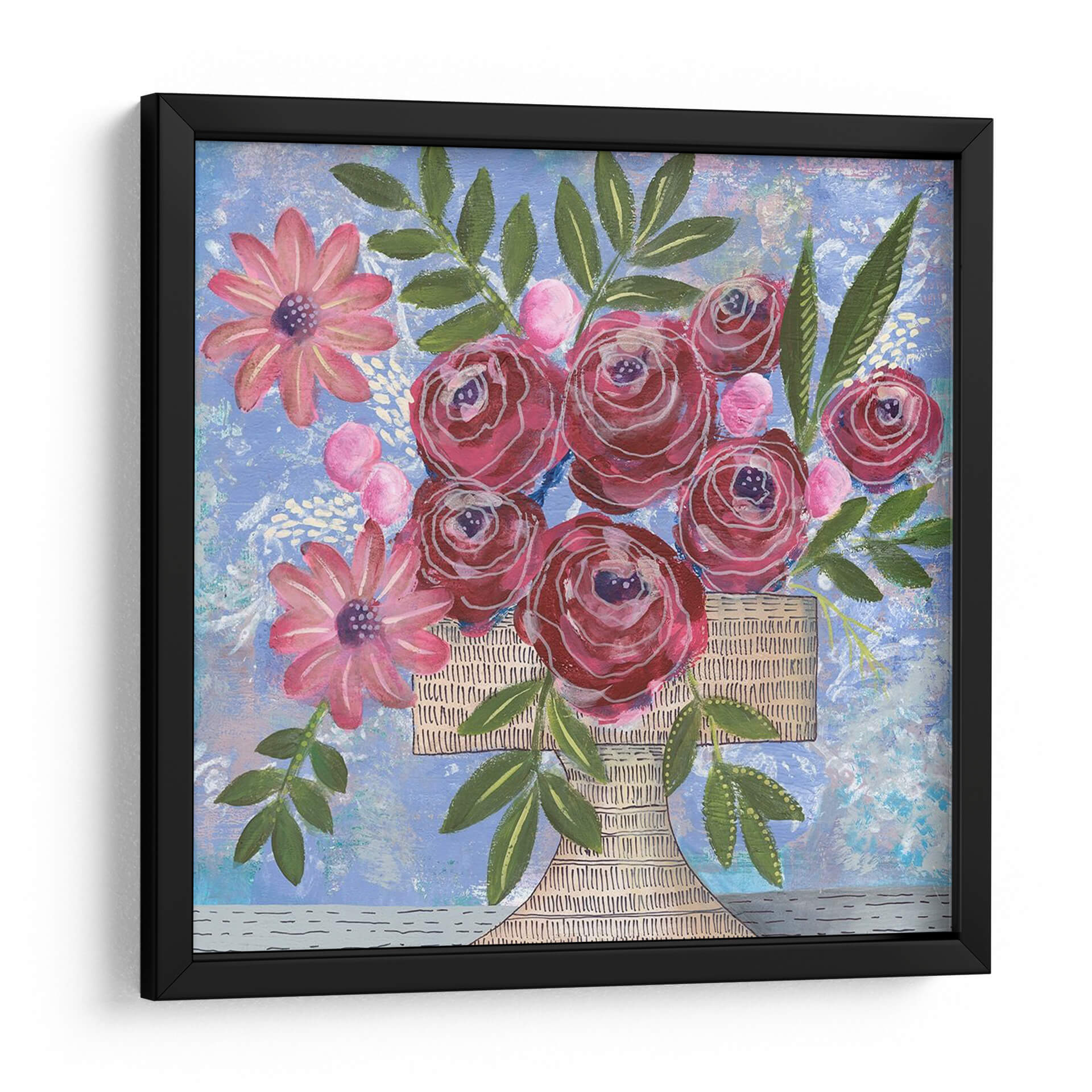 Inyecta vitalidad y un toque de encanto floral en tu espacio con "Rosa Bouquet I", una obra de arte contemporáneo que celebra la belleza de la naturaleza. Regina Moore captura la esencia de un vibrante ramo de rosas en tonos profundos de magenta y carmín, contrastando maravillosamente con delicadas flores rosadas y exuberantes hojas verdes. El fondo texturizado en azul cielo con sutiles toques blancos y grises crea una atmósfera etérea y soñadora, invitando a la contemplación. La composición, centrada en el jarrón de mimbre, se distribuye de manera equilibrada, ofreciendo un punto focal que atrae la mirada sin abrumar. Este cuadro decorativo, con su estilo expresivo y pinceladas audaces, es ideal para añadir un acento de color y alegría a cualquier habitación, desde una sala de estar moderna hasta un dormitorio acogedor o una oficina inspiradora. "Rosa Bouquet I" no es solo una pieza de decoración, sino una invitación a disfrutar de la belleza efímera de las flores y la maestría artística que la captura. Perfecto para quienes buscan arte de pared que combine elegancia, frescura y un toque de optimismo, este cuadro es una adición encantadora a cualquier colección de arte decorativo contemporáneo.
