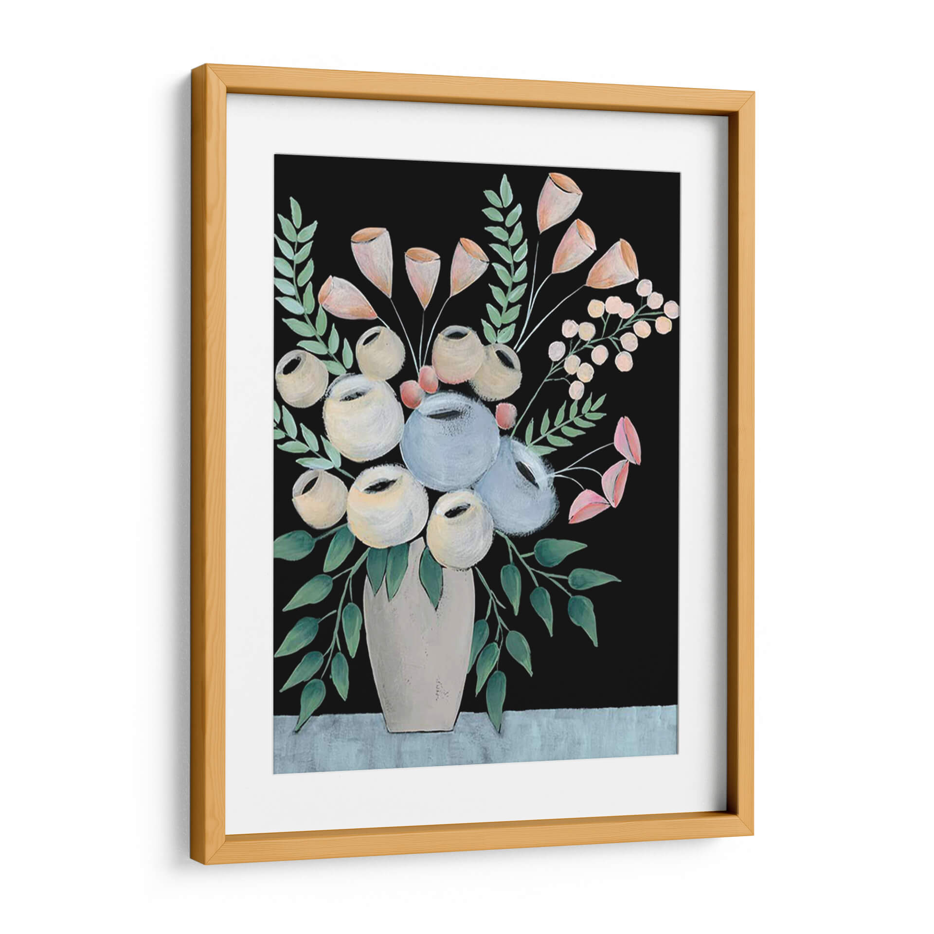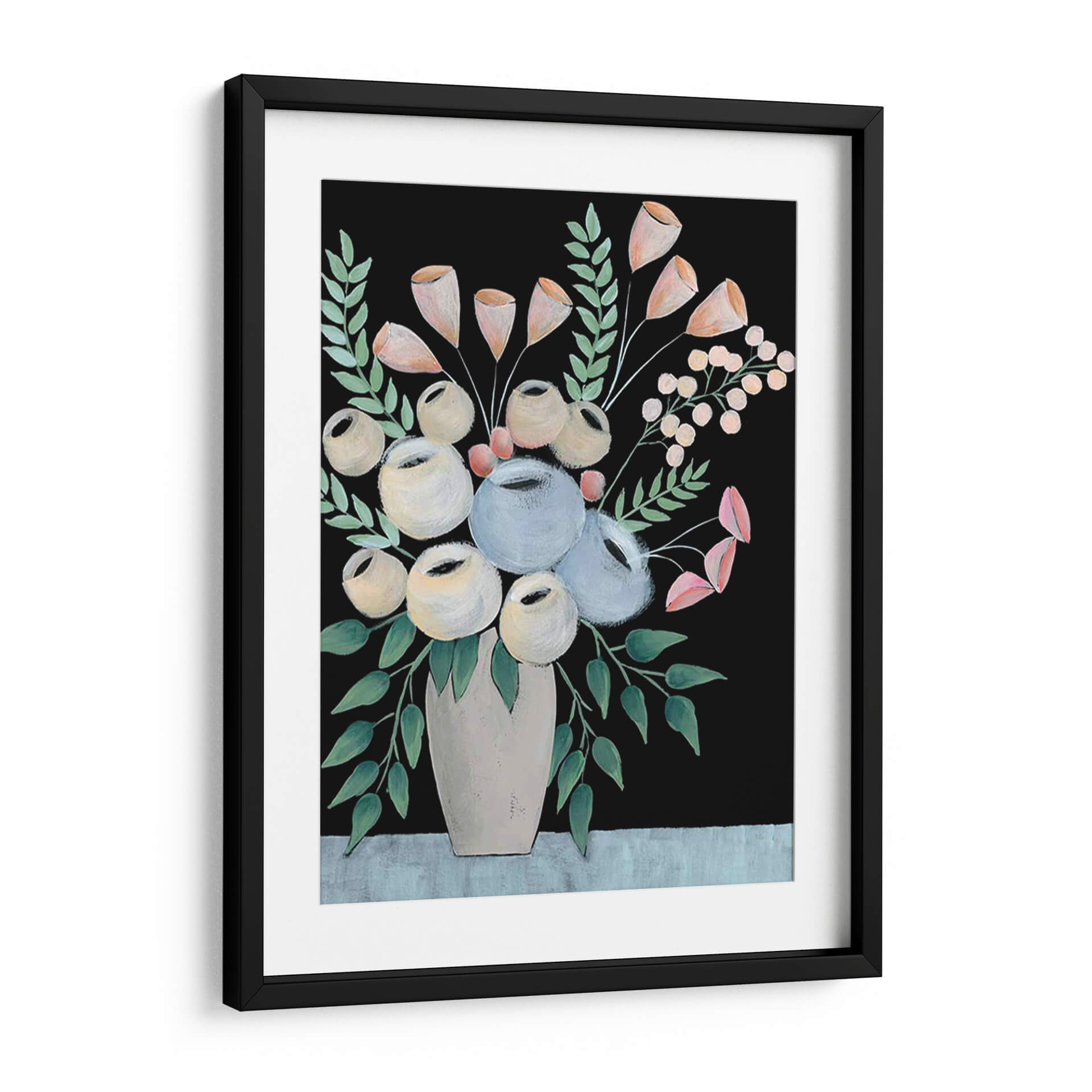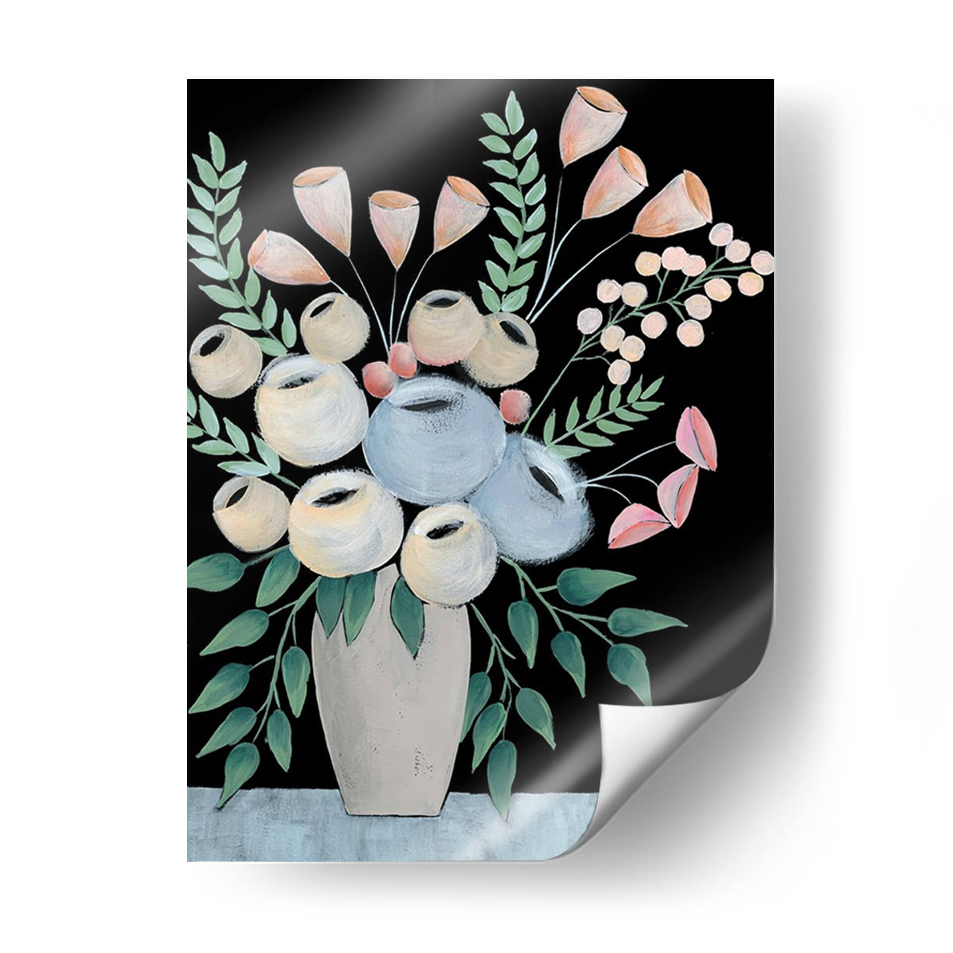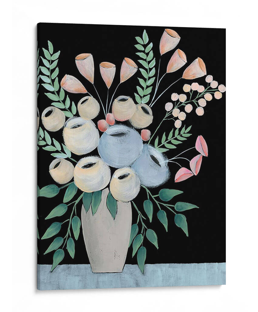 Sumérgete en la serena belleza de "Rosada Floral II" de Regina Moore, una obra de arte que captura la delicadeza de un arreglo floral con un toque contemporáneo y distintivo. Este cuadro decorativo presenta un vibrante contraste entre un fondo negro profundo y una composición de flores y follaje en tonos pastel suaves y neutros. Las flores, representadas con trazos audaces y formas redondeadas, evocan una sensación de calma y elegancia, mientras que las hojas verde azulado añaden un toque de frescura natural. El jarrón, de un tono beige suave, ancla la composición y aporta una base terrenal a la explosión floral. El estilo pictórico, con pinceladas visibles, le confiere una textura y profundidad que invitan a la contemplación. "Rosada Floral II" es ideal para espacios que buscan un punto focal sofisticado y tranquilizador, aportando un aire de refinamiento moderno a salones, dormitorios o estudios. Su paleta de colores versátil permite integrarla fácilmente en diversas decoraciones, desde ambientes minimalistas hasta espacios más eclécticos, convirtiéndose en una pieza central que inspira paz y admiración.