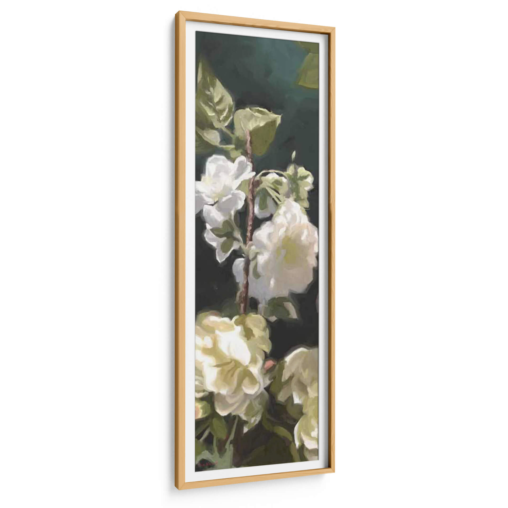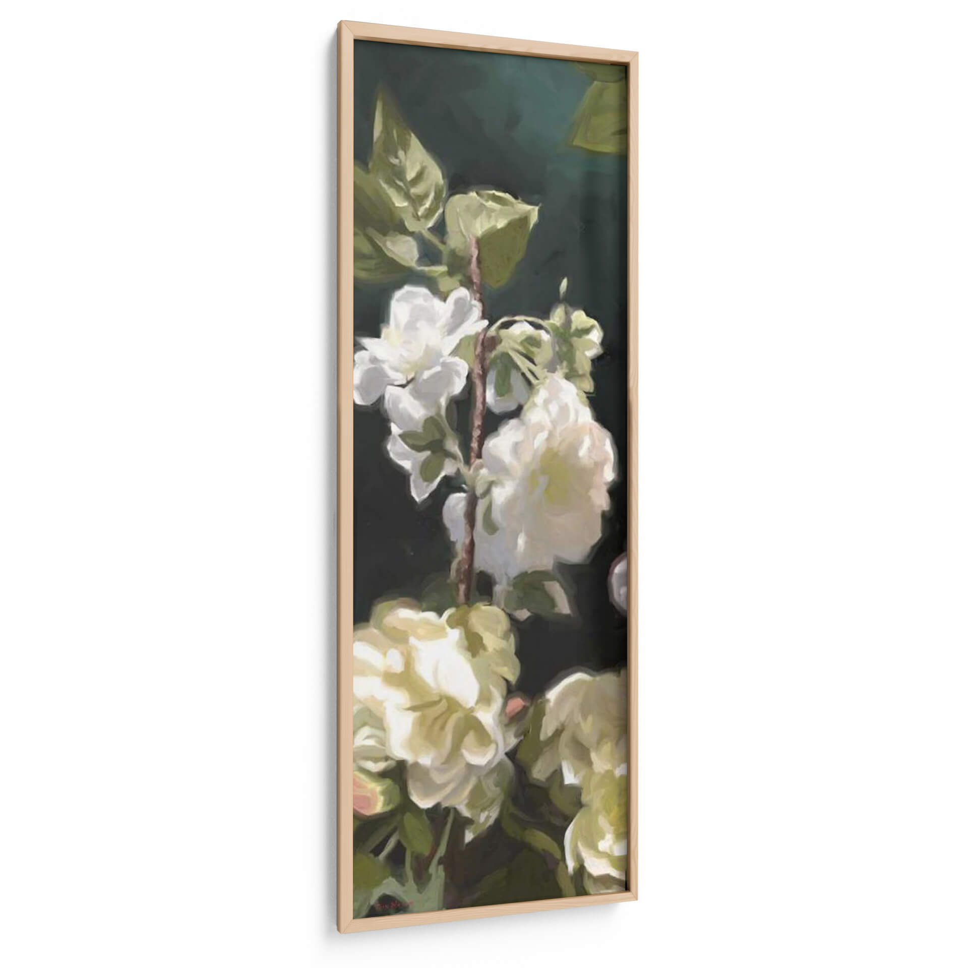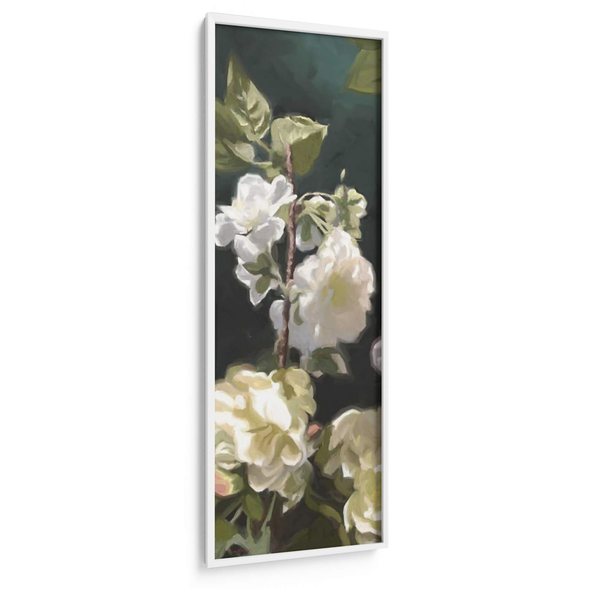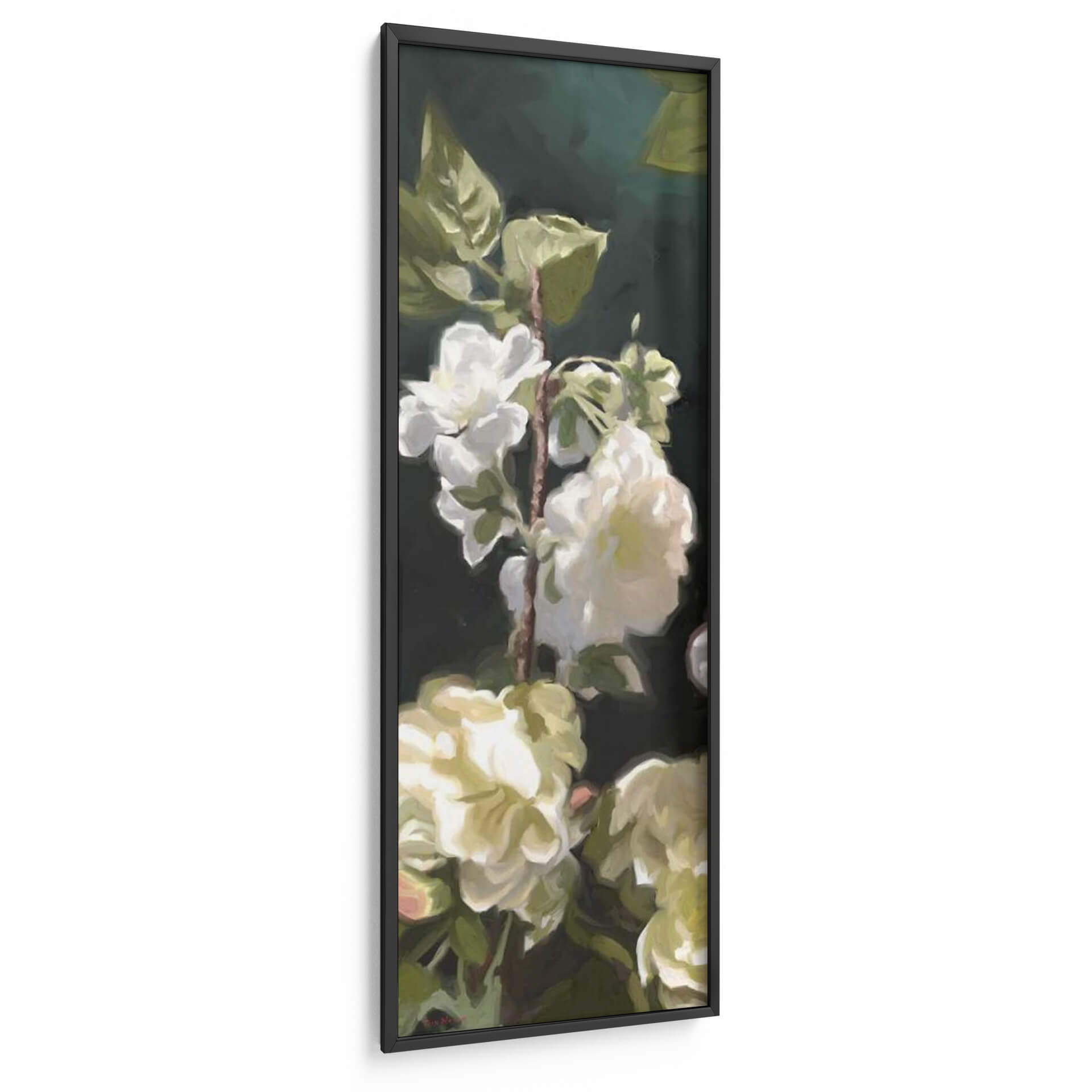 Sumérgete en la delicadeza y elegancia de "Rosas Blancas Iv", una obra de arte del artista Rick Novak que captura la esencia pura de estas flores en un formato vertical cautivador. La pieza se centra en un ramo de rosas blancas, cuyas pétalos se despliegan con una suavidad sedosa, contrastando bellamente con un fondo oscuro y profundo que acentúa su luminosidad. La técnica pictórica, con pinceladas expresivas y un manejo magistral de la luz, dota a las flores de una textura casi tangible y una vitalidad sorprendente. Los tonos verdes y ocres de las hojas y los tallos añaden profundidad y realismo, mientras que los sutiles toques rosados en algunos pétalos introducen una nota de calidez y sutileza. Este cuadro decorativo vertical es una invitación a la serenidad y la belleza natural, ideal para espacios que buscan un toque de sofisticación y calma. Su composición vertical lo hace perfecto para pasillos, paredes estrechas o para crear un punto focal elegante en un dormitorio, sala de estar o estudio. "Rosas Blancas Iv" no es solo una imagen, es una experiencia sensorial que aporta frescura y un aire de refinamiento atemporal a tu decoración.