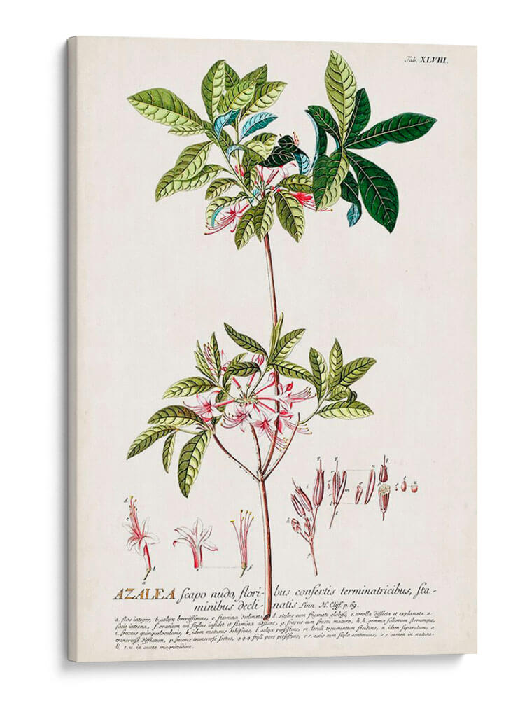 Descubre la delicadeza botánica con nuestro cuadro decorativo "Seductor Botamical Iv". Esta exquisita obra de arte reproduce con gran detalle una planta de azalea, capturando la elegancia natural de sus flores rosadas y sus exuberantes hojas verdes. La composición, inspirada en ilustraciones científicas clásicas, presenta un estudio minucioso de la flor, sus partes y su follaje, aportando un toque de historia natural y sofisticación a cualquier espacio. Los tonos verdes profundos y los sutiles toques de rosa crean una atmósfera de serenidad y refinamiento, ideal para salones, estudios o dormitorios donde se busca añadir un elemento orgánico y visualmente atractivo. La técnica de ilustración detallada y la paleta de colores cuidadosamente seleccionada hacen de esta pieza una adición perfecta para los amantes de la botánica y el arte clásico, aportando un aire de distinción y calma. Transforma tu hogar u oficina en un santuario de belleza natural con este cuadro decorativo, una ventana a la complejidad y encanto del mundo vegetal, diseñado para inspirar contemplación y aprecio por la naturaleza en su máxima expresión artística.