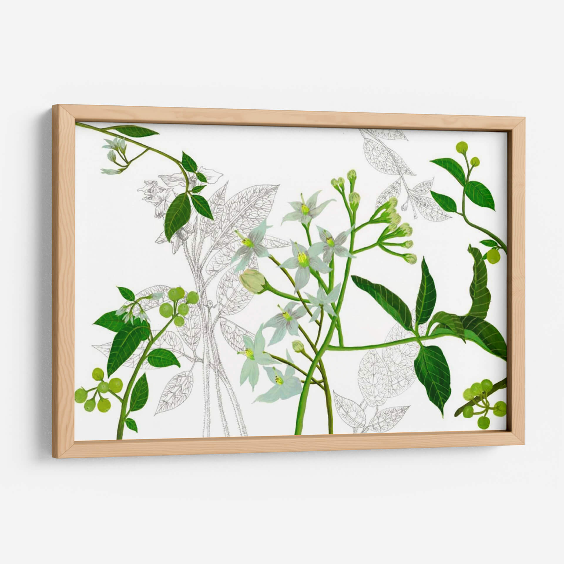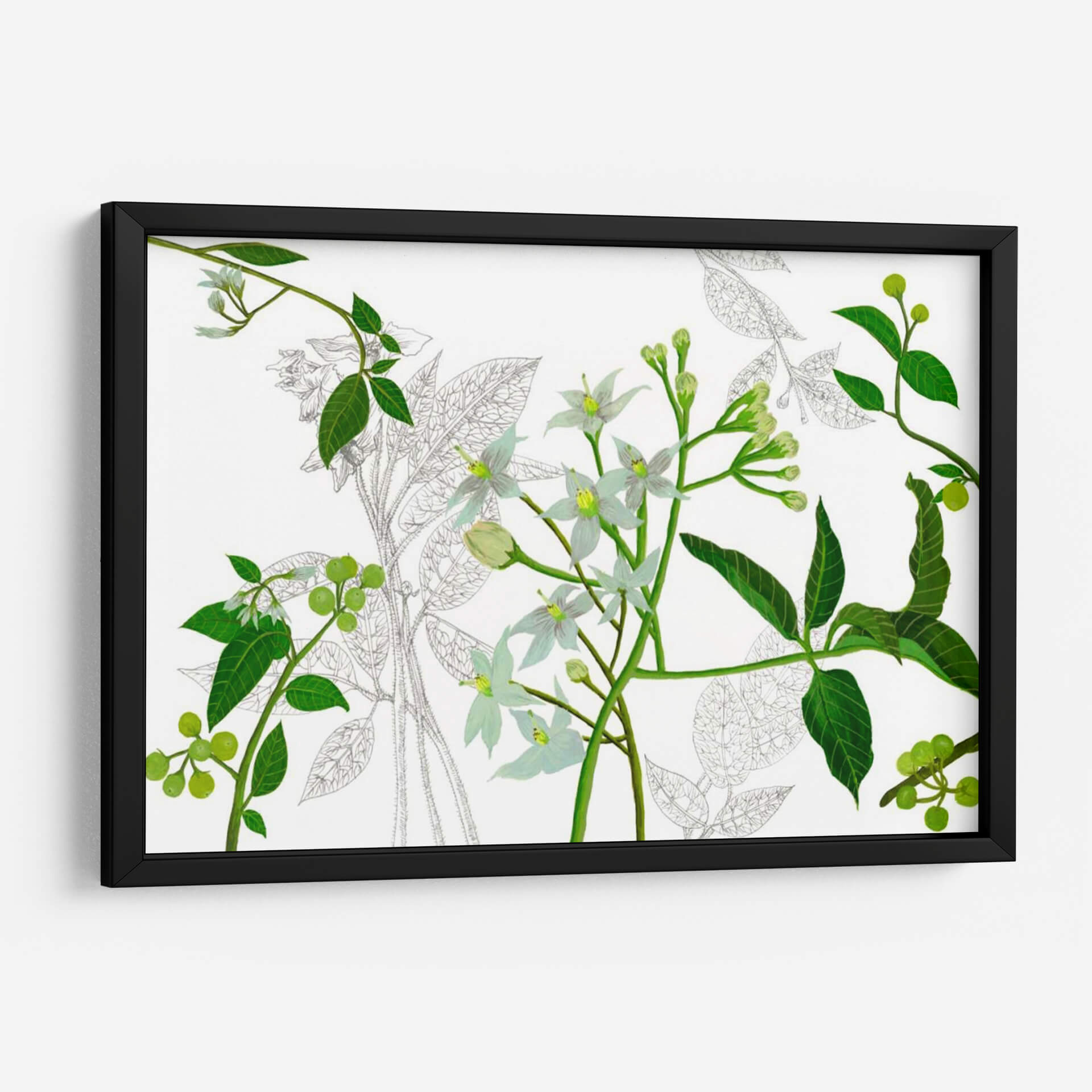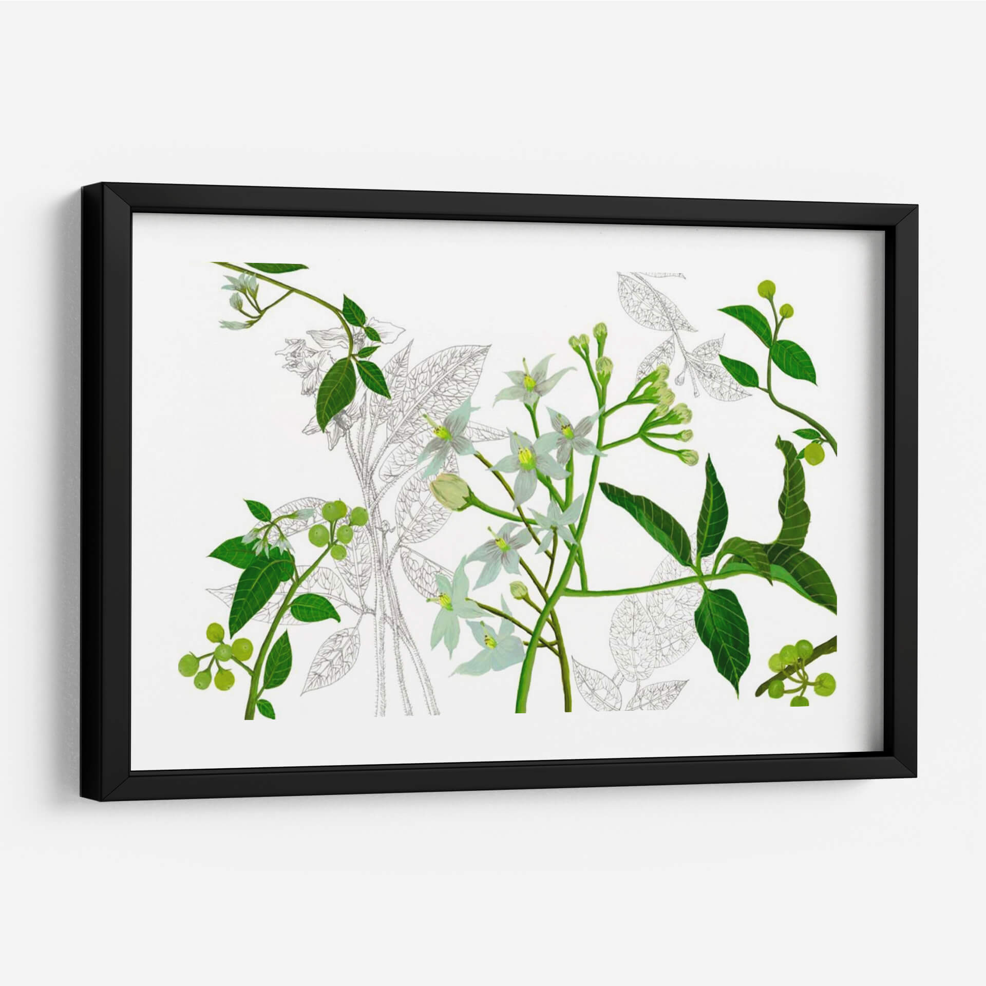 Sumérgete en la delicadeza botánica con "Solanum I", una obra de arte que captura la esencia efímera de la naturaleza. Melissa Wang nos presenta una composición exquisita donde las flores de solanum, representadas con sutiles tonos celestes y detalles en amarillo vibrante, parecen flotar sobre un fondo etéreo. Las hojas de un verde intenso y las pequeñas bayas verdes añaden profundidad y realismo a esta pieza, mientras que los bocetos a lápiz de follaje en segundo plano crean un contraste intrigante entre lo definido y lo etéreo, lo pintado y lo dibujado. Este cuadro decorativo es una invitación a la contemplación, ideal para infundir serenidad y un toque de frescura natural a cualquier espacio. Perfecto para salones, dormitorios o estudios que buscan una conexión con la tranquilidad del mundo natural y aprecian el arte botánico contemporáneo. "Solanum I" no es solo una decoración, es una ventana a la belleza detallada y a menudo pasada por alto de la flora, aportando un aire de sofisticación orgánica a tu hogar u oficina.