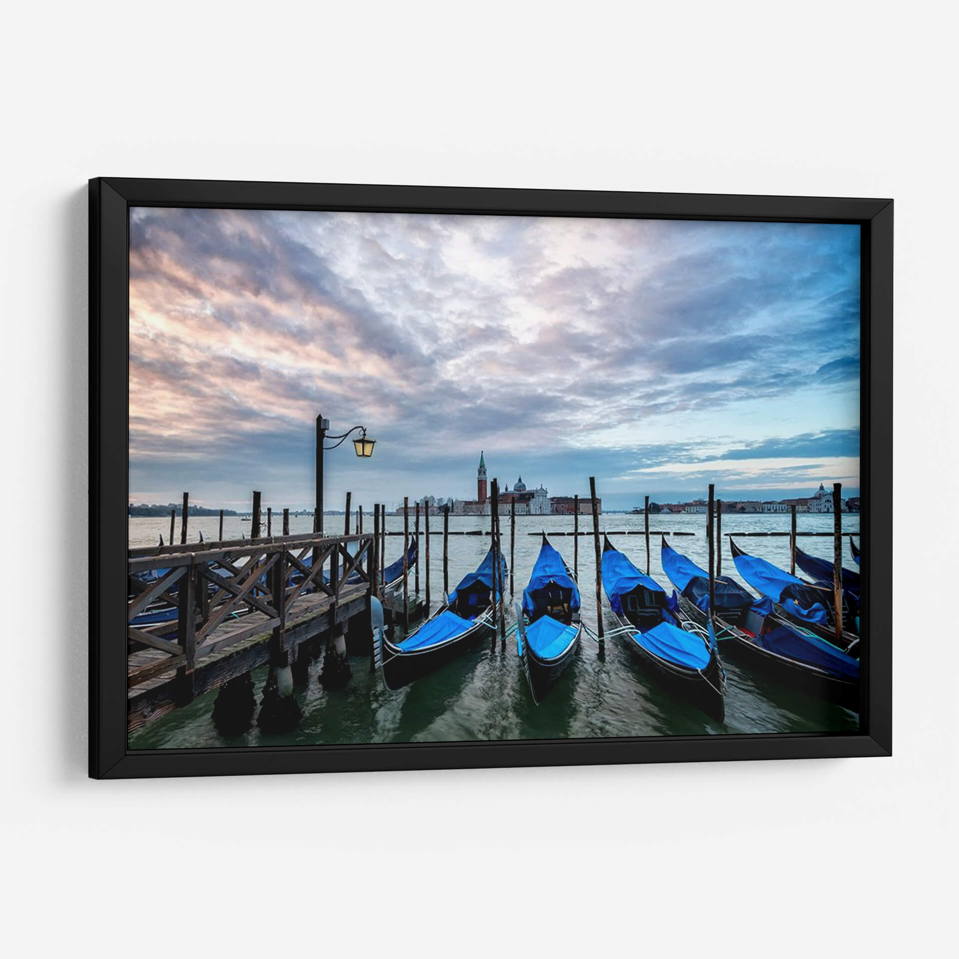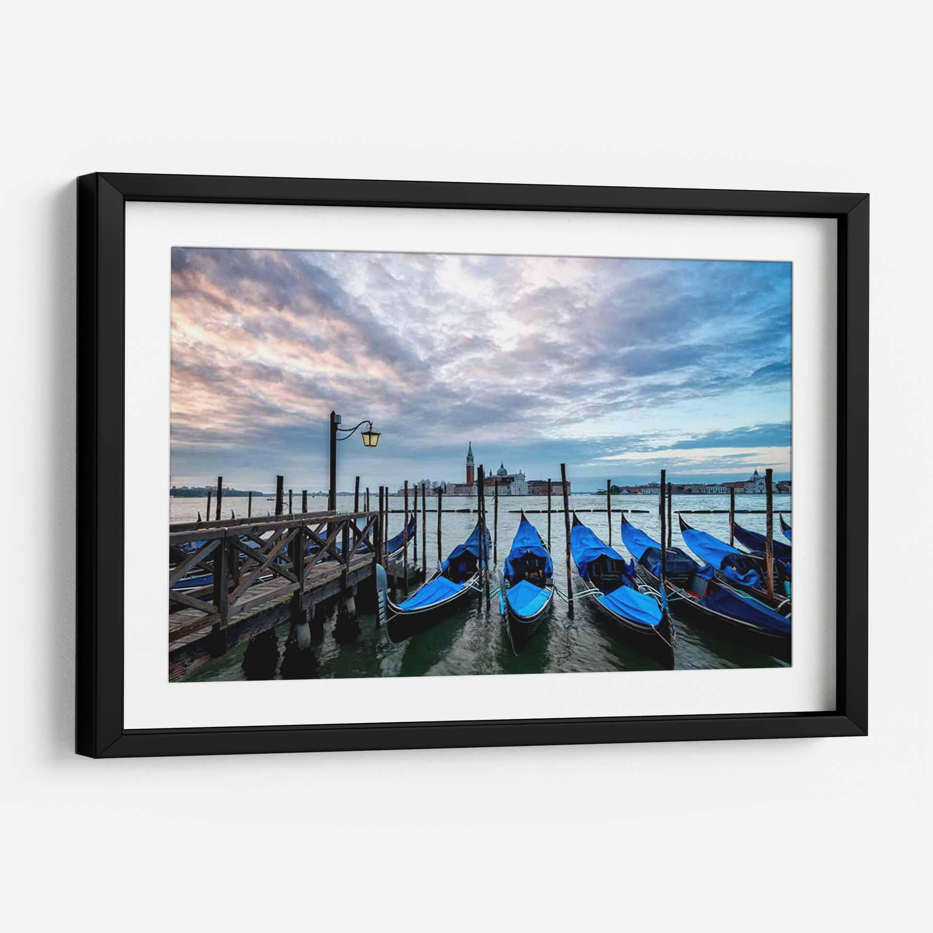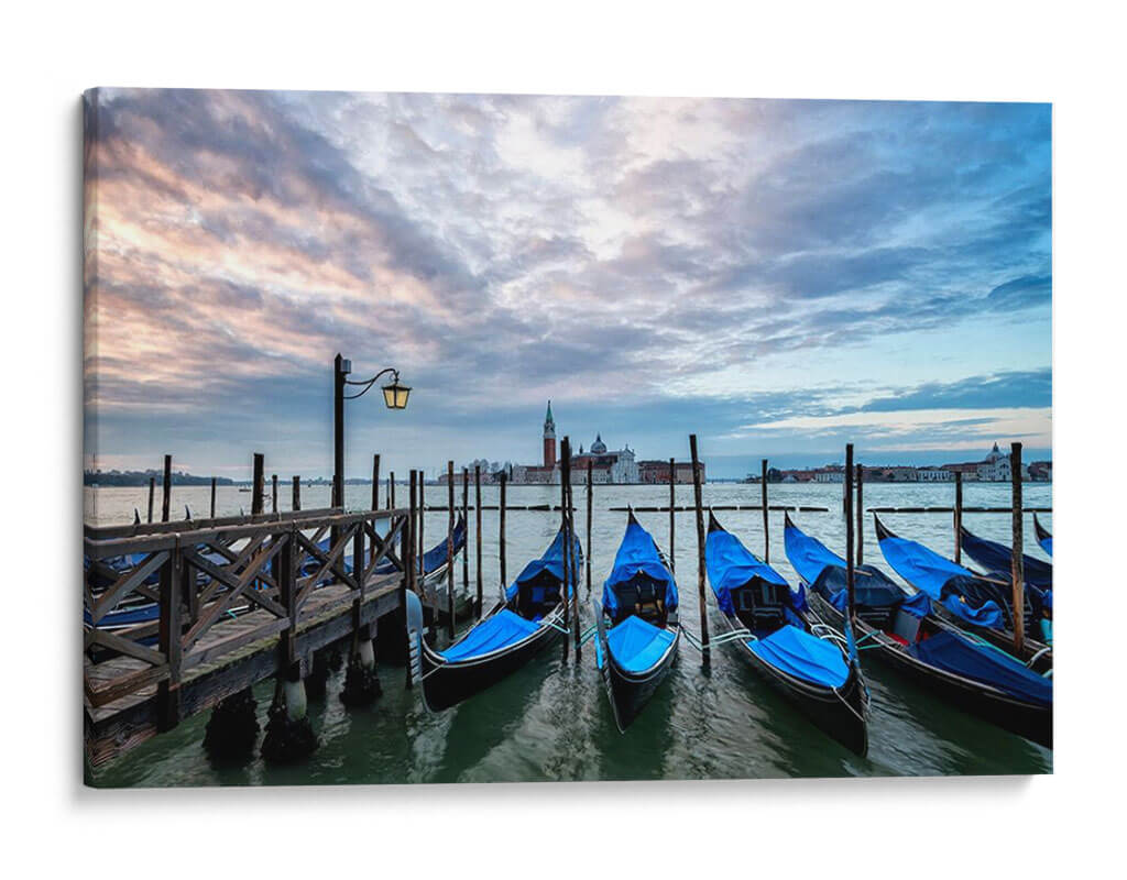 Sumérgete en la serena belleza de 'Solo Esperando II', una obra de arte que captura la esencia de Venecia al amanecer. Este cuadro decorativo presenta una hilera de góndolas tradicionales, cubiertas con telas azules vibrantes, meciéndose suavemente en las tranquilas aguas del canal. Al fondo, la icónica silueta de la ciudad se alza contra un cielo que transita del suave rosa y naranja del amanecer a un azul profundo y sereno. La composición, con el muelle de madera a la izquierda y la perspectiva hacia la distancia, invita a la contemplación y la calma. La iluminación tenue y las nubes dramáticas crean una atmósfera de misterio y anticipación, perfecta para añadir un toque de sofisticación y tranquilidad a cualquier hogar u oficina. Ideal para amantes de los viajes, la fotografía y el arte urbano, esta pieza evoca la magia de Venecia y la promesa de un nuevo día. Añade un toque de elegancia atemporal a tus espacios con este evocador cuadro de paisajes.