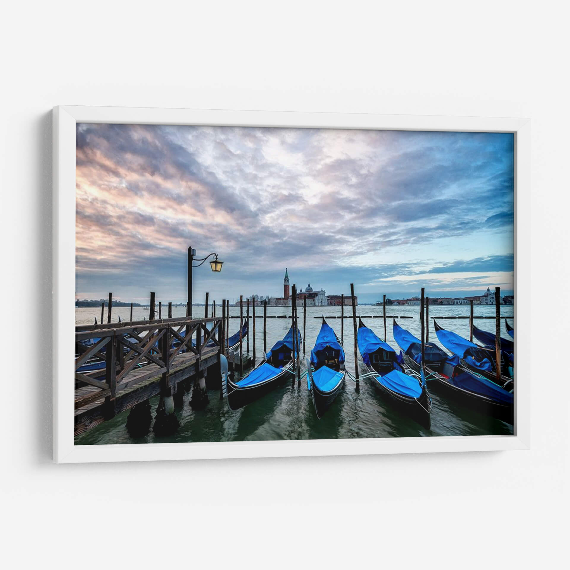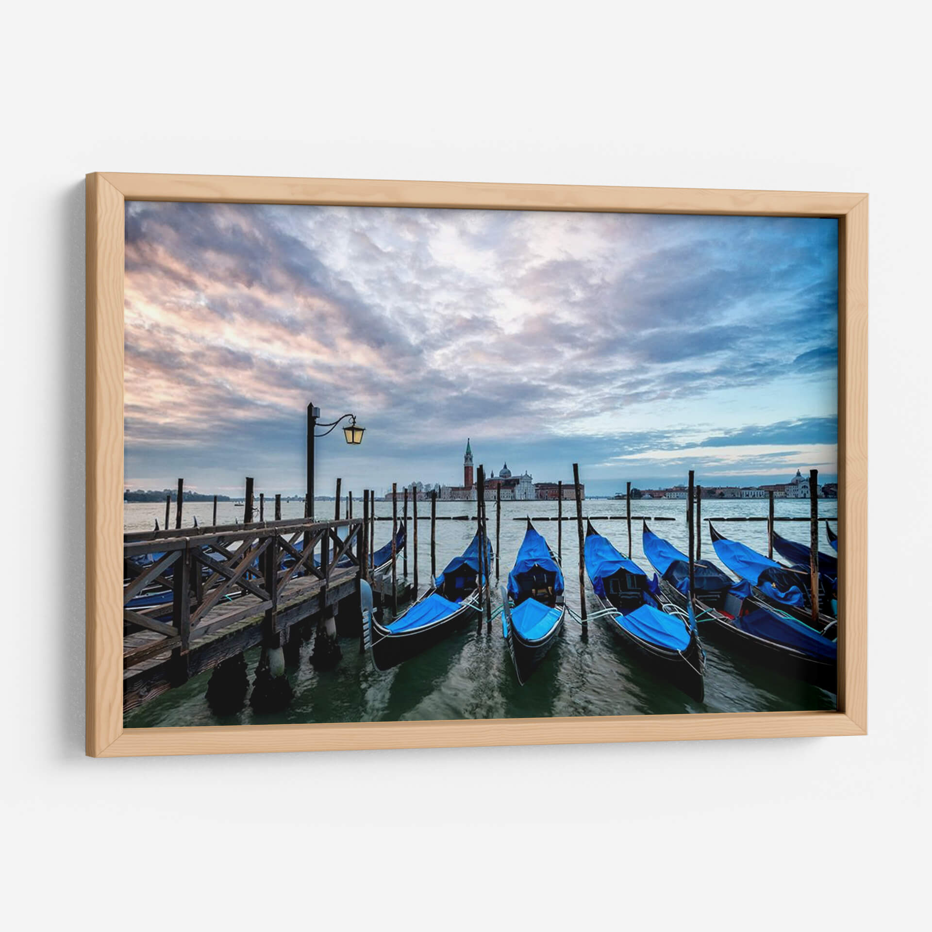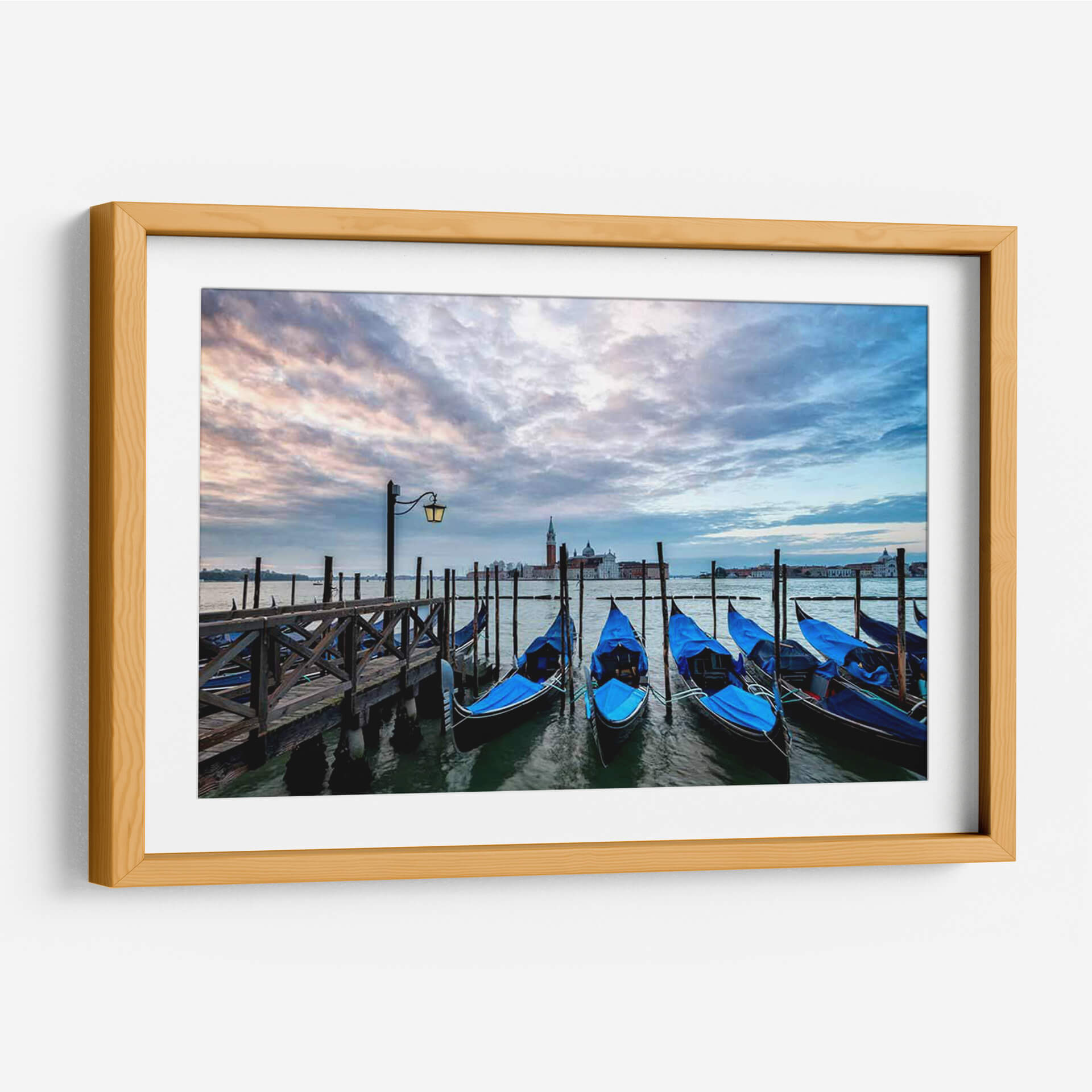 Sumérgete en la serena belleza de 'Solo Esperando II', una obra de arte que captura la esencia de Venecia al amanecer. Este cuadro decorativo presenta una hilera de góndolas tradicionales, cubiertas con telas azules vibrantes, meciéndose suavemente en las tranquilas aguas del canal. Al fondo, la icónica silueta de la ciudad se alza contra un cielo que transita del suave rosa y naranja del amanecer a un azul profundo y sereno. La composición, con el muelle de madera a la izquierda y la perspectiva hacia la distancia, invita a la contemplación y la calma. La iluminación tenue y las nubes dramáticas crean una atmósfera de misterio y anticipación, perfecta para añadir un toque de sofisticación y tranquilidad a cualquier hogar u oficina. Ideal para amantes de los viajes, la fotografía y el arte urbano, esta pieza evoca la magia de Venecia y la promesa de un nuevo día. Añade un toque de elegancia atemporal a tus espacios con este evocador cuadro de paisajes.