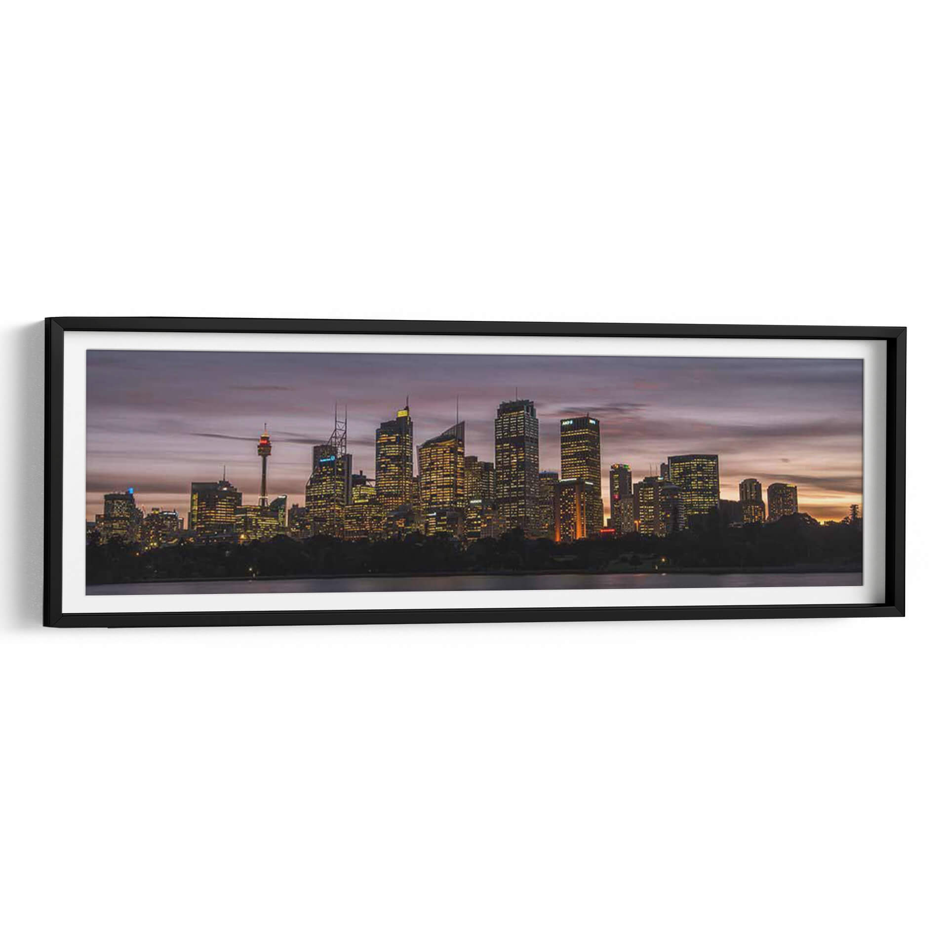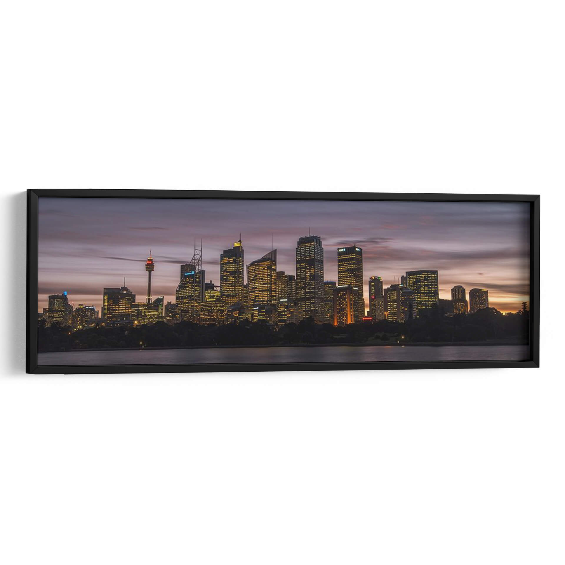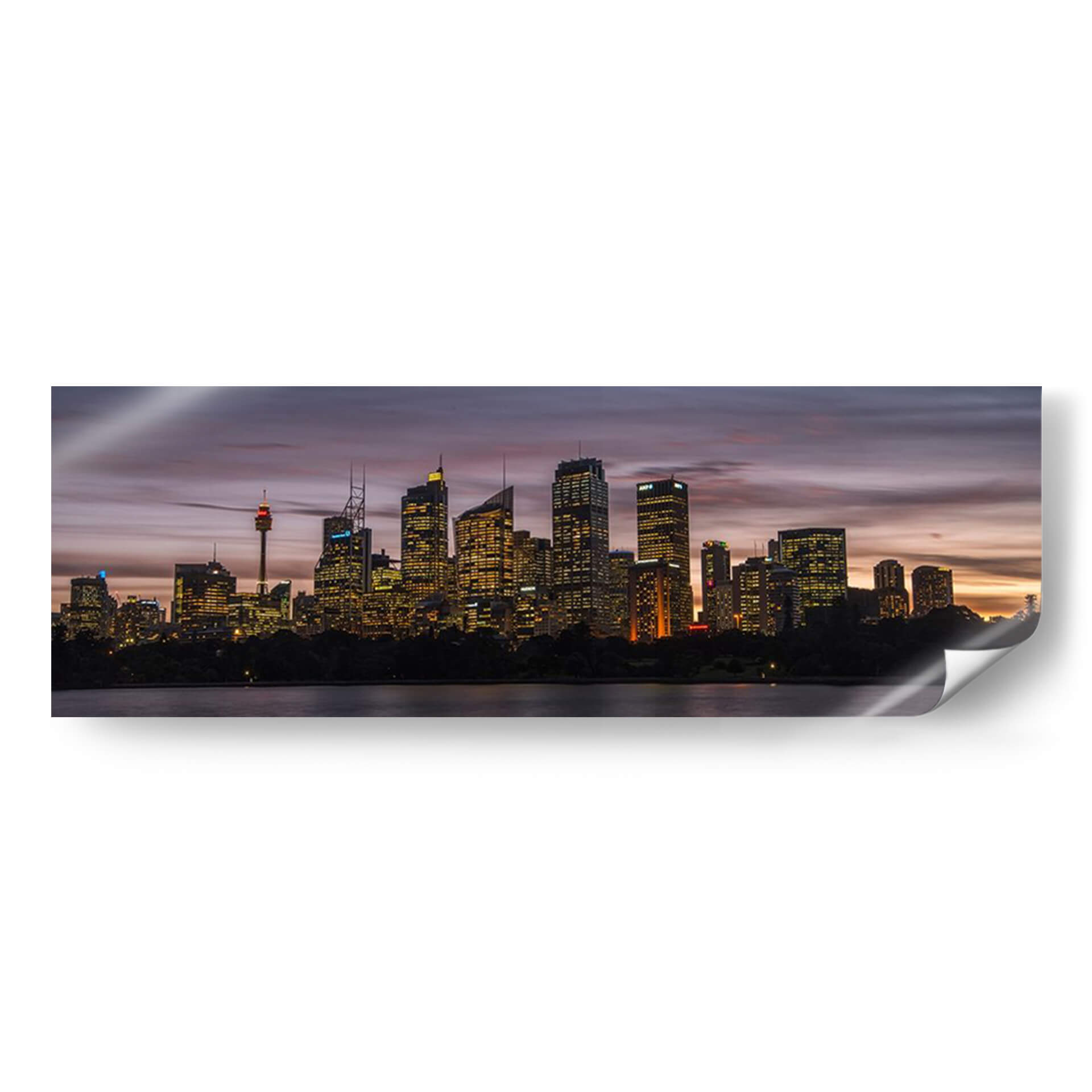 Captura la esencia vibrante de una metrópoli con este impresionante cuadro decorativo de Sydney al atardecer. La obra maestra, titulada 'Sydney Skyline' del artista Danny Head, te transporta al corazón de la ciudad con su espectacular vista panorámica. Los rascacielos iluminados emergen de la oscuridad, creando un contraste cautivador contra el cielo crepuscular teñido de tonos púrpuras y anaranjados. La paleta de colores, dominada por luces cálidas y doradas que brillan desde las ventanas de los edificios, evoca una sensación de energía y sofisticación urbana. La silueta oscura de los árboles y el agua serena en primer plano añaden profundidad y un toque de tranquilidad a la escena, equilibrando la magnificencia de la arquitectura moderna. Este cuadro decorativo es perfecto para infundir vida y estilo en cualquier espacio, ya sea tu sala de estar, oficina o dormitorio. Ideal para quienes aprecian la fotografía urbana, las vistas panorámicas y el arte que celebra la arquitectura y la vitalidad de las grandes ciudades. Añade un toque de elegancia cosmopolita a tu hogar con esta representación artística de Sydney.