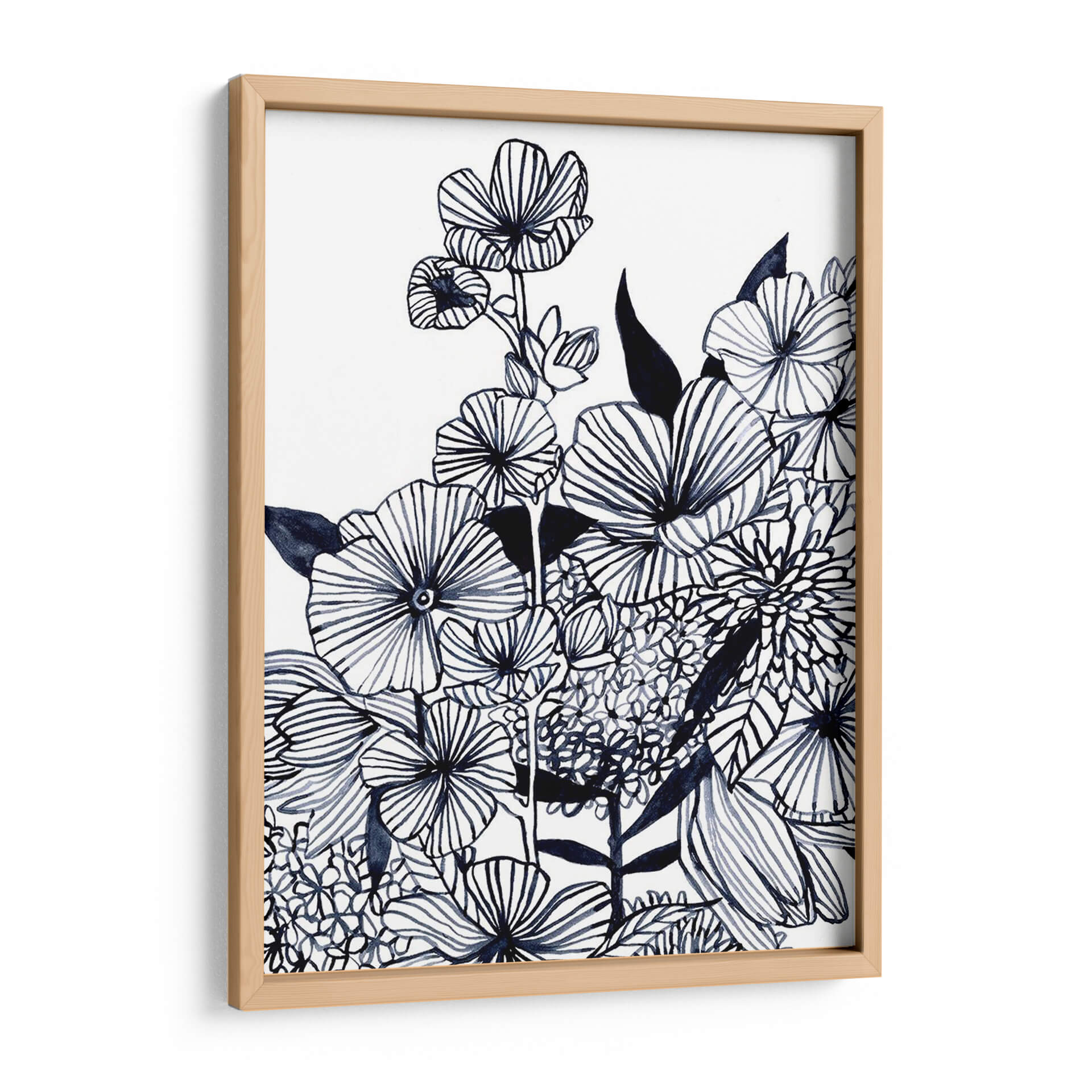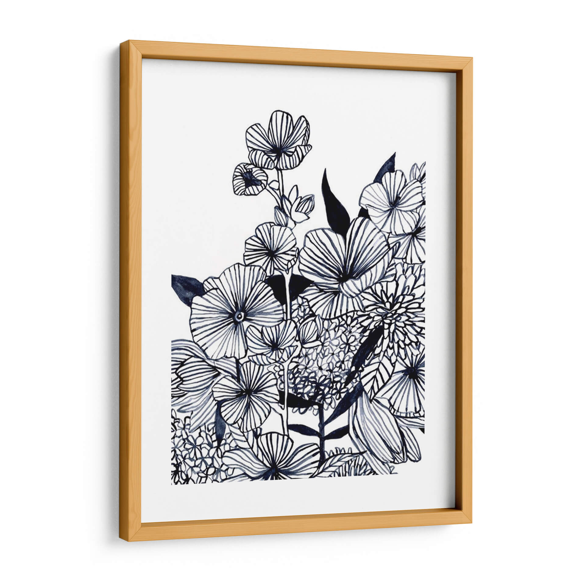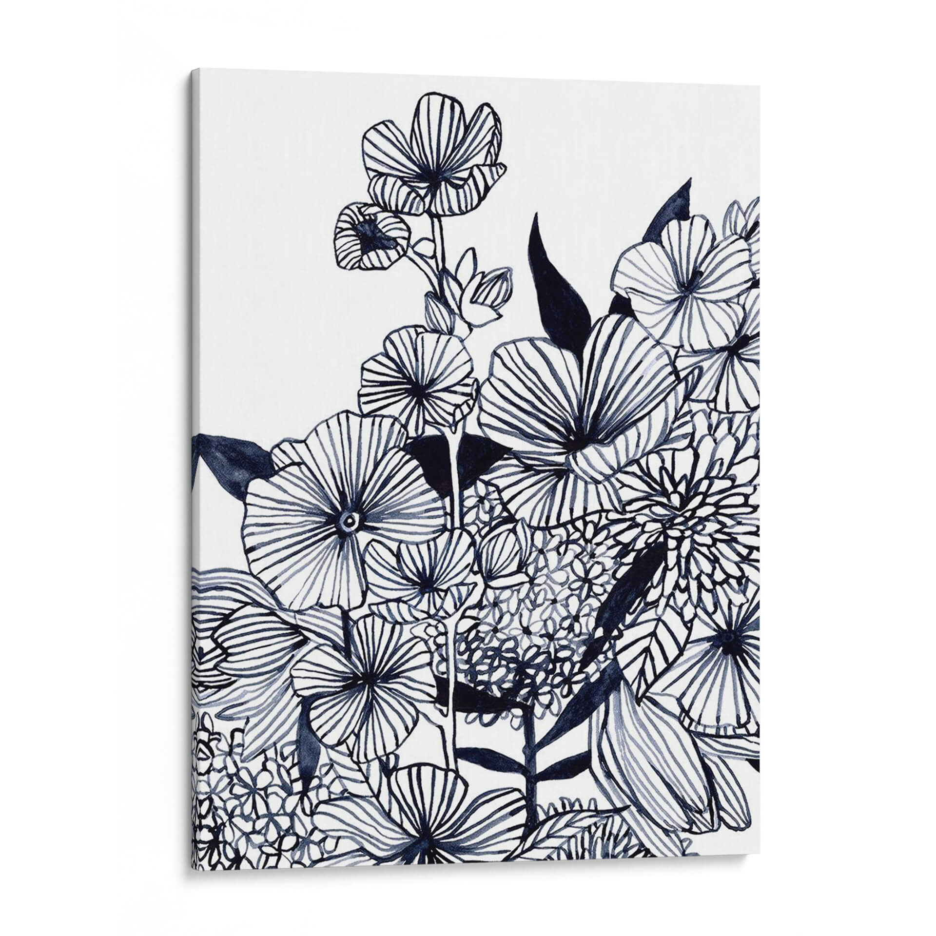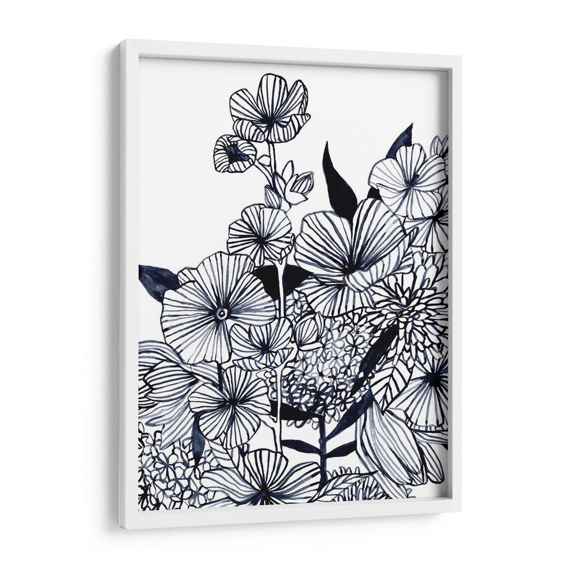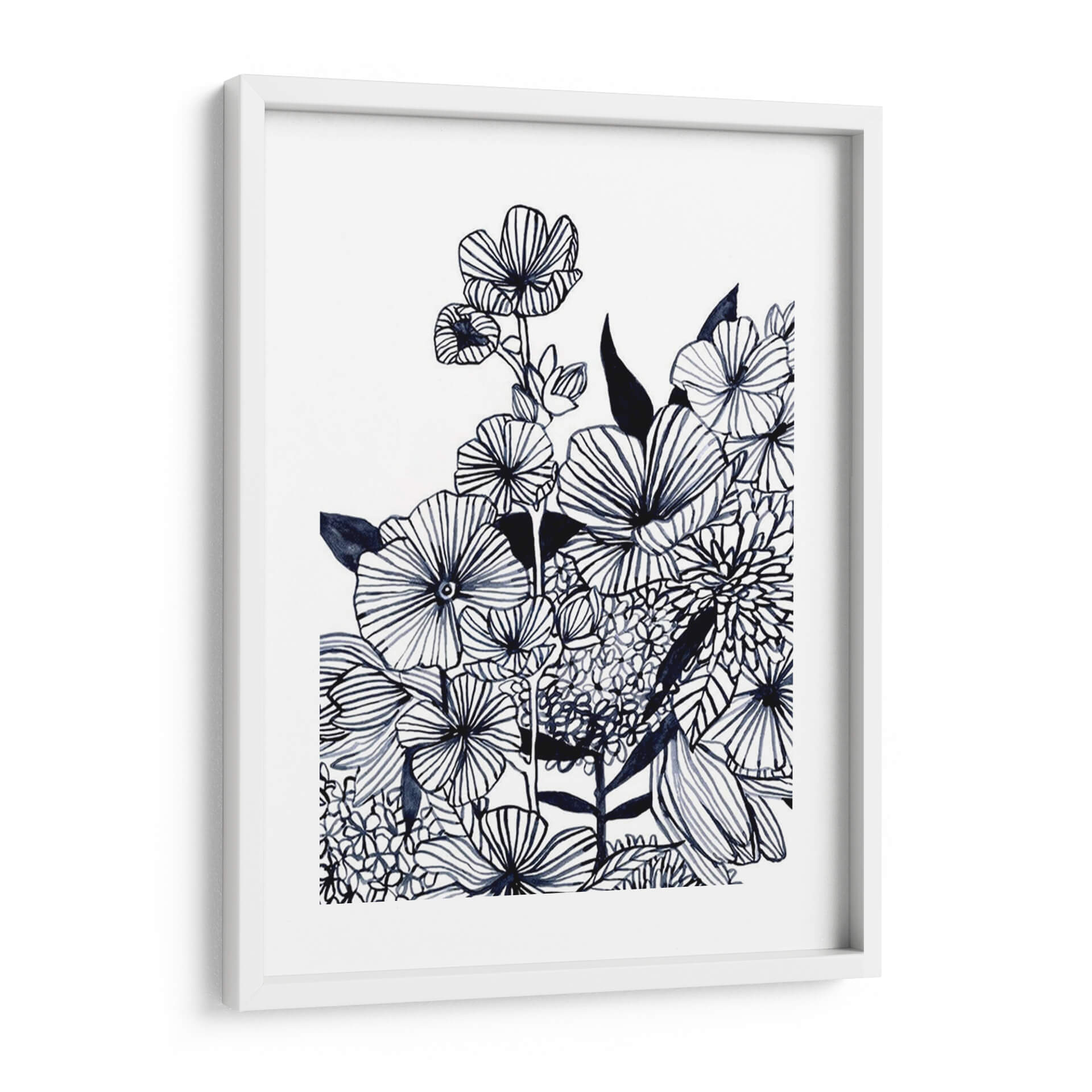 Sumérgete en la delicadeza botánica con 'Tangla De Flores Silvestres Iii', una obra de arte contemporáneo de Emma Scarvey. Esta pieza cautiva con su exquisito dibujo lineal en tonos índigo sobre un fondo nítido y limpio, evocando la frescura de un jardín al amanecer. Las flores, representadas con trazos audaces y detallados, parecen bailar en una composición dinámica que captura la vitalidad de la naturaleza. Cada pétalo y hoja está cuidadosamente delineado, creando texturas visuales que invitan a la contemplación. El estilo artístico, que fusiona la precisión del dibujo botánico con la libertad expresiva del trazo contemporáneo, dota a la obra de una profundidad y un carácter únicos. Ideal para espacios que buscan un toque de elegancia serena y un guiño al mundo natural, este cuadro decorativo es perfecto para salas de estar, dormitorios o estudios, aportando una atmósfera de calma y sofisticación. Su paleta monocromática la convierte en una pieza versátil, capaz de complementar una amplia gama de estilos decorativos, desde el minimalista hasta el bohemio. Añade un toque de arte inspirador y atemporal a tu hogar con esta representación única de la belleza floral.