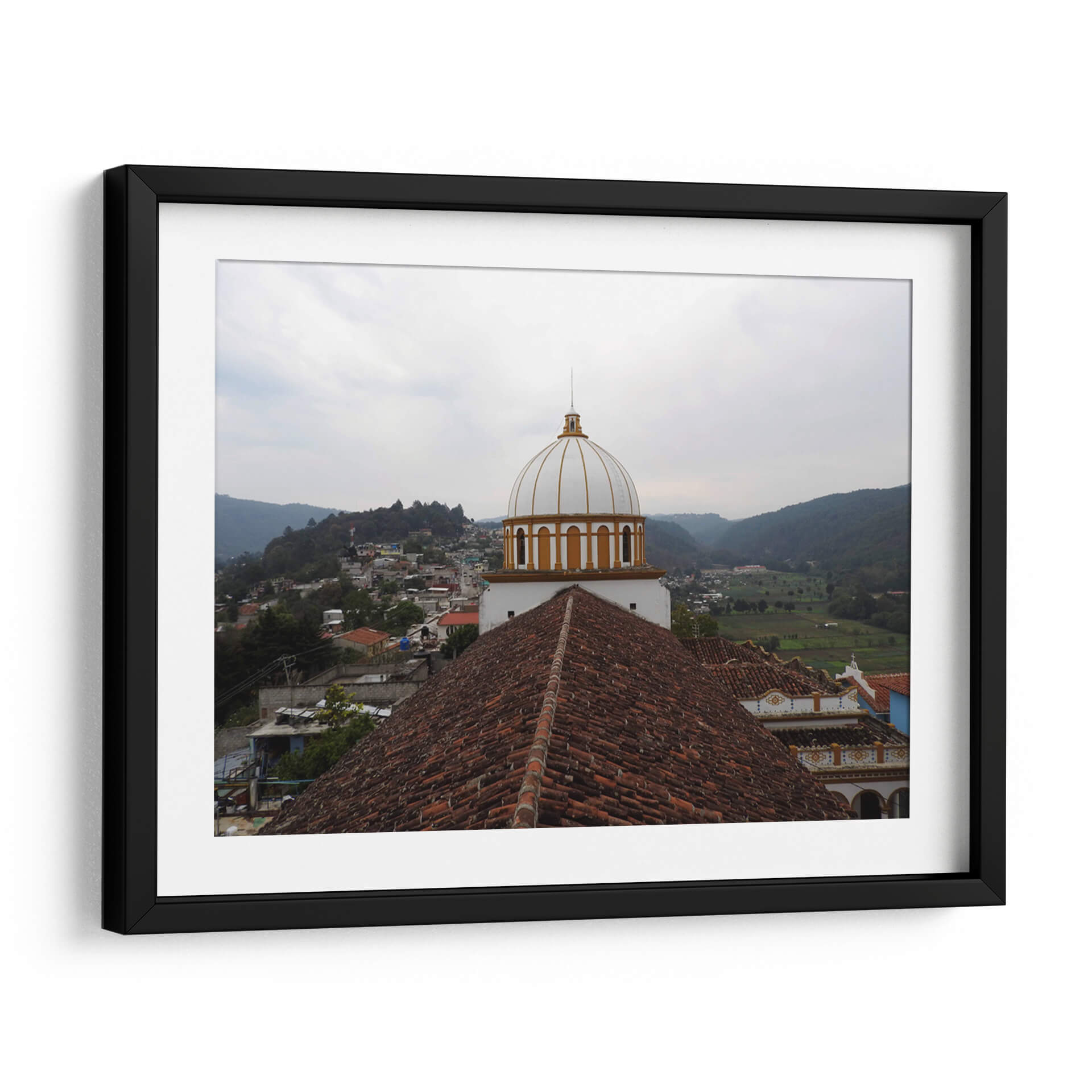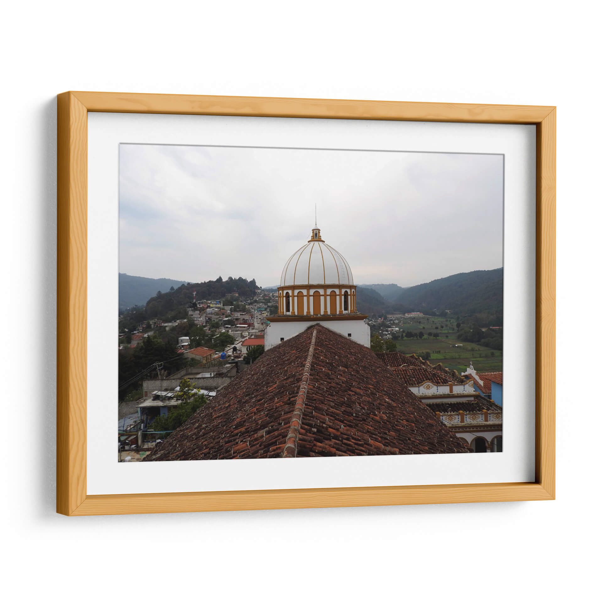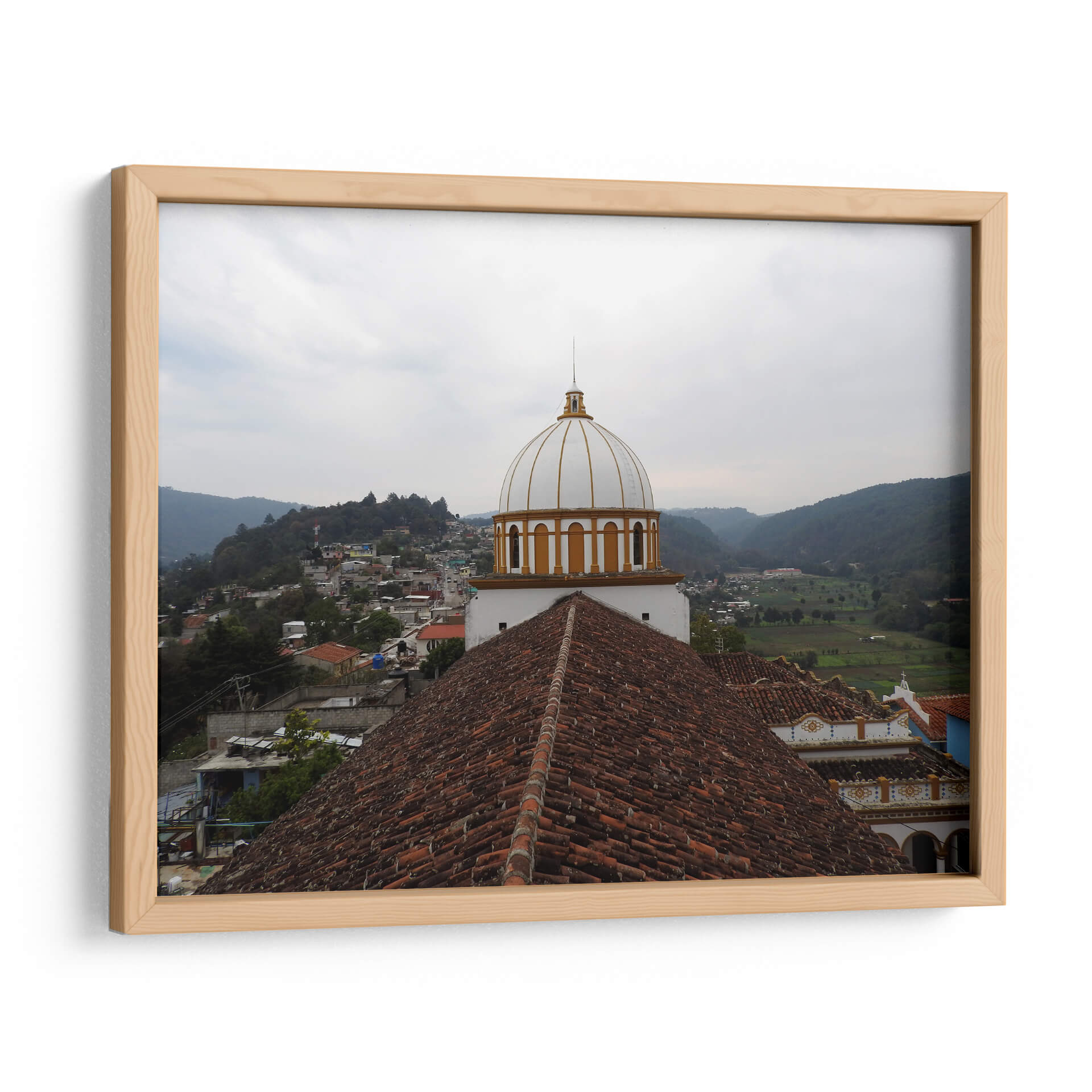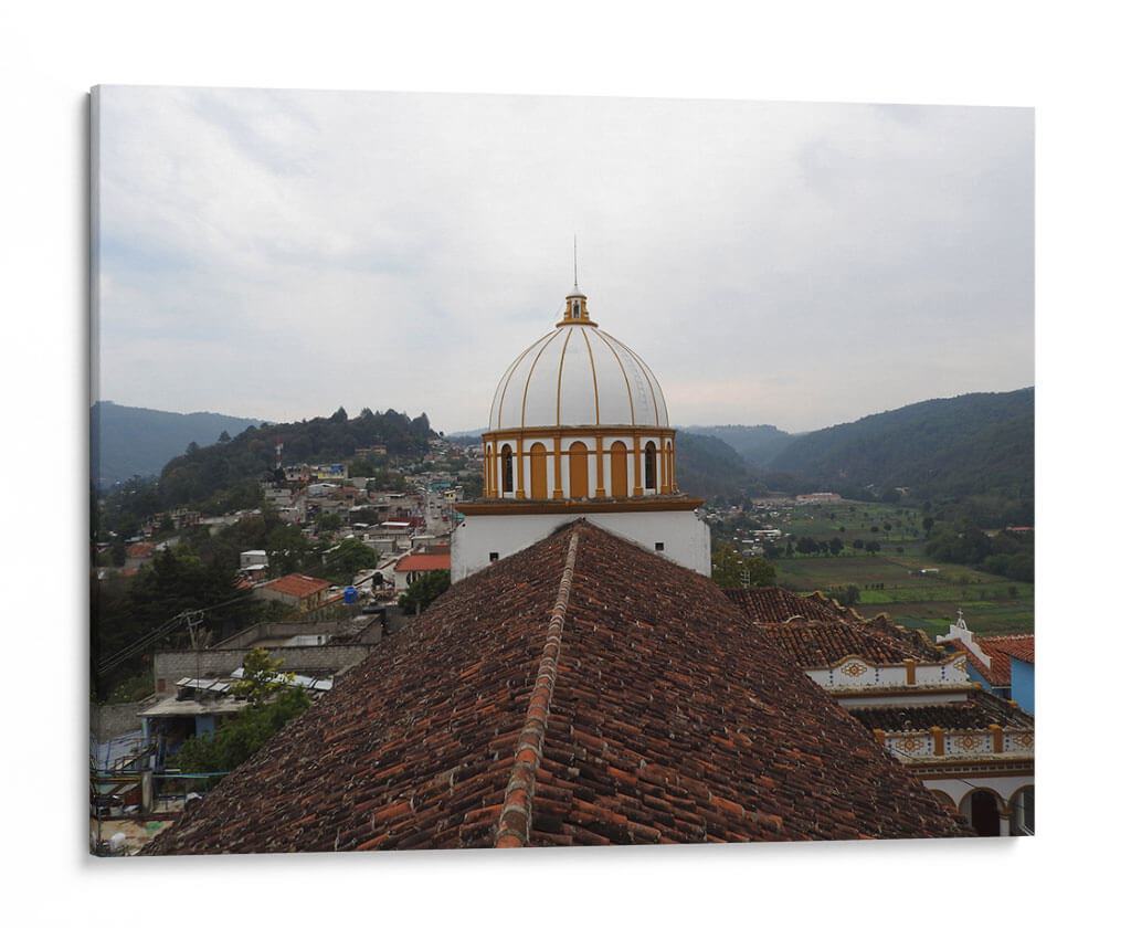 Captura la esencia de un pintoresco pueblo mexicano con este cautivador cuadro decorativo "Tejas" de Hugo Segura. La obra presenta una vista panorámica de un asentamiento tradicional, dominado por la arquitectura icónica de una iglesia con una cúpula blanca y detalles dorados, que se alza majestuosamente sobre un mar de tejados de barro de tonos terracota. El paisaje se extiende hacia colinas verdes y un cielo nublado, creando una atmósfera serena y contemplativa. La paleta de colores, dominada por los tonos tierra de los tejados, el blanco y oro de la cúpula, y los verdes naturales del entorno, evoca una sensación de calidez y arraigo cultural. Este cuadro es ideal para añadir un toque de encanto rústico y espiritualidad a tu hogar u oficina, transportando a quien lo contemple a un rincón tranquilo y lleno de historia. Perfecto para salas de estar, comedores o espacios de estudio que busquen una conexión con la belleza arquitectónica y la serenidad de la vida rural.