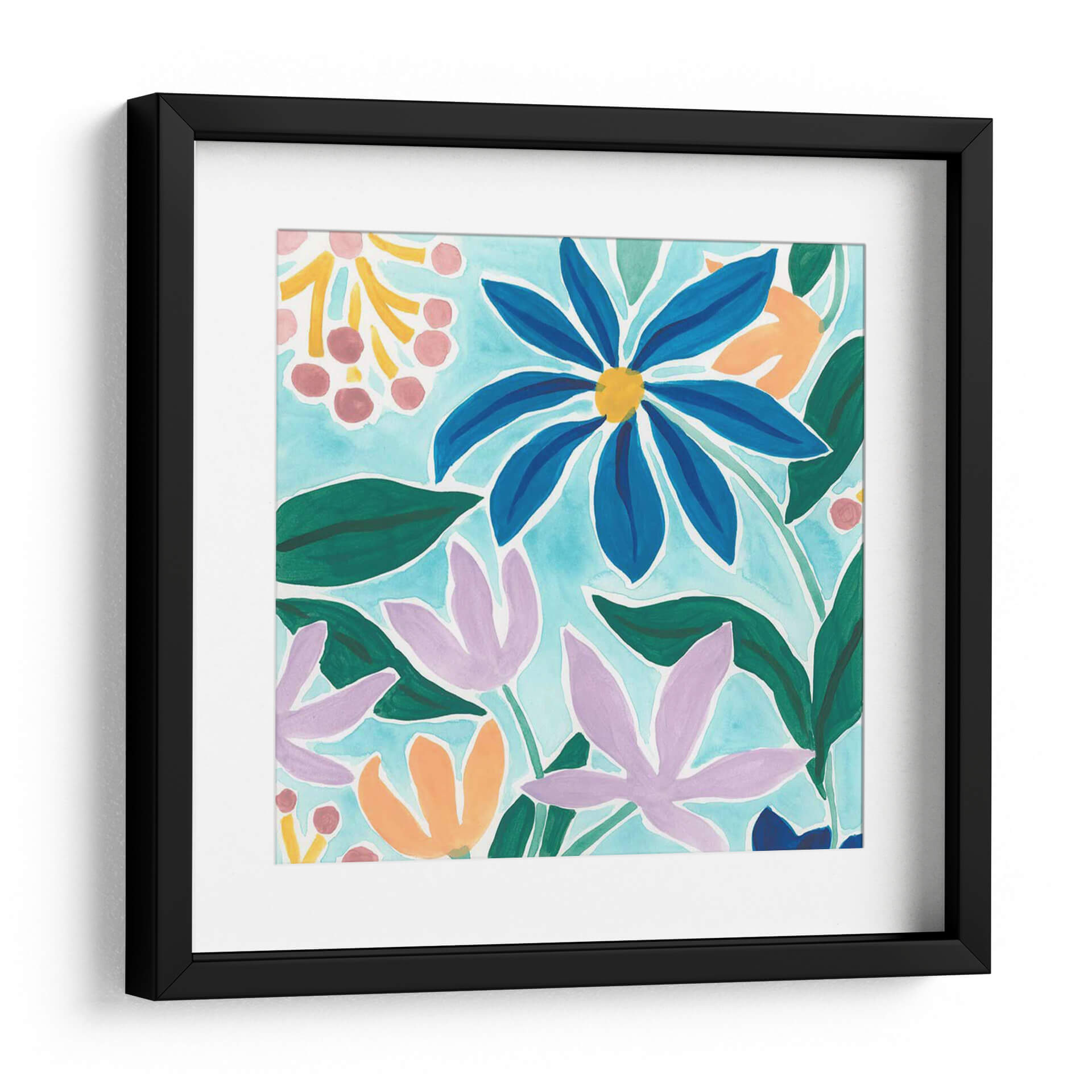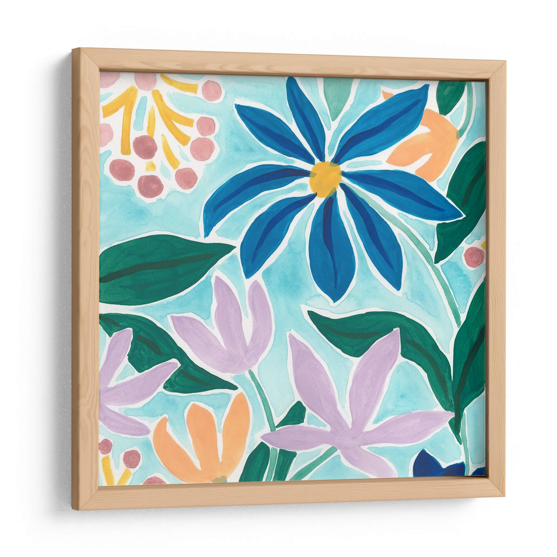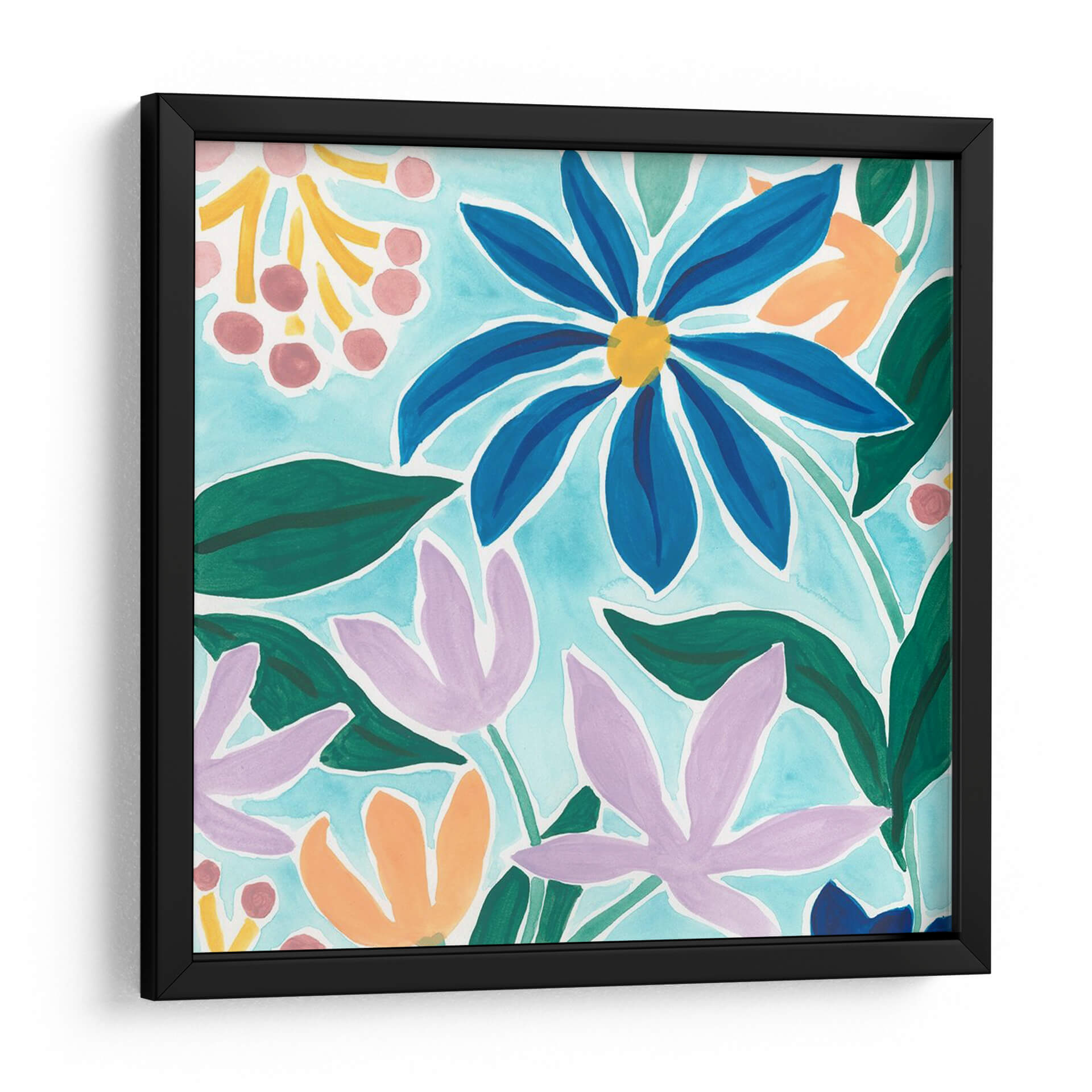 Inyecta vitalidad y frescura en tu hogar con "Tiki Square Ii", una cautivadora obra de arte de June Erica Vess. Este cuadro decorativo abstracto floral despliega un vibrante tapiz de colores sobre un fondo azul turquesa brillante, evocando la serenidad de un día soleado y la exuberancia de un jardín tropical. Predominan las flores en tonos azules intensos, morados suaves y naranjas cálidos, rodeadas por hojas verdes profundas y detalles delicados en rosa y amarillo. La composición, con sus formas fluidas y pinceladas sueltas, crea una sensación de movimiento y alegría, invitando a la contemplación. "Tiki Square Ii" es ideal para añadir un toque de color y naturaleza a cualquier espacio, ya sea una sala de estar moderna, un dormitorio acogedor o una oficina luminosa. Transforma tus paredes con esta explosión de color y estilo contemporáneo, una pieza que celebra la belleza de la flora con un enfoque artístico único y lleno de energía.