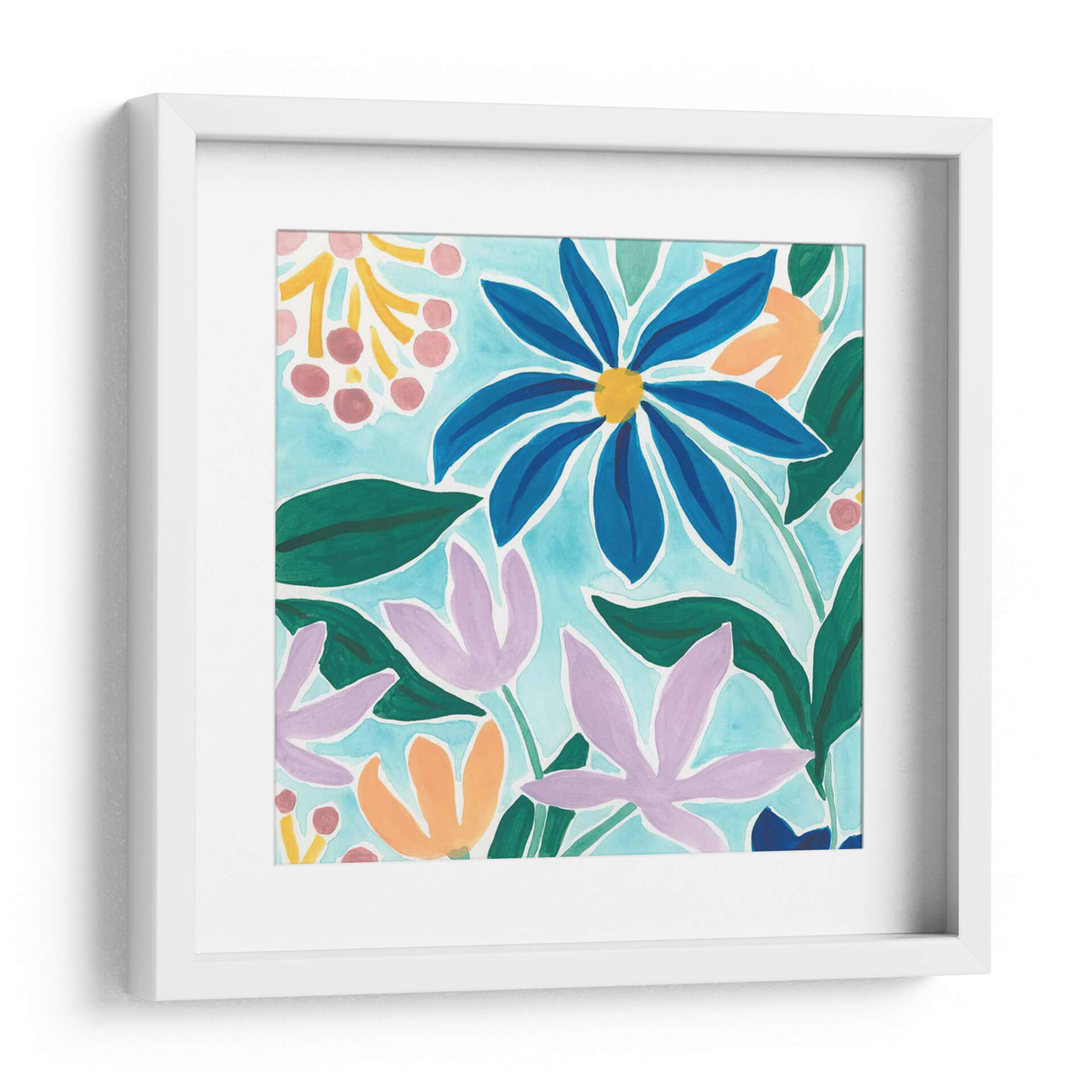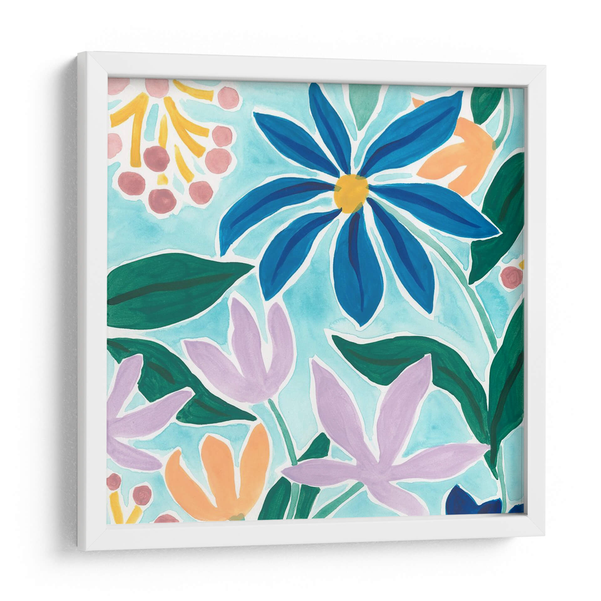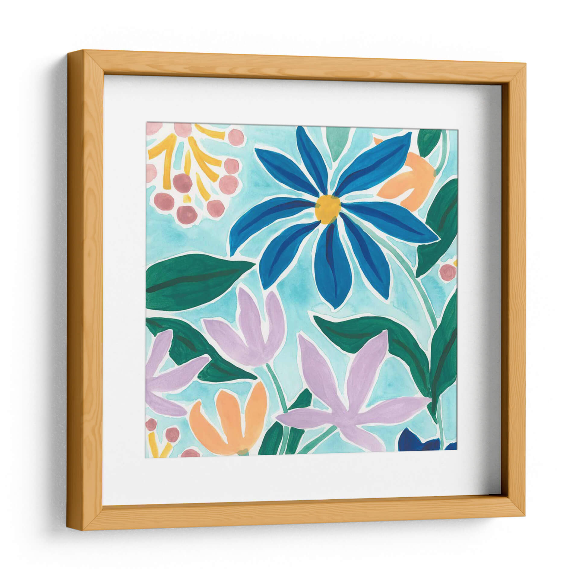 Inyecta vitalidad y frescura en tu hogar con "Tiki Square Ii", una cautivadora obra de arte de June Erica Vess. Este cuadro decorativo abstracto floral despliega un vibrante tapiz de colores sobre un fondo azul turquesa brillante, evocando la serenidad de un día soleado y la exuberancia de un jardín tropical. Predominan las flores en tonos azules intensos, morados suaves y naranjas cálidos, rodeadas por hojas verdes profundas y detalles delicados en rosa y amarillo. La composición, con sus formas fluidas y pinceladas sueltas, crea una sensación de movimiento y alegría, invitando a la contemplación. "Tiki Square Ii" es ideal para añadir un toque de color y naturaleza a cualquier espacio, ya sea una sala de estar moderna, un dormitorio acogedor o una oficina luminosa. Transforma tus paredes con esta explosión de color y estilo contemporáneo, una pieza que celebra la belleza de la flora con un enfoque artístico único y lleno de energía.
