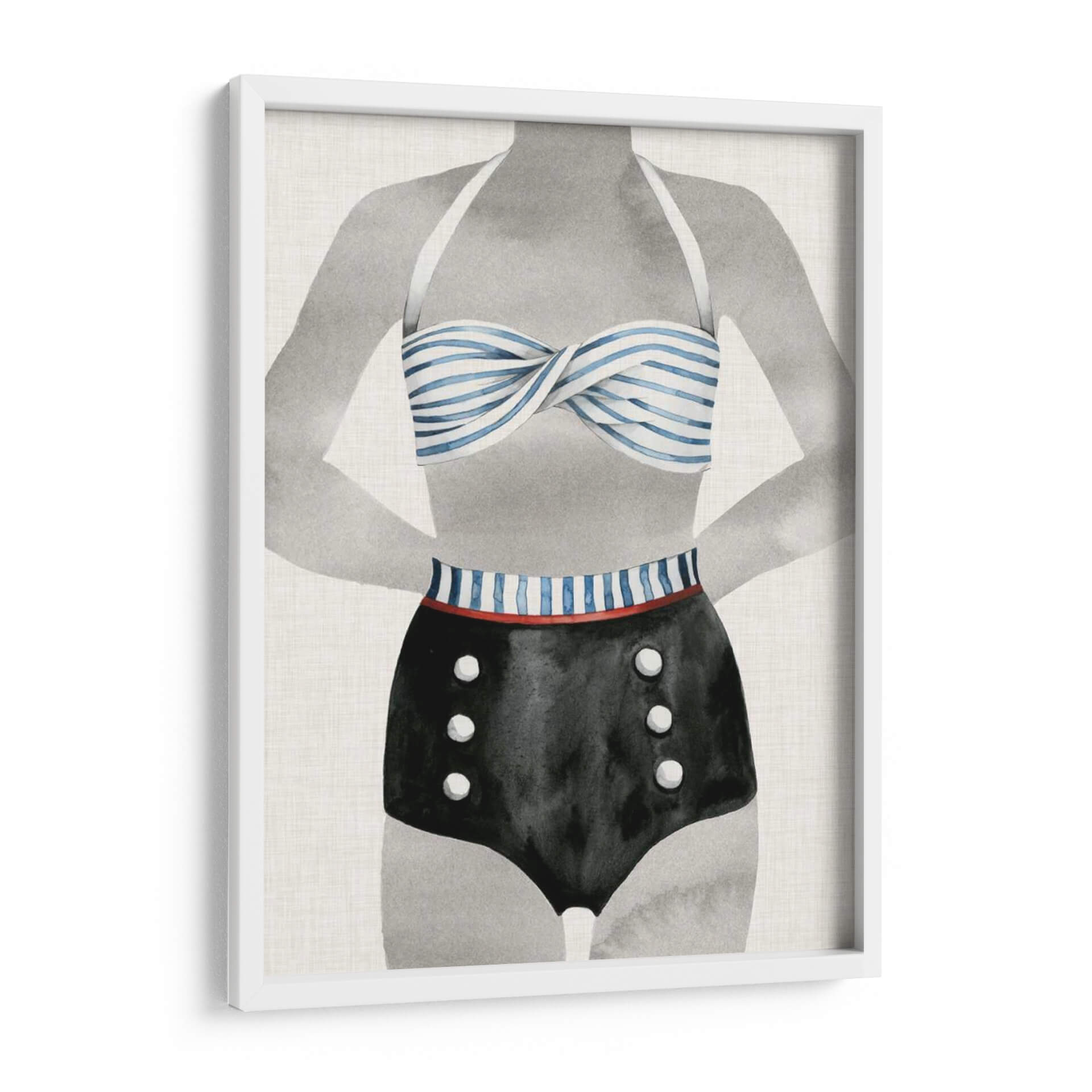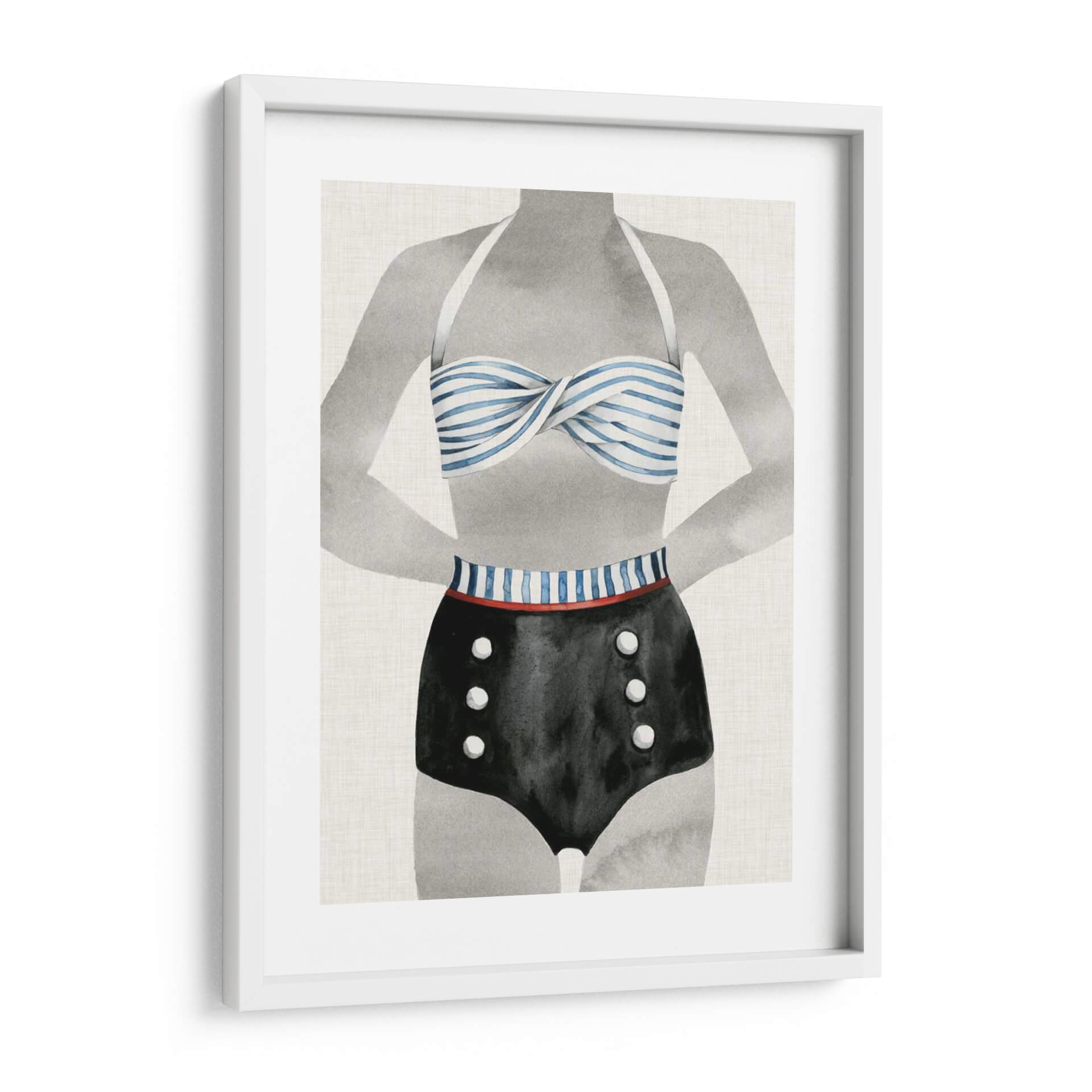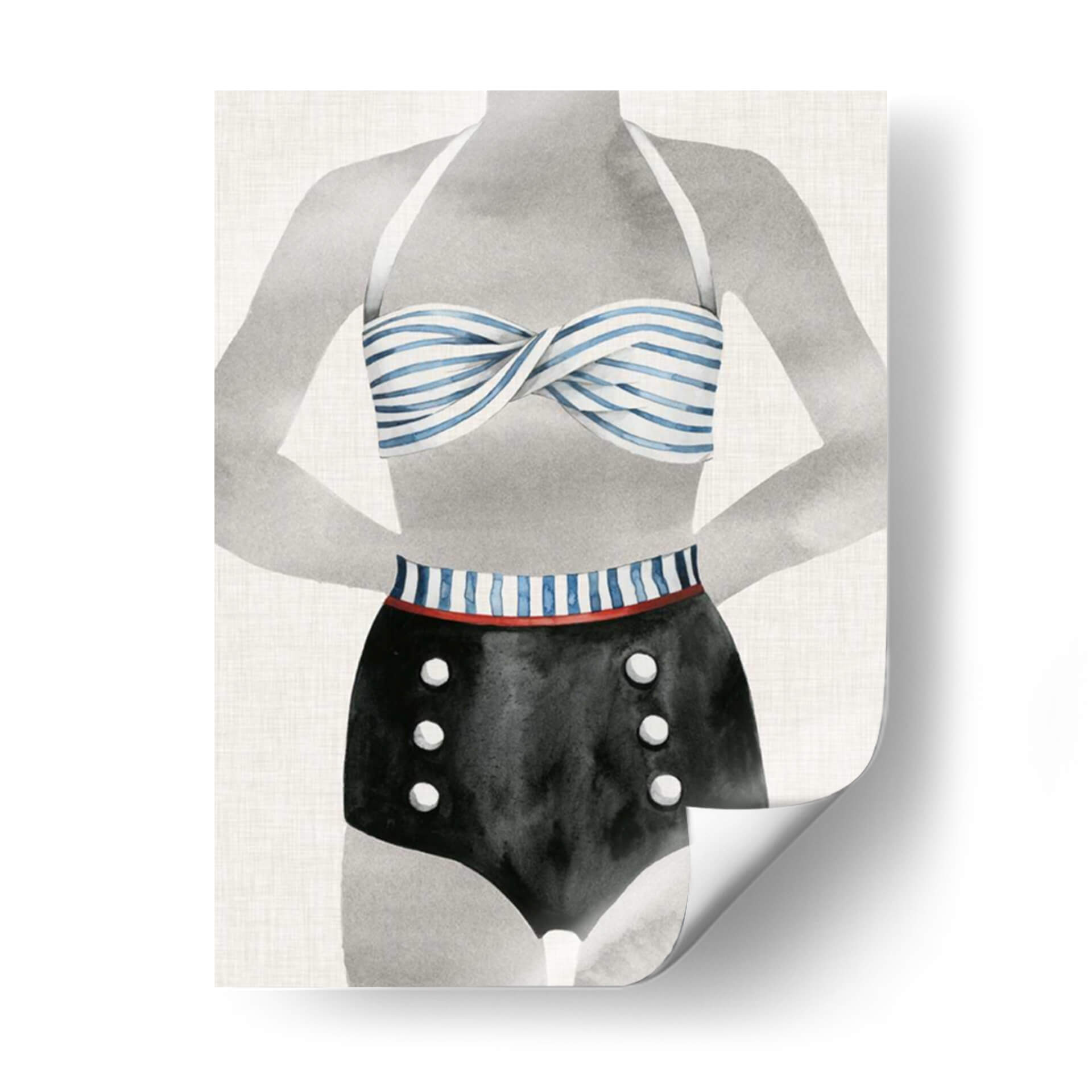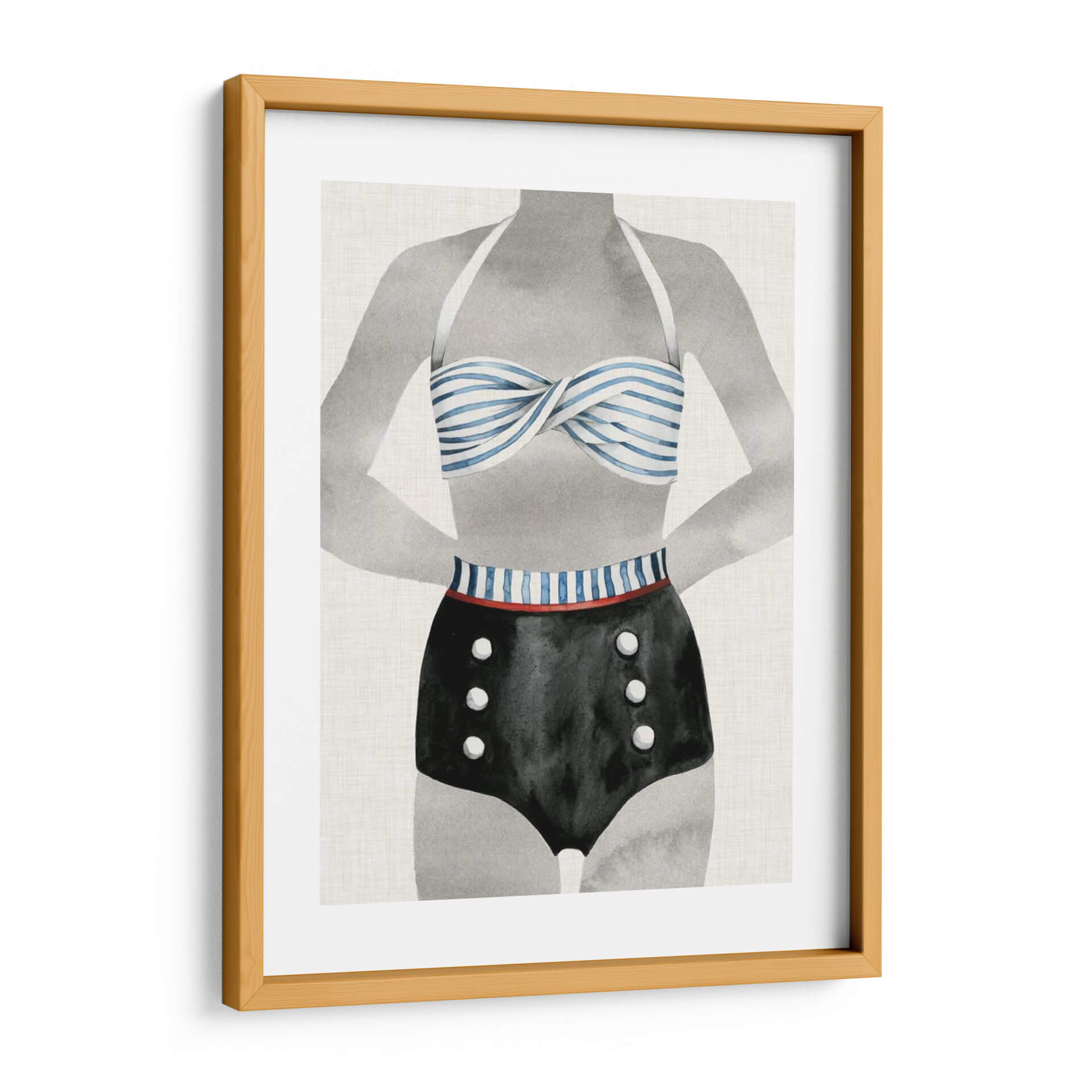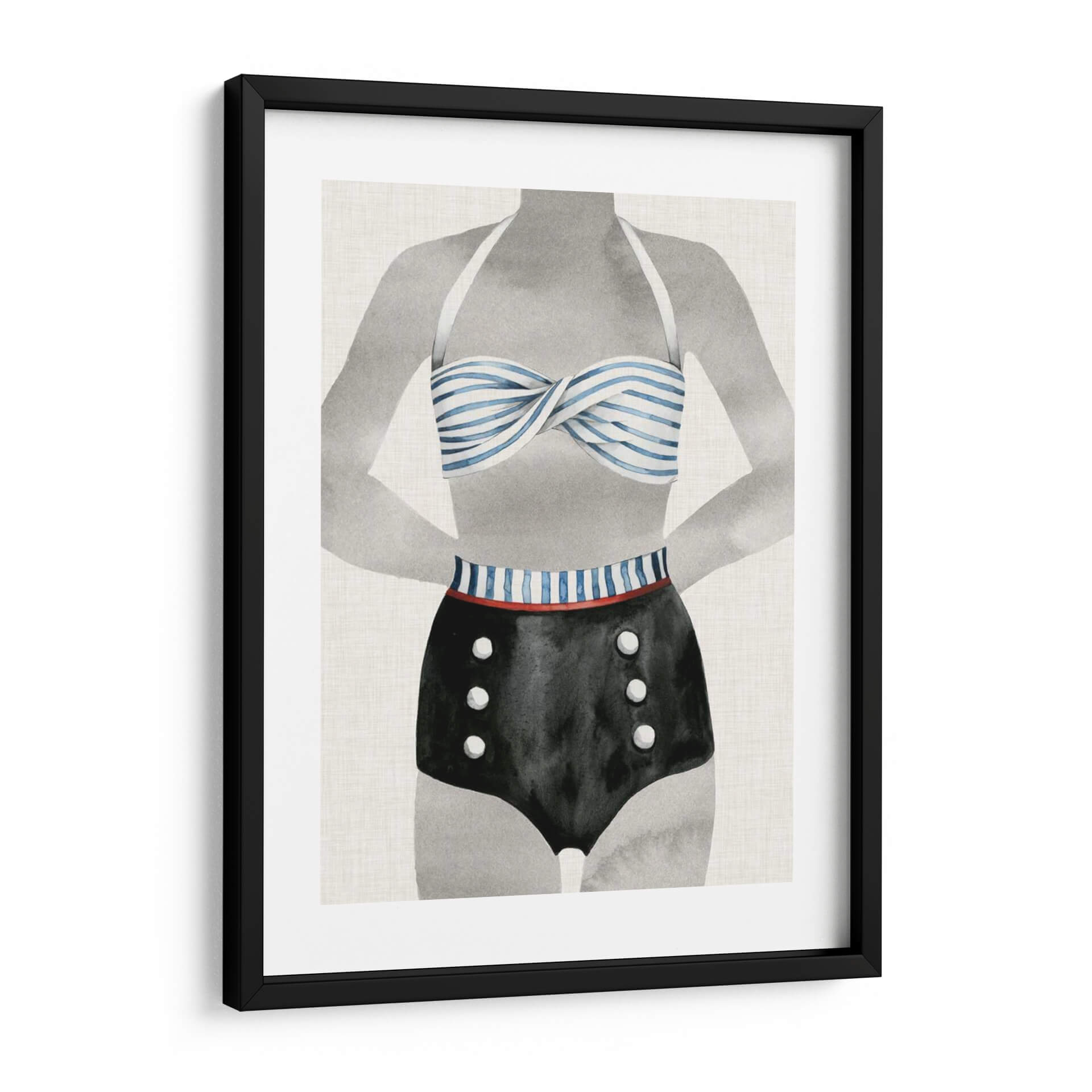 Sumérgete en la elegancia nostálgica con "Traje De Baño Vintage I", una obra de arte original de Grace Popp. Esta cautivadora pieza presenta la figura estilizada de una mujer luciendo un traje de baño retro, con un top a rayas azules y blancas entorchado y una braguita de talle alto negra adornada con botones blancos y un discreto ribete rojo. La paleta de colores, dominada por el contraste entre los grises sutiles del fondo y las figuras, el azul vibrante de las rayas y el negro intenso de la braguita, crea una atmósfera sofisticada y a la vez juguetona. El estilo acuarela, con sus trazos delicados y la fluidez del color, otorga a la obra una ligereza y un encanto atemporal. Ideal para quienes buscan añadir un toque de estilo clásico y un aire veraniego a su decoración, este cuadro es perfecto para salones modernos, dormitorios acogedores o incluso como pieza central en un baño chic. "Traje De Baño Vintage I" no es solo una imagen, es una invitación a evocar recuerdos de días soleados y un estilo inconfundible, aportando personalidad y un aire de distinción a cualquier espacio. Una elección perfecta para coleccionistas de arte o para cualquiera que aprecie la estética retro con un toque contemporáneo.
