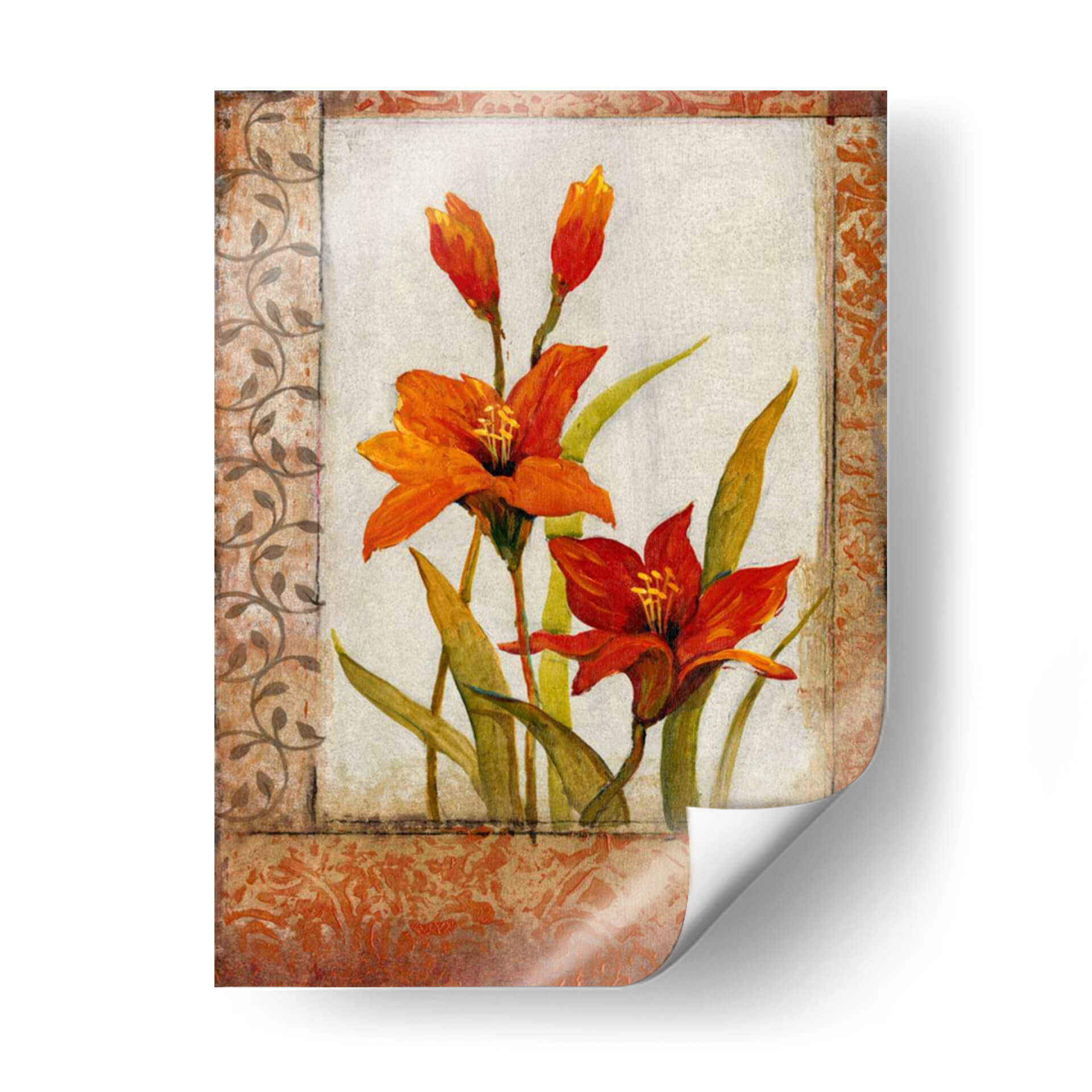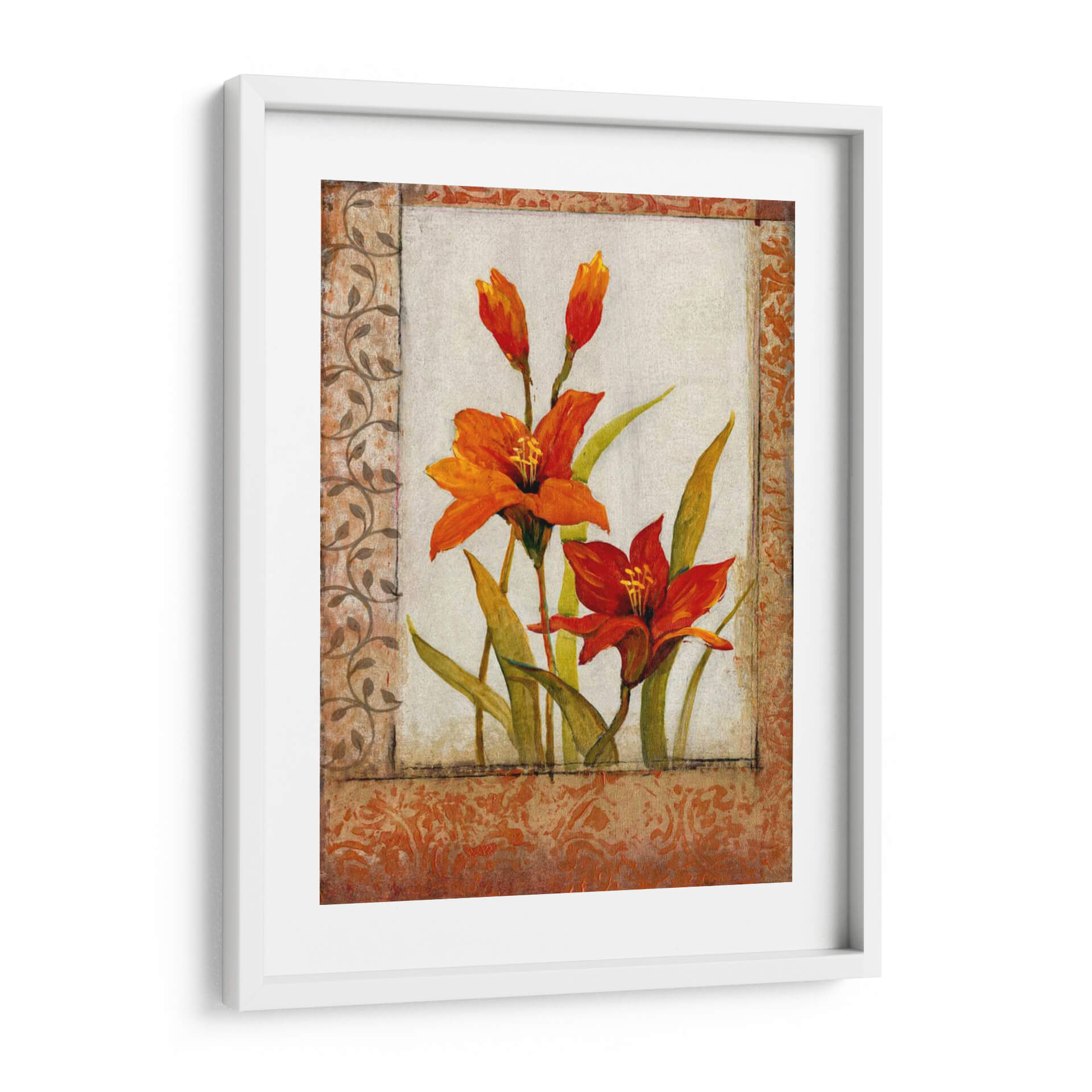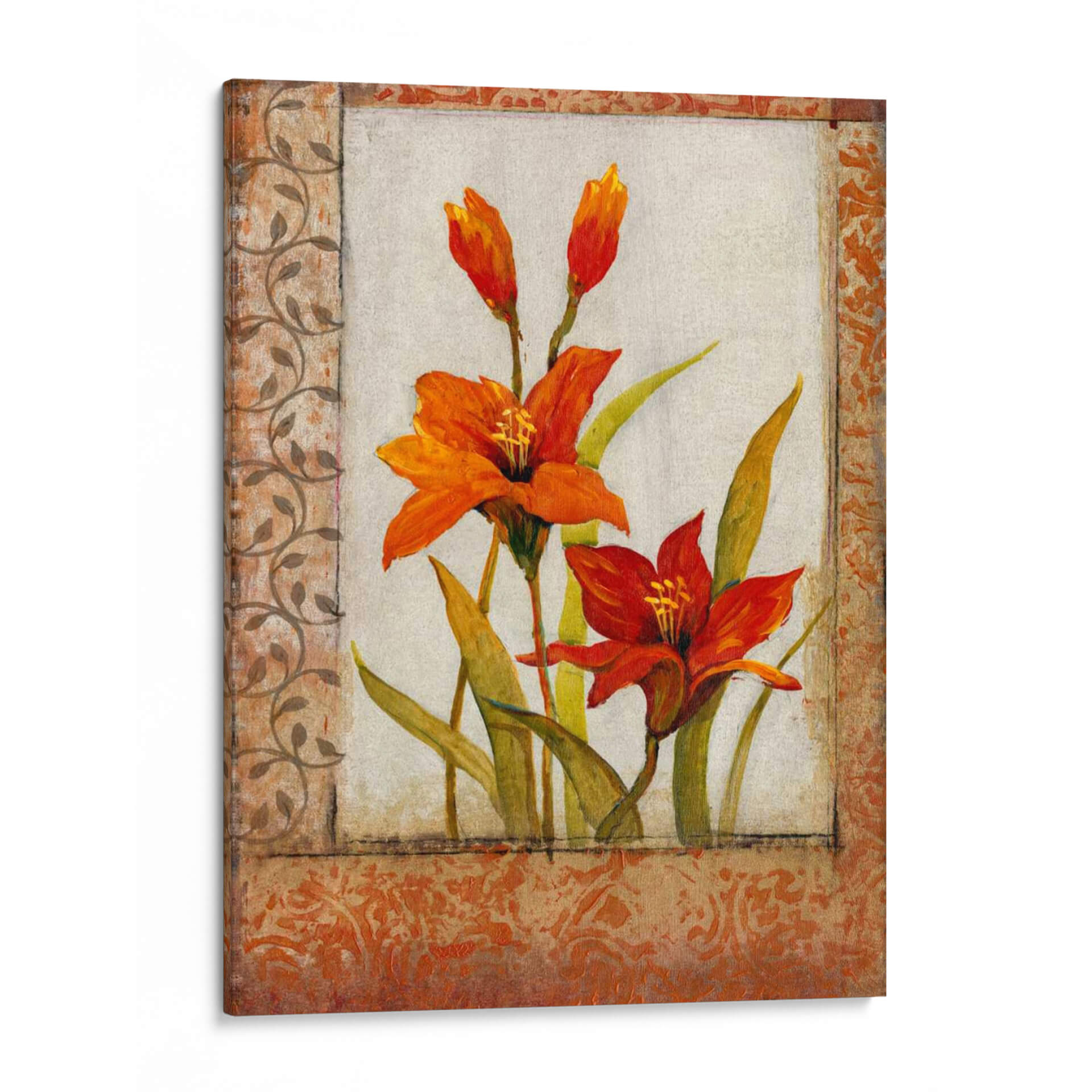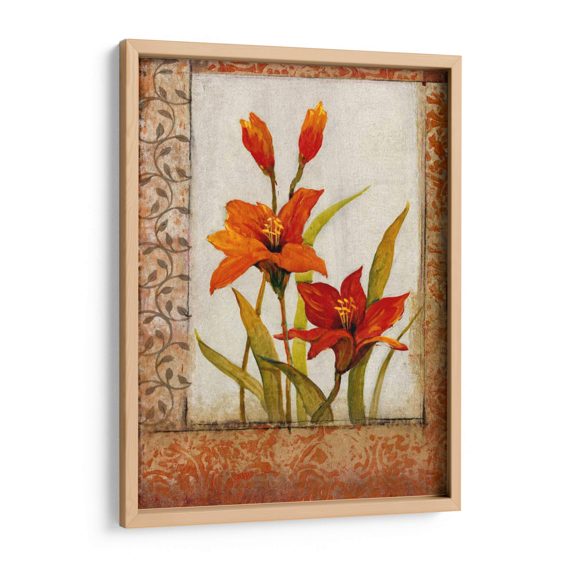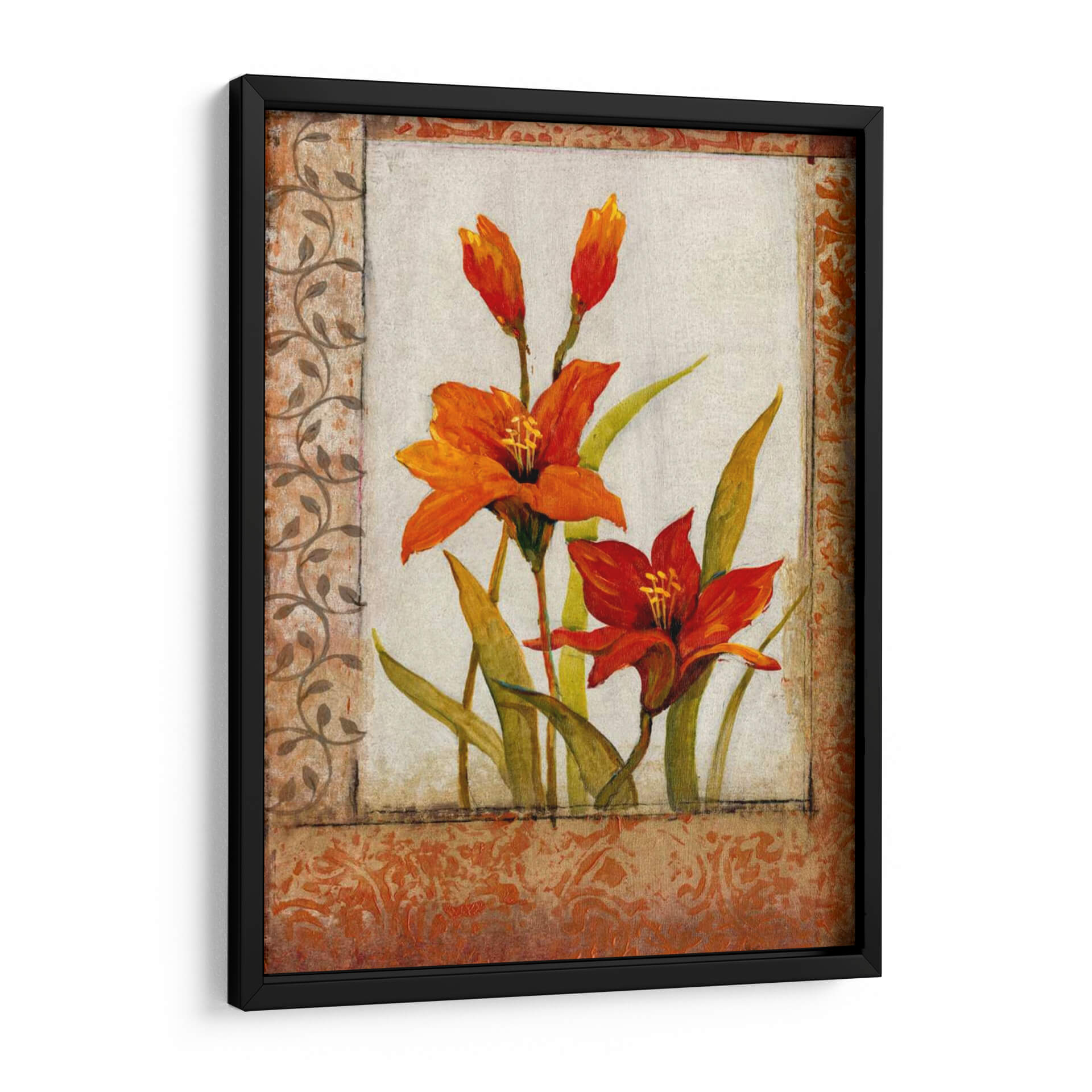 Transforma tu espacio con el vibrante cuadro decorativo "Tulip Insercio I" de Tim OToole. Esta obra de arte presenta un cautivador arreglo de tulipanes en tonos intensos de naranja y rojo, realzados por delicados toques de amarillo en sus pétalos y hojas. La composición se centra en la belleza natural de estas flores, capturando su forma exuberante y los detalles intrincados de sus pistilos. El fondo, con una textura sutil y una paleta de colores neutros, permite que los tulipanes sean los protagonistas indiscutibles, creando un punto focal dinámico y lleno de vida. Los bordes ornamentados, con un diseño floral en relieve y texturas rústicas en tonos tierra, añaden un toque de elegancia clásica y calidez, evocando una sensación de profundidad y refinamiento. La atmósfera general de la obra es de vitalidad y optimismo, con una delicada pincelada que insinúa un estilo contemporáneo con reminiscencias botánicas. Este cuadro decorativo es ideal para añadir un toque de color y sofisticación a salones modernos, comedores acogedores, oficinas inspiradoras o cualquier habitación que busque una expresión artística audaz y a la vez serena. "Tulip Insercio I" no es solo una pieza decorativa, sino una invitación a la contemplación de la belleza efímera de la naturaleza.