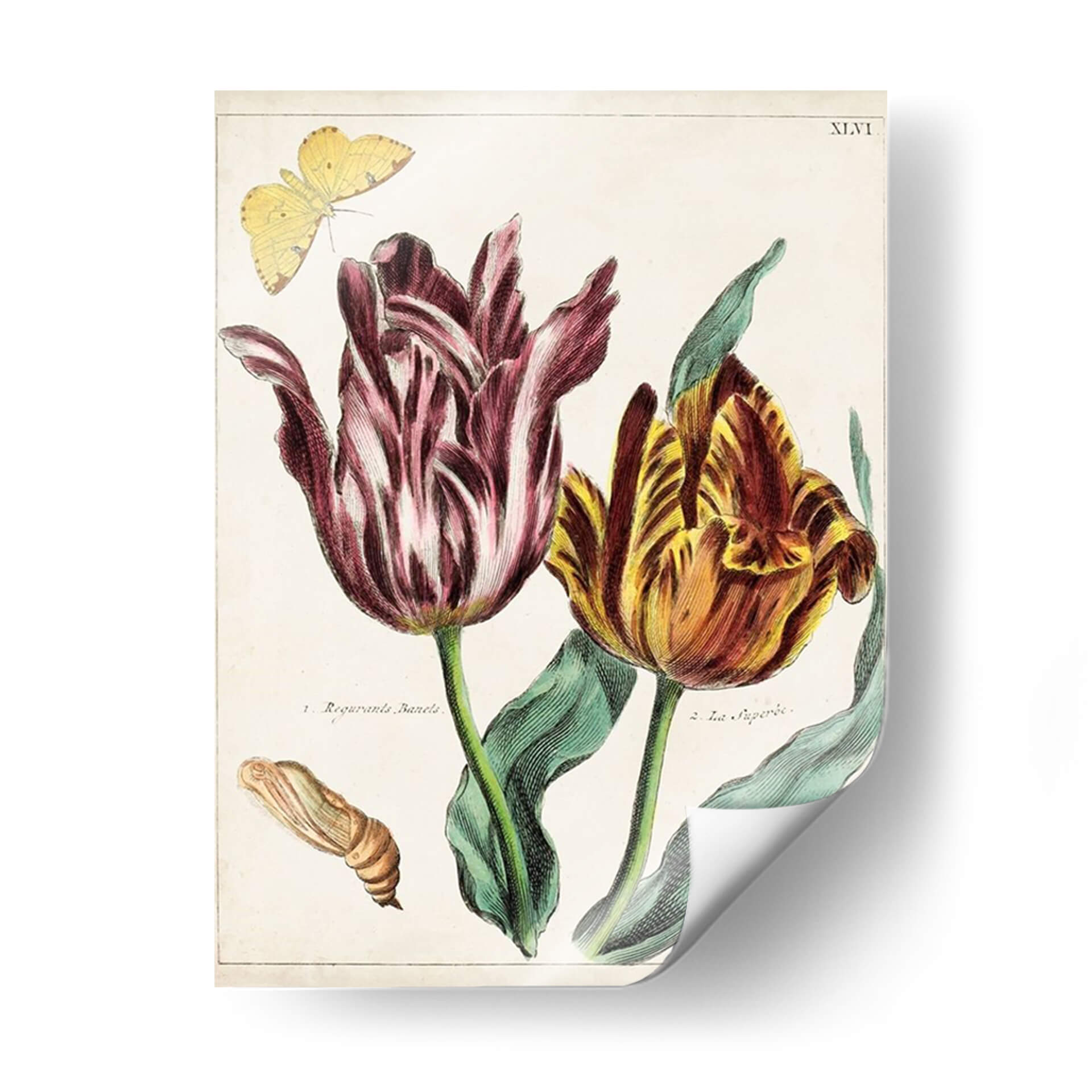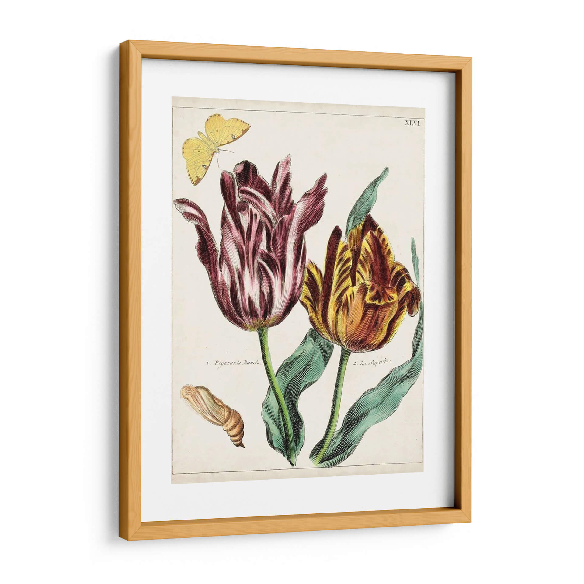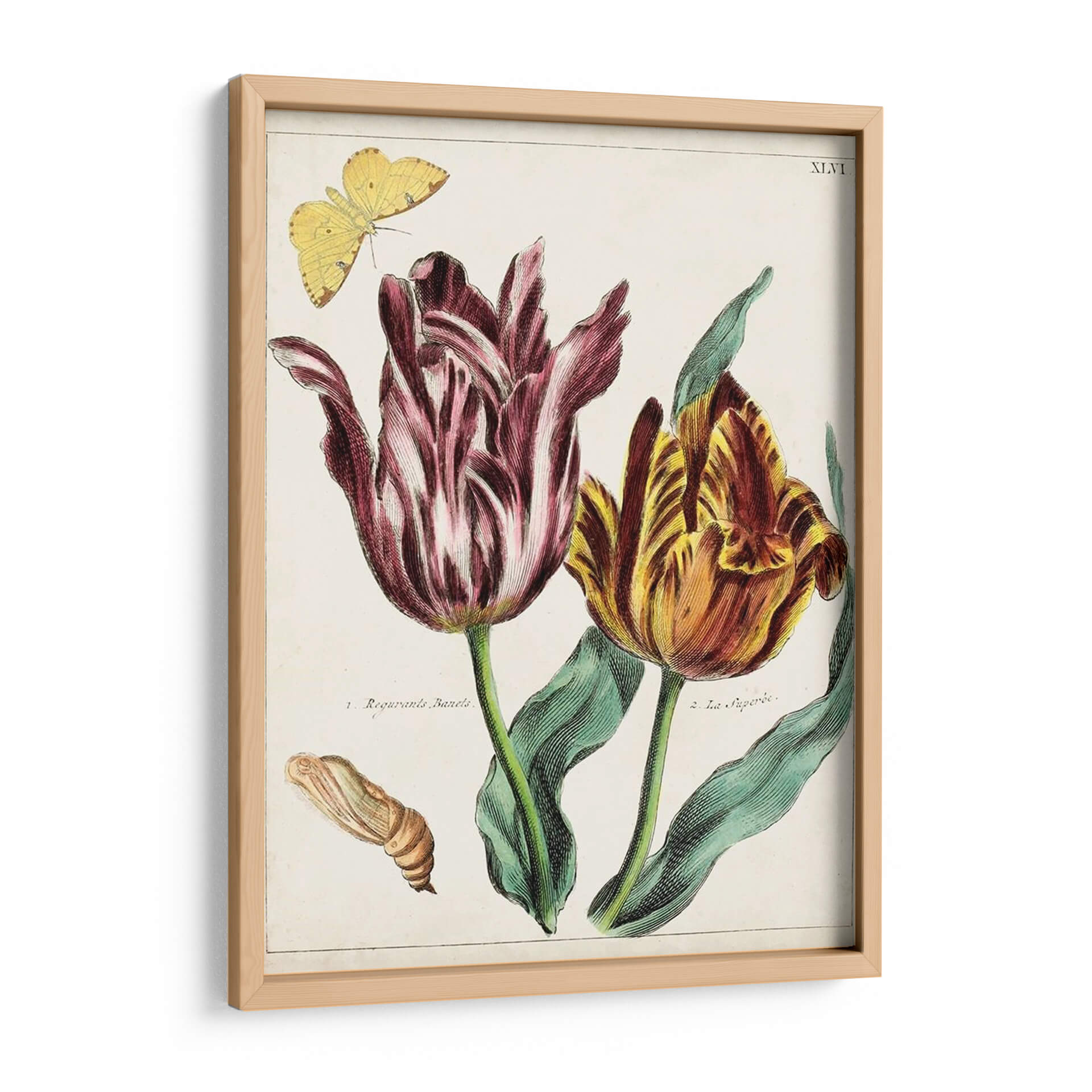Este exquisito cuadro decorativo 'Tulipán Clásicos II' captura la delicadeza y la belleza atemporal de la naturaleza a través de una detallada ilustración botánica. La obra presenta dos tulipanes vibrantes, uno en tonos de borgoña y blanco veteado, y otro en una rica combinación de amarillo y marrón rayado, evocando la diversidad y el encanto de estas flores clásicas. Acompañando a los tulipanes, una mariposa amarilla revolotea grácilmente, añadiendo un toque de vida y movimiento a la composición. El estilo recuerda a las antiguas láminas de historia natural, con un trazado fino y una paleta de colores suave pero definida que aporta un aire de elegancia vintage. La composición es equilibrada, centrada en la magnificencia de las flores y su entorno botánico, con detalles sutiles como una hoja o capullo al pie de la escena. Este cuadro decorativo es perfecto para añadir un toque de sofisticación botánica a cualquier espacio, desde una sala de estar clásica hasta un estudio o dormitorio. Su atmósfera serena y su intrincado detalle lo convierten en una pieza de arte de pared que inspira calma y aprecio por la belleza natural, ideal para quienes buscan añadir un elemento de refinamiento y historia a su decoración.