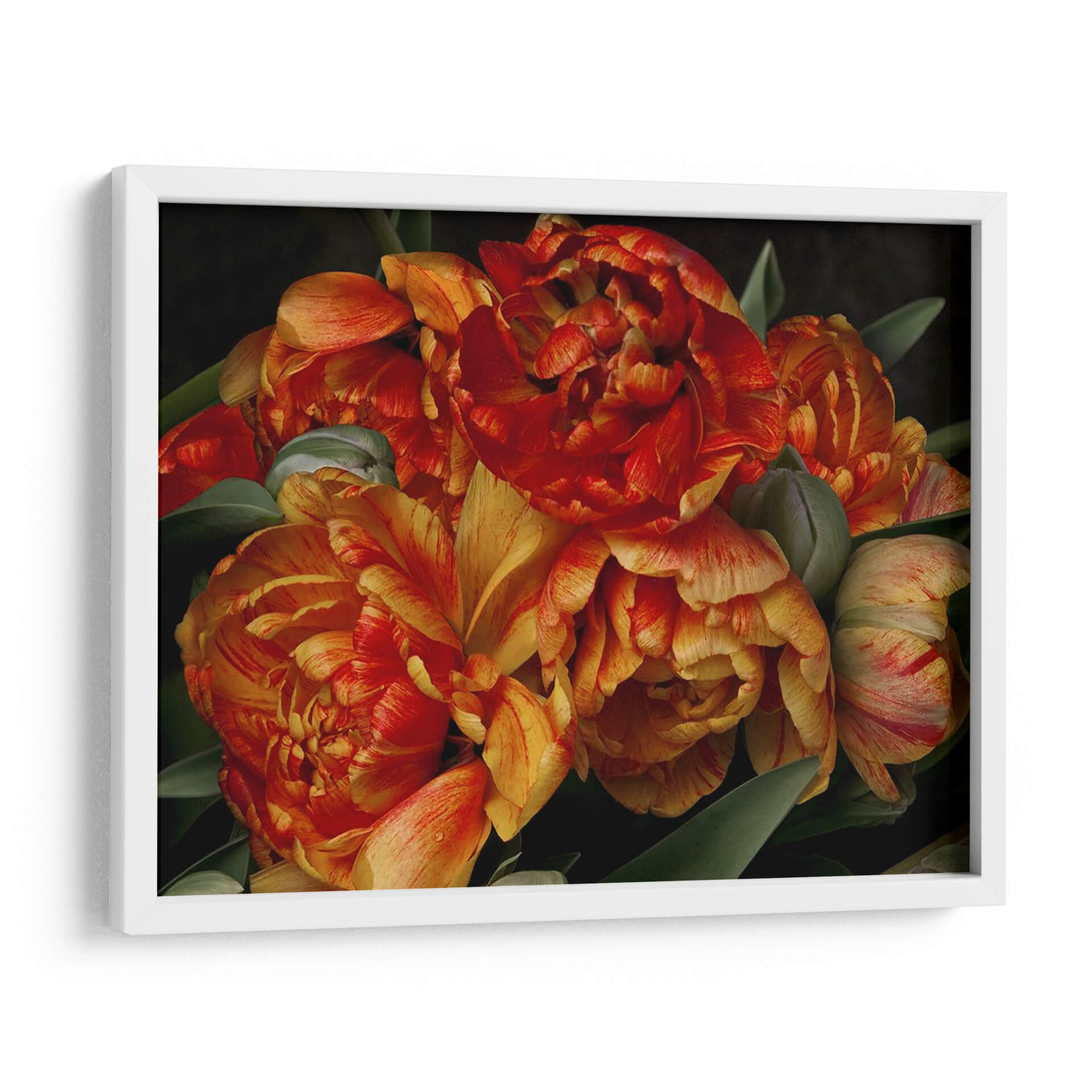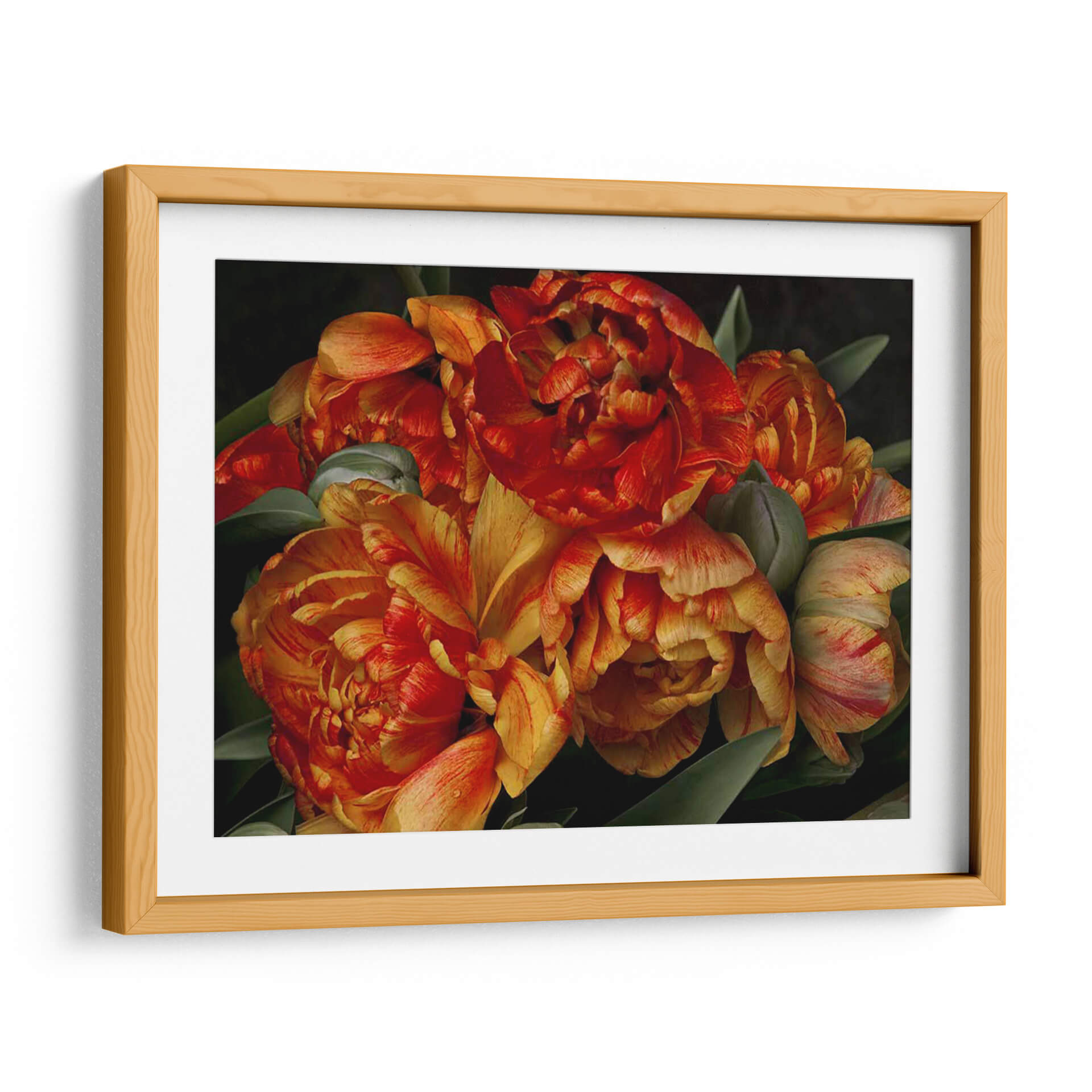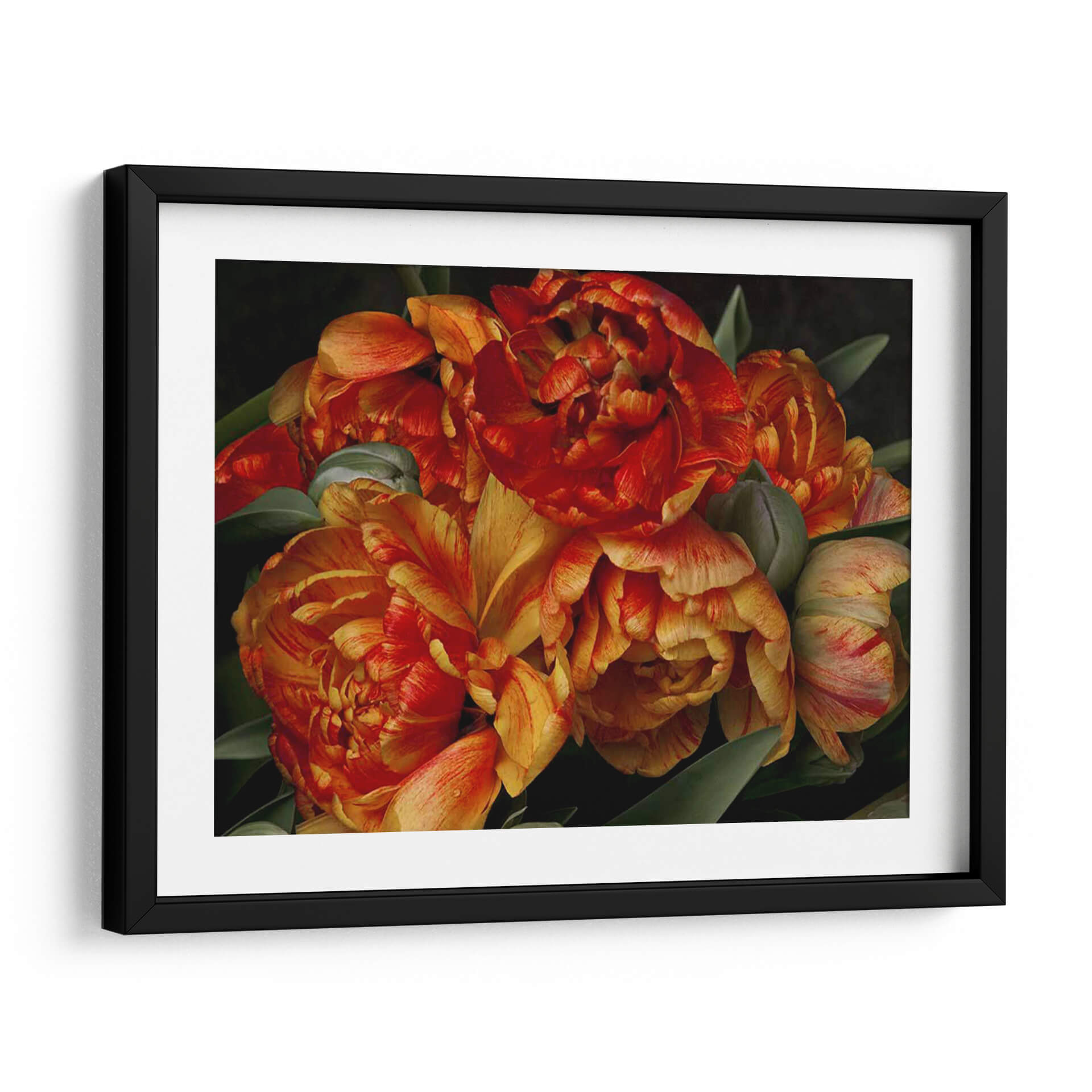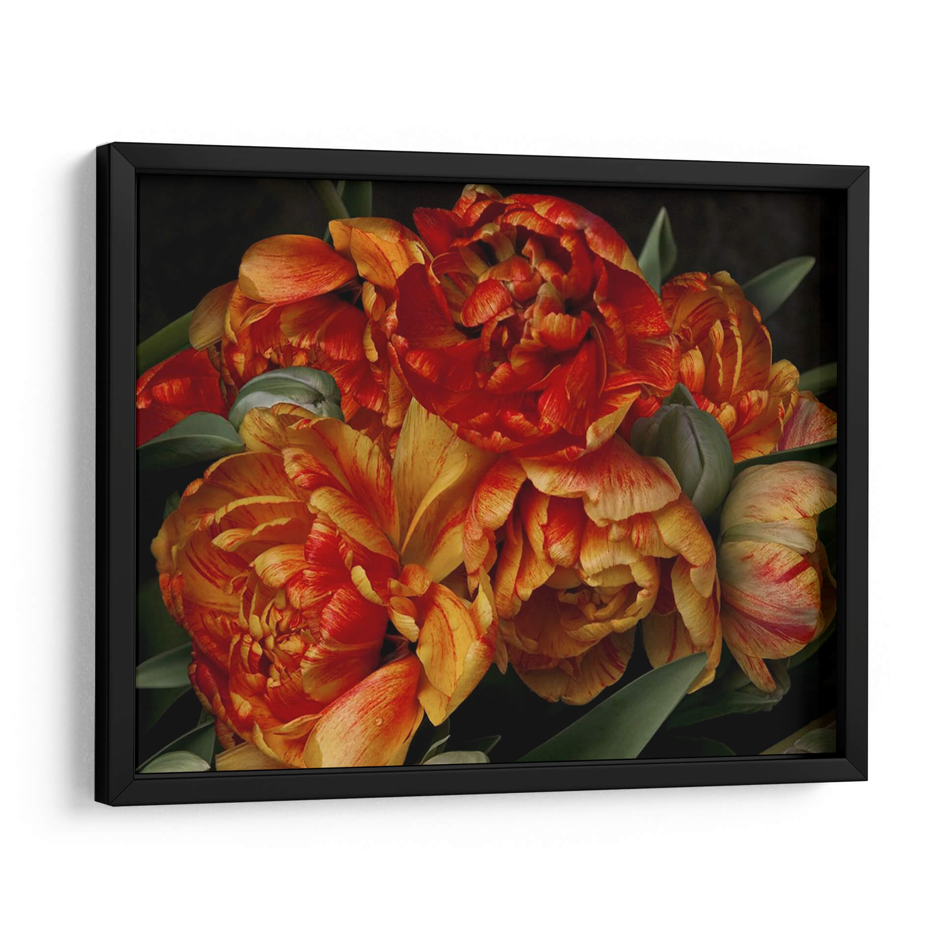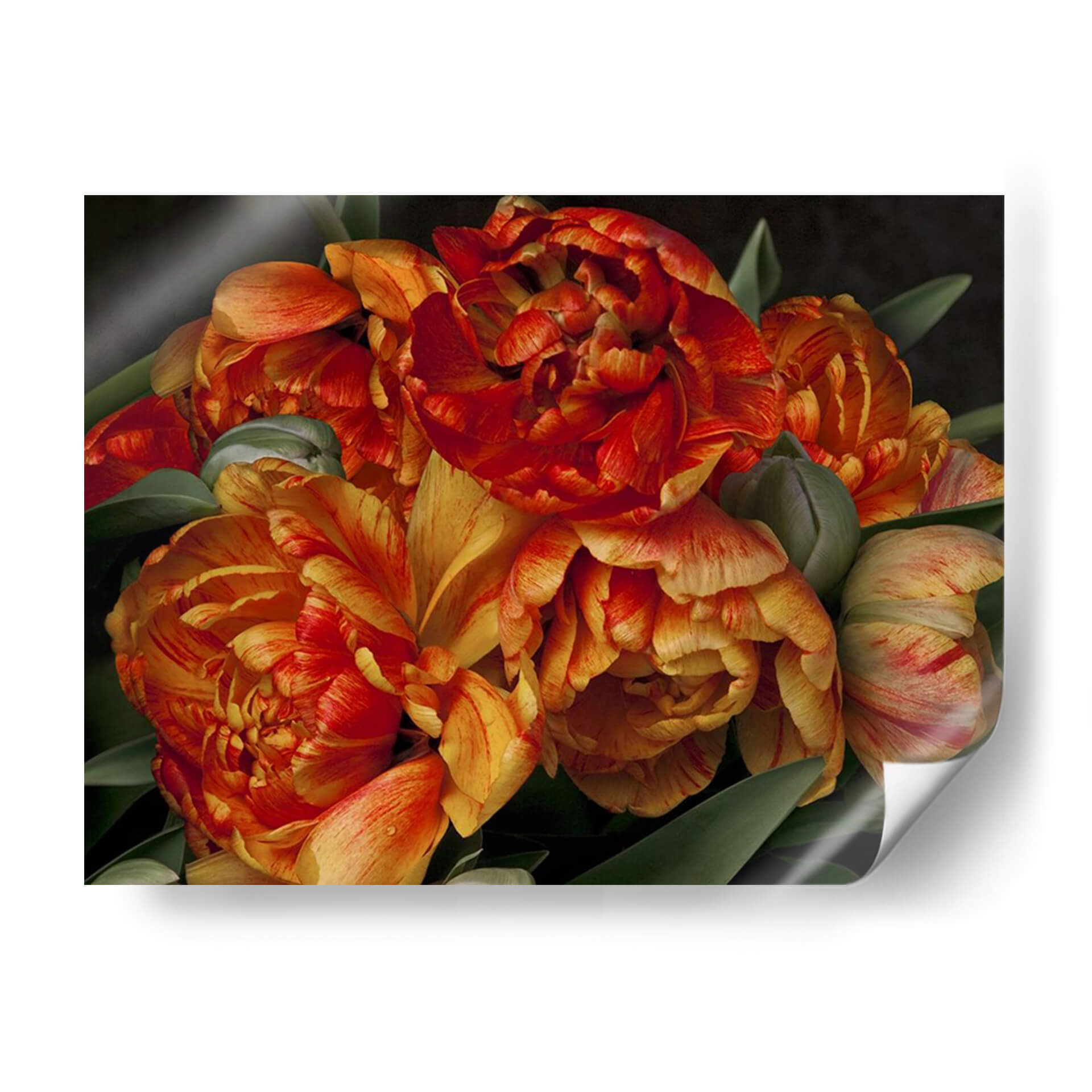 Sumérgete en la vibrante belleza de "Tulipanes Del Viejo Mundo II", una obra de arte decorativo que captura la opulencia de las flores en su máximo esplendor. Los tulipanes, con sus pétalos exuberantes y texturizados, se despliegan en una danza de colores cálidos, predominantemente naranjas y rojos intensos, con toques sutiles de amarillo y verde. La composición, centrada en un racimo apretado de estas flores, crea una sensación de intimidad y detalle, invitando al espectador a apreciar cada pliegue y matiz. El fondo oscuro y difuminado realza la tridimensionalidad y la vitalidad de los tulipanes, haciéndolos emerger como joyas de la naturaleza. Esta pieza evoca una atmósfera de sofisticación, calidez y un profundo aprecio por la belleza floral. Es ideal para añadir un punto focal de color y elegancia a salones modernos, comedores o incluso para infundir serenidad en un dormitorio. "Tulipanes Del Viejo Mundo II" no es solo una decoración de pared, sino una celebración de la vida y la estética atemporal de las flores, perfecta para quienes buscan un toque de lujo y naturaleza en su hogar.