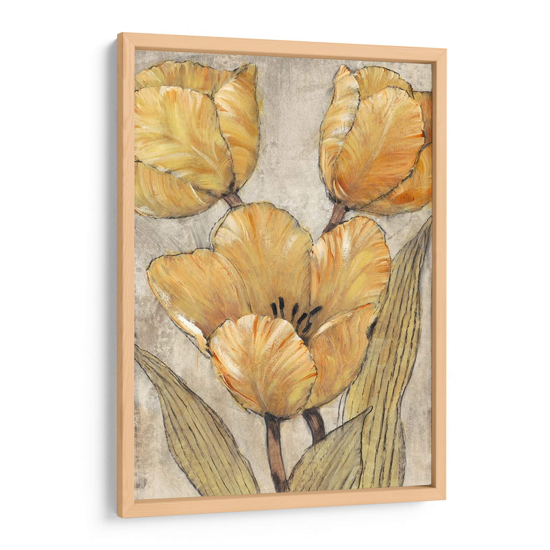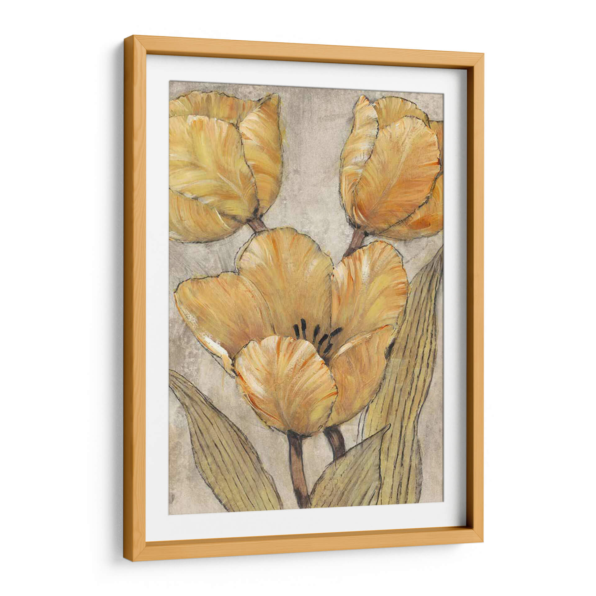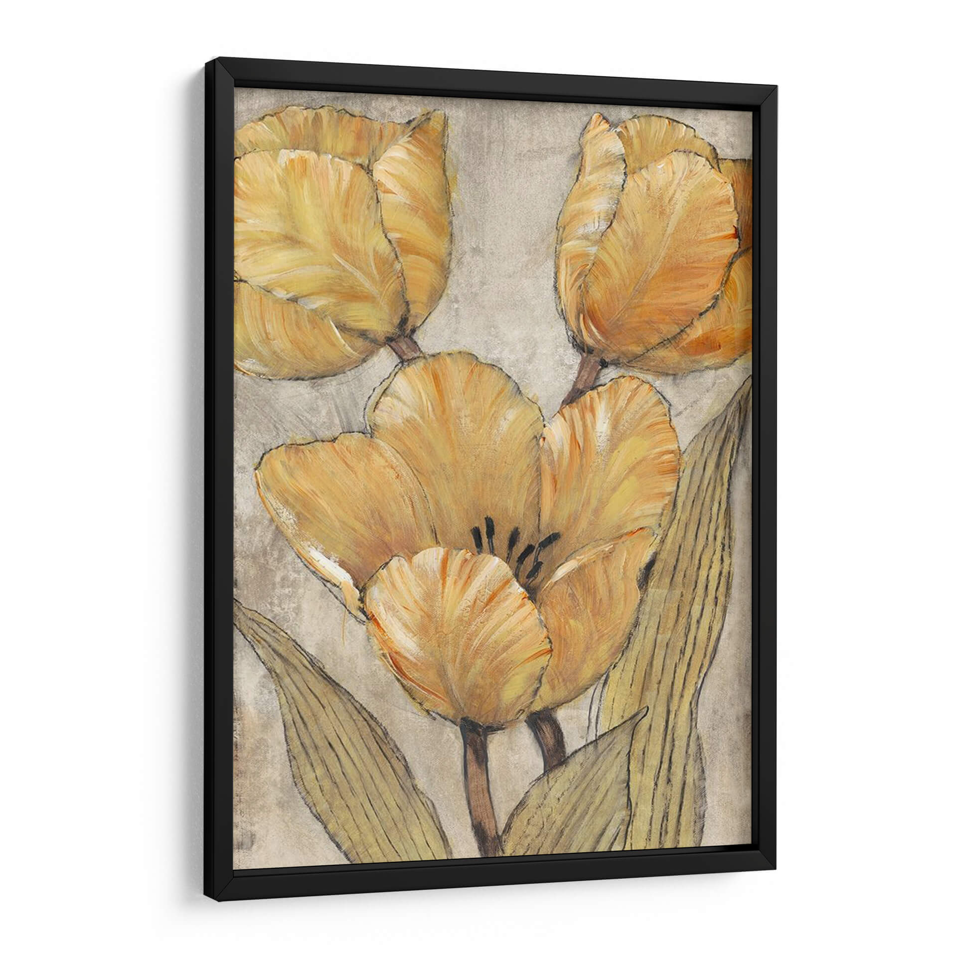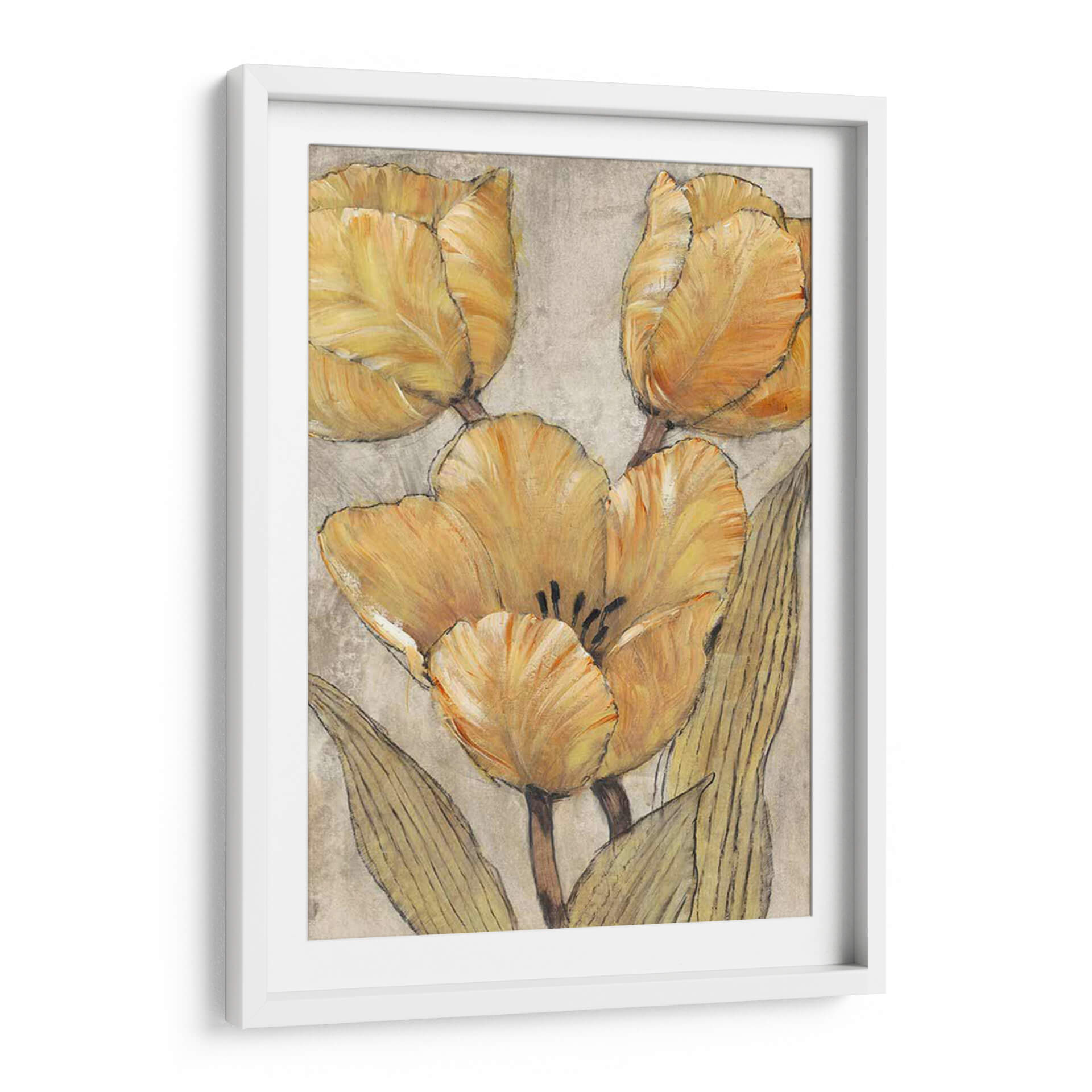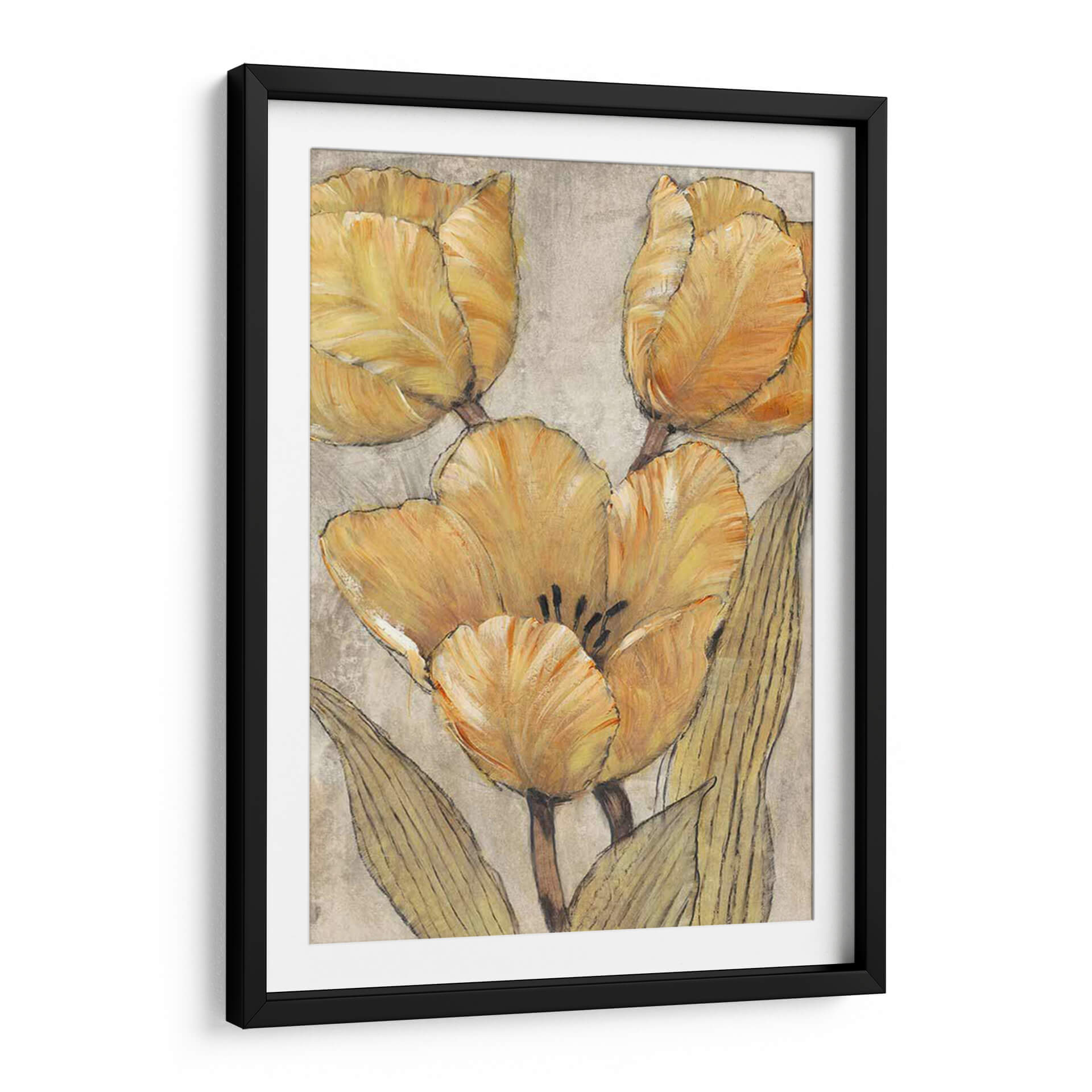 Sumérgete en la calidez y la elegancia atemporal de "Tulipanes Ocres Y Grises II", una obra de arte que captura la belleza sutil de estas icónicas flores. El artista Tim O'Toole nos presenta un estudio detallado de tulipanes en tonos ocres y grises, donde cada pétalo parece cobrar vida con pinceladas expresivas y texturas ricas. La paleta de colores, dominada por cálidos ocres y suaves grises, crea una atmósfera de serenidad y sofisticación, perfecta para añadir un toque de naturaleza y arte refinado a tu hogar u oficina. La composición centrada en los capullos y hojas de los tulipanes, con un sutil boceto lineal que define las formas, aporta una profundidad visual única y un aire contemporáneo. Este cuadro decorativo es ideal para quienes buscan piezas que inspiren calma y transmitan una conexión con la belleza natural, sin renunciar a un estilo moderno y elegante. Imagina esta obra aportando un punto focal de serenidad a tu sala de estar, un toque de color suave a tu dormitorio o una pincelada de arte inspirador en tu espacio de trabajo. "Tulipanes Ocres Y Grises II" es más que una simple decoración; es una invitación a la contemplación y al disfrute del arte floral en su máxima expresión.