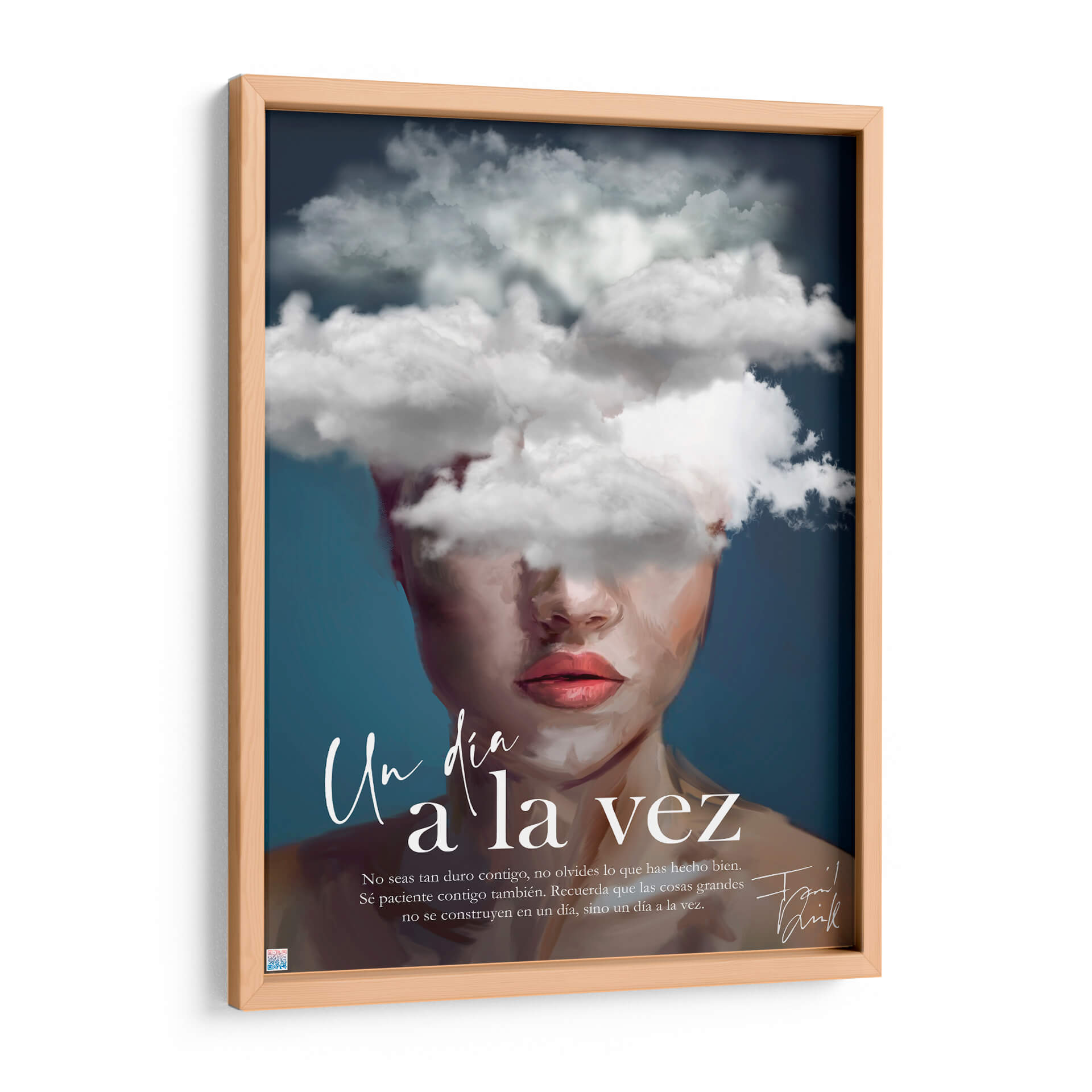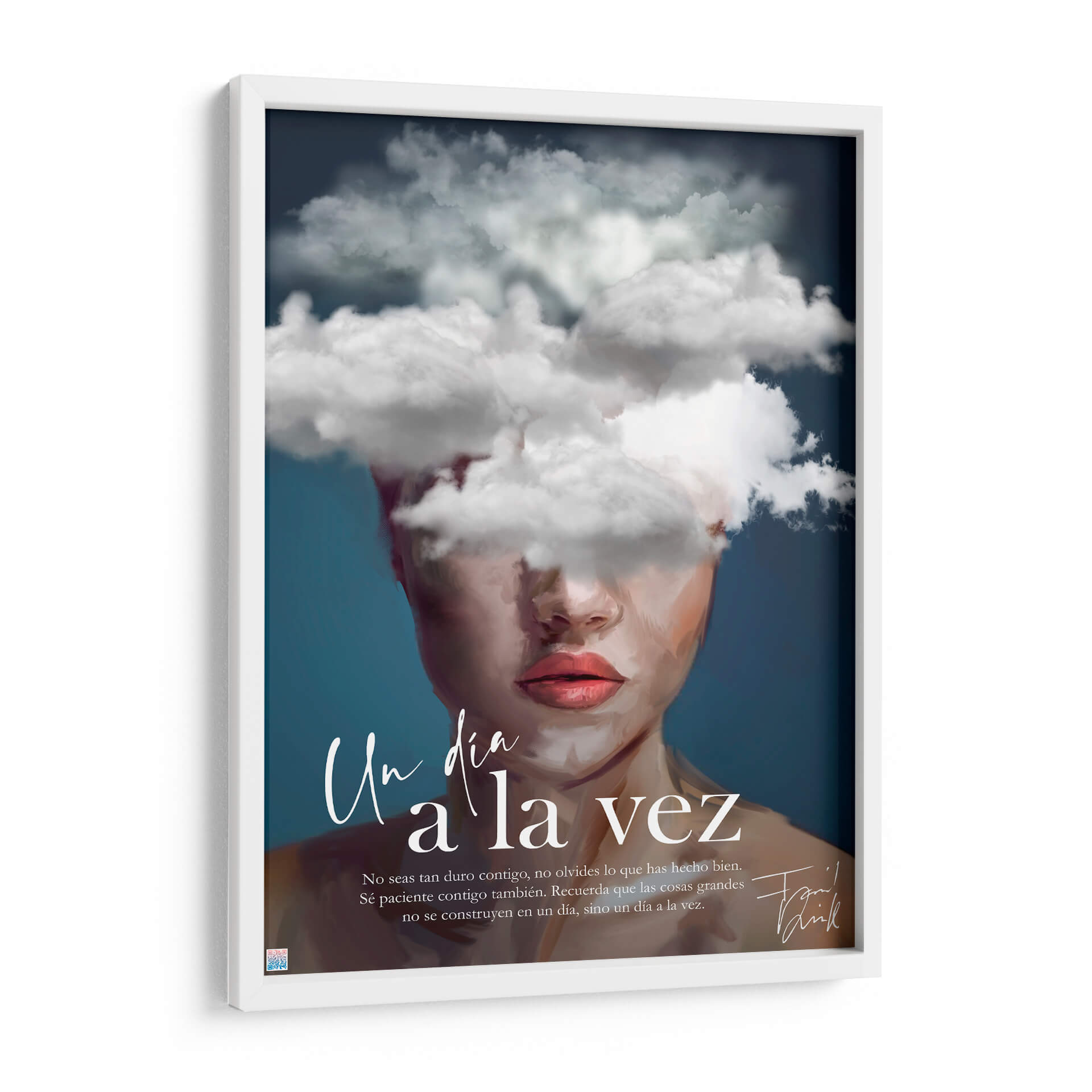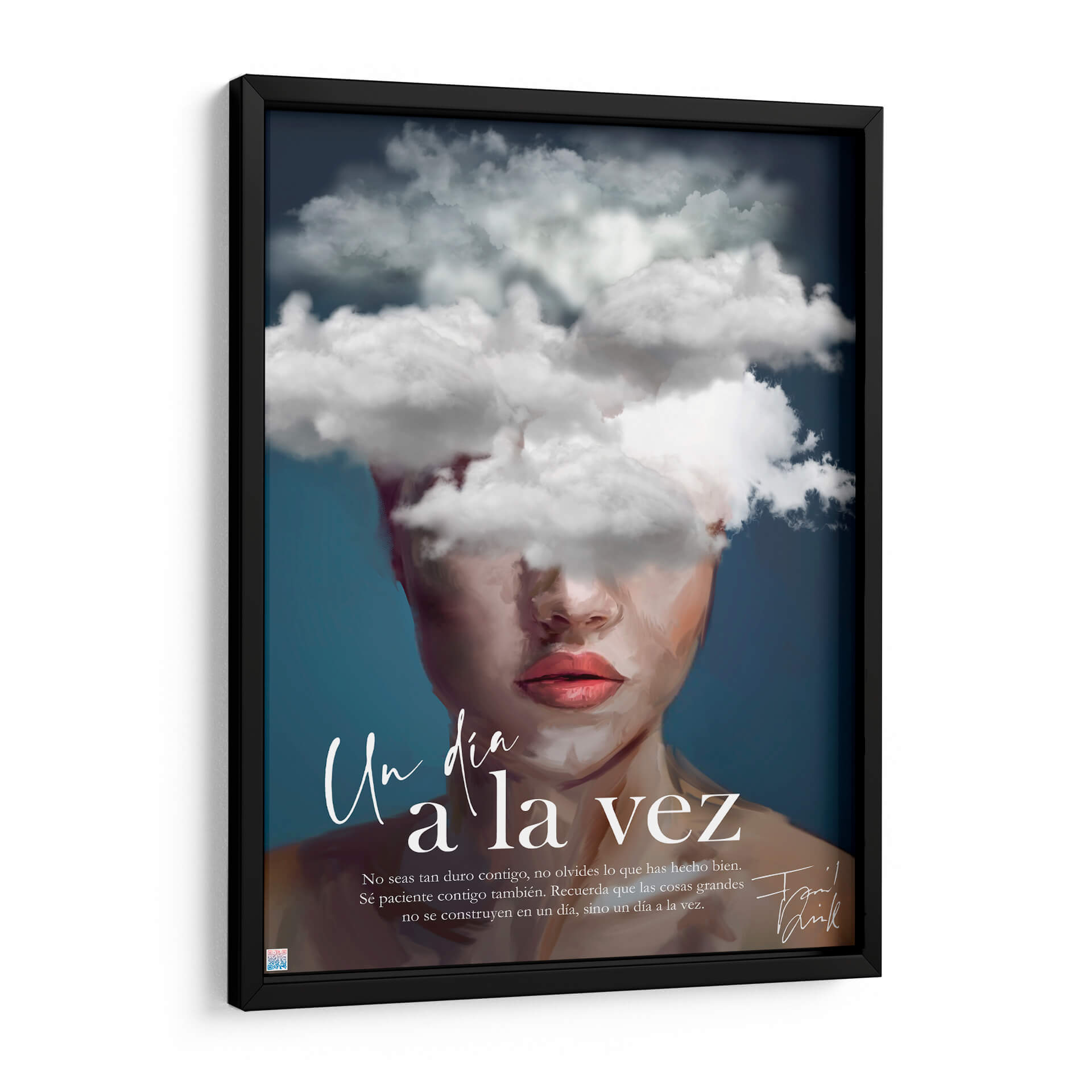 Sumérgete en la contemplación con "Un Día a la Vez 90-120", una obra de arte digital de Farid Dieck que te invita a la reflexión y al autocompasión. Esta pieza cautivadora presenta un retrato etéreo de una mujer, cuya mirada se pierde entre nubes tenues, creando una atmósfera onírica y serena. La paleta de colores, dominada por azules profundos y suaves tonos de piel, junto con el blanco etéreo de las nubes, genera un contraste sutil pero impactante que atrae la atención. El estilo pictórico, con pinceladas sueltas y expresivas, añade una cualidad artística y emocional a la composición. El texto integrado, "Un día a la vez", junto con un mensaje de paciencia y autocompasión, refuerza el carácter inspirador de la obra. "Un Día a la Vez 90-120" es más que una decoración de pared; es un recordatorio visual para abrazar el presente y ser amable contigo mismo. Ideal para crear un santuario de paz en tu dormitorio, un espacio de calma en tu estudio o un punto de inspiración en tu sala de estar. Este cuadro decorativo contemporáneo es perfecto para quienes buscan arte que hable al alma y promueva el bienestar.