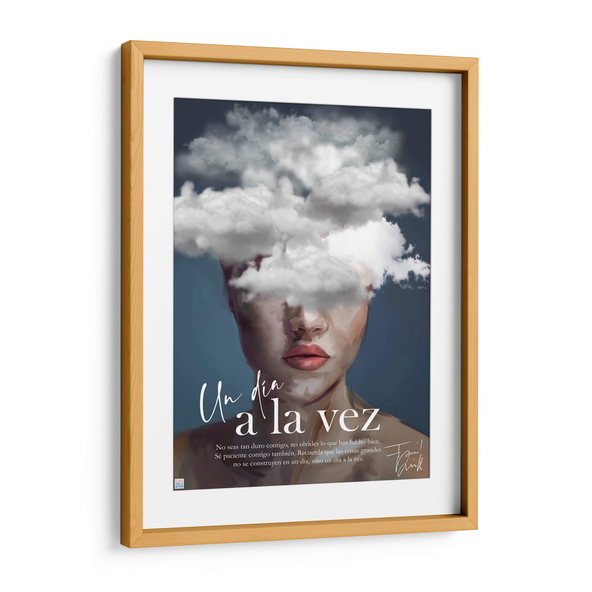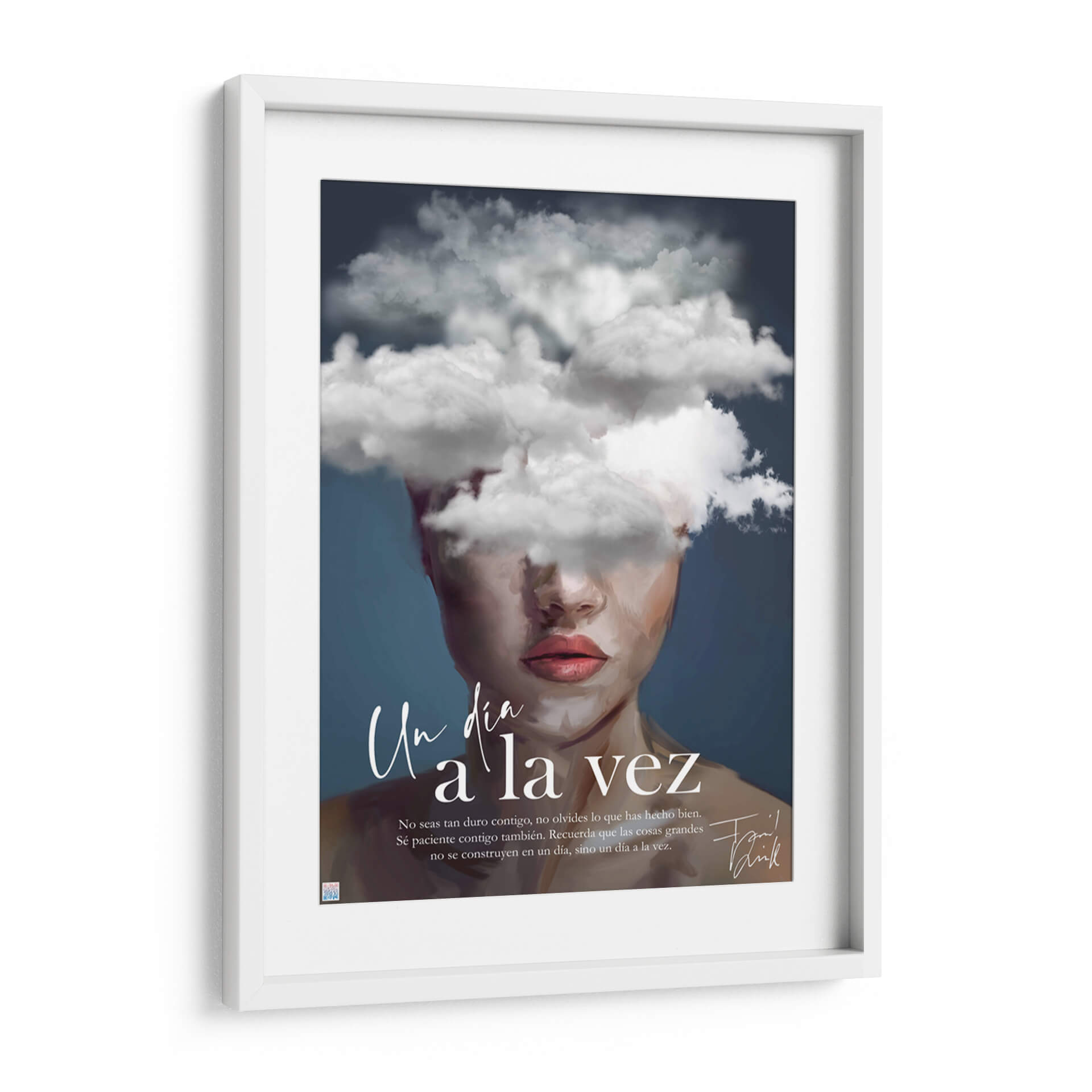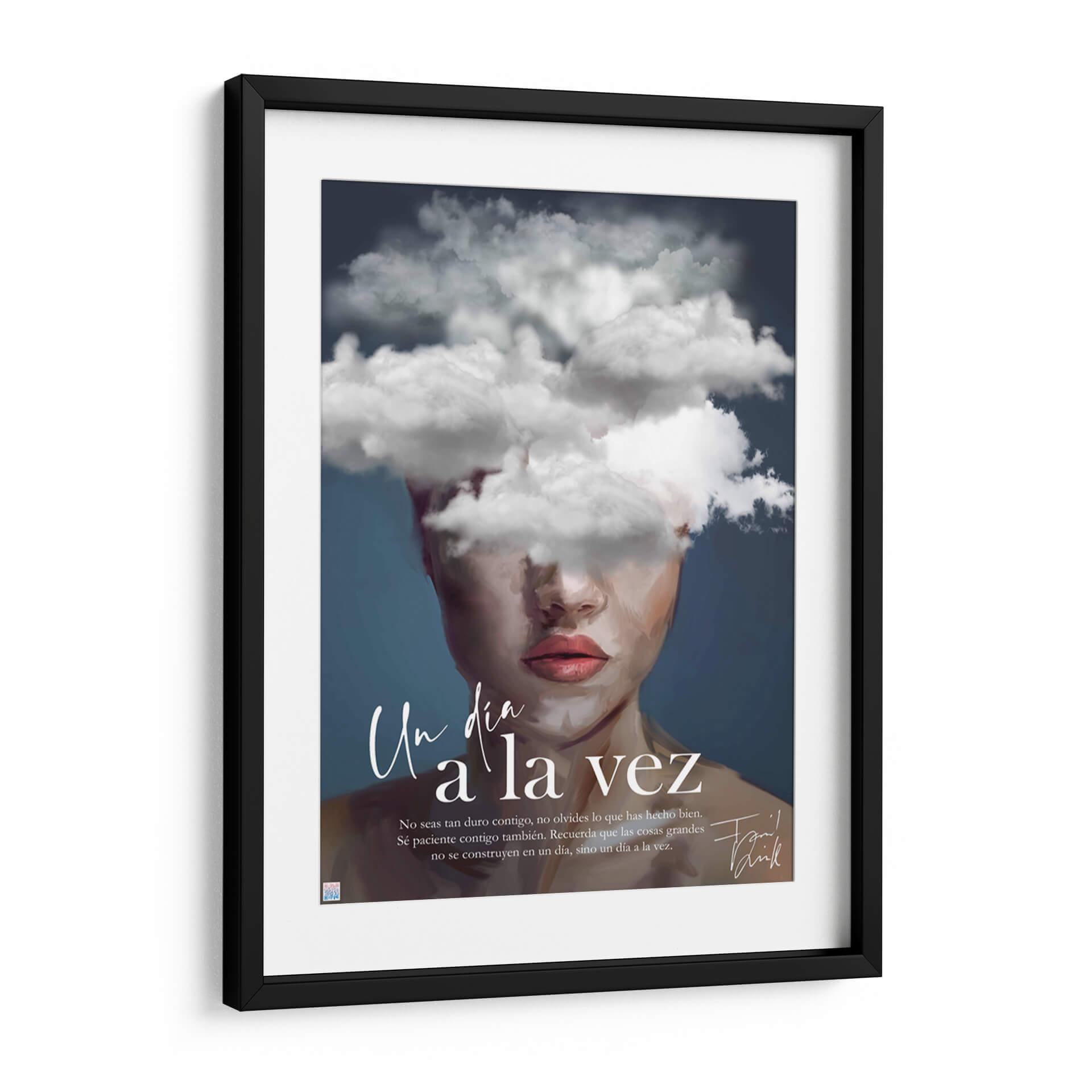 Sumérgete en la contemplación con "Un Día a la Vez 90-120", una obra de arte digital de Farid Dieck que te invita a la reflexión y al autocompasión. Esta pieza cautivadora presenta un retrato etéreo de una mujer, cuya mirada se pierde entre nubes tenues, creando una atmósfera onírica y serena. La paleta de colores, dominada por azules profundos y suaves tonos de piel, junto con el blanco etéreo de las nubes, genera un contraste sutil pero impactante que atrae la atención. El estilo pictórico, con pinceladas sueltas y expresivas, añade una cualidad artística y emocional a la composición. El texto integrado, "Un día a la vez", junto con un mensaje de paciencia y autocompasión, refuerza el carácter inspirador de la obra. "Un Día a la Vez 90-120" es más que una decoración de pared; es un recordatorio visual para abrazar el presente y ser amable contigo mismo. Ideal para crear un santuario de paz en tu dormitorio, un espacio de calma en tu estudio o un punto de inspiración en tu sala de estar. Este cuadro decorativo contemporáneo es perfecto para quienes buscan arte que hable al alma y promueva el bienestar.
