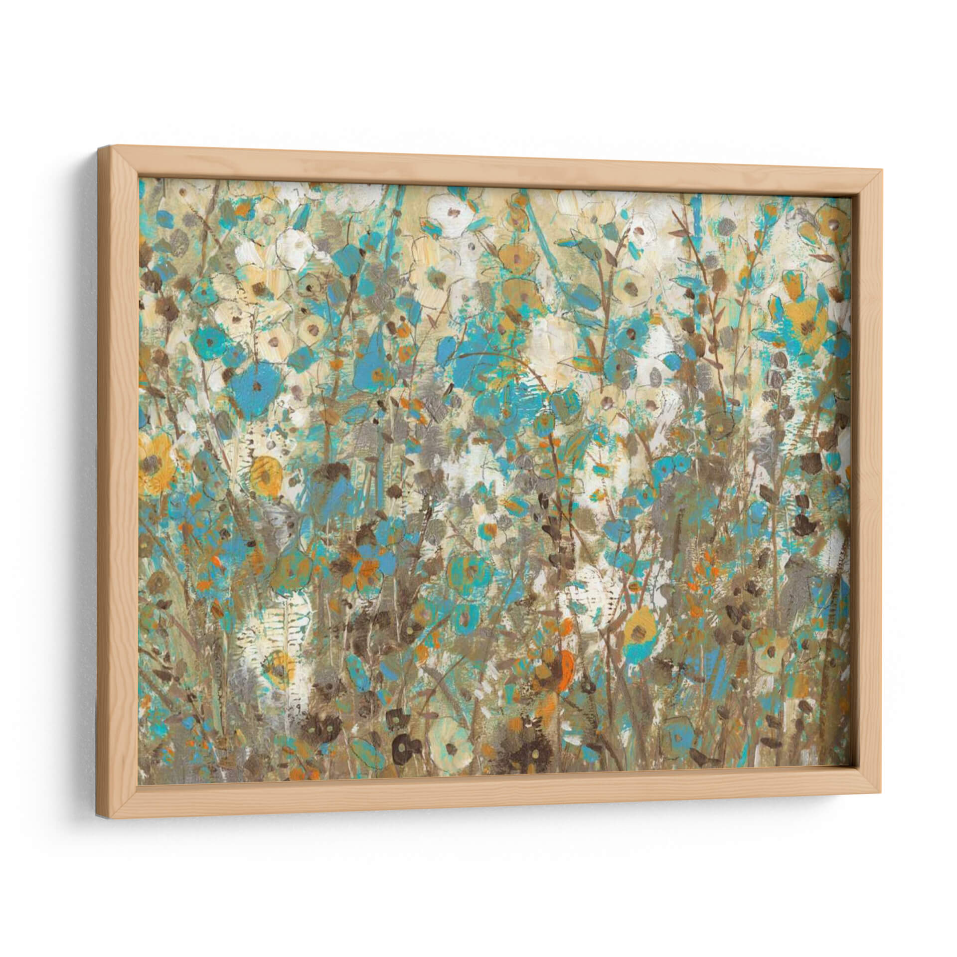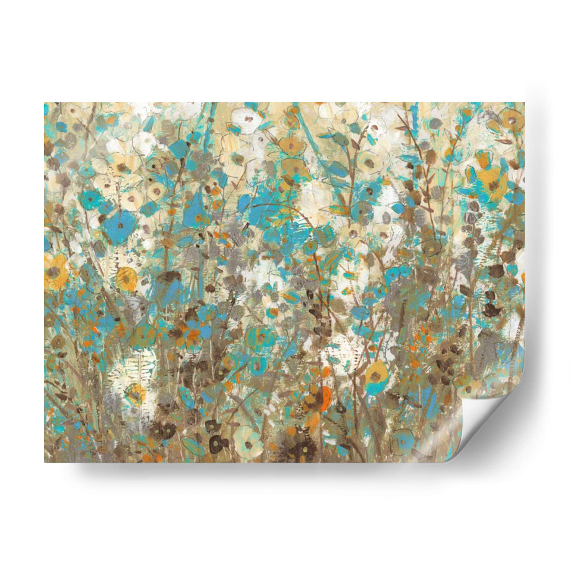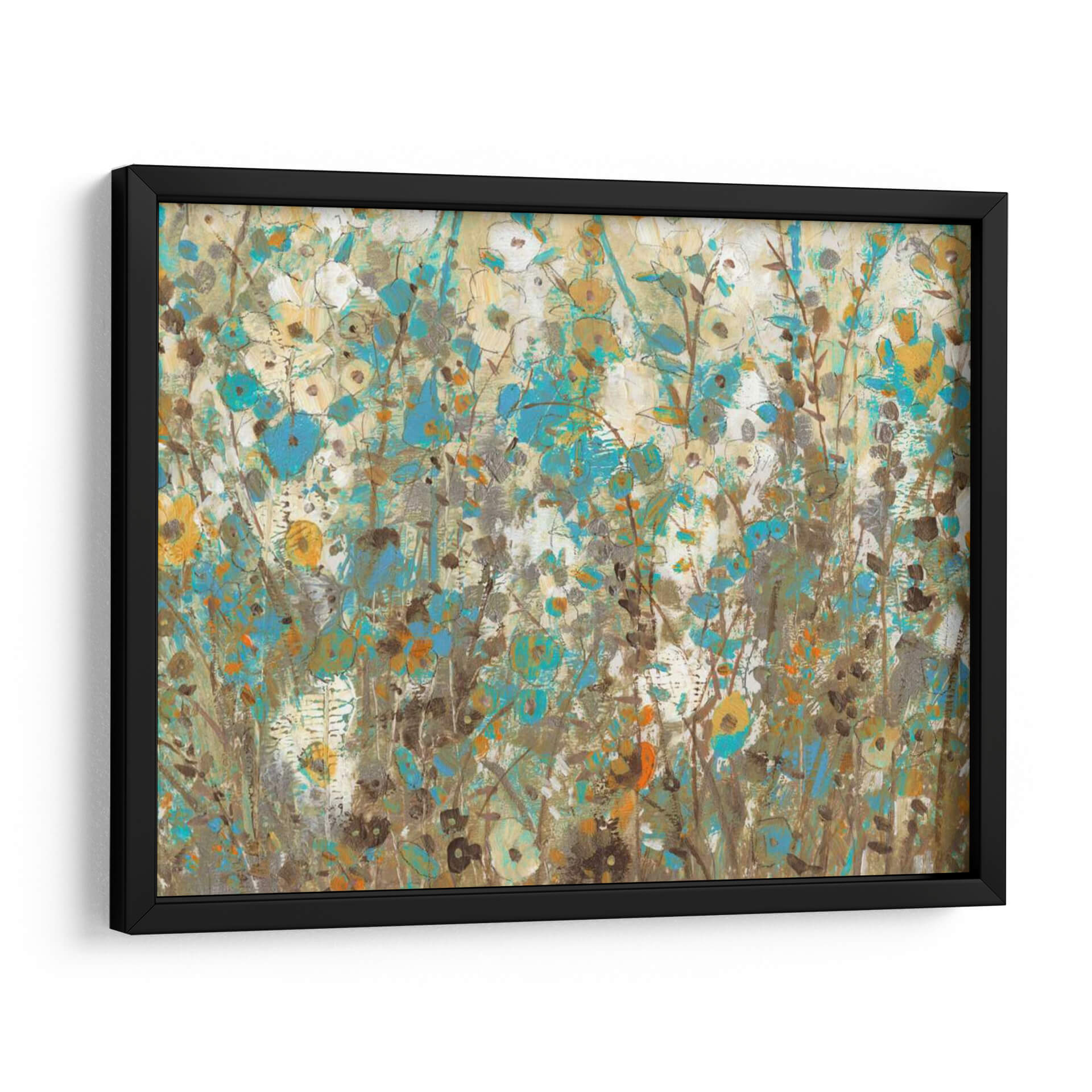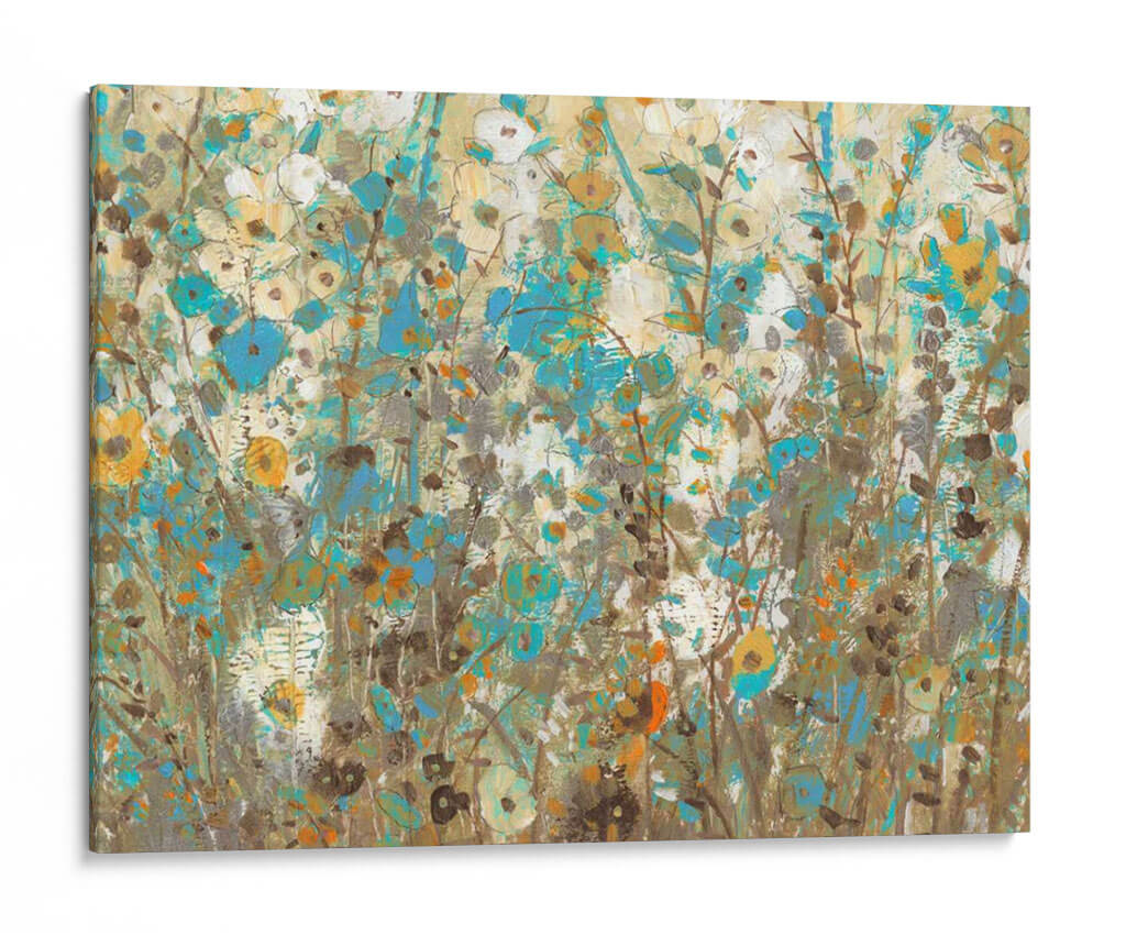 Sumérgete en la belleza etérea de "Vides Florecientes II", una obra de arte contemporáneo que captura la esencia vibrante de un jardín en plena eclosión. El artista Tim O'Toole nos presenta una composición rica en texturas y colores, donde pinceladas audaces de azul turquesa, dorado cálido y tonos tierra se entrelazan con delicadeza. Las formas florales, sugeridas con un estilo impresionista moderno, evocan una sensación de movimiento y vitalidad, como si el espectador pudiera casi sentir la brisa moviendo las plantas. El fondo, trabajado con capas de blanco y beige, aporta luminosidad y profundidad, permitiendo que los elementos botánicos destaquen con un encanto natural. Esta pieza es ideal para añadir un toque de naturaleza estilizada y serenidad a cualquier espacio, ya sea una sala de estar moderna, un dormitorio acogedor o una oficina que busque inspiración. Su paleta de colores versátil la convierte en un complemento perfecto para una variedad de estilos decorativos, desde el bohemio hasta el contemporáneo, aportando un aire fresco y orgánico. "Vides Florecientes II" es más que un cuadro decorativo; es una invitación a la contemplación y a la apreciación de la belleza efímera de la naturaleza, transformada en arte. Descubre la armonía y la frescura que esta obra puede aportar a tu hogar.